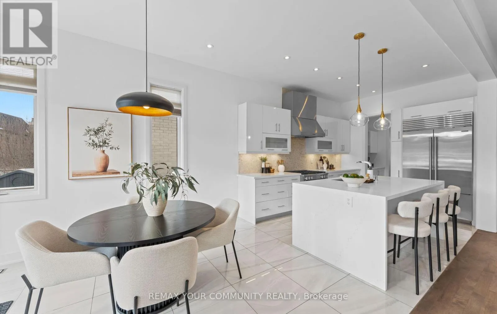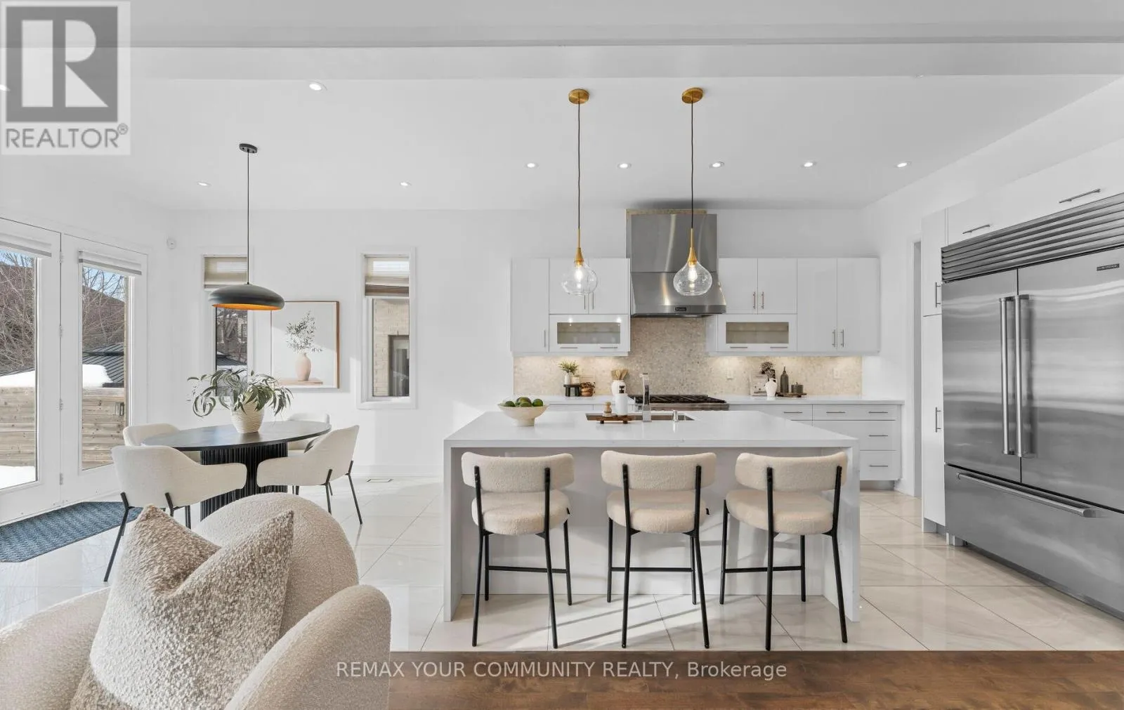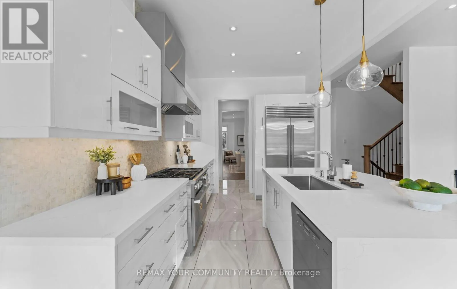 Bathurst & King Rd Experience modern sophistication in this architectural gem located at 10 Kent Matthew. Luxurious 3650 square feet + finished walk up basement offers endless opportunities for an expanded family oriented lifestyle. An airy, open concept design boasts soaring 10 ft ceilings and expansive windows showcasing modern craftsmanship & contemporary lines. At its heart, the kitchen is equipped with premium Miele & Subzero appliances, sleek cabinetry, Island with waterfall Quartz & a separate functional servery with walk-in pantry. The sun filled breakfast room with South/West views steps out to a large entertainer's stone patio complete with Pergola and relaxing spa hot tub. Spacious family rm with gas fireplace + main floor separate library. Combined living/dining area is perfect for large family gatherings or grand entertaining. Step inside the primary retreat featuring a double sided fireplace overlooking a spa inspired ensuite & a large his & her dressing rooms. 3 additional generous bedrooms each serviced with ensuite baths & a 2nd floor laundry. Coveted walk up basement features 8' 8" ceilings, rec rm with roughed in bar/kitchen, games & exercise area, 5th bdrm & 3pc bath offer a versatile footprint for a growing family & separate Nanny/Granny suite. (id:27476)