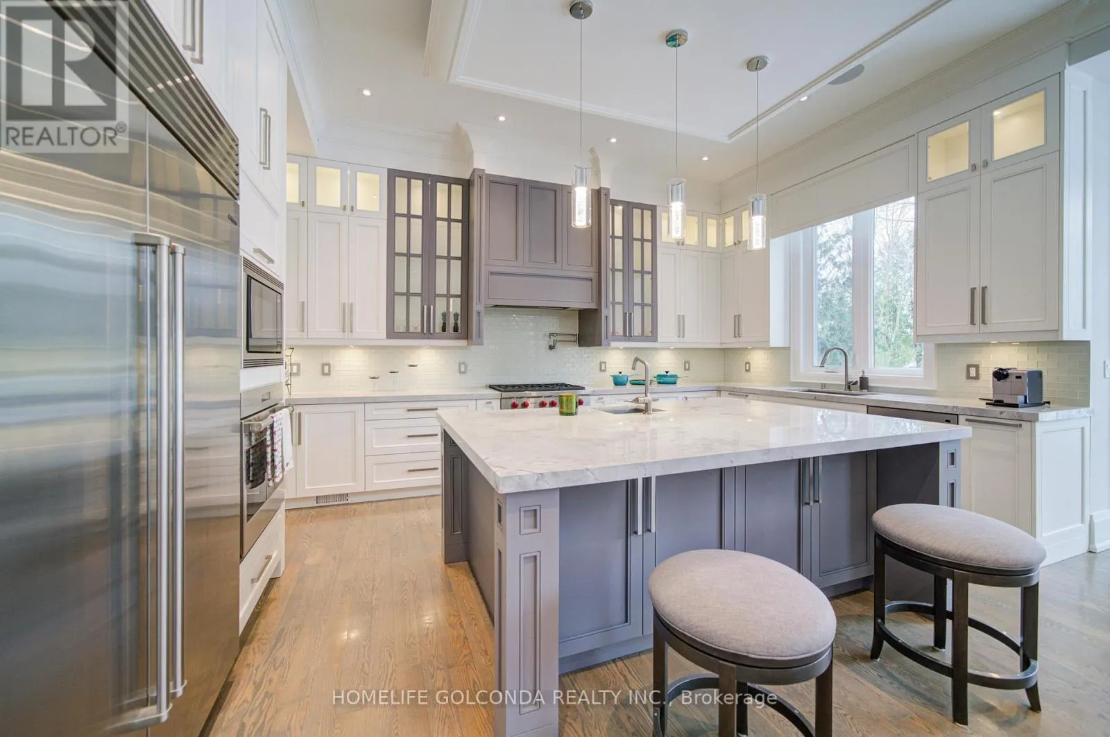 Cross Streets: Yonge Just North Of Hwy 7. ** Directions: Yonge/ Hwy 7. An exquisite custom-built estate showcasing outstanding craftsmanship and meticulous attention to detail, ideally situated in the prestigious South Richvale community. Offering over 6,000 sq. ft. of luxurious finished living space, this exceptional residence is designed with premium materials, refined architectural elements, and superior quality throughout.The striking limestone exterior and luxury windows create a grand first impression, while the thoughtfully designed interior features 11-foot ceilings on the main floor, 10-foot ceilings on the second level, and 9-foot ceilings in the professionally finished basement. Elegant marble and rich hardwood flooring extend across both levels, complemented by an impressive oversized skylight that fills the home with natural light. A private elevator provides seamless access to all floors, while numerous LED pot lights and a fully integrated sound system with built-in speakers enhance both ambiance and functionality.The gourmet chef's kitchen is beautifully appointed with luxurious stone countertops, high-end finishes, and a separate serving area-perfect for formal entertaining and family gatherings. Four fireplaces throughout the home add warmth, comfort, and architectural sophistication.The walk-up basement offers exceptional additional living space, featuring heated floors, a spacious recreation room with fireplace, a wet bar, and one bedroom with a full bathroom-ideal for extended family, guests, or entertaining. Additional features include a comprehensive security system with cameras, central vacuum, and an automatic irrigation system for effortless maintenance.A rare opportunity to own a distinguished luxury residence in one of the most sought-after neighborhoods, offering elegance, comfort, and modern convenience at every turn. (id:27476)