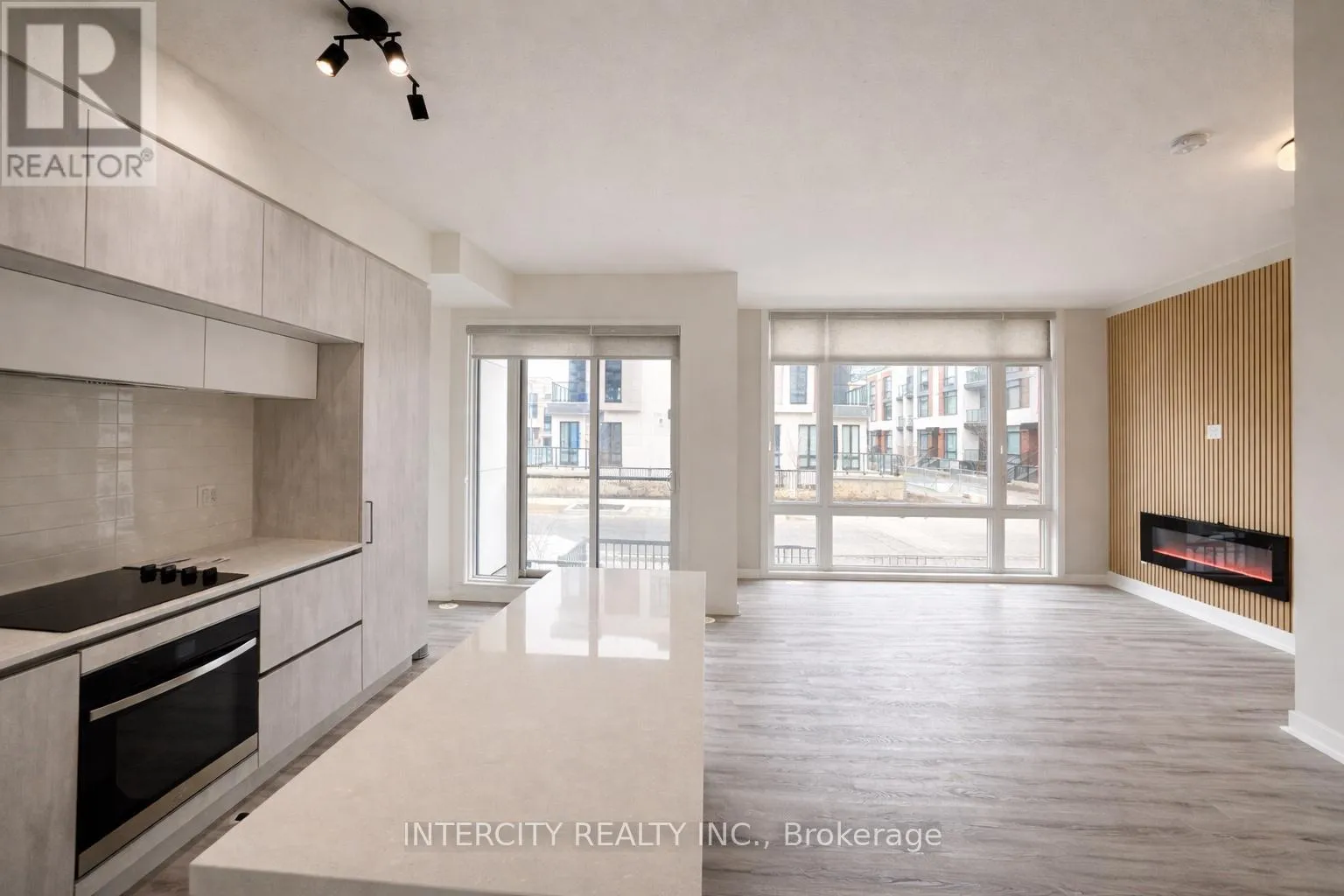 Elgin Mills & Bayview Welcome to refined contemporary living at Bayview & Elgin Mills. This beautifully designed 959sf stacked condo townhome offers a perfect blend of modern style, thoughtful layout, and everyday convenience in one of Richmond Hill's most desirable communities. Featuring soaring 10-foot ceilings, the open-concept floor plan feels bright, spacious, and inviting, complemented by expansive windows that fill the home with natural light. The sleek modern kitchen seamlessly flows into the living and dining areas, ideal for both entertaining and daily living, while walk-out access to a private terrace and balcony provides the perfect outdoor retreat. Tasteful upgrades throughout enhance both form and function, including custom shower glass enclosure, tub glass enclosure, upgraded powder room vanity with custom black fixtures, and custom blinds throughout. Newly renovated living room feature wall with fireplace. Patio tile for large lower level terrace. Enjoy the convenience of underground parking and locker, with maintenance fees that include landscaping, snow removal, and common area upkeep. Conveniently located just minutes to Highway 404, GO Station, top-rated schools, parks, trails, shopping, and dining, this home offers exceptional value for professionals, down-sizers, or first-time buyers seeking modern comfort in a prime location. (id:27476)