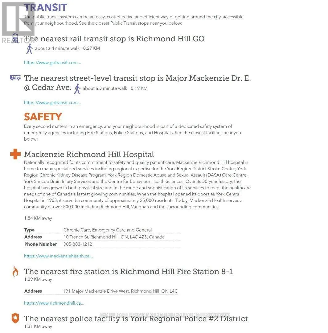 Major Mackenzie & Yonge 175 Cedar Avenue is located in the Harding neighbourhood of Richmond Hill, a well-established and centrally positioned community known for its quiet residential character and convenient access to amenities. Renters benefit from proximity to key amenities. Grocery stores, pharmacies, banks, and a diverse range of restaurants and cafés along nearby Yonge Street are within short travel distance, reducing daily commute times for errands and dining. The area is served by York Region Transit (YRT) routes with connections to major transit hubs such as Richmond Hill GO Station. This supports commuter access to surrounding communities and transit links toward Toronto and other parts of the Greater Toronto Area. Major thoroughfares, including Highway 404 and Highway 407, are readily accessible by car. This provides flexibility for renters who drive, facilitating commutes to employment centres across the region. Multiple parks and green spaces are nearby, offering walking trails, open areas, and community gathering spots. These contribute to a desirable lifestyle for renters who value outdoor activity and leisure without needing to travel far. Low-traffic residential streets, sidewalks, and access to quality schools and recreational facilities make the neighbourhood appealing for families renting in the area. This enhances overall community safety and quality of life with proximity to community centres, cultural amenities, and public services supports diverse lifestyles and adds convenience for renters of all ages. (id:27476)