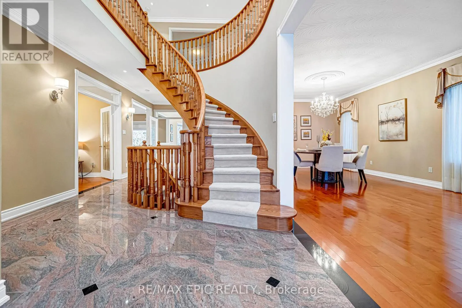 Cross Streets: Bayview/Highway 7. ** Directions: South. Exceptional opportunity in a prime Richmond Hill location! Nestled on a quiet cul-de-sac, this executive home offers approximately 3,600 sq. ft. of elegant living space, featuring 9 ft ceilings on the main floor and a large skylight that fills the home with natural light. A stunning oversized skylight above the circular oak staircase enhances the home's grandeur, leading to a dramatic 2-storey open-to-above foyer with a Maria Teresa Austrian crystal chandelier and impressive double-door entry.The main floor features maple solid hardwood flooring throughout the family room, library, living, and dining areas. The upgraded kitchen is equipped with premium cabinetry, granite countertops, and a gas cooktop, and offers a walk-out to a composite deck complete with aluminum railings and tempered glass panels, along with split-level staircases leading to the beautifully landscaped ravine-view backyard-perfect for relaxing or entertaining.This well-maintained home is in excellent condition and includes all existing window coverings and hardware. The fully finished walk-out basement offers approximately 8'9" ceiling height and provides excellent additional living space, featuring a wet bar with cabinetry and upgraded marble flooring and countertops, a nanny suite with a 3-piece bathroom, and a spacious open area ideal for entertaining or exercise.Additional upgrades include modern railing spindles and vinyl casement windows throughout. The property is fully landscaped in both the front and backyard, featuring beautiful Japanese maple and magnolia trees, along with a lawn sprinkler system for easy maintenance.Ideally located just minutes to Highways 404 & 407, top-rated schools, parks, shopping, restaurants, and public transit. Close to the future T&T Supermarket. Situated in a highly sought-after neighbourhood known for its strong community atmosphere and excellent property values. A fantastic opportunity for families or investors seeking long-term potential. (id:27476)