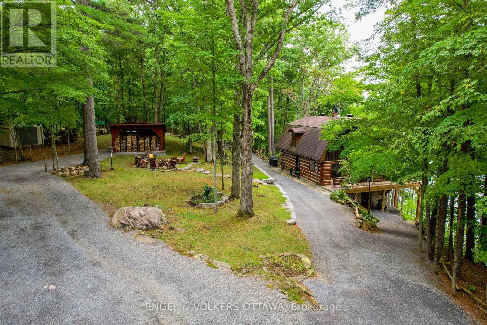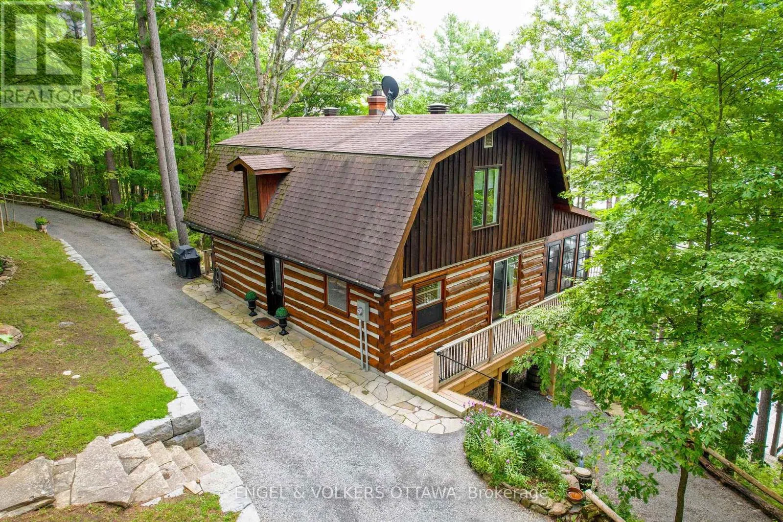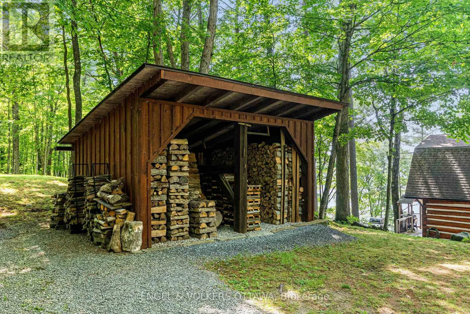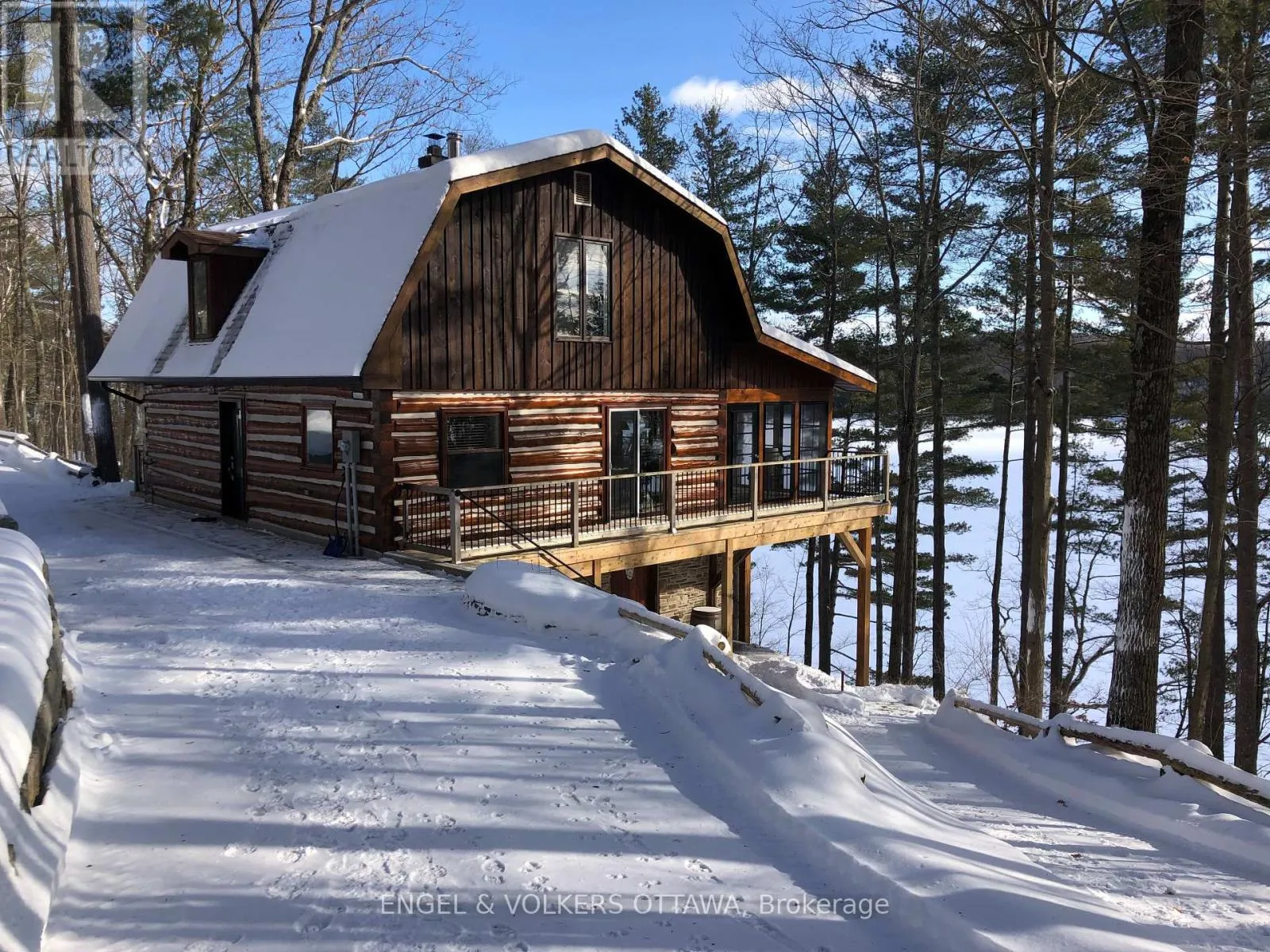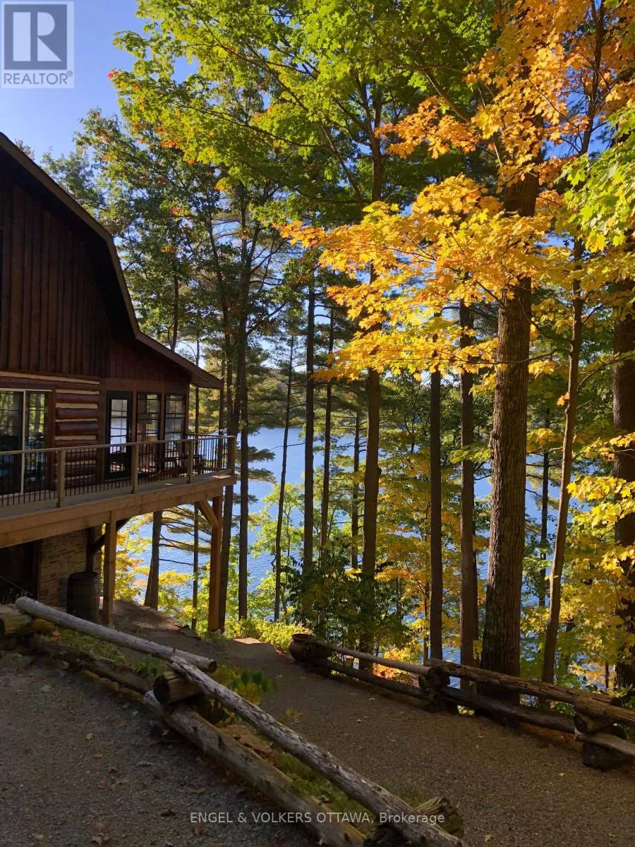 Cross Streets: Connies Ln & Coco Ln. ** Directions: From Althorpe Rd, turn right onto Connies Ln. 300.47 ft of waterfront property nestled on a quiet private lane along the pristine shores of Big Crosby Lake, in a welcoming and well-established gated lakeside community! This custom-built log home provides a four-season tranquil retreat, ideal for nature lovers and outdoor adventurers on a 299.79 ft x 260.65 ft lot. The main level welcomes you to a spacious foyer with tile flooring and tongue-and-groove hardwood walls, which leads to an open-concept family room and eat-in kitchen, unified by hardwood flooring, exposed beams, and a freestanding wood stove with a stacked stone surround. The custom Butternut kitchen looks out to both the treed property and the beautiful lake, while the sliding glass door leads to the massive 3-season screened-in porch. Upstairs, the primary bedroom has soft carpeting, natural wood accents, and dual closets, while the expansive second-level living area has flexibility as additional bedrooms, a workspace, or a creative studio. A bathroom on each level, both updated in 2021, completes the interior of the home. Outside, a large wood storage shed, a firepit area, walking paths, and a three-car detached garage are all found in the wooded portion of the property. On the lakeside, wide elevated decks run along both sides of the home, while just below the sunroom, a gravel terrace provides a shaded gathering area with access to the private, low-maintenance stone path leading to the lakeside deck and private dock. Big Crosby Lake is spring-fed and home to bass, pickerel, and a variety of panfish, offering exceptional swimming, fishing, and boating. Located just 1 km from pavement, Connies Lane is a quiet, walkable road with only 12 cottages and no further development - maintained by a stable group of long-term owners, making this home a quiet, unforgettable lakeside experience. Some photos have been virtually staged. (id:27476)