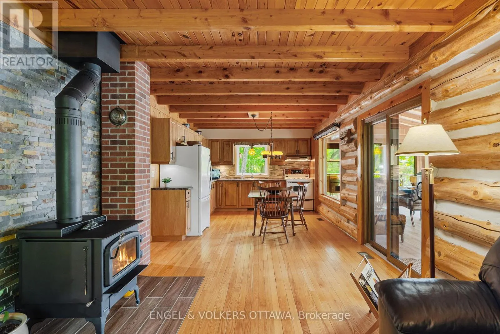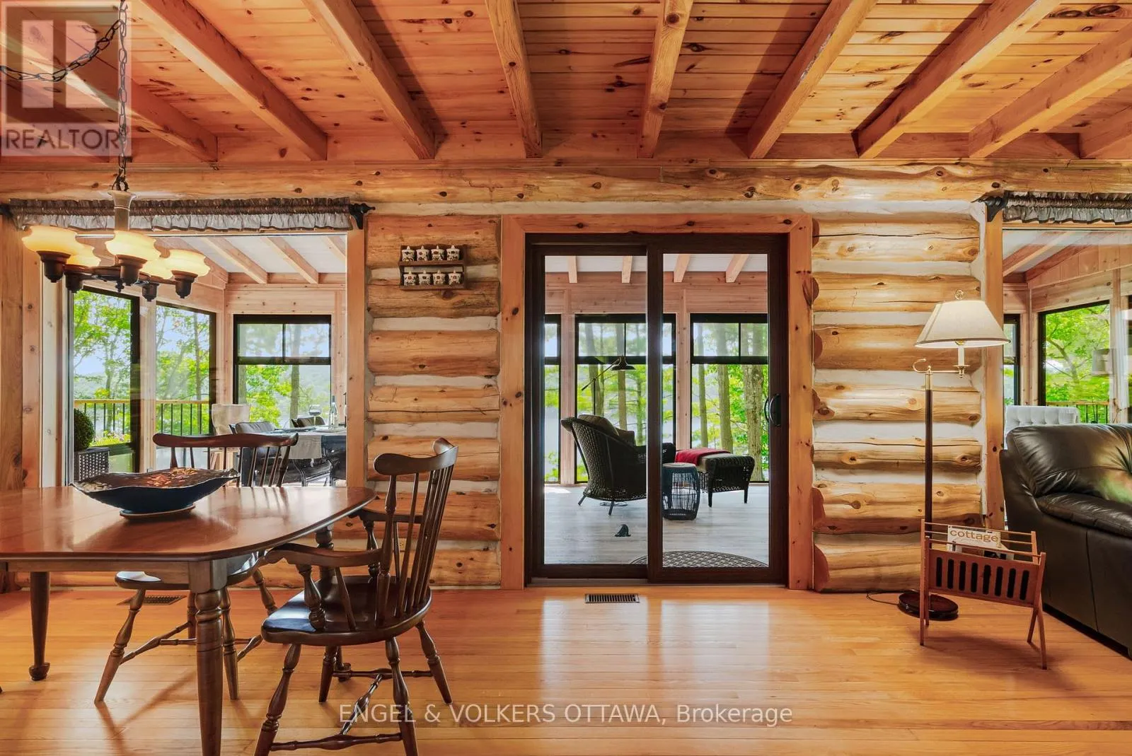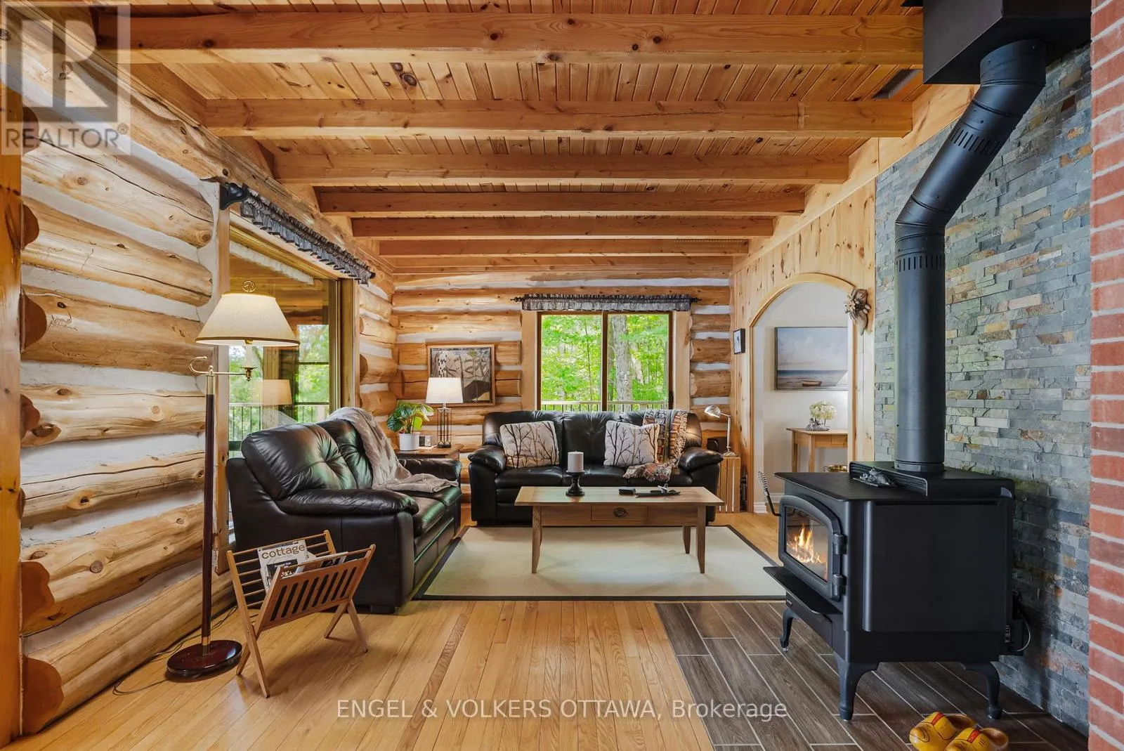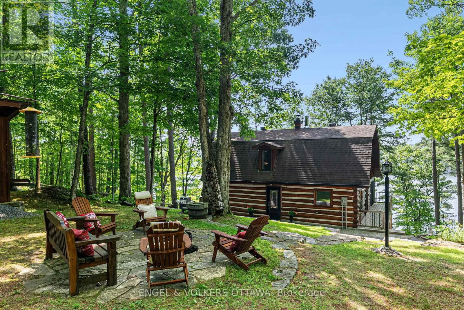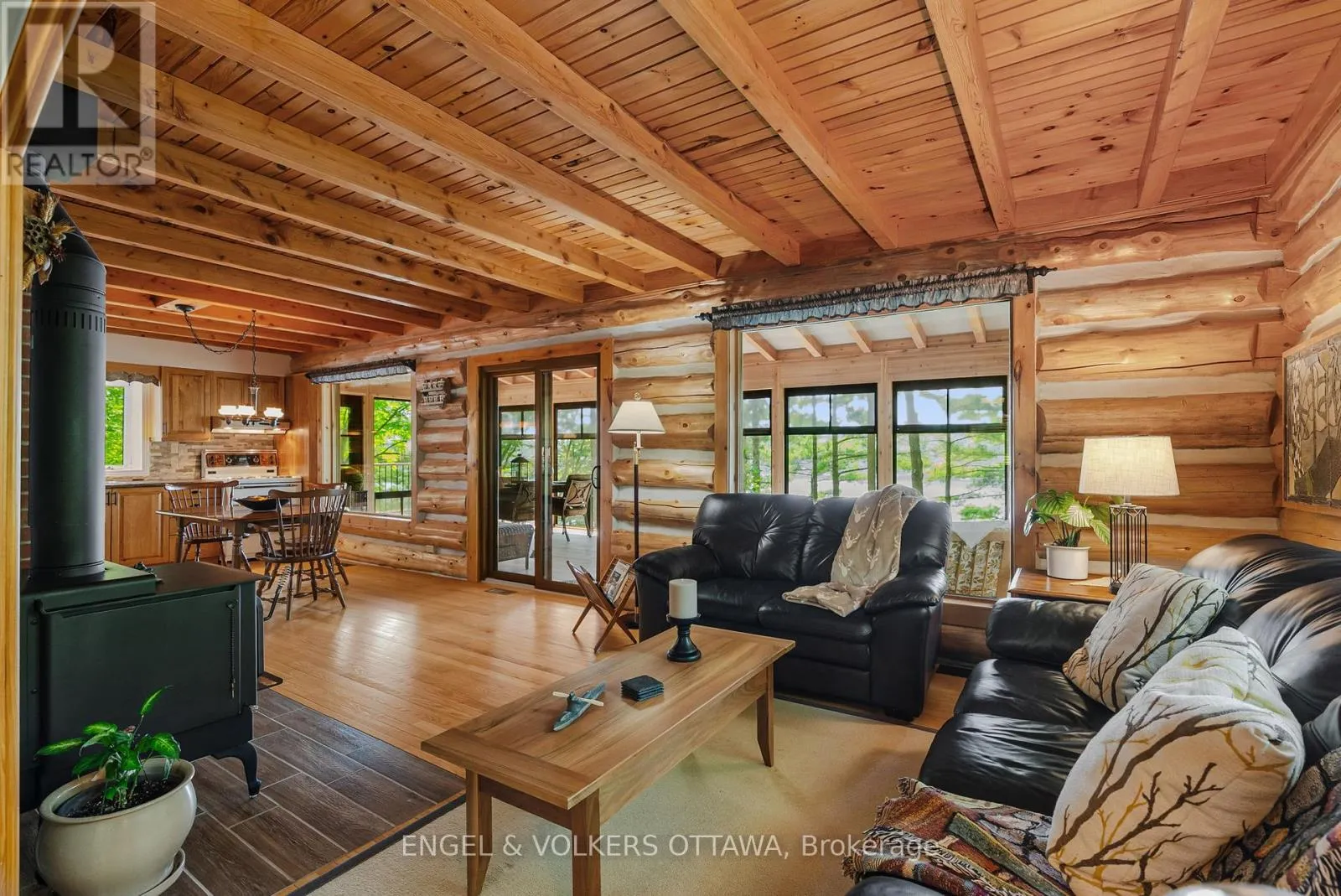 Cross Streets: Connies Ln & Coco Ln. ** Directions: From Althorpe Rd, turn right onto Connies Ln. 300.47 ft of waterfront property nestled on a quiet private lane along the pristine shores of Big Crosby Lake, in a welcoming and well-established gated lakeside community! This custom-built log home provides a four-season tranquil retreat, ideal for nature lovers and outdoor adventurers on a 299.79 ft x 260.65 ft lot. The main level welcomes you to a spacious foyer with tile flooring and tongue-and-groove hardwood walls, which leads to an open-concept family room and eat-in kitchen, unified by hardwood flooring, exposed beams, and a freestanding wood stove with a stacked stone surround. The custom Butternut kitchen looks out to both the treed property and the beautiful lake, while the sliding glass door leads to the massive 3-season screened-in porch. Upstairs, the primary bedroom has soft carpeting, natural wood accents, and dual closets, while the expansive second-level living area has flexibility as additional bedrooms, a workspace, or a creative studio. A bathroom on each level, both updated in 2021, completes the interior of the home. Outside, a large wood storage shed, a firepit area, walking paths, and a three-car detached garage are all found in the wooded portion of the property. On the lakeside, wide elevated decks run along both sides of the home, while just below the sunroom, a gravel terrace provides a shaded gathering area with access to the private, low-maintenance stone path leading to the lakeside deck and private dock. Big Crosby Lake is spring-fed and home to bass, pickerel, and a variety of panfish, offering exceptional swimming, fishing, and boating. Located just 1 km from pavement, Connies Lane is a quiet, walkable road with only 12 cottages and no further development - maintained by a stable group of long-term owners, making this home a quiet, unforgettable lakeside experience. Some photos have been virtually staged. (id:27476)