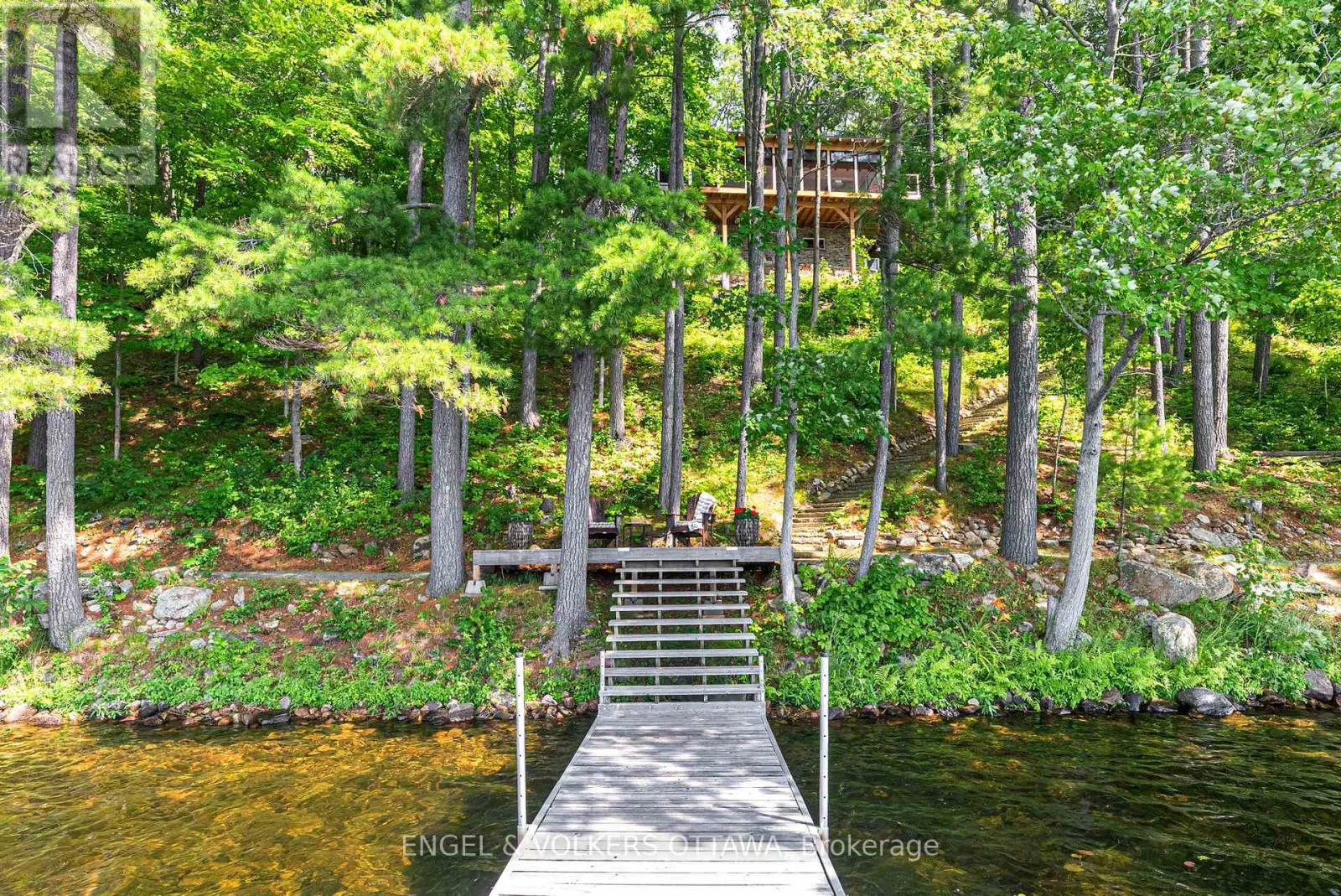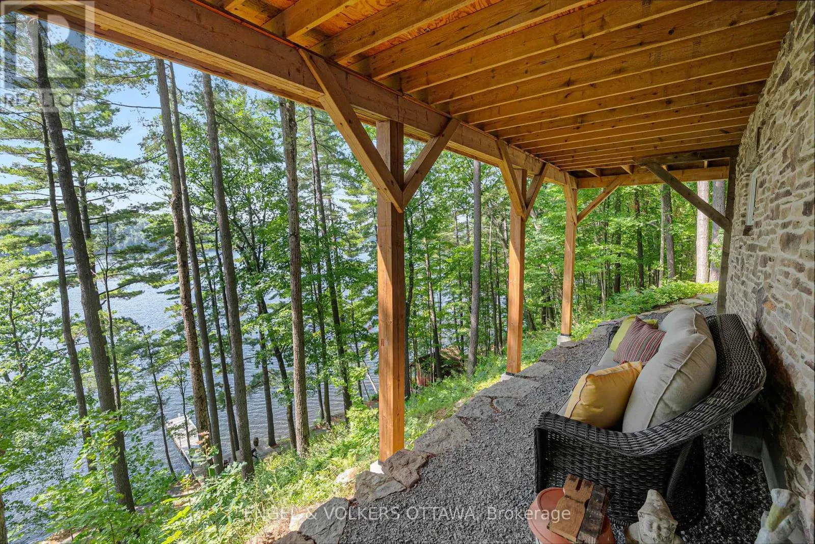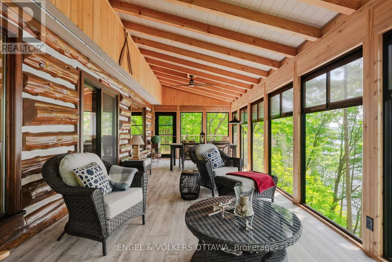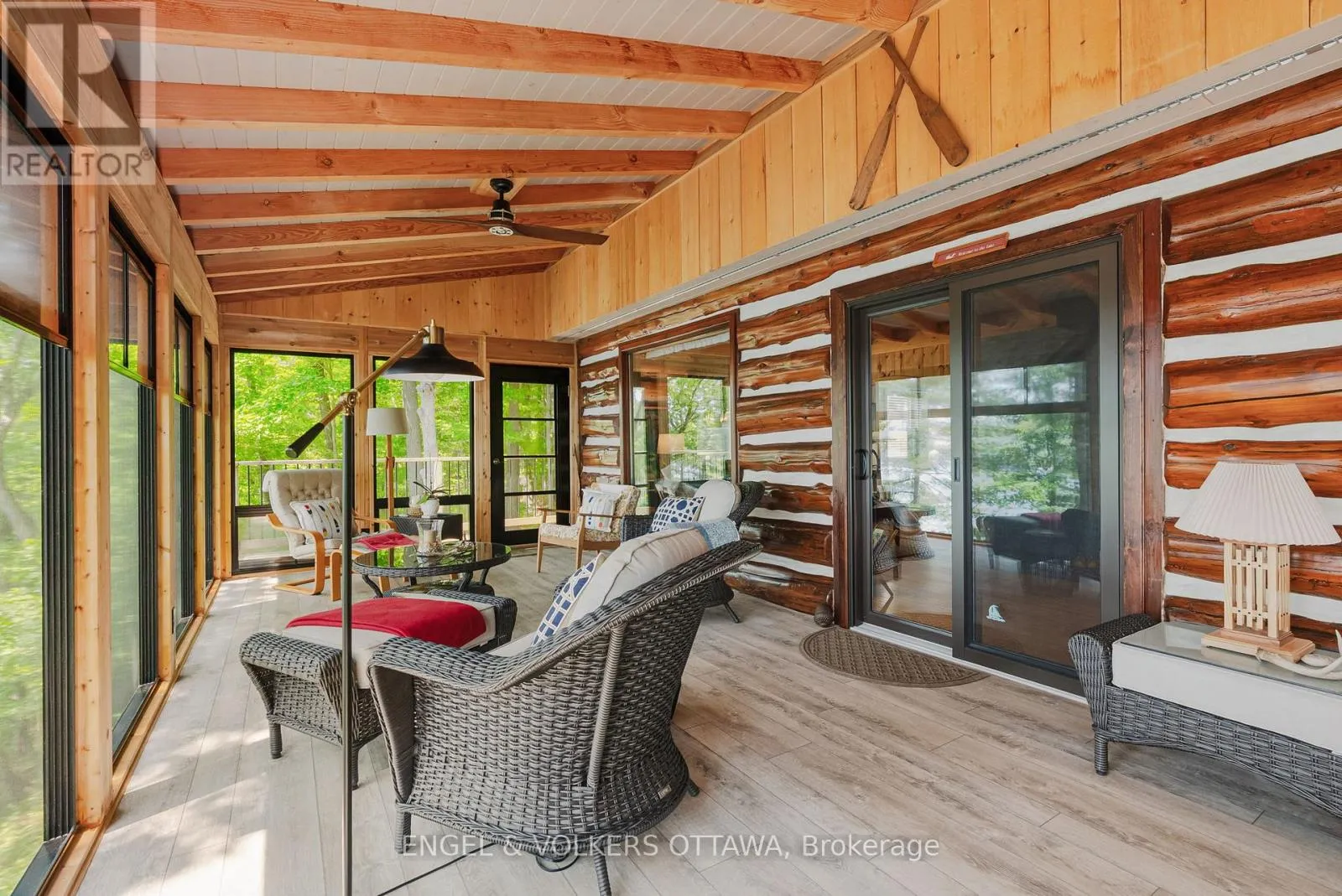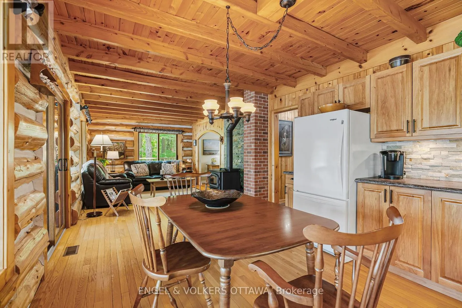 Cross Streets: Connies Ln & Coco Ln. ** Directions: From Althorpe Rd, turn right onto Connies Ln. 300.47 ft of waterfront property nestled on a quiet private lane along the pristine shores of Big Crosby Lake, in a welcoming and well-established gated lakeside community! This custom-built log home provides a four-season tranquil retreat, ideal for nature lovers and outdoor adventurers on a 299.79 ft x 260.65 ft lot. The main level welcomes you to a spacious foyer with tile flooring and tongue-and-groove hardwood walls, which leads to an open-concept family room and eat-in kitchen, unified by hardwood flooring, exposed beams, and a freestanding wood stove with a stacked stone surround. The custom Butternut kitchen looks out to both the treed property and the beautiful lake, while the sliding glass door leads to the massive 3-season screened-in porch. Upstairs, the primary bedroom has soft carpeting, natural wood accents, and dual closets, while the expansive second-level living area has flexibility as additional bedrooms, a workspace, or a creative studio. A bathroom on each level, both updated in 2021, completes the interior of the home. Outside, a large wood storage shed, a firepit area, walking paths, and a three-car detached garage are all found in the wooded portion of the property. On the lakeside, wide elevated decks run along both sides of the home, while just below the sunroom, a gravel terrace provides a shaded gathering area with access to the private, low-maintenance stone path leading to the lakeside deck and private dock. Big Crosby Lake is spring-fed and home to bass, pickerel, and a variety of panfish, offering exceptional swimming, fishing, and boating. Located just 1 km from pavement, Connies Lane is a quiet, walkable road with only 12 cottages and no further development - maintained by a stable group of long-term owners, making this home a quiet, unforgettable lakeside experience. Some photos have been virtually staged. (id:27476)