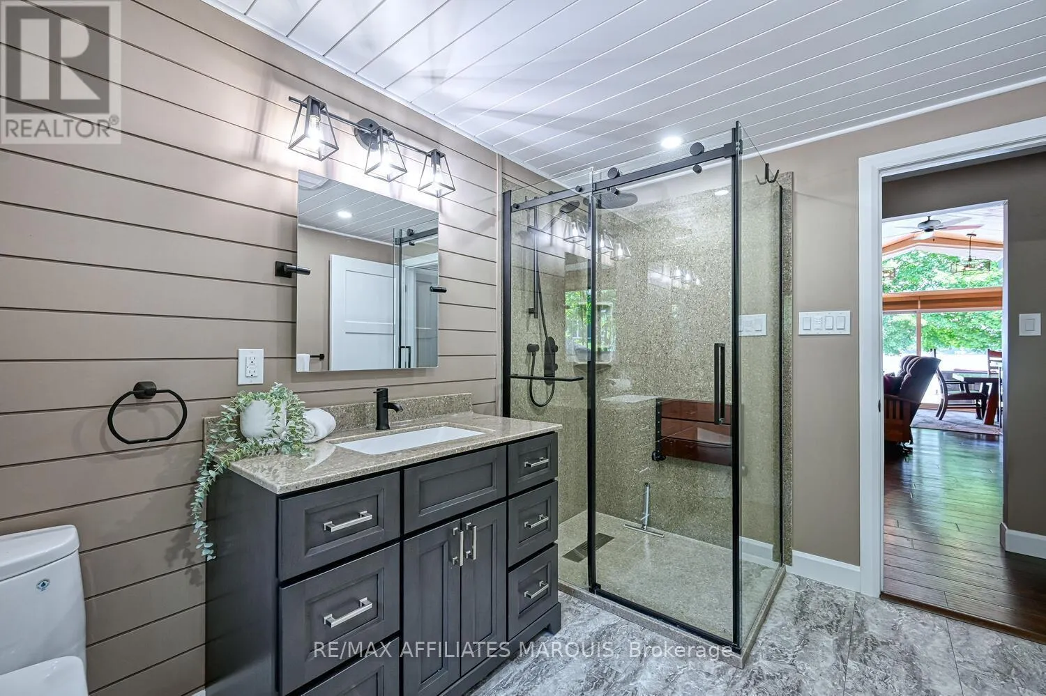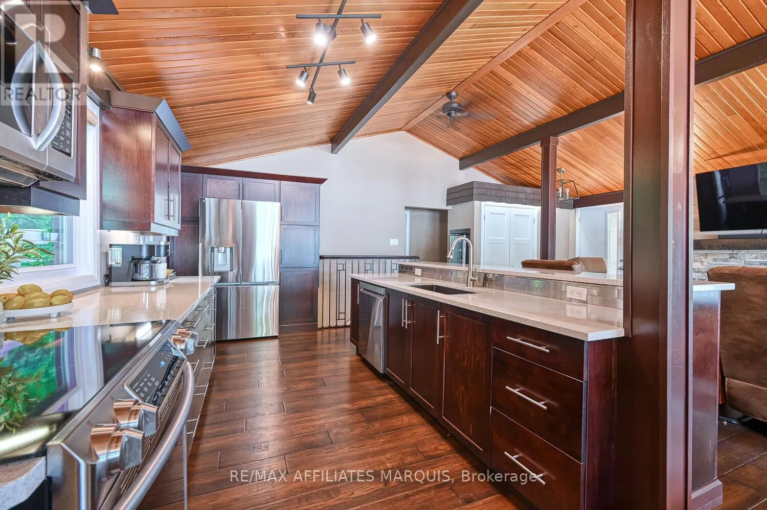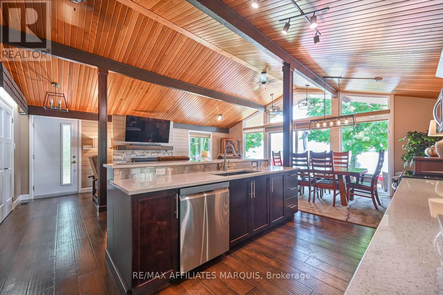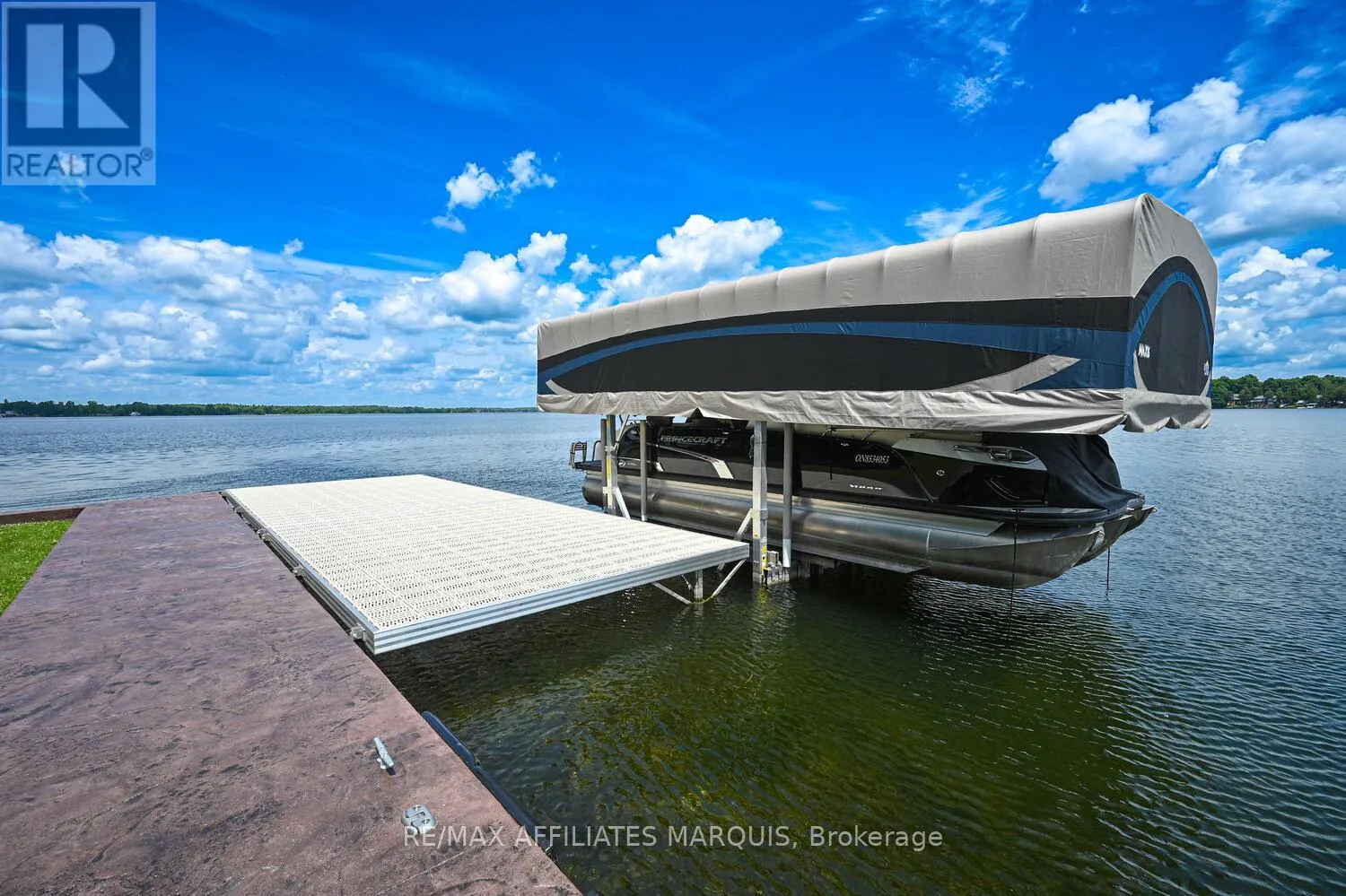 Cross Streets: R7 and Rideau Ferry Rd. ** Directions: Rideau Ferry Road from Perth to R7, turn left, take first left again after the horse field, stay right until the end of the road will take you in the driveway. Welcome to your turnkey waterfront retreat on the breathtaking shores of Lower Rideau Lake! This impeccably maintained and thoughtfully updated home is nestled in one of Eastern Ontario's most sought-after waterfront communities, offering miles of lock-free boating on both Lower and Big Rideau Lakes. Cruise to picturesque destinations like Rideau Ferry and Portland to enjoy lakeside dining and vibrant waterfront culture. Set on a beautifully landscaped lot with stunning views down the lake, this property features a premium seawall with stamped concrete detailing, a new dock, boat lift, and a private boat slip ideal for the avid boater or lakefront enthusiast. Enjoy morning coffee or evening cocktails from your upper deck, finished with durable Duradek flooring and sleek InvisiRail glass railings for unobstructed lake views. Inside, the open-concept main floor has been tastefully updated with engineered hardwood flooring throughout. The modern kitchen flows seamlessly into the dining and living areas, creating a bright and airy atmosphere with panoramic lake views. Two spacious bedrooms are accompanied by two stylishly renovated full bathrooms, offering comfort and function for family and guests alike. The lower level offers even more living space with a walk-out family room complete with a cozy gas fireplace, a two-piece bath, and generous storage/utility areas. Step outside to a covered, stamped concrete patio perfect for entertaining or relaxing in the shade while taking in the peaceful lakefront setting. A detached two-car garage provides ample parking and could easily double as a home gym or workshop. The partially fenced yard offers space for kids and pets to play safely. Whether you're looking for a full-time residence or a four-season getaway, this exceptional waterfront home combines modern comfort, natural beauty, and recreational lifestyle in one unbeatable package. Don't miss your chance to own a slice of Rideau paradise! (id:27476)