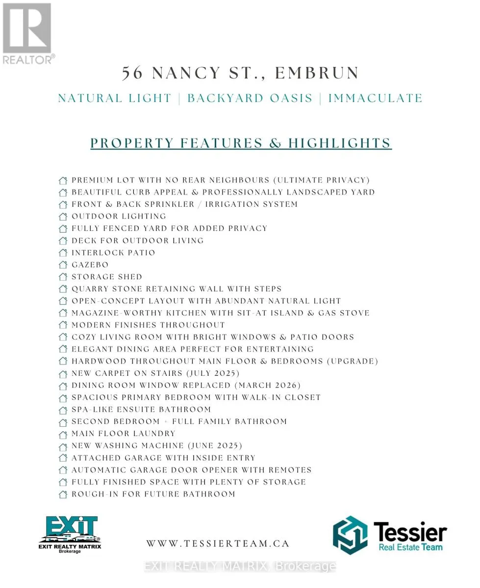 Cross Streets: Lyons & St. Thomas. ** Directions: From Notre Dame, Embrun head north on to St Thomas Rd, Turn left onto Lyon then left onto Nancy. Destination is on your left. Step into perfection with this stunning bungalow, where pride of ownership shines in every detail. Set on a premium lot with no rear neighbours, this home pairs elegance, comfort, and everyday functionality in the most captivating way. From the beautiful curb appeal to the meticulously maintained landscaping with irrigation-sprinkler system, its clear this property has been cherished and cared for. Inside, the airy open-concept layout welcomes you with warmth and style. The magazine-worthy kitchen is a true showstopper ,featuring a stylish sit-at island, gas stove, sleek finishes, and all the space you need to cook, entertain, and create lasting memories. The cozy living room and elegant dining space, framed by bright windows and patio doors, flow effortlessly together - perfect for gatherings big or small. On the main level, the primary bedroom retreat impresses with a spacious walk-in closet and spa-like ensuite. A second bedroom and full family bathroom offer comfort for loved ones or guests, while main-floor laundry and direct garage access add to the everyday ease of living. Step outside to your private paradise - a fully fenced oversized yard with wood-look PVC fencing and a striking quarry stone retaining wall. Thoughtfully landscaped and designed for both beauty and function, this backyard is a true extension of the home. Enjoy summer BBQs under the covered deck or on the expansive 16' x 16' interlock patio, unwind in the charming gazebo, and let the built-in sprinkler system keep your lawn effortlessly lush and green. Designed for both lively family gatherings and quiet evenings under the stars, this outdoor retreat truly has it all. This isn't just a home - it's a lifestyle. Don't miss your opportunity to own this Embrun gem! (id:27476)