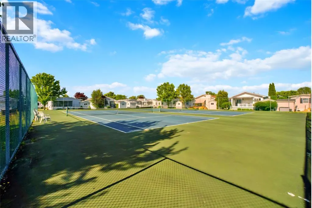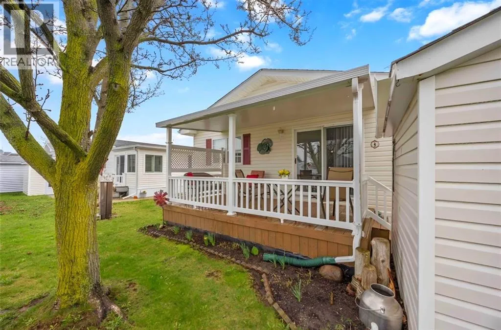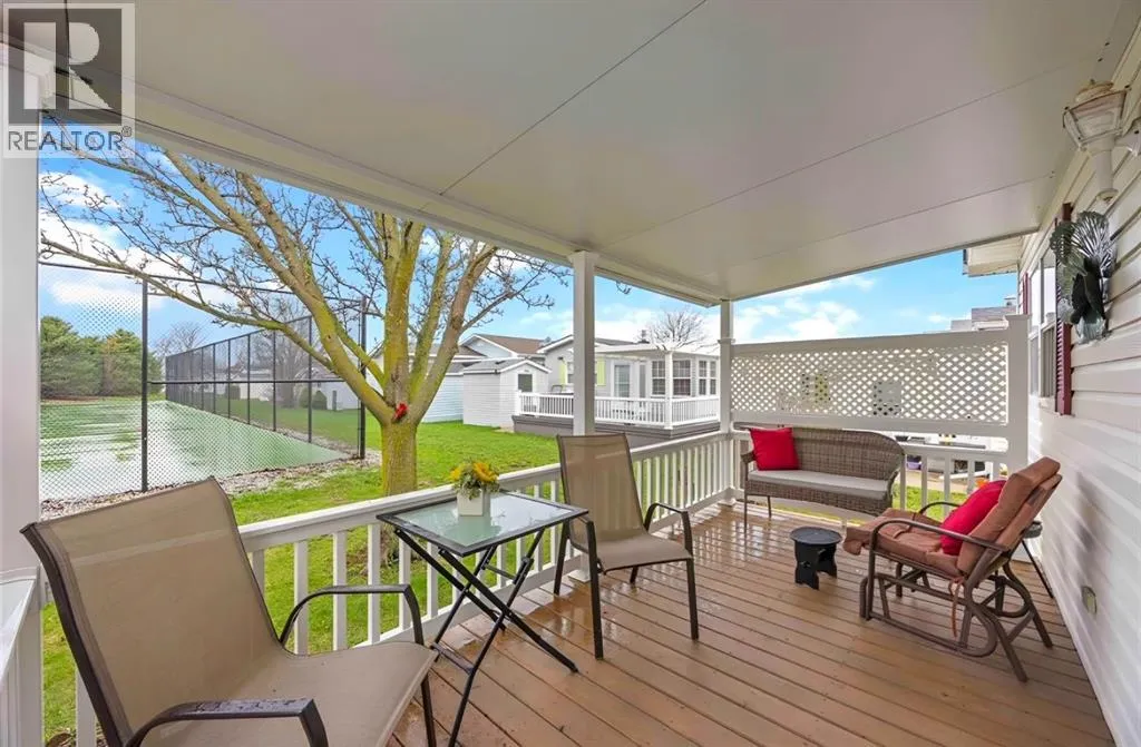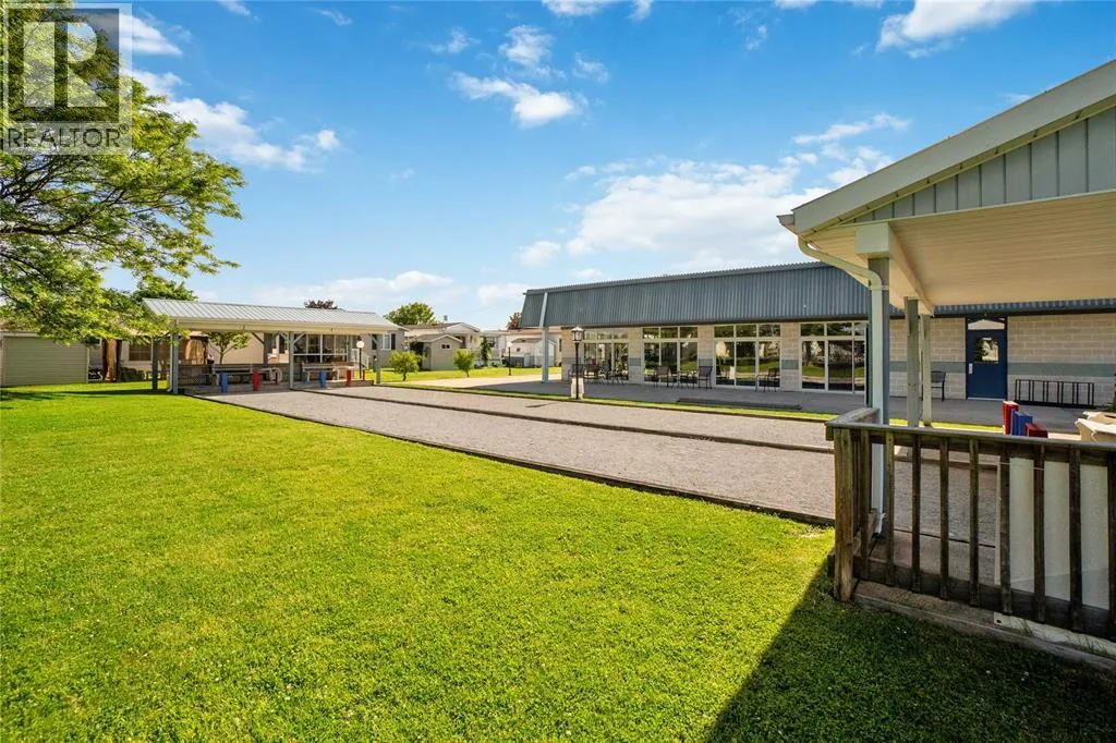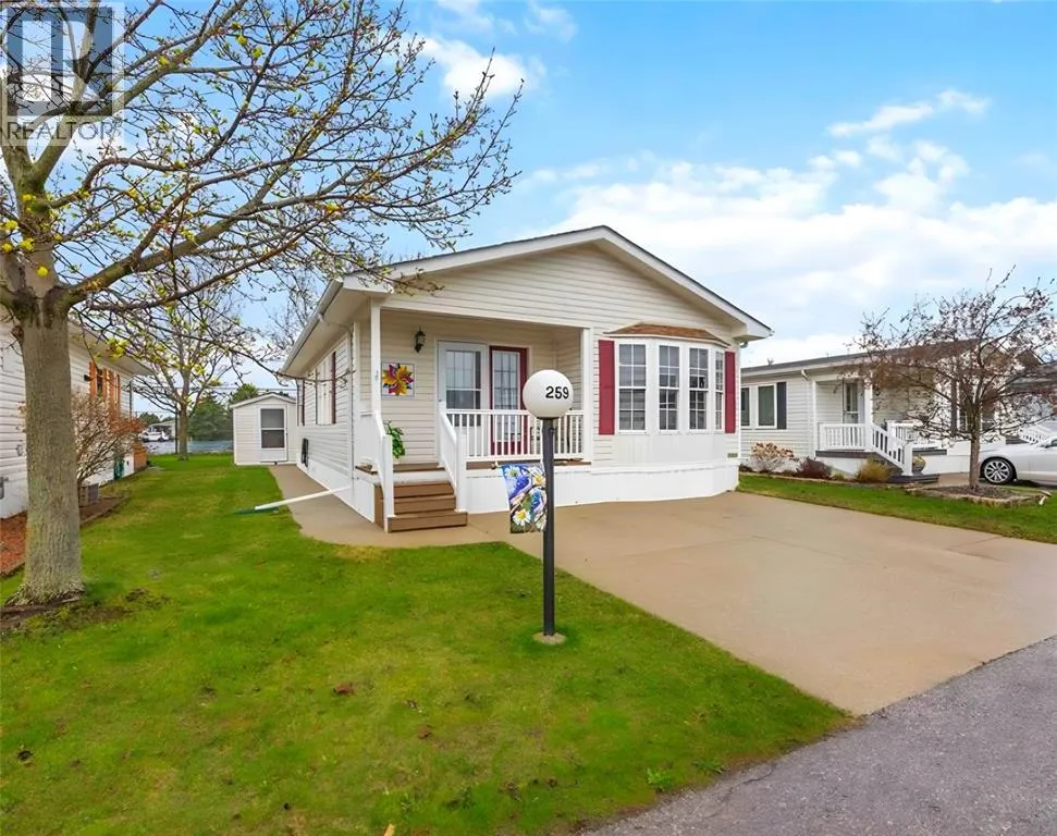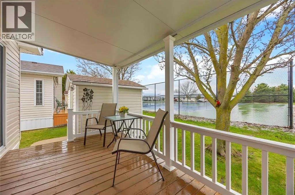 TURN LEFT THRU MAIN GATE, TURN RIGHT ON 6TH AVE, AND RIGHT ONTO CENTER DRIVE, UNIT #259 ON RIGHT Set on a prime lot backing onto green space, this exceptionally well-maintained home offers low-maintenance, carefree living in a sought-after adults-only community. The covered rear deck provides a peaceful setting overlooking the tennis courts. Inside, the home features 2 bedrooms and 1.5 bathrooms, including a spacious main bath with a large walk-in shower. A convenient storage shed adds extra functionality outside. Residents enjoy access to an impressive 12,000 sq. ft. clubhouse with an indoor pool, fitness room, billiards, games room, heated hobby shop, library, lounge, and a Great Hall for social events. Outdoor amenities include tennis courts, picnic pavilion, horseshoes, bocce, shuffleboard, and beautifully landscaped gardens with a waterfall and fish pond. Monthly fees: land lease $850, lot tax $67.90, structure tax $79.09; water and sewer billed quarterly. (id:27476)
