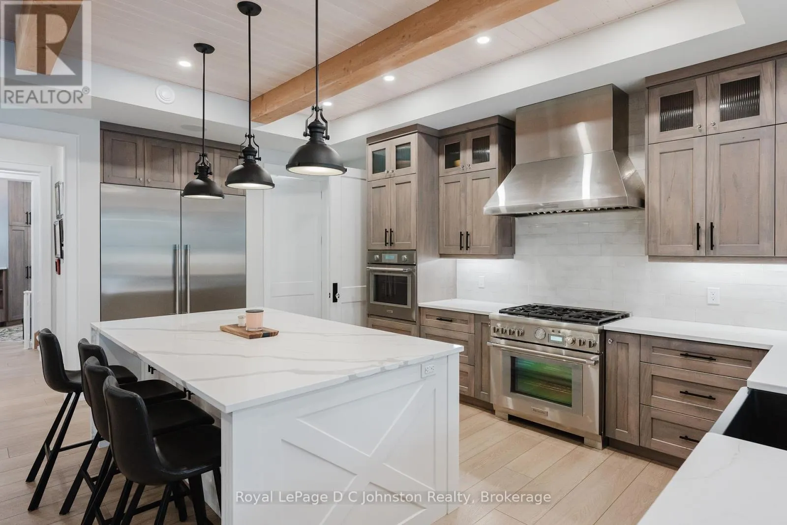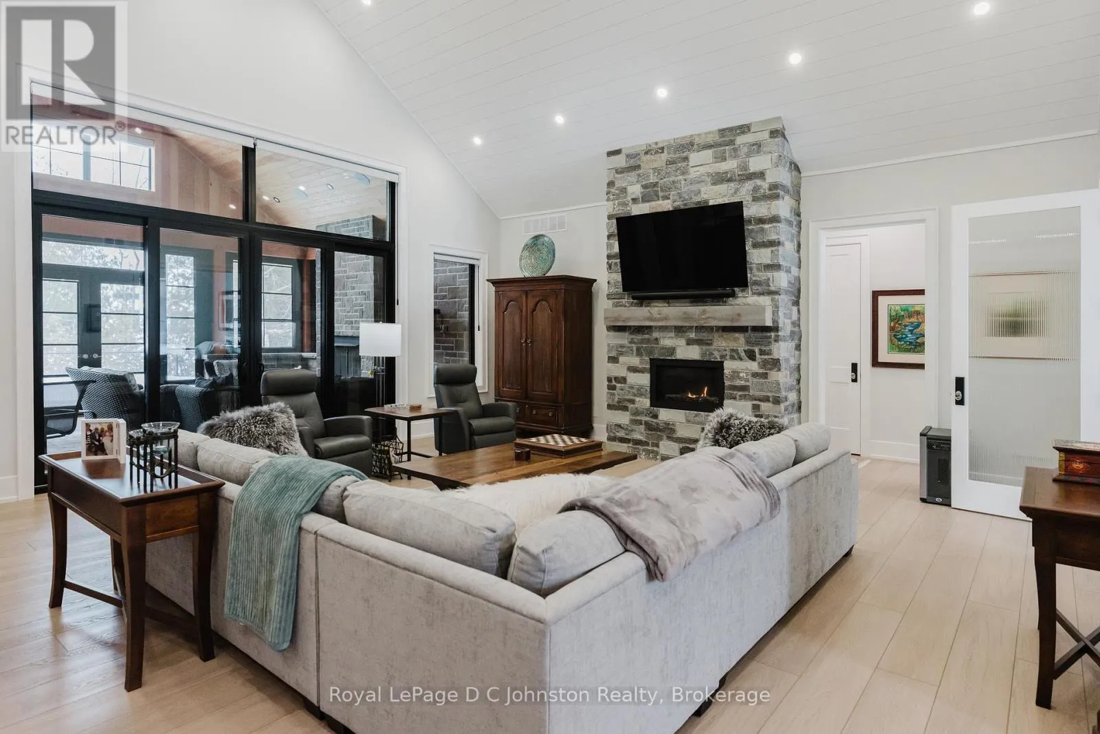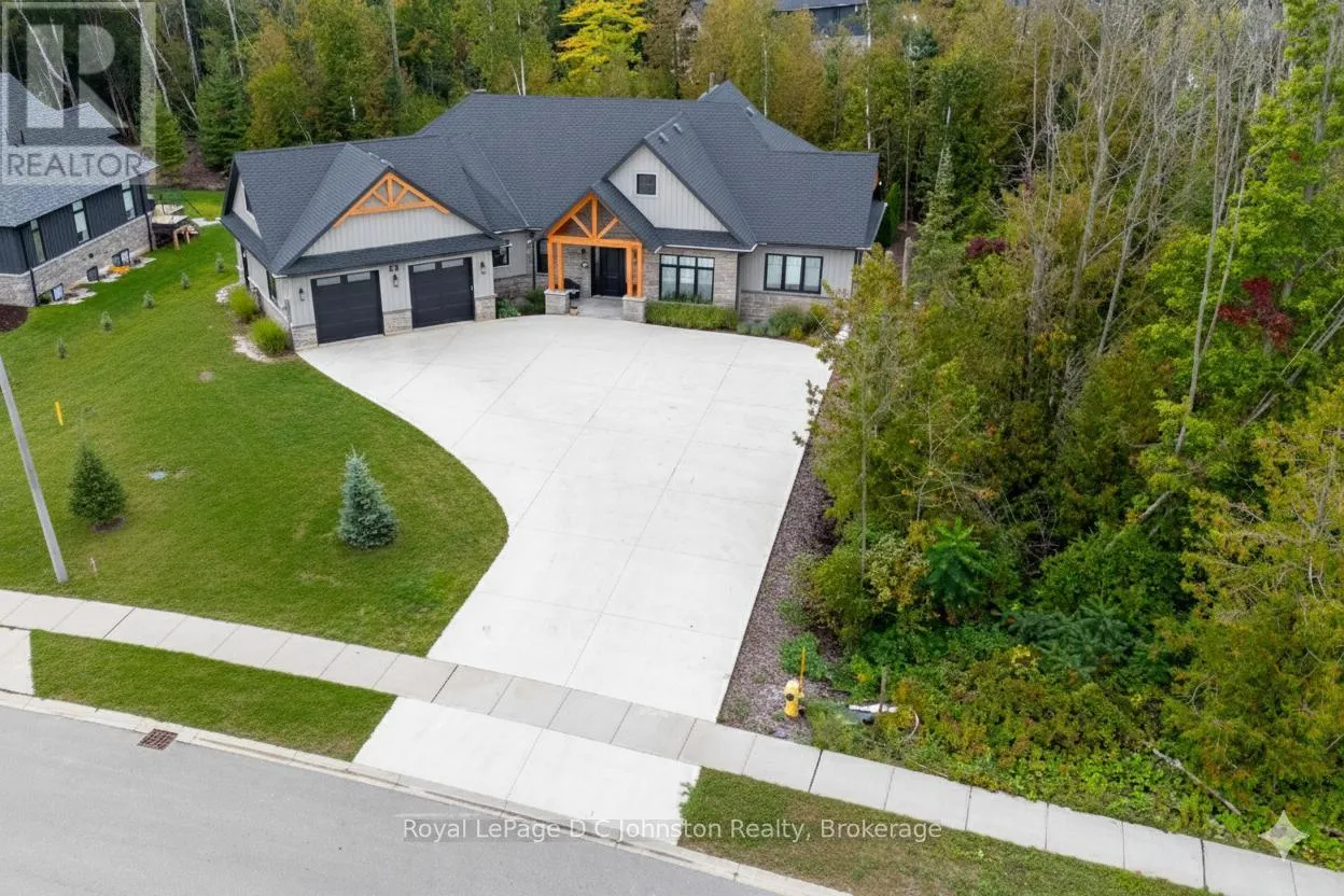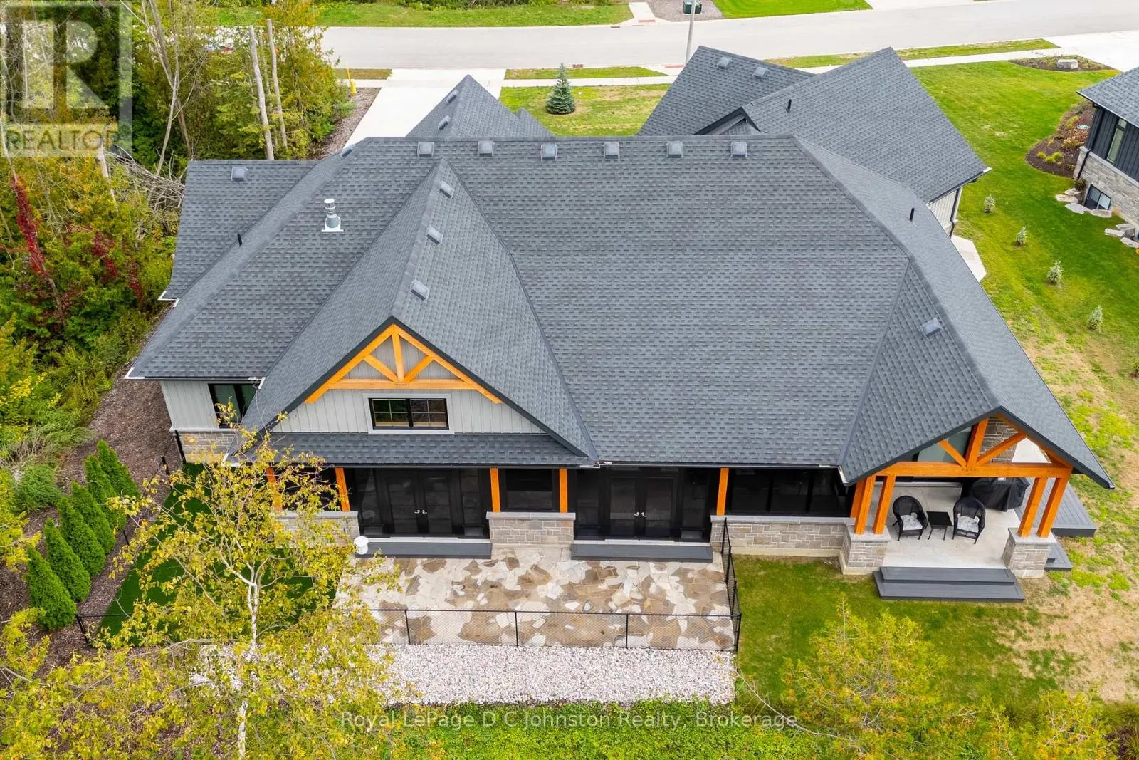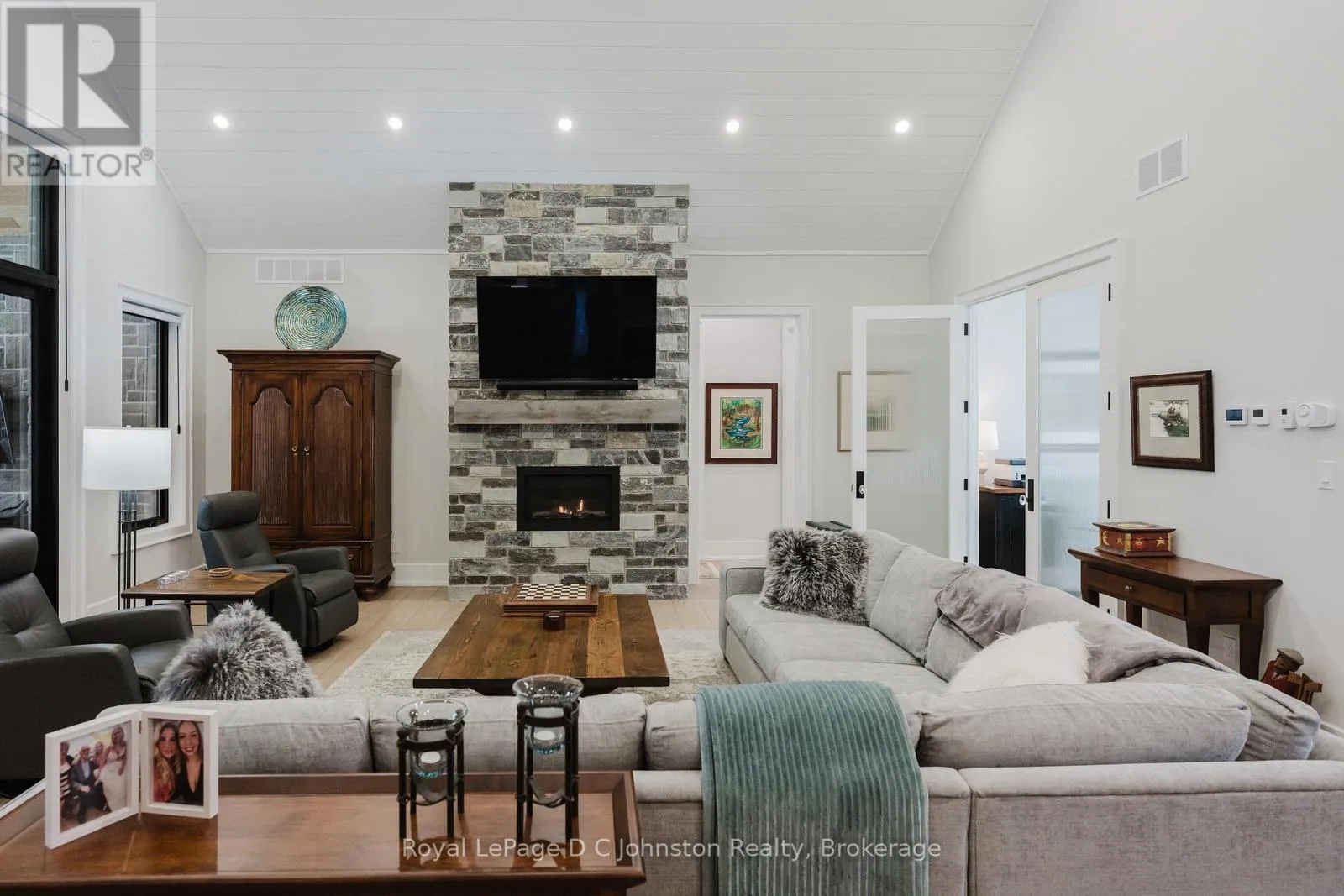 Cross Streets: Concession Rd 10. ** Directions: North end of Port Elgin, West on Concession 10 towards Lake Huron, Turn right on Lakeside Woods Crescent to property on left side. Introducing an architectural masterpiece where bespoke craftsmanship meets unparalleled luxury. Step inside this stunning 3267 square foot bungalow, built without stairs on grade, and immediately experience the soaring great room with a vaulted white shiplap ceiling, a custom floor-to-ceiling stone gas fireplace, and a sleek wet bar with Marvel bar fridge. This space seamlessly flows into the gourmet kitchen and dining area, which are defined by Douglas fir ceiling beams and a white washed tongue and groove ceiling. The kitchen is outfitted with gorgeous maple cabinetry, upscale Thermador appliances, a quartz island with a waterfall edge and a large walk in pantry. The property extends its entertaining opulence to a fully enclosed 650 square foot three season sunroom featuring a second gas fireplace, spectacular milled Douglas fir ceilings and beams and heated sandblasted stone floors. A serene primary suite awaits, complete with a vaulted shiplap ceiling, walk-out to a large covered porch and ensuite featuring an oversized walk-in shower and freestanding tub. The split-plan design separates the guest bedrooms and bath for ultimate privacy. The home features a 500 square foot bonus room with a full bath and separate heating/cooling above the garage. Equally focused on functional luxury, there is a dedicated laundry room with custom cabinetry and quartz countertops, as well as a mudroom with coordinating maple cabinets and quartz counters - providing an elegant transition from the oversized double garage. Every detail, from the exquisite millwork, heated towel bars, in-floor gas hot water heating, Generac standby generator,, speaks to a life of refined comfort. Situated midway between Port Elgin and Southampton, this absolutely exquisite home, clad in stone and Maibec wood siding on a private wooded lot, is ideally located to take full advantage of the coveted four-season lakeside lifestyle Saugeen Shores is known for. (id:27476)