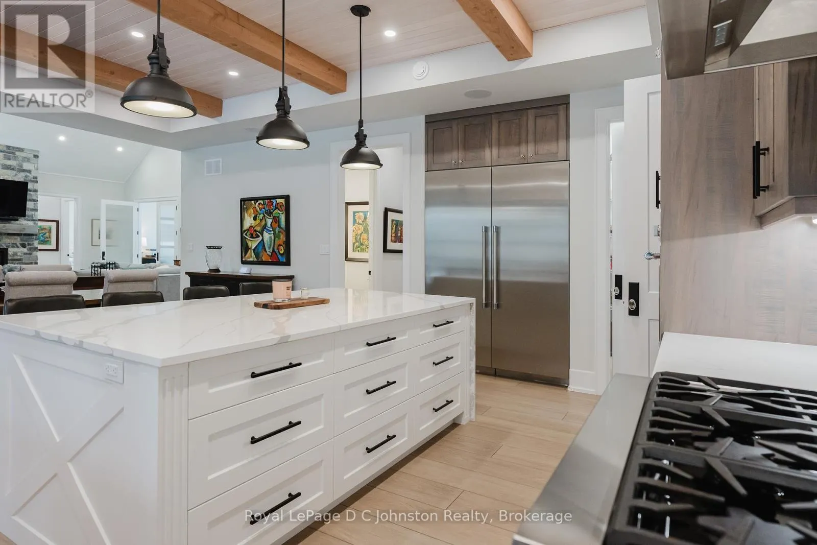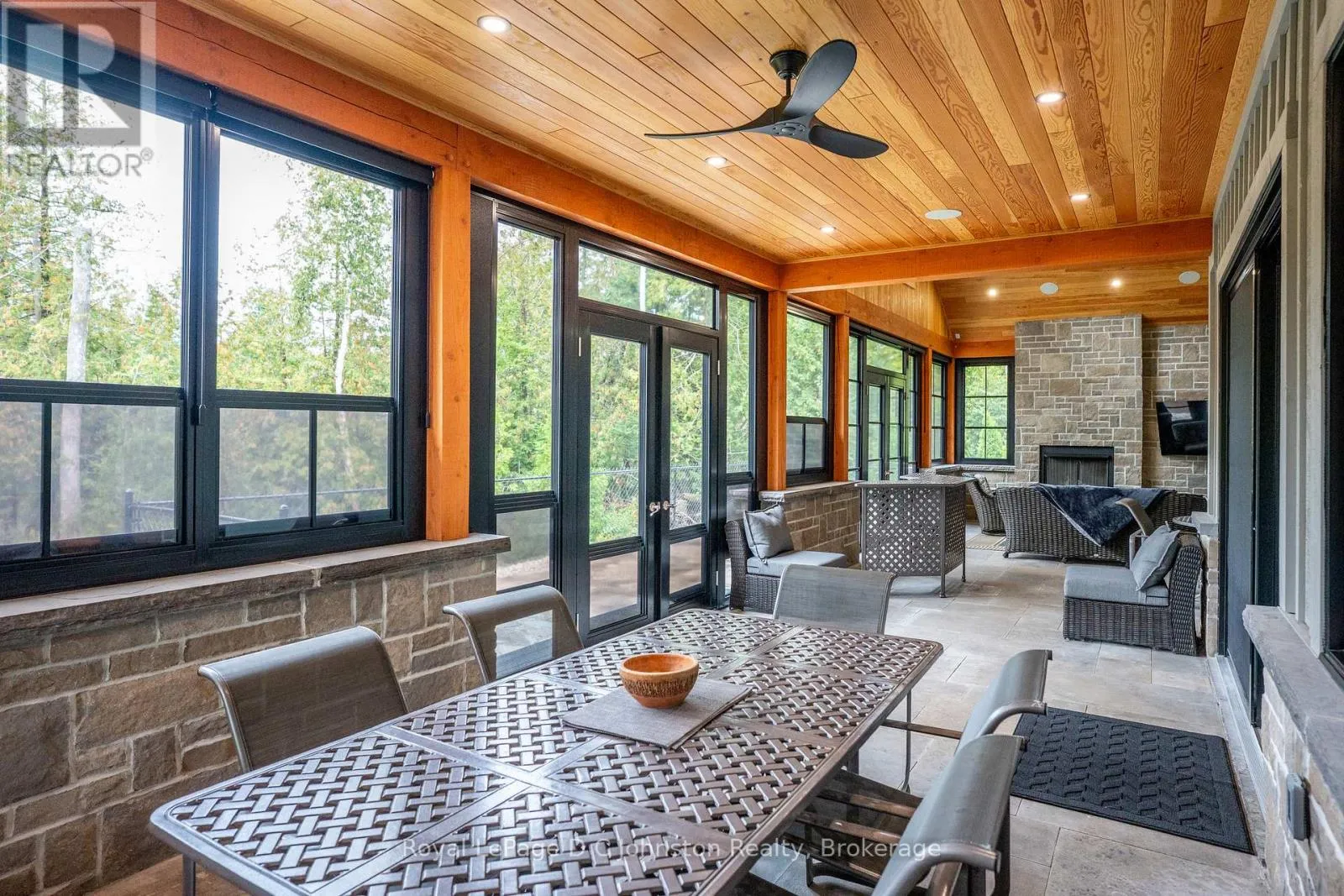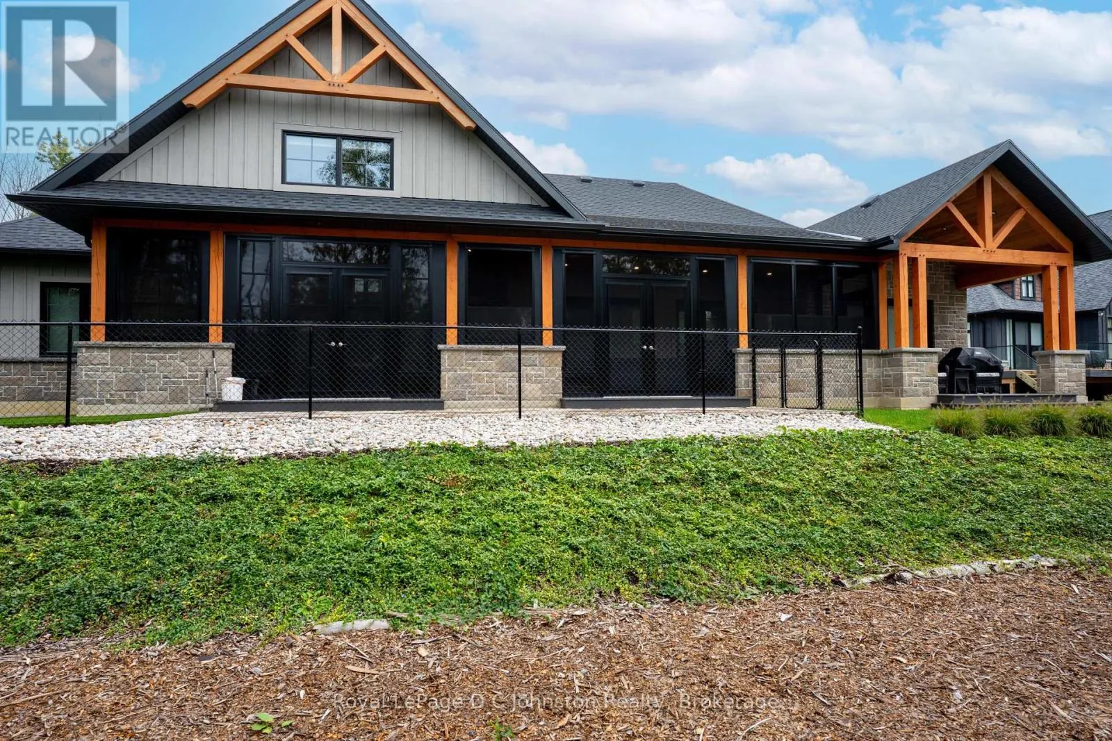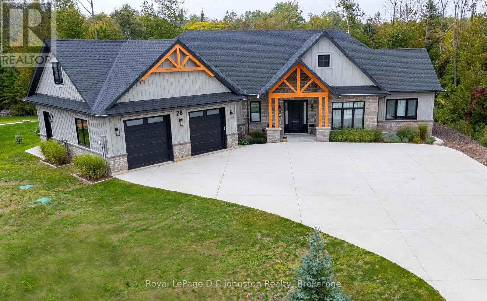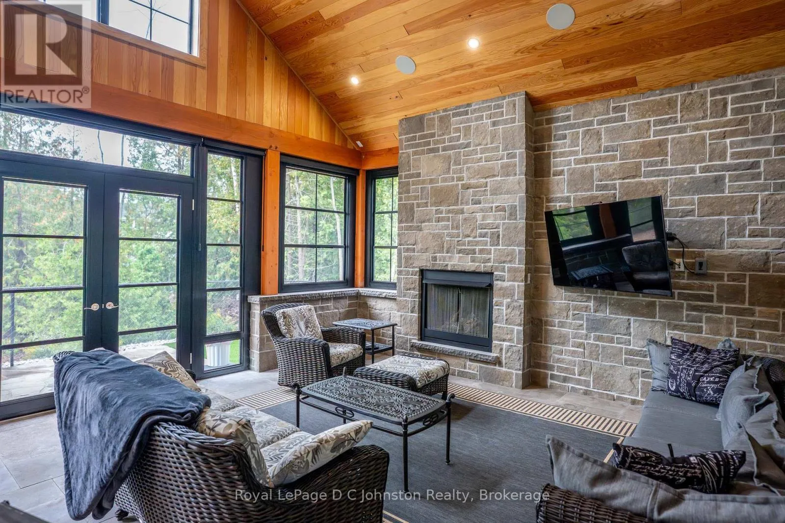 Cross Streets: Concession Rd 10. ** Directions: North end of Port Elgin, West on Concession 10 towards Lake Huron, Turn right on Lakeside Woods Crescent to property on left side. Introducing an architectural masterpiece where bespoke craftsmanship meets unparalleled luxury. Step inside this stunning 3267 square foot bungalow, built without stairs on grade, and immediately experience the soaring great room with a vaulted white shiplap ceiling, a custom floor-to-ceiling stone gas fireplace, and a sleek wet bar with Marvel bar fridge. This space seamlessly flows into the gourmet kitchen and dining area, which are defined by Douglas fir ceiling beams and a white washed tongue and groove ceiling. The kitchen is outfitted with gorgeous maple cabinetry, upscale Thermador appliances, a quartz island with a waterfall edge and a large walk in pantry. The property extends its entertaining opulence to a fully enclosed 650 square foot three season sunroom featuring a second gas fireplace, spectacular milled Douglas fir ceilings and beams and heated sandblasted stone floors. A serene primary suite awaits, complete with a vaulted shiplap ceiling, walk-out to a large covered porch and ensuite featuring an oversized walk-in shower and freestanding tub. The split-plan design separates the guest bedrooms and bath for ultimate privacy. The home features a 500 square foot bonus room with a full bath and separate heating/cooling above the garage. Equally focused on functional luxury, there is a dedicated laundry room with custom cabinetry and quartz countertops, as well as a mudroom with coordinating maple cabinets and quartz counters - providing an elegant transition from the oversized double garage. Every detail, from the exquisite millwork, heated towel bars, in-floor gas hot water heating, Generac standby generator,, speaks to a life of refined comfort. Situated midway between Port Elgin and Southampton, this absolutely exquisite home, clad in stone and Maibec wood siding on a private wooded lot, is ideally located to take full advantage of the coveted four-season lakeside lifestyle Saugeen Shores is known for. (id:27476)