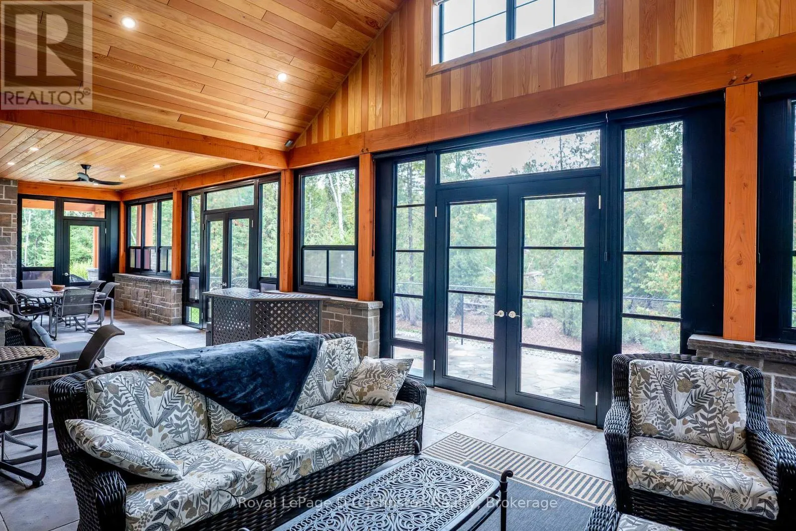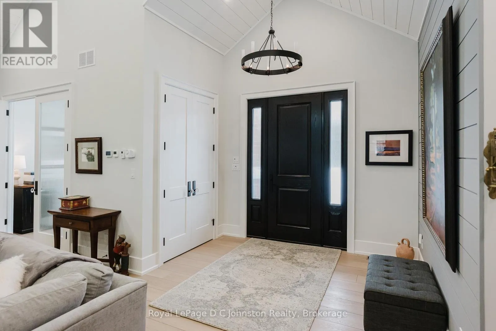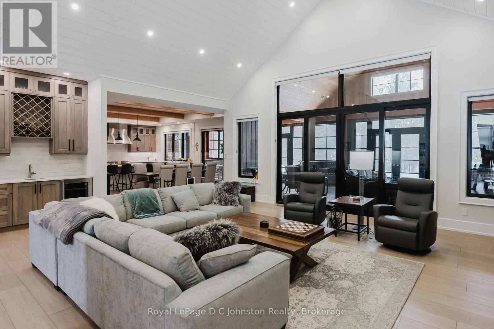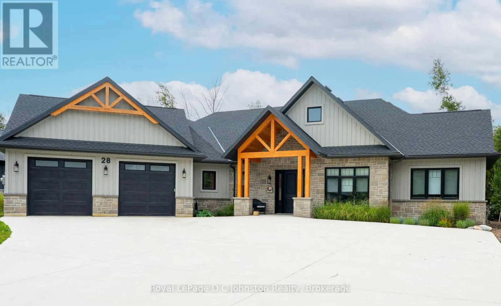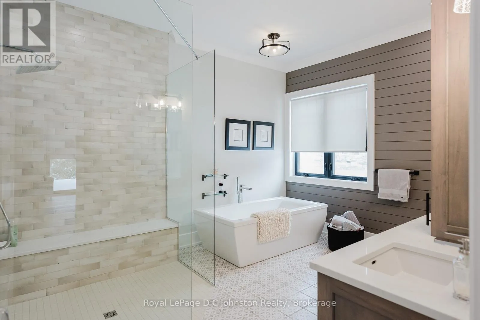 Cross Streets: Concession Rd 10. ** Directions: North end of Port Elgin, West on Concession 10 towards Lake Huron, Turn right on Lakeside Woods Crescent to property on left side. Introducing an architectural masterpiece where bespoke craftsmanship meets unparalleled luxury. Step inside this stunning 3267 square foot bungalow, built without stairs on grade, and immediately experience the soaring great room with a vaulted white shiplap ceiling, a custom floor-to-ceiling stone gas fireplace, and a sleek wet bar with Marvel bar fridge. This space seamlessly flows into the gourmet kitchen and dining area, which are defined by Douglas fir ceiling beams and a white washed tongue and groove ceiling. The kitchen is outfitted with gorgeous maple cabinetry, upscale Thermador appliances, a quartz island with a waterfall edge and a large walk in pantry. The property extends its entertaining opulence to a fully enclosed 650 square foot three season sunroom featuring a second gas fireplace, spectacular milled Douglas fir ceilings and beams and heated sandblasted stone floors. A serene primary suite awaits, complete with a vaulted shiplap ceiling, walk-out to a large covered porch and ensuite featuring an oversized walk-in shower and freestanding tub. The split-plan design separates the guest bedrooms and bath for ultimate privacy. The home features a 500 square foot bonus room with a full bath and separate heating/cooling above the garage. Equally focused on functional luxury, there is a dedicated laundry room with custom cabinetry and quartz countertops, as well as a mudroom with coordinating maple cabinets and quartz counters - providing an elegant transition from the oversized double garage. Every detail, from the exquisite millwork, heated towel bars, in-floor gas hot water heating, Generac standby generator,, speaks to a life of refined comfort. Situated midway between Port Elgin and Southampton, this absolutely exquisite home, clad in stone and Maibec wood siding on a private wooded lot, is ideally located to take full advantage of the coveted four-season lakeside lifestyle Saugeen Shores is known for. (id:27476)