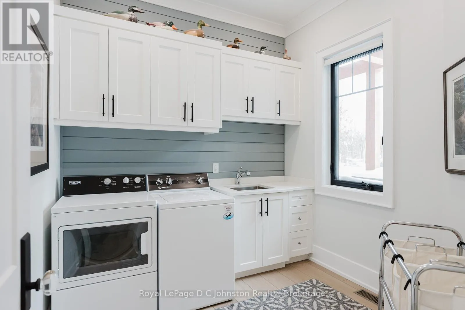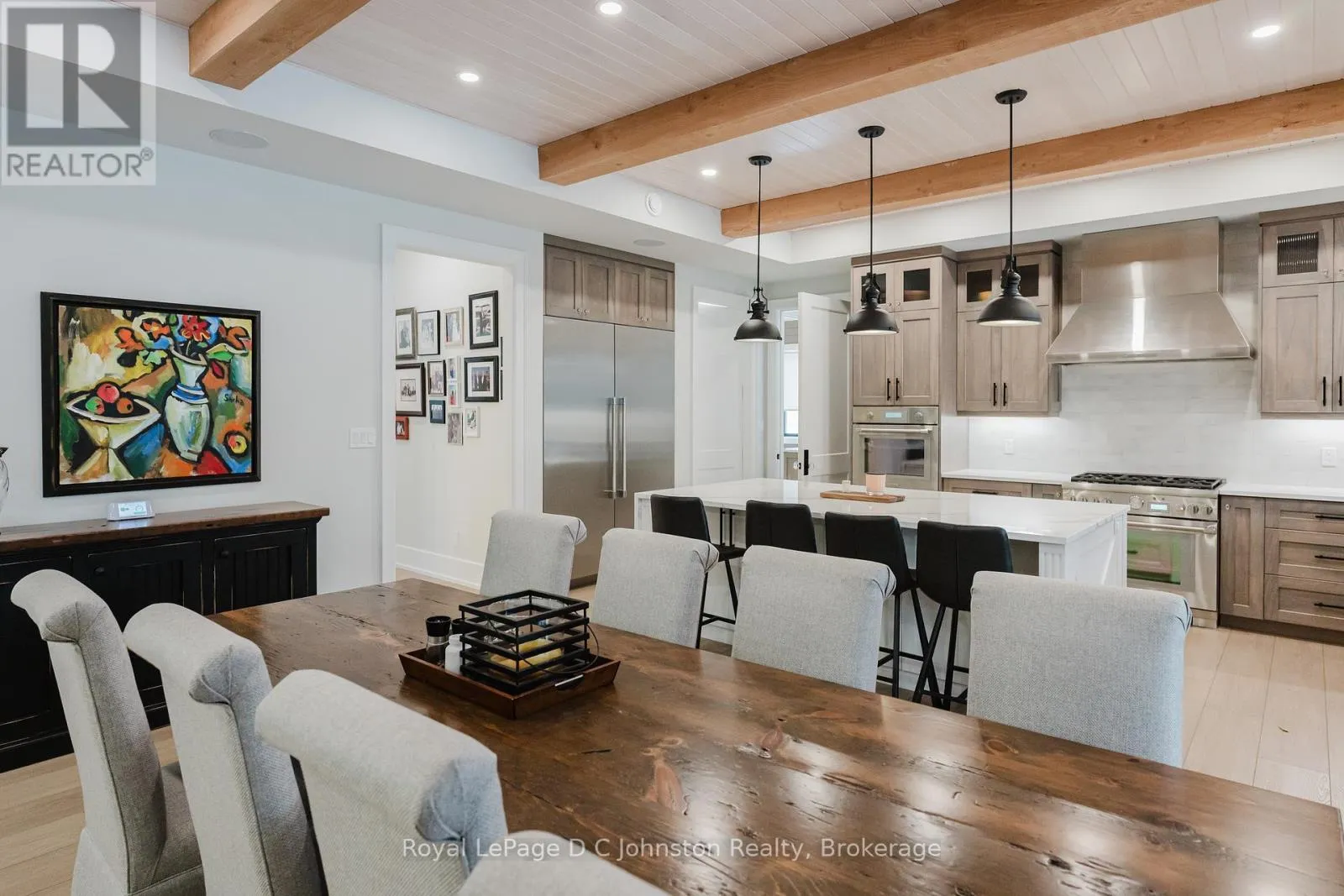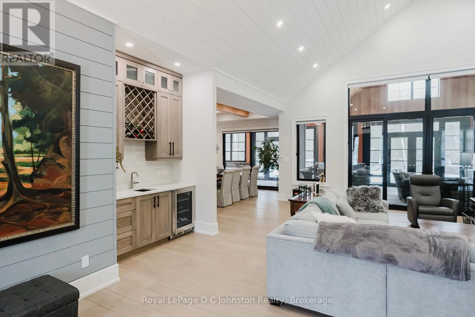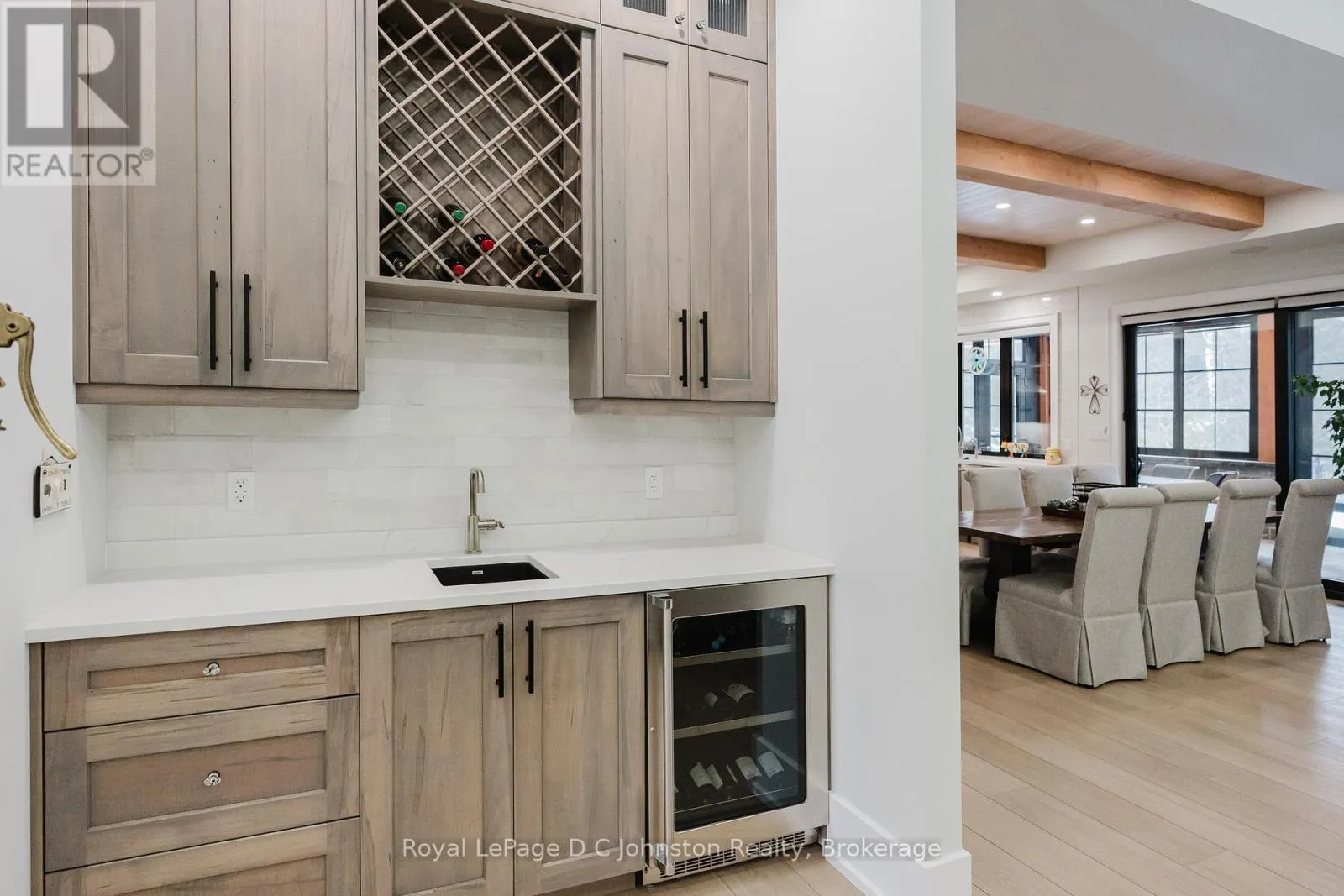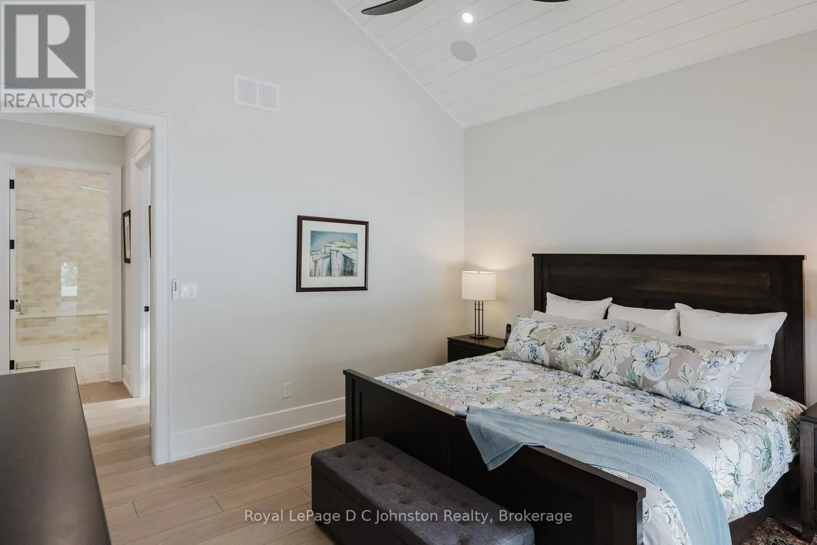 Cross Streets: Concession Rd 10. ** Directions: North end of Port Elgin, West on Concession 10 towards Lake Huron, Turn right on Lakeside Woods Crescent to property on left side. Introducing an architectural masterpiece where bespoke craftsmanship meets unparalleled luxury. Step inside this stunning 3267 square foot bungalow, built without stairs on grade, and immediately experience the soaring great room with a vaulted white shiplap ceiling, a custom floor-to-ceiling stone gas fireplace, and a sleek wet bar with Marvel bar fridge. This space seamlessly flows into the gourmet kitchen and dining area, which are defined by Douglas fir ceiling beams and a white washed tongue and groove ceiling. The kitchen is outfitted with gorgeous maple cabinetry, upscale Thermador appliances, a quartz island with a waterfall edge and a large walk in pantry. The property extends its entertaining opulence to a fully enclosed 650 square foot three season sunroom featuring a second gas fireplace, spectacular milled Douglas fir ceilings and beams and heated sandblasted stone floors. A serene primary suite awaits, complete with a vaulted shiplap ceiling, walk-out to a large covered porch and ensuite featuring an oversized walk-in shower and freestanding tub. The split-plan design separates the guest bedrooms and bath for ultimate privacy. The home features a 500 square foot bonus room with a full bath and separate heating/cooling above the garage. Equally focused on functional luxury, there is a dedicated laundry room with custom cabinetry and quartz countertops, as well as a mudroom with coordinating maple cabinets and quartz counters - providing an elegant transition from the oversized double garage. Every detail, from the exquisite millwork, heated towel bars, in-floor gas hot water heating, Generac standby generator,, speaks to a life of refined comfort. Situated midway between Port Elgin and Southampton, this absolutely exquisite home, clad in stone and Maibec wood siding on a private wooded lot, is ideally located to take full advantage of the coveted four-season lakeside lifestyle Saugeen Shores is known for. (id:27476)
