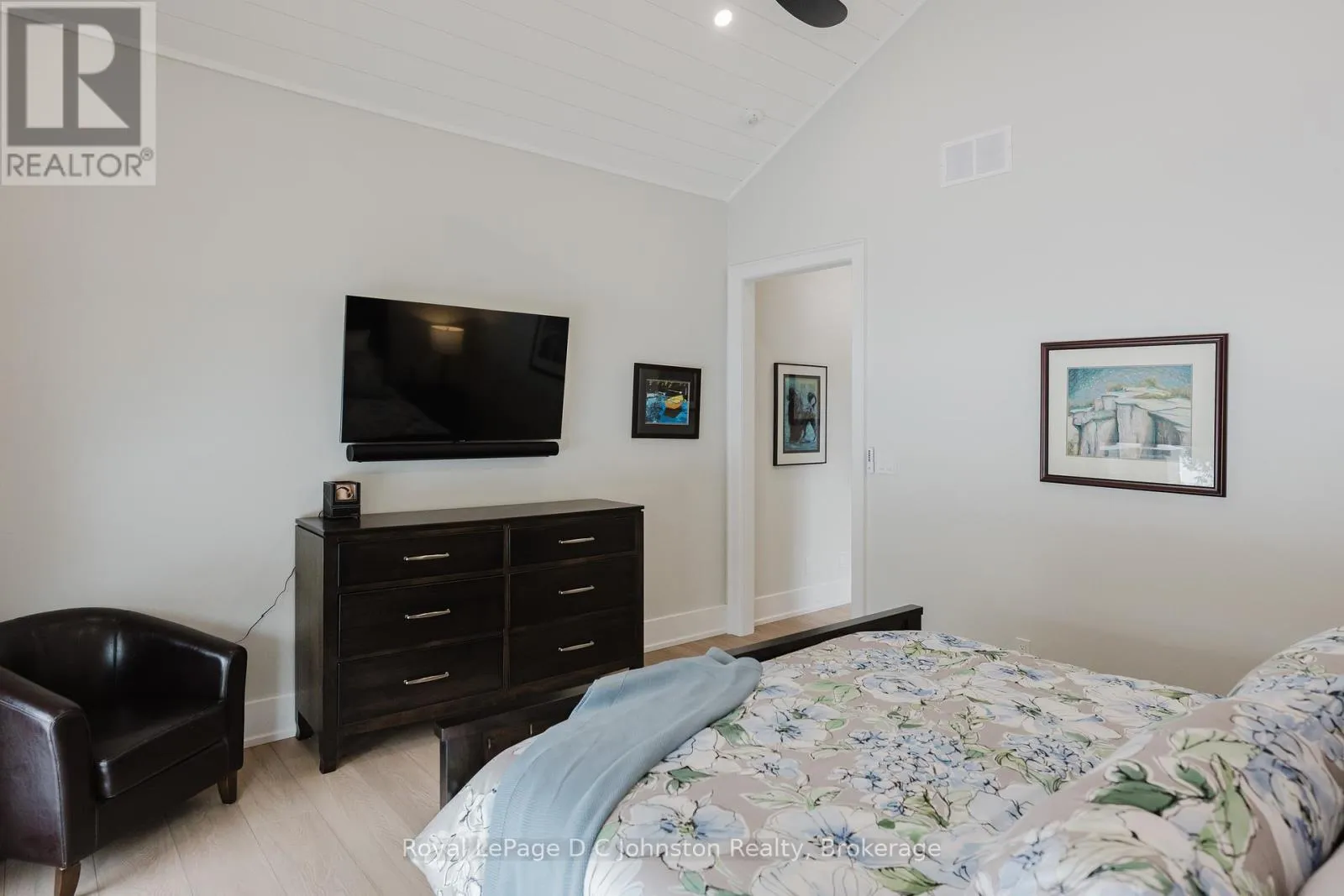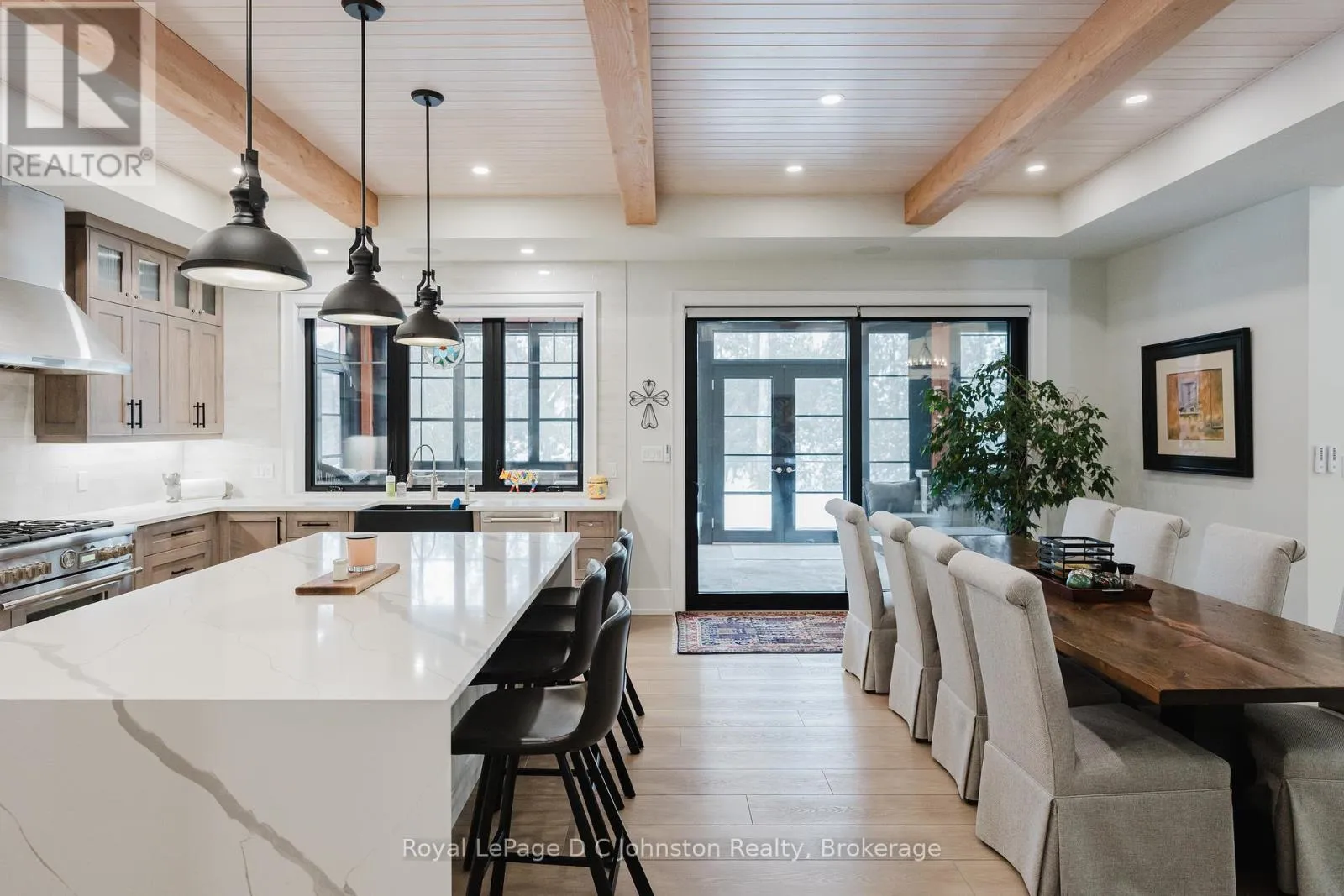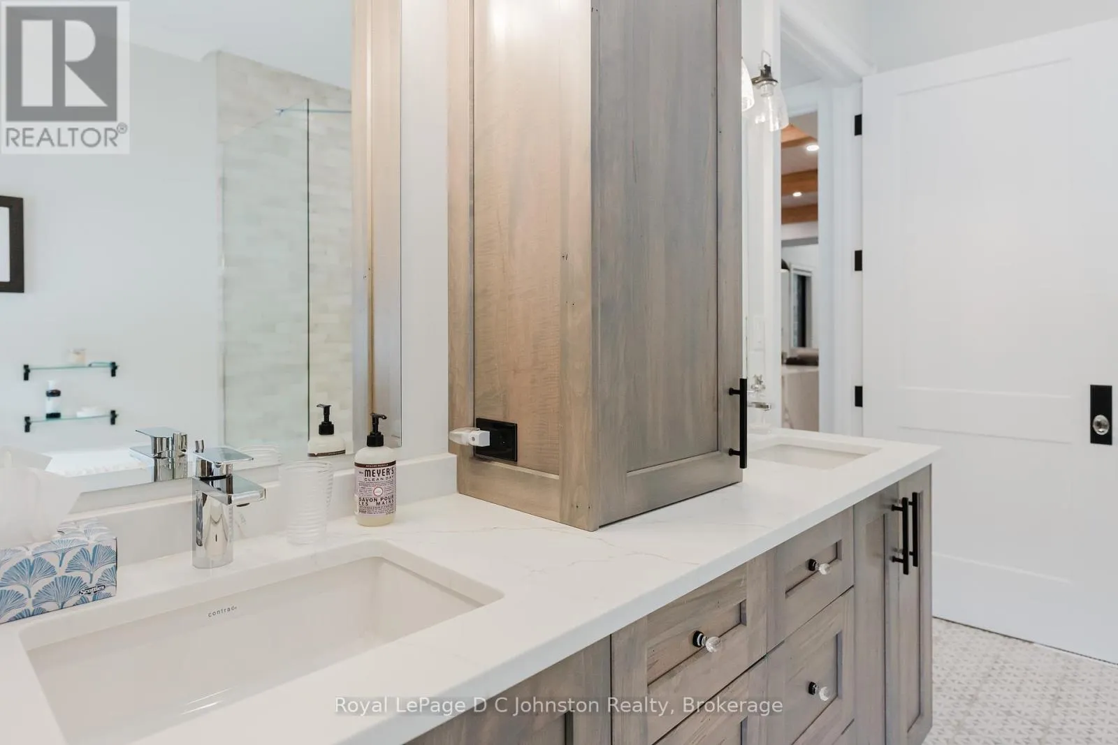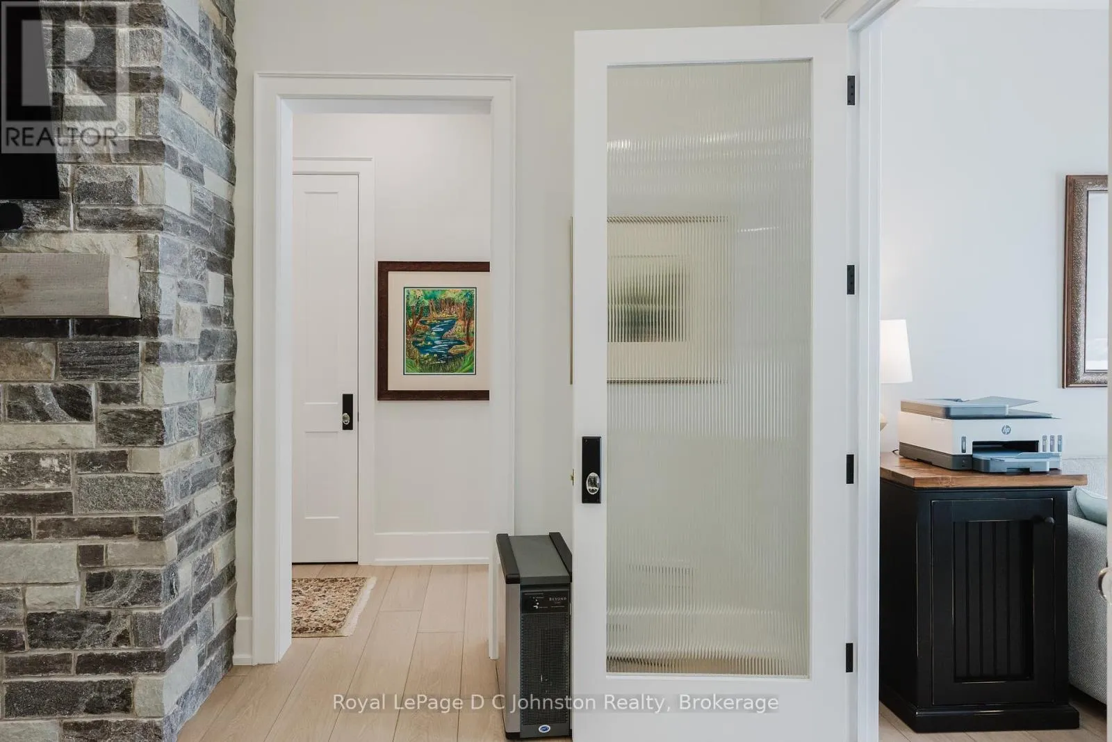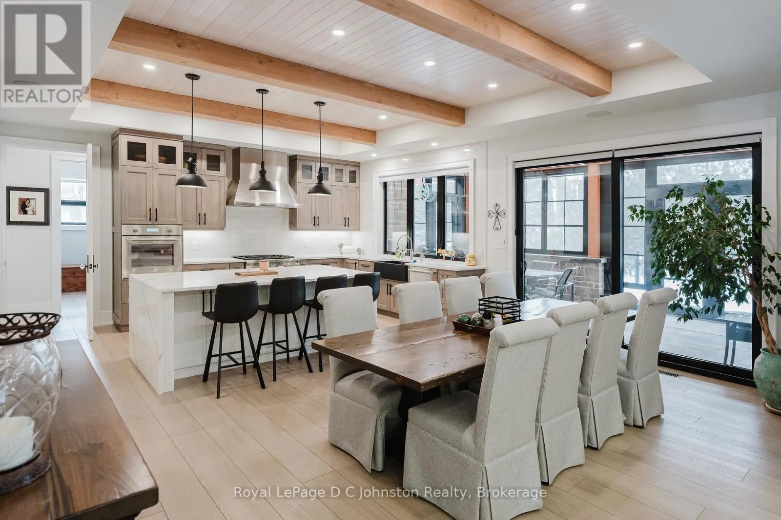 Cross Streets: Concession Rd 10. ** Directions: North end of Port Elgin, West on Concession 10 towards Lake Huron, Turn right on Lakeside Woods Crescent to property on left side. Introducing an architectural masterpiece where bespoke craftsmanship meets unparalleled luxury. Step inside this stunning 3267 square foot bungalow, built without stairs on grade, and immediately experience the soaring great room with a vaulted white shiplap ceiling, a custom floor-to-ceiling stone gas fireplace, and a sleek wet bar with Marvel bar fridge. This space seamlessly flows into the gourmet kitchen and dining area, which are defined by Douglas fir ceiling beams and a white washed tongue and groove ceiling. The kitchen is outfitted with gorgeous maple cabinetry, upscale Thermador appliances, a quartz island with a waterfall edge and a large walk in pantry. The property extends its entertaining opulence to a fully enclosed 650 square foot three season sunroom featuring a second gas fireplace, spectacular milled Douglas fir ceilings and beams and heated sandblasted stone floors. A serene primary suite awaits, complete with a vaulted shiplap ceiling, walk-out to a large covered porch and ensuite featuring an oversized walk-in shower and freestanding tub. The split-plan design separates the guest bedrooms and bath for ultimate privacy. The home features a 500 square foot bonus room with a full bath and separate heating/cooling above the garage. Equally focused on functional luxury, there is a dedicated laundry room with custom cabinetry and quartz countertops, as well as a mudroom with coordinating maple cabinets and quartz counters - providing an elegant transition from the oversized double garage. Every detail, from the exquisite millwork, heated towel bars, in-floor gas hot water heating, Generac standby generator,, speaks to a life of refined comfort. Situated midway between Port Elgin and Southampton, this absolutely exquisite home, clad in stone and Maibec wood siding on a private wooded lot, is ideally located to take full advantage of the coveted four-season lakeside lifestyle Saugeen Shores is known for. (id:27476)