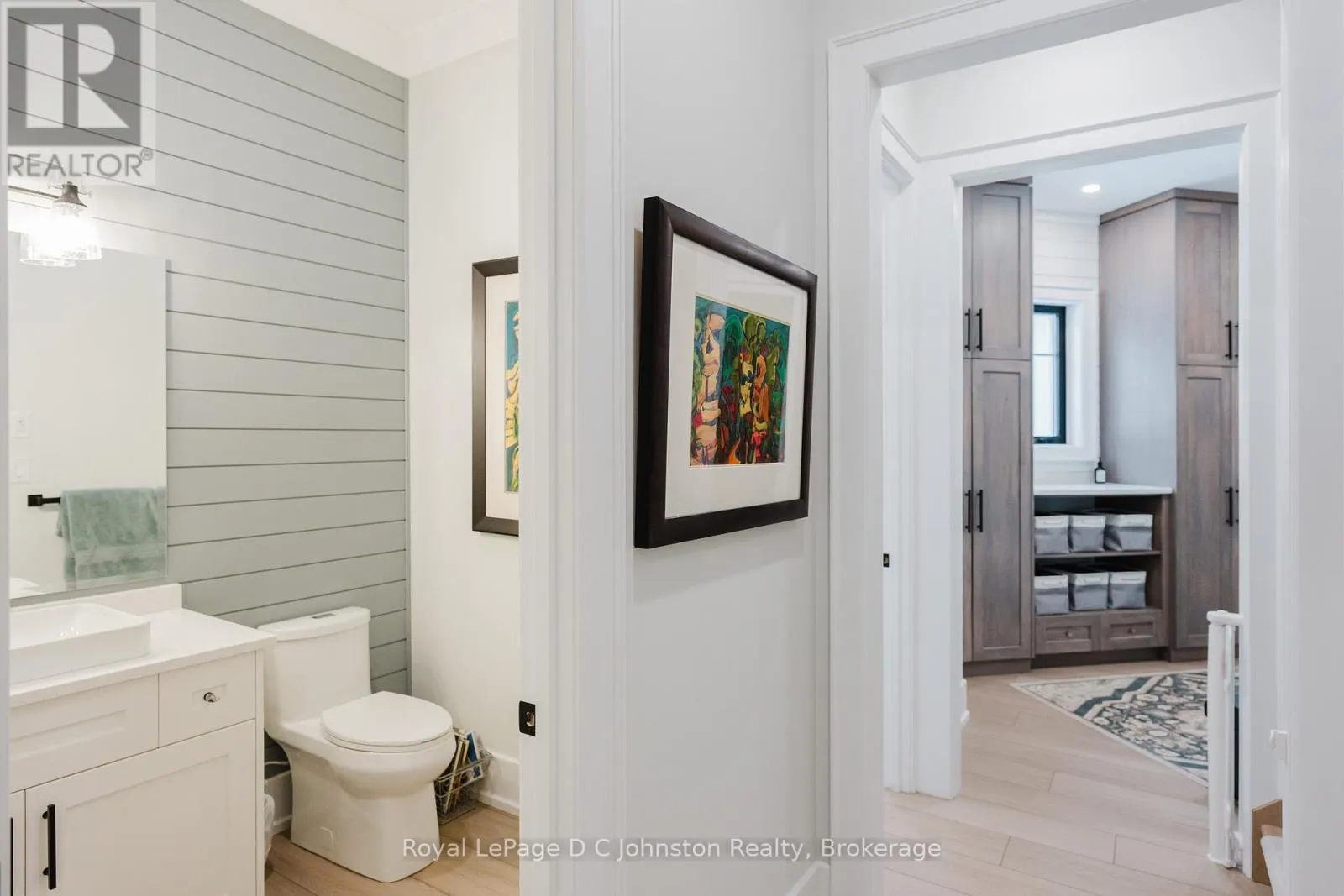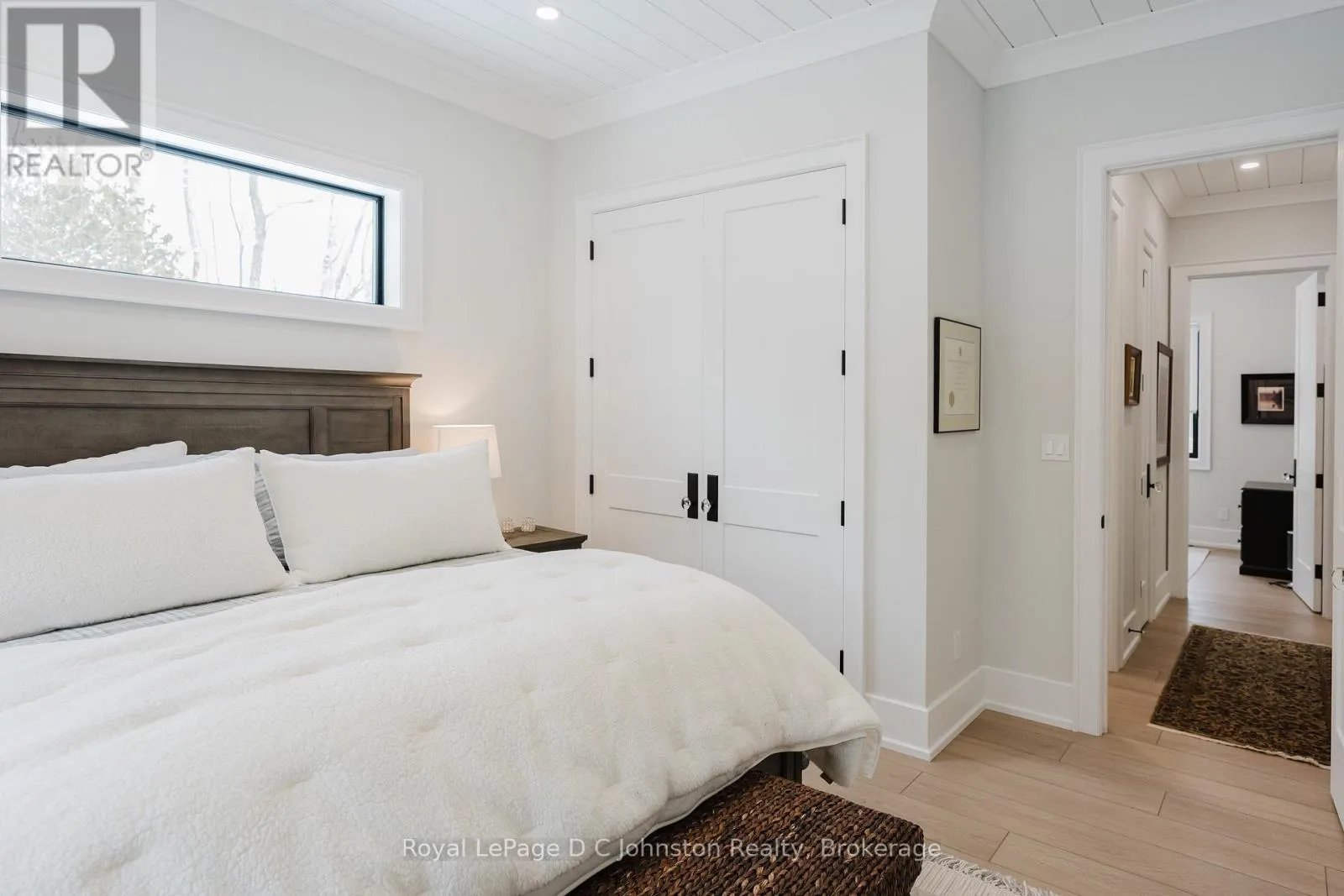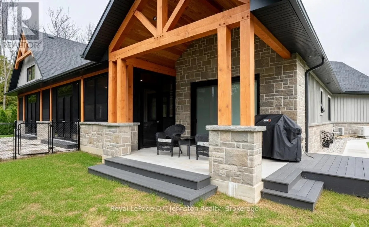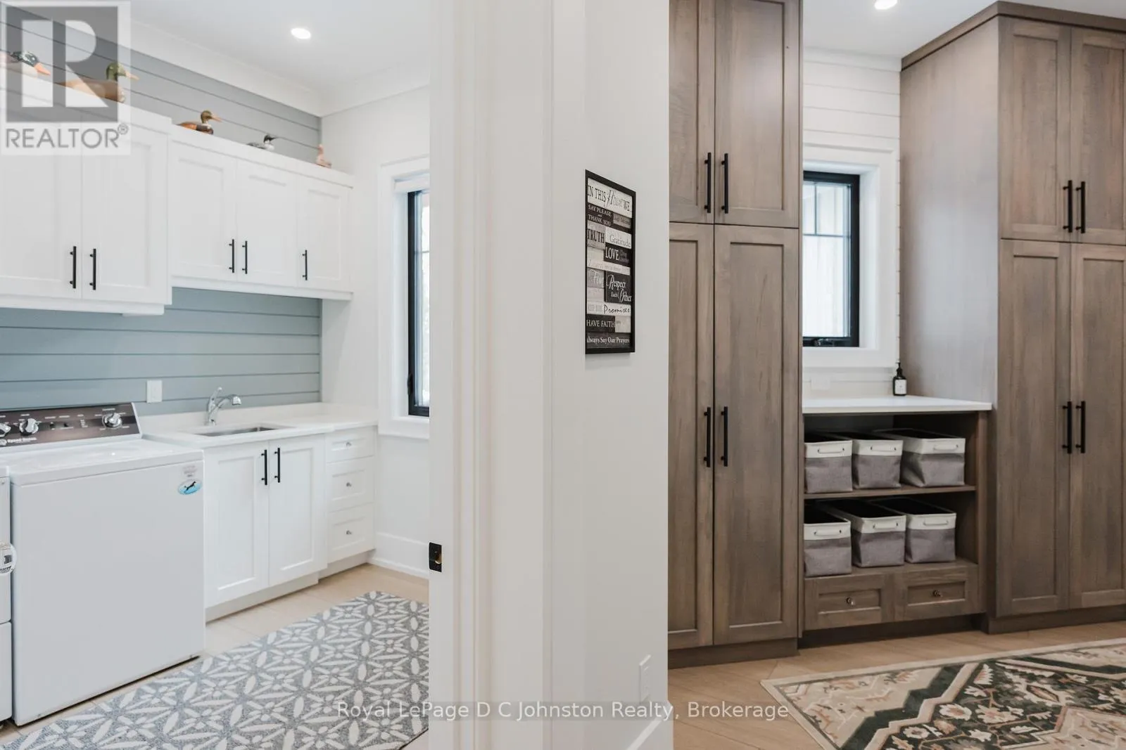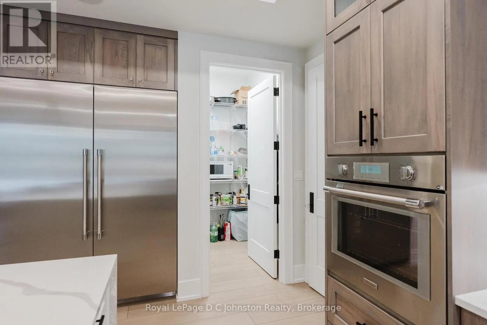 Cross Streets: Concession Rd 10. ** Directions: North end of Port Elgin, West on Concession 10 towards Lake Huron, Turn right on Lakeside Woods Crescent to property on left side. Introducing an architectural masterpiece where bespoke craftsmanship meets unparalleled luxury. Step inside this stunning 3267 square foot bungalow, built without stairs on grade, and immediately experience the soaring great room with a vaulted white shiplap ceiling, a custom floor-to-ceiling stone gas fireplace, and a sleek wet bar with Marvel bar fridge. This space seamlessly flows into the gourmet kitchen and dining area, which are defined by Douglas fir ceiling beams and a white washed tongue and groove ceiling. The kitchen is outfitted with gorgeous maple cabinetry, upscale Thermador appliances, a quartz island with a waterfall edge and a large walk in pantry. The property extends its entertaining opulence to a fully enclosed 650 square foot three season sunroom featuring a second gas fireplace, spectacular milled Douglas fir ceilings and beams and heated sandblasted stone floors. A serene primary suite awaits, complete with a vaulted shiplap ceiling, walk-out to a large covered porch and ensuite featuring an oversized walk-in shower and freestanding tub. The split-plan design separates the guest bedrooms and bath for ultimate privacy. The home features a 500 square foot bonus room with a full bath and separate heating/cooling above the garage. Equally focused on functional luxury, there is a dedicated laundry room with custom cabinetry and quartz countertops, as well as a mudroom with coordinating maple cabinets and quartz counters - providing an elegant transition from the oversized double garage. Every detail, from the exquisite millwork, heated towel bars, in-floor gas hot water heating, Generac standby generator,, speaks to a life of refined comfort. Situated midway between Port Elgin and Southampton, this absolutely exquisite home, clad in stone and Maibec wood siding on a private wooded lot, is ideally located to take full advantage of the coveted four-season lakeside lifestyle Saugeen Shores is known for. (id:27476)