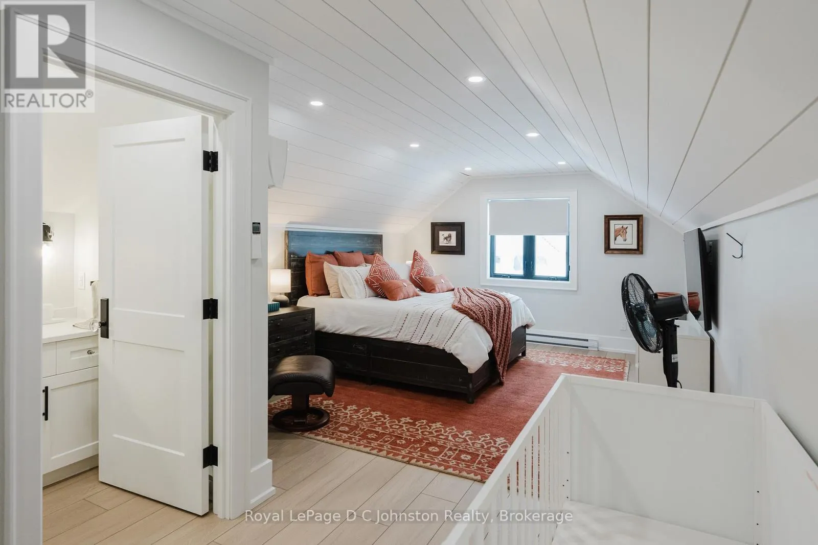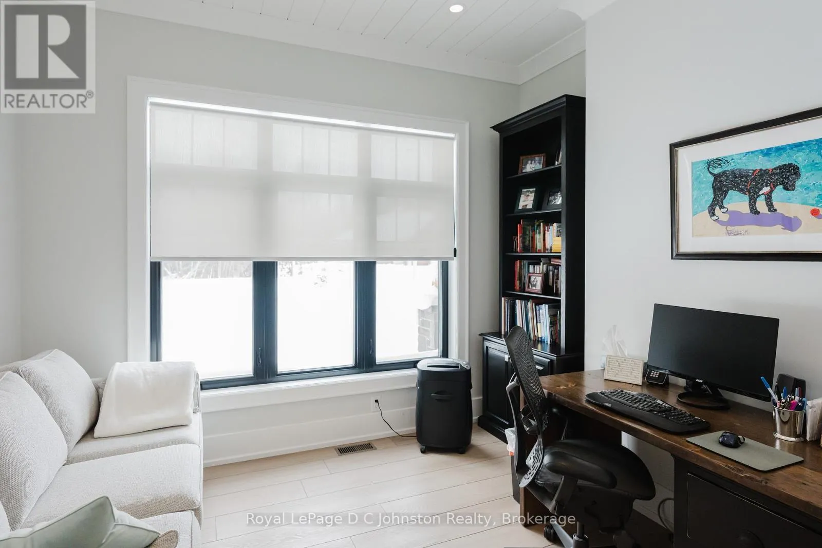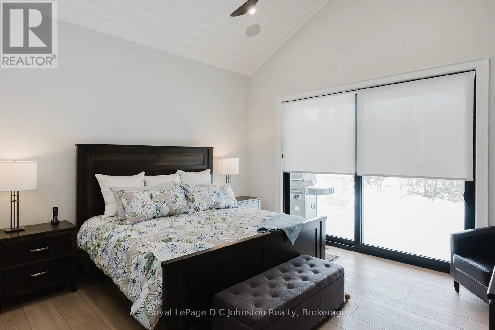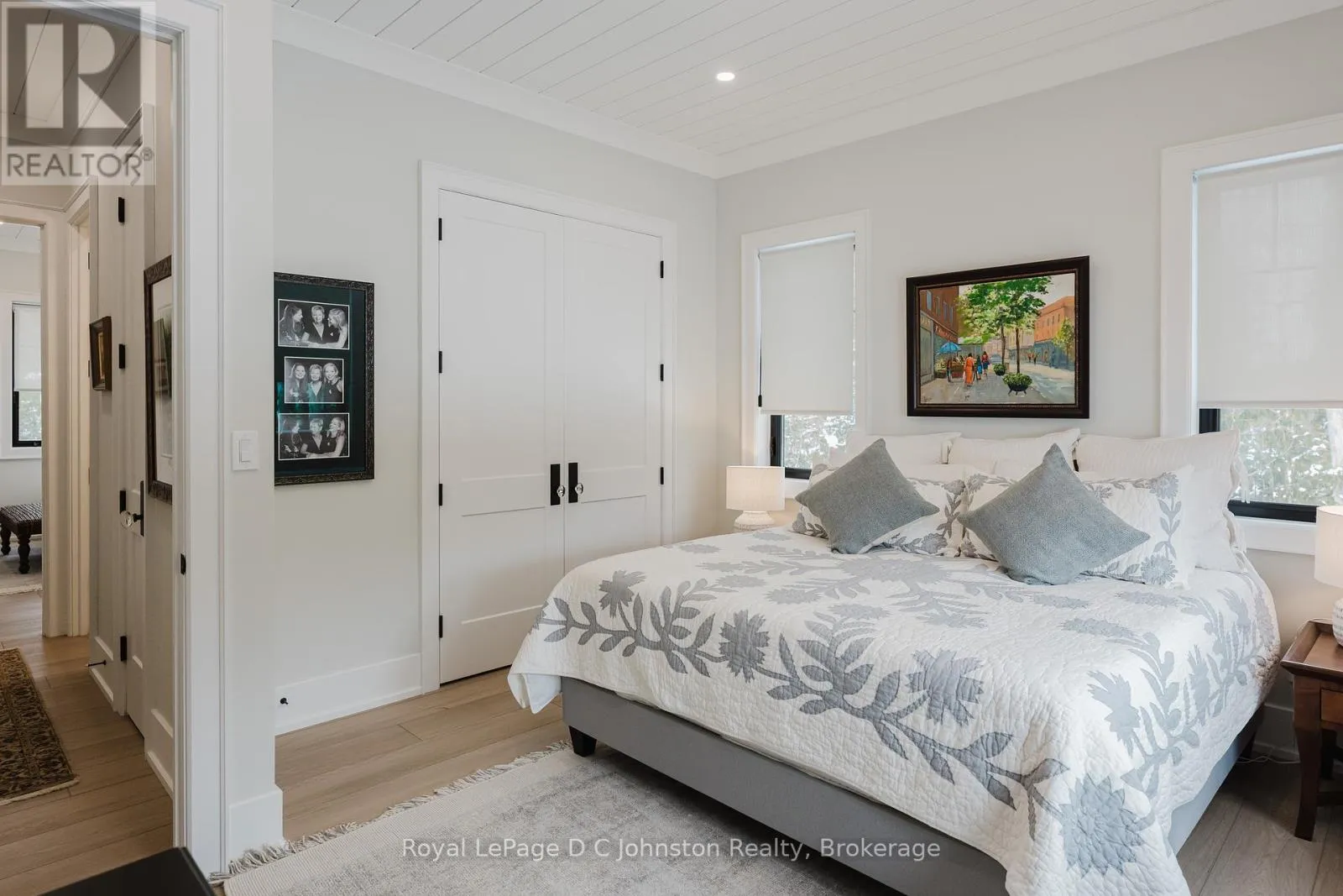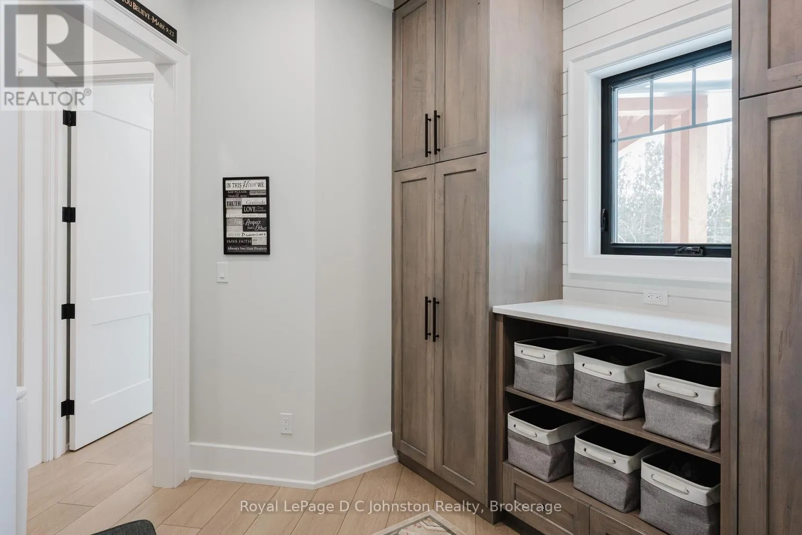 Cross Streets: Concession Rd 10. ** Directions: North end of Port Elgin, West on Concession 10 towards Lake Huron, Turn right on Lakeside Woods Crescent to property on left side. Introducing an architectural masterpiece where bespoke craftsmanship meets unparalleled luxury. Step inside this stunning 3267 square foot bungalow, built without stairs on grade, and immediately experience the soaring great room with a vaulted white shiplap ceiling, a custom floor-to-ceiling stone gas fireplace, and a sleek wet bar with Marvel bar fridge. This space seamlessly flows into the gourmet kitchen and dining area, which are defined by Douglas fir ceiling beams and a white washed tongue and groove ceiling. The kitchen is outfitted with gorgeous maple cabinetry, upscale Thermador appliances, a quartz island with a waterfall edge and a large walk in pantry. The property extends its entertaining opulence to a fully enclosed 650 square foot three season sunroom featuring a second gas fireplace, spectacular milled Douglas fir ceilings and beams and heated sandblasted stone floors. A serene primary suite awaits, complete with a vaulted shiplap ceiling, walk-out to a large covered porch and ensuite featuring an oversized walk-in shower and freestanding tub. The split-plan design separates the guest bedrooms and bath for ultimate privacy. The home features a 500 square foot bonus room with a full bath and separate heating/cooling above the garage. Equally focused on functional luxury, there is a dedicated laundry room with custom cabinetry and quartz countertops, as well as a mudroom with coordinating maple cabinets and quartz counters - providing an elegant transition from the oversized double garage. Every detail, from the exquisite millwork, heated towel bars, in-floor gas hot water heating, Generac standby generator,, speaks to a life of refined comfort. Situated midway between Port Elgin and Southampton, this absolutely exquisite home, clad in stone and Maibec wood siding on a private wooded lot, is ideally located to take full advantage of the coveted four-season lakeside lifestyle Saugeen Shores is known for. (id:27476)