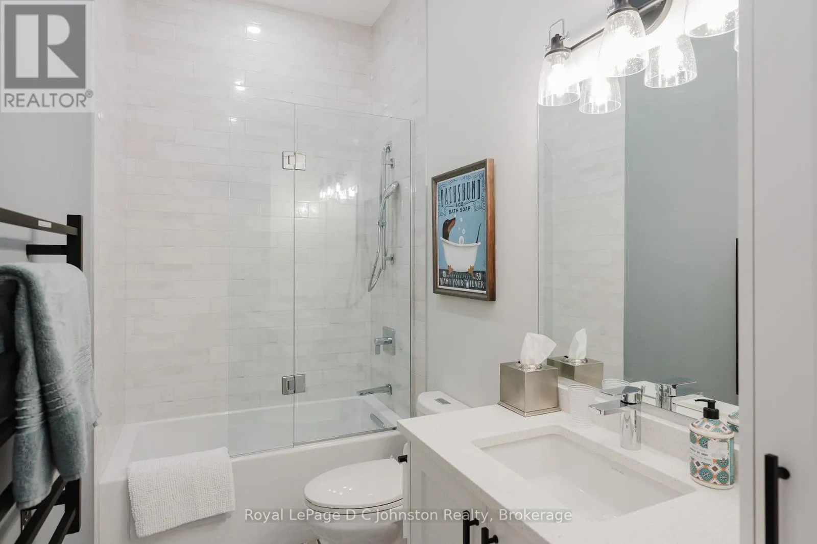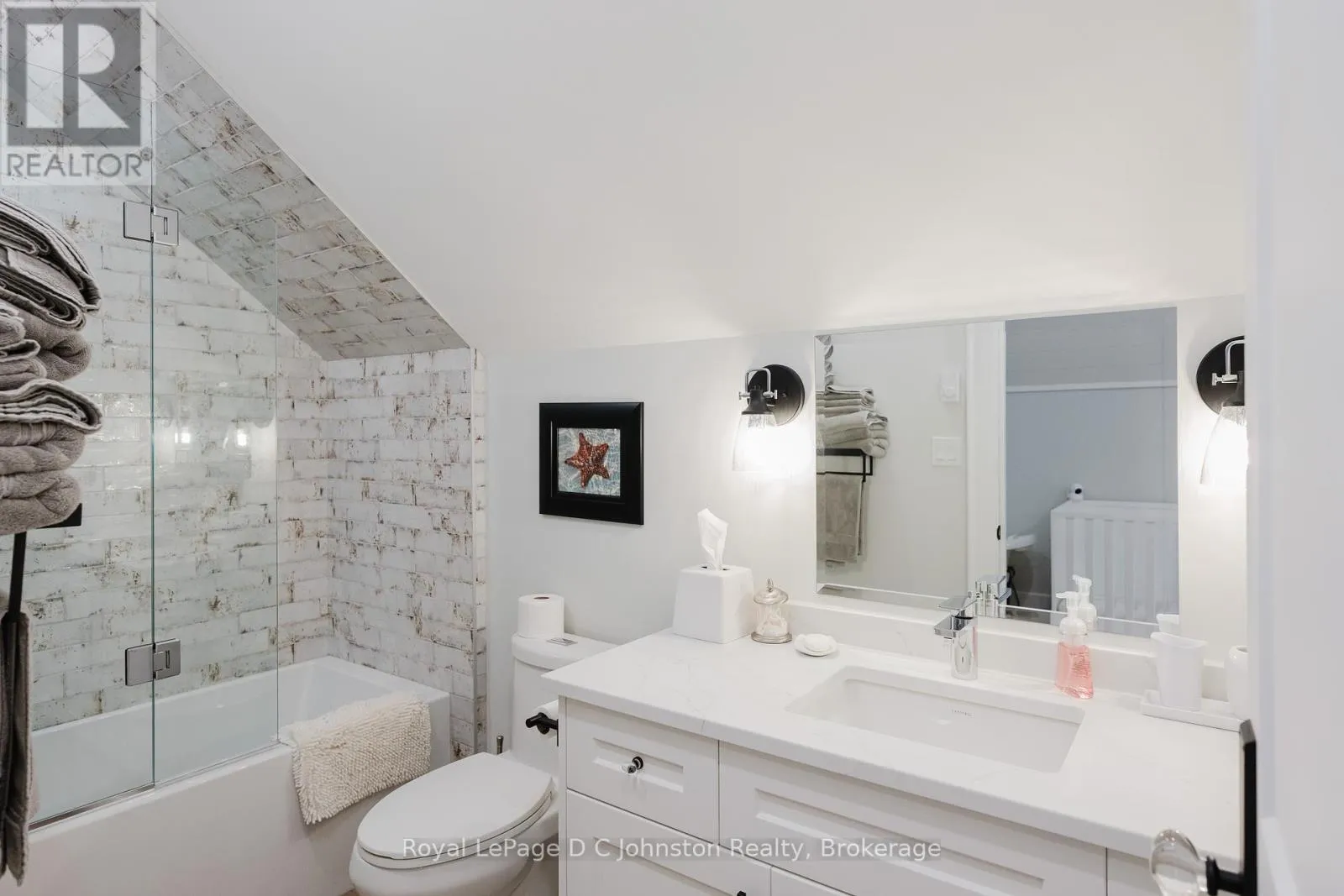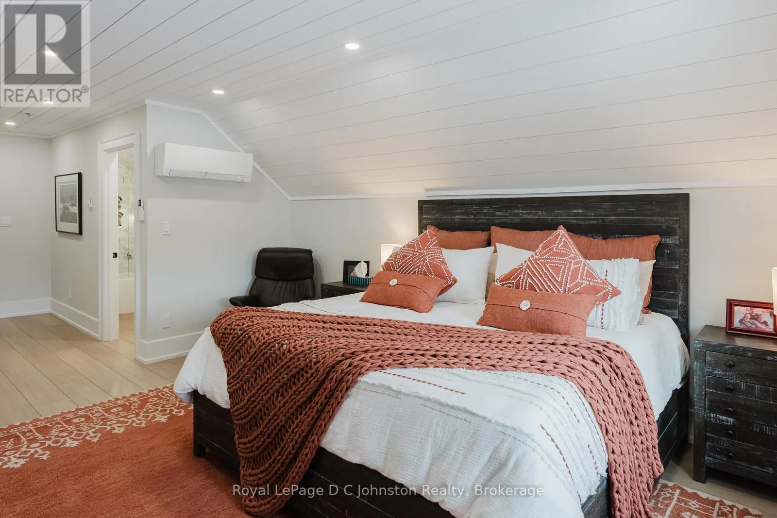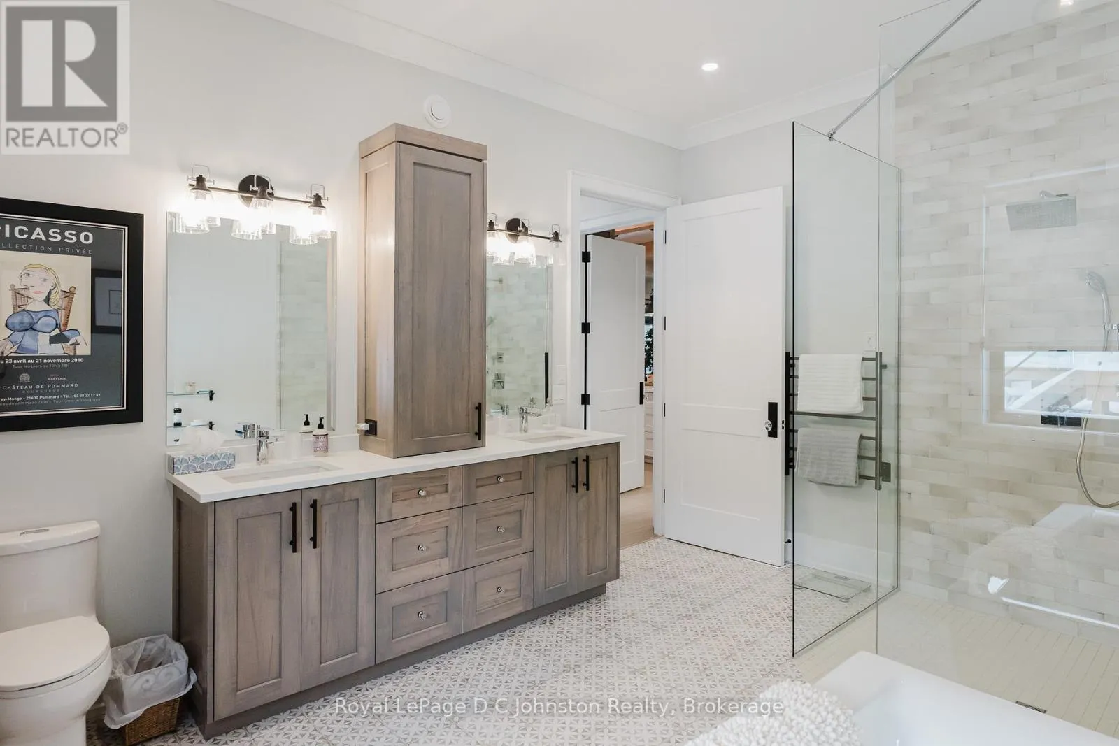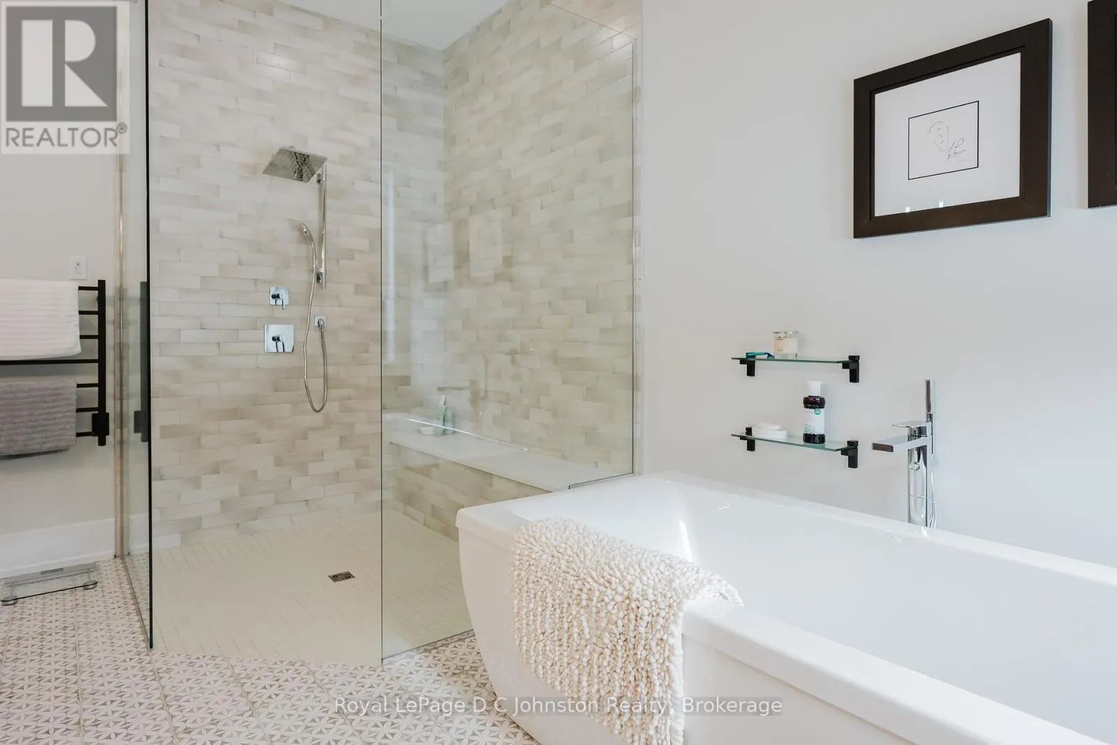 Cross Streets: Concession Rd 10. ** Directions: North end of Port Elgin, West on Concession 10 towards Lake Huron, Turn right on Lakeside Woods Crescent to property on left side. Introducing an architectural masterpiece where bespoke craftsmanship meets unparalleled luxury. Step inside this stunning 3267 square foot bungalow, built without stairs on grade, and immediately experience the soaring great room with a vaulted white shiplap ceiling, a custom floor-to-ceiling stone gas fireplace, and a sleek wet bar with Marvel bar fridge. This space seamlessly flows into the gourmet kitchen and dining area, which are defined by Douglas fir ceiling beams and a white washed tongue and groove ceiling. The kitchen is outfitted with gorgeous maple cabinetry, upscale Thermador appliances, a quartz island with a waterfall edge and a large walk in pantry. The property extends its entertaining opulence to a fully enclosed 650 square foot three season sunroom featuring a second gas fireplace, spectacular milled Douglas fir ceilings and beams and heated sandblasted stone floors. A serene primary suite awaits, complete with a vaulted shiplap ceiling, walk-out to a large covered porch and ensuite featuring an oversized walk-in shower and freestanding tub. The split-plan design separates the guest bedrooms and bath for ultimate privacy. The home features a 500 square foot bonus room with a full bath and separate heating/cooling above the garage. Equally focused on functional luxury, there is a dedicated laundry room with custom cabinetry and quartz countertops, as well as a mudroom with coordinating maple cabinets and quartz counters - providing an elegant transition from the oversized double garage. Every detail, from the exquisite millwork, heated towel bars, in-floor gas hot water heating, Generac standby generator,, speaks to a life of refined comfort. Situated midway between Port Elgin and Southampton, this absolutely exquisite home, clad in stone and Maibec wood siding on a private wooded lot, is ideally located to take full advantage of the coveted four-season lakeside lifestyle Saugeen Shores is known for. (id:27476)