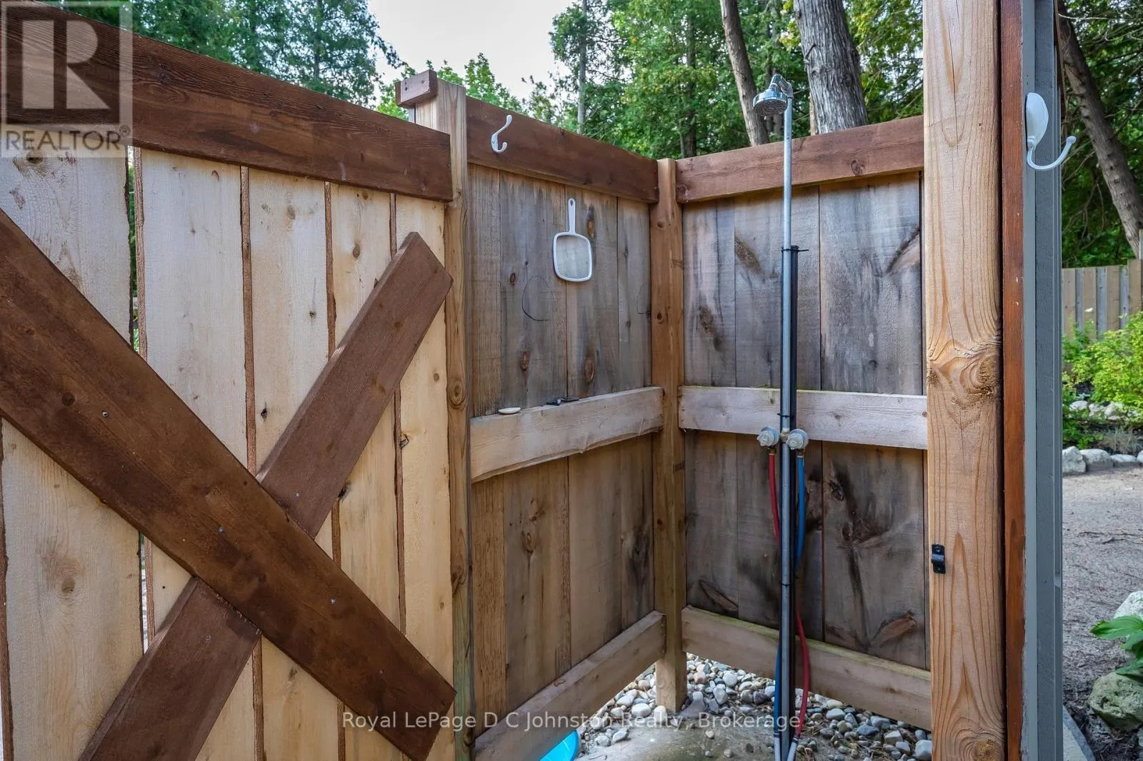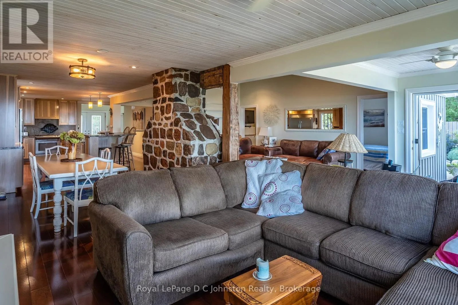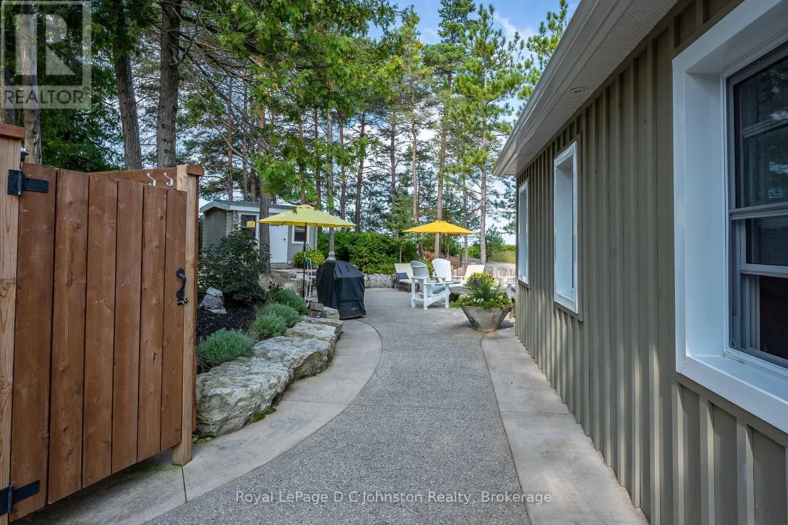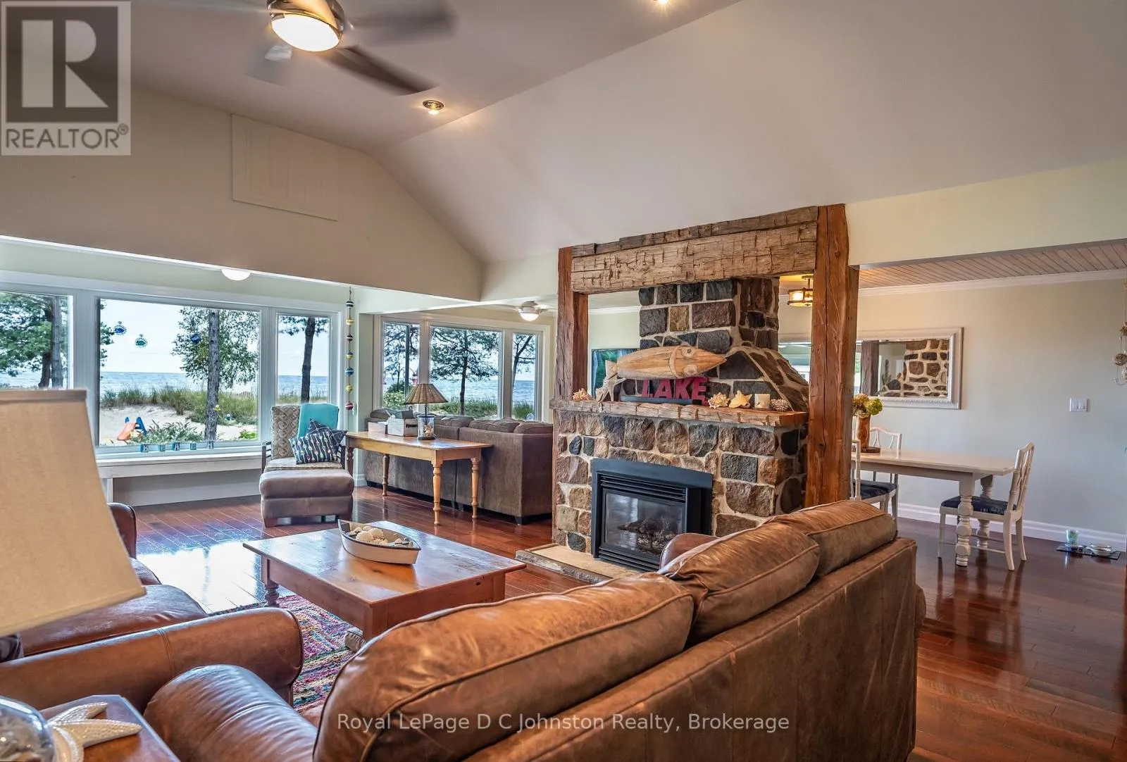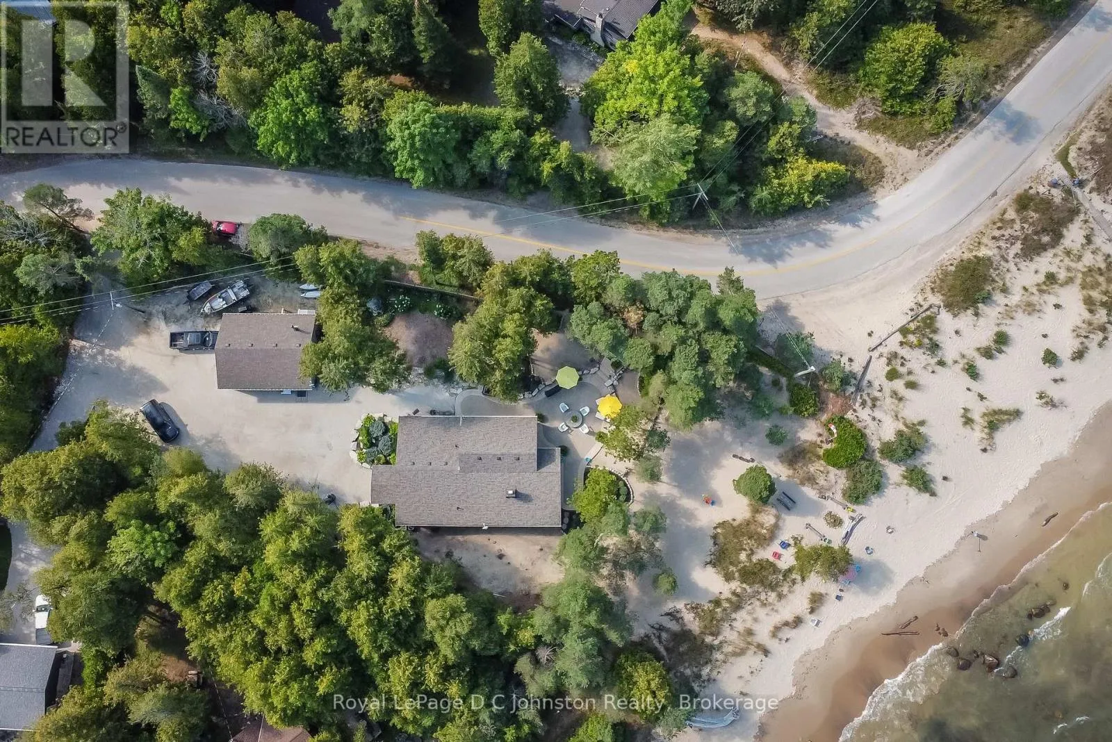 Cross Streets: CAW Road. ** Directions: From Highway 21 South of Port Elgin, West on CAW road, turn left at the water to Saugeen Beach Road turn left and follow the road to #103 on the right side. Dream Beachfront Retreat in Port Elgin. This is an unparalleled opportunity to own a piece of Saugeen Beach Road's coveted shoreline, nestled in the trees along the enclave known locally as Eidt's Grove. This property boasts a generous 111 foot frontage of sandy Lake Huron shoreline, offering spectacular panoramic views and sunsets. The large, private lot is a natural oasis, featuring a charming babbling stream that meanders through the property. The fully renovated 1,800 square foot year-round home or vacation hideaway (fully updated in 2010) is designed for comfort and style. Inside, the home is anchored by a rustic stone fireplace in the main living area, complemented by engineered hickory wood floors and a bright, functional kitchen featuring whitewashed poplar cabinetry, a large island, and stainless steel appliances. With three bedrooms, a large entrance foyer, and a main-floor laundry room, this home is as practical as it is beautiful. Step outside to exceptional outdoor living spaces, including stunning exposed aggregate concrete walkways and patios that lead directly to the white sand beach. The property is complete with an oversized, detached 24 x 30 foot insulated garage/workshop, a woodshed, a 7 x 11 foot bunkie, and a refreshing outdoor shower, making this a truly turn-key lakefront gem. (id:27476)