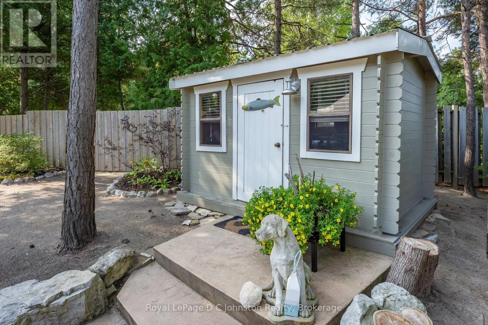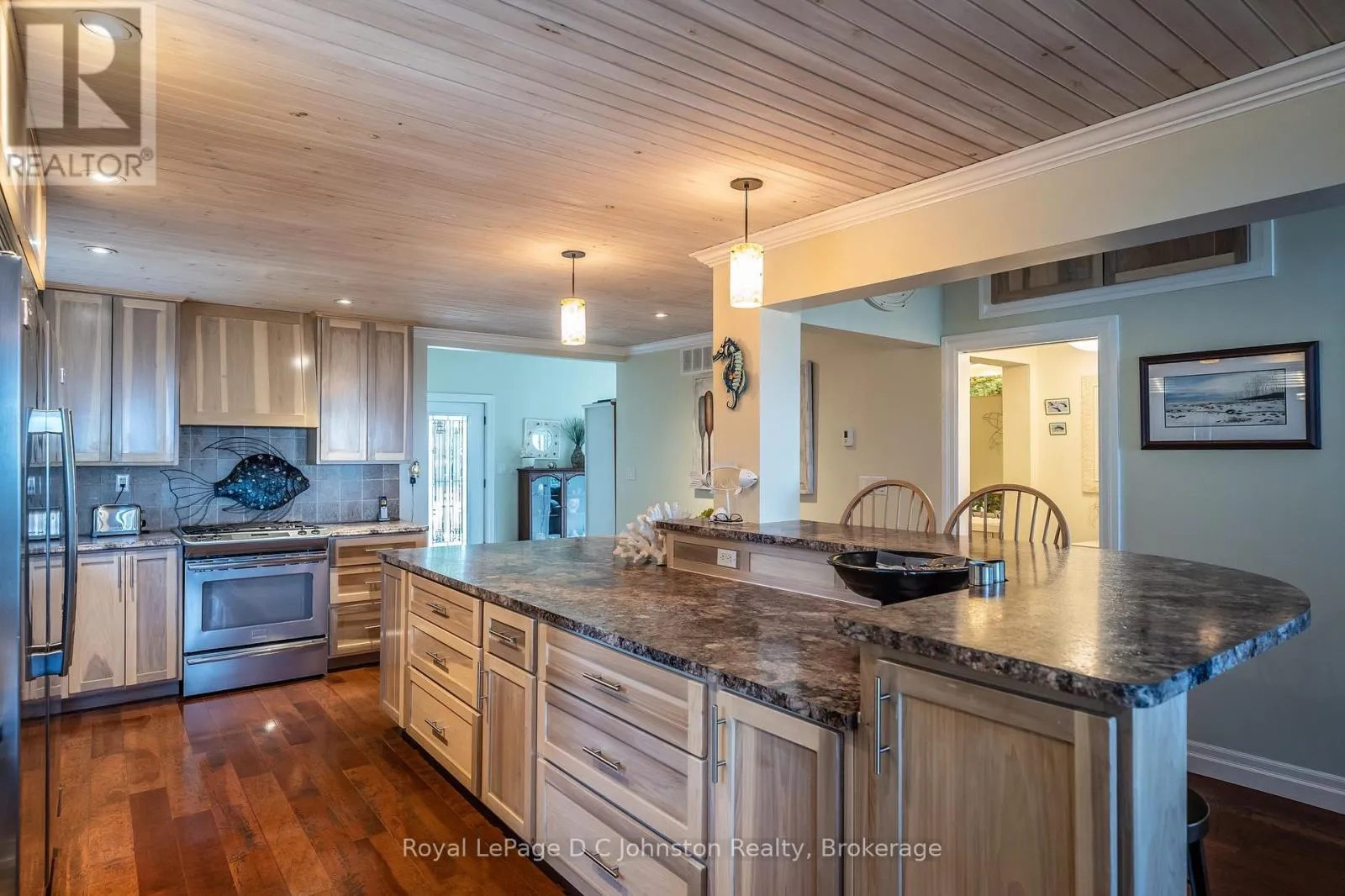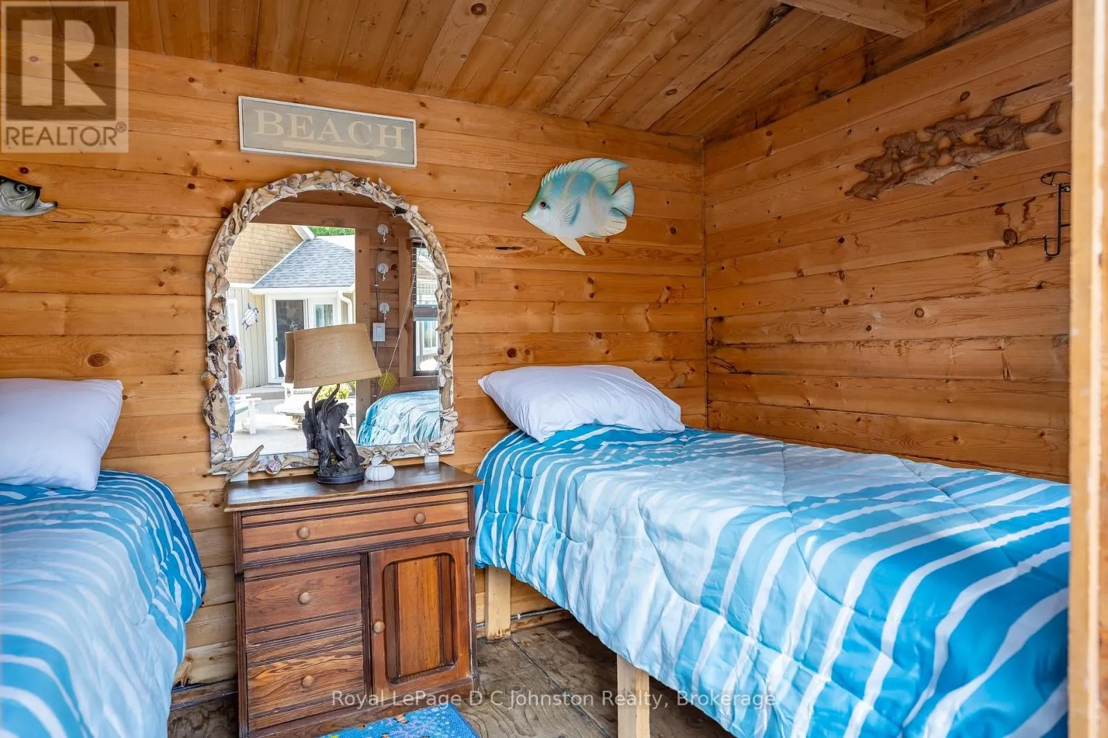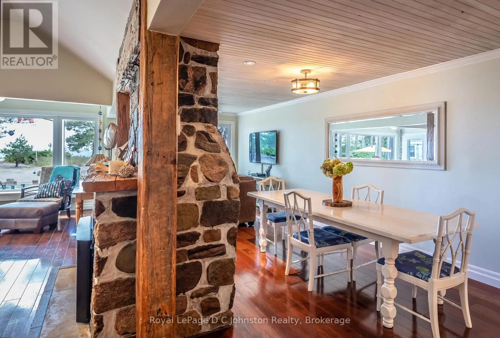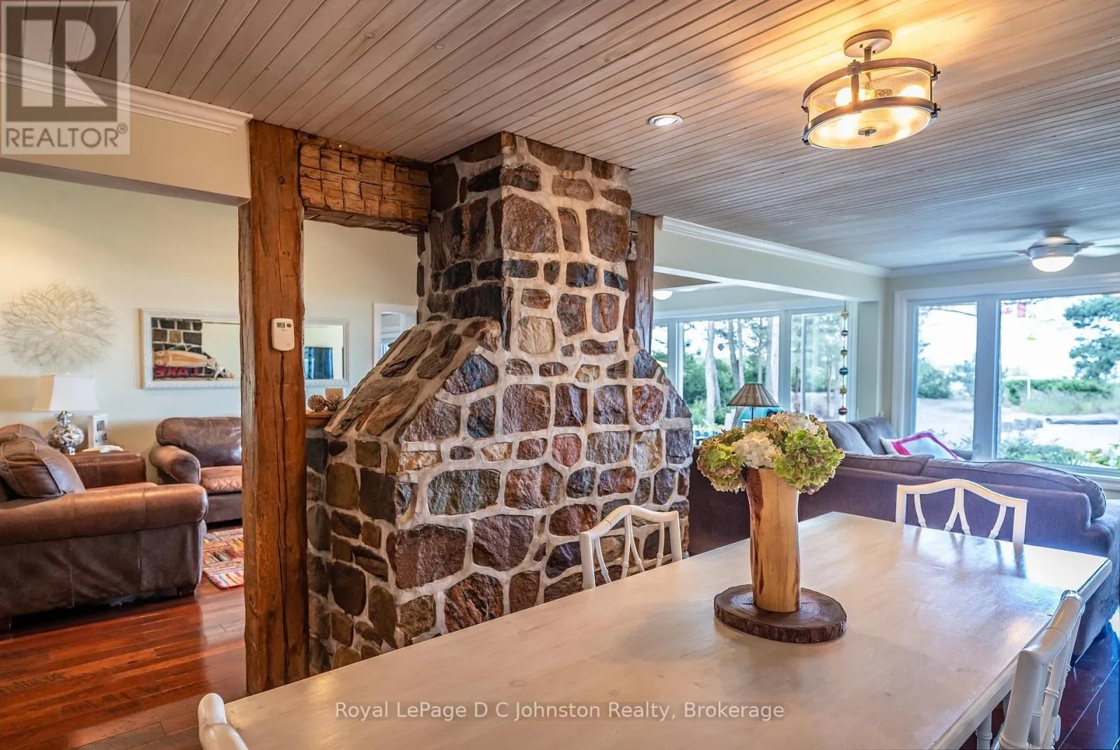 Cross Streets: CAW Road. ** Directions: From Highway 21 South of Port Elgin, West on CAW road, turn left at the water to Saugeen Beach Road turn left and follow the road to #103 on the right side. Dream Beachfront Retreat in Port Elgin. This is an unparalleled opportunity to own a piece of Saugeen Beach Road's coveted shoreline, nestled in the trees along the enclave known locally as Eidt's Grove. This property boasts a generous 111 foot frontage of sandy Lake Huron shoreline, offering spectacular panoramic views and sunsets. The large, private lot is a natural oasis, featuring a charming babbling stream that meanders through the property. The fully renovated 1,800 square foot year-round home or vacation hideaway (fully updated in 2010) is designed for comfort and style. Inside, the home is anchored by a rustic stone fireplace in the main living area, complemented by engineered hickory wood floors and a bright, functional kitchen featuring whitewashed poplar cabinetry, a large island, and stainless steel appliances. With three bedrooms, a large entrance foyer, and a main-floor laundry room, this home is as practical as it is beautiful. Step outside to exceptional outdoor living spaces, including stunning exposed aggregate concrete walkways and patios that lead directly to the white sand beach. The property is complete with an oversized, detached 24 x 30 foot insulated garage/workshop, a woodshed, a 7 x 11 foot bunkie, and a refreshing outdoor shower, making this a truly turn-key lakefront gem. (id:27476)
