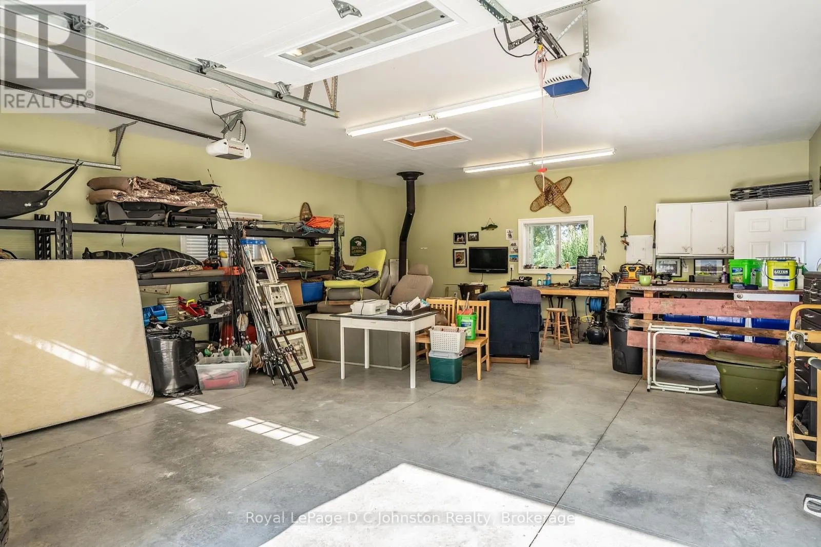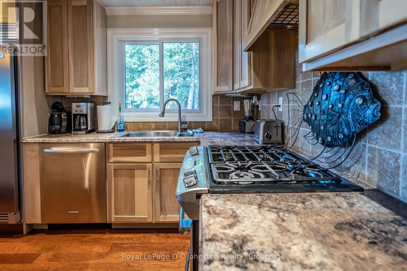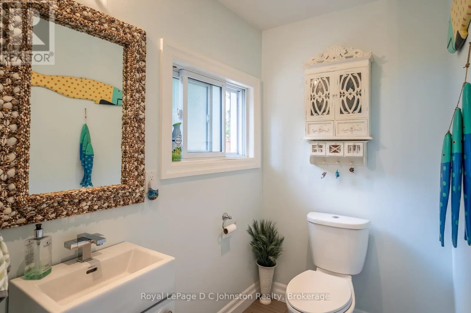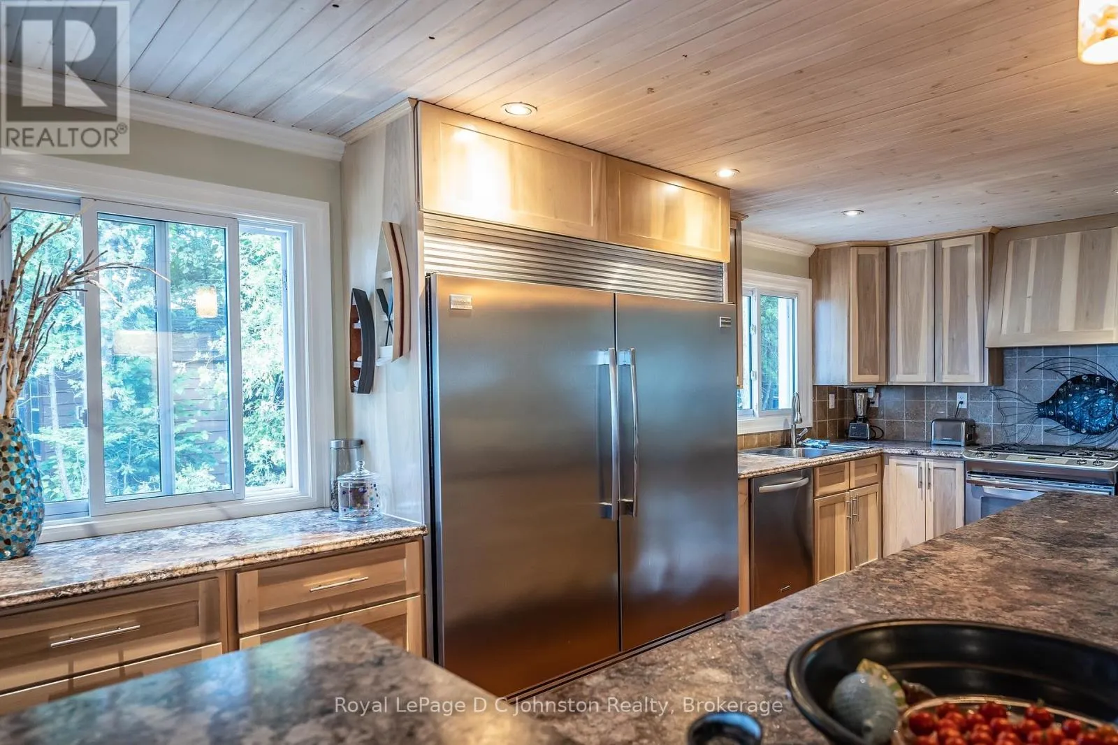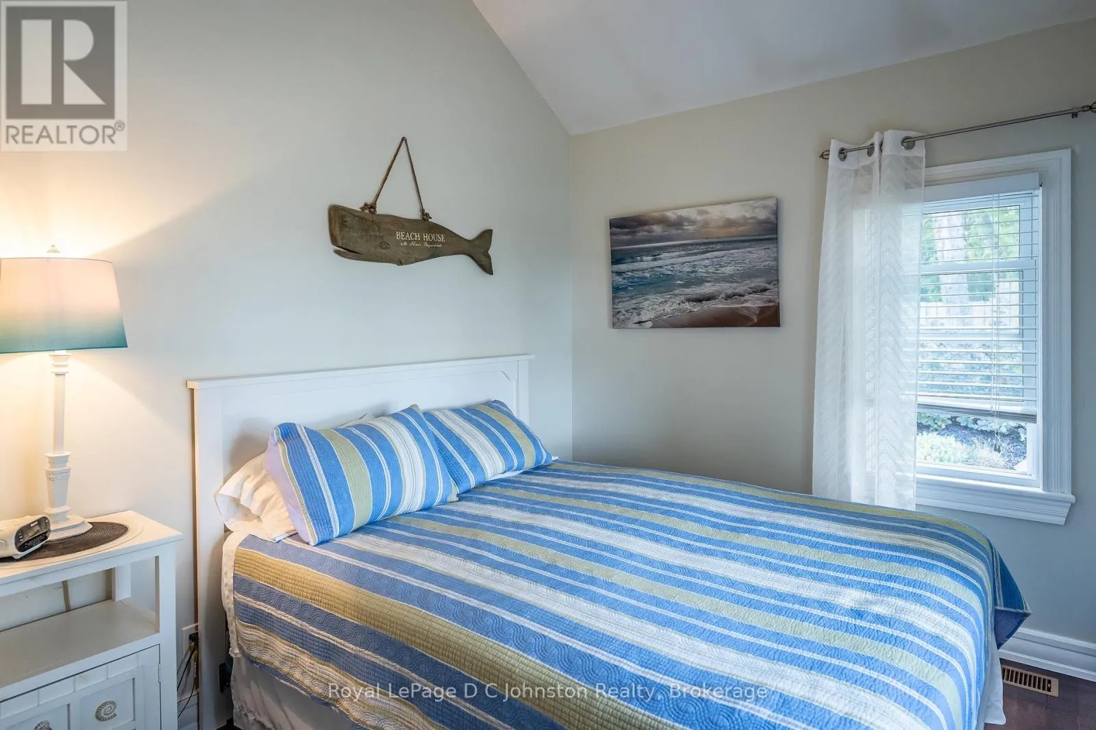 Cross Streets: CAW Road. ** Directions: From Highway 21 South of Port Elgin, West on CAW road, turn left at the water to Saugeen Beach Road turn left and follow the road to #103 on the right side. Dream Beachfront Retreat in Port Elgin. This is an unparalleled opportunity to own a piece of Saugeen Beach Road's coveted shoreline, nestled in the trees along the enclave known locally as Eidt's Grove. This property boasts a generous 111 foot frontage of sandy Lake Huron shoreline, offering spectacular panoramic views and sunsets. The large, private lot is a natural oasis, featuring a charming babbling stream that meanders through the property. The fully renovated 1,800 square foot year-round home or vacation hideaway (fully updated in 2010) is designed for comfort and style. Inside, the home is anchored by a rustic stone fireplace in the main living area, complemented by engineered hickory wood floors and a bright, functional kitchen featuring whitewashed poplar cabinetry, a large island, and stainless steel appliances. With three bedrooms, a large entrance foyer, and a main-floor laundry room, this home is as practical as it is beautiful. Step outside to exceptional outdoor living spaces, including stunning exposed aggregate concrete walkways and patios that lead directly to the white sand beach. The property is complete with an oversized, detached 24 x 30 foot insulated garage/workshop, a woodshed, a 7 x 11 foot bunkie, and a refreshing outdoor shower, making this a truly turn-key lakefront gem. (id:27476)