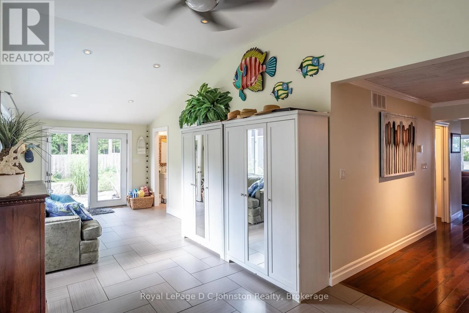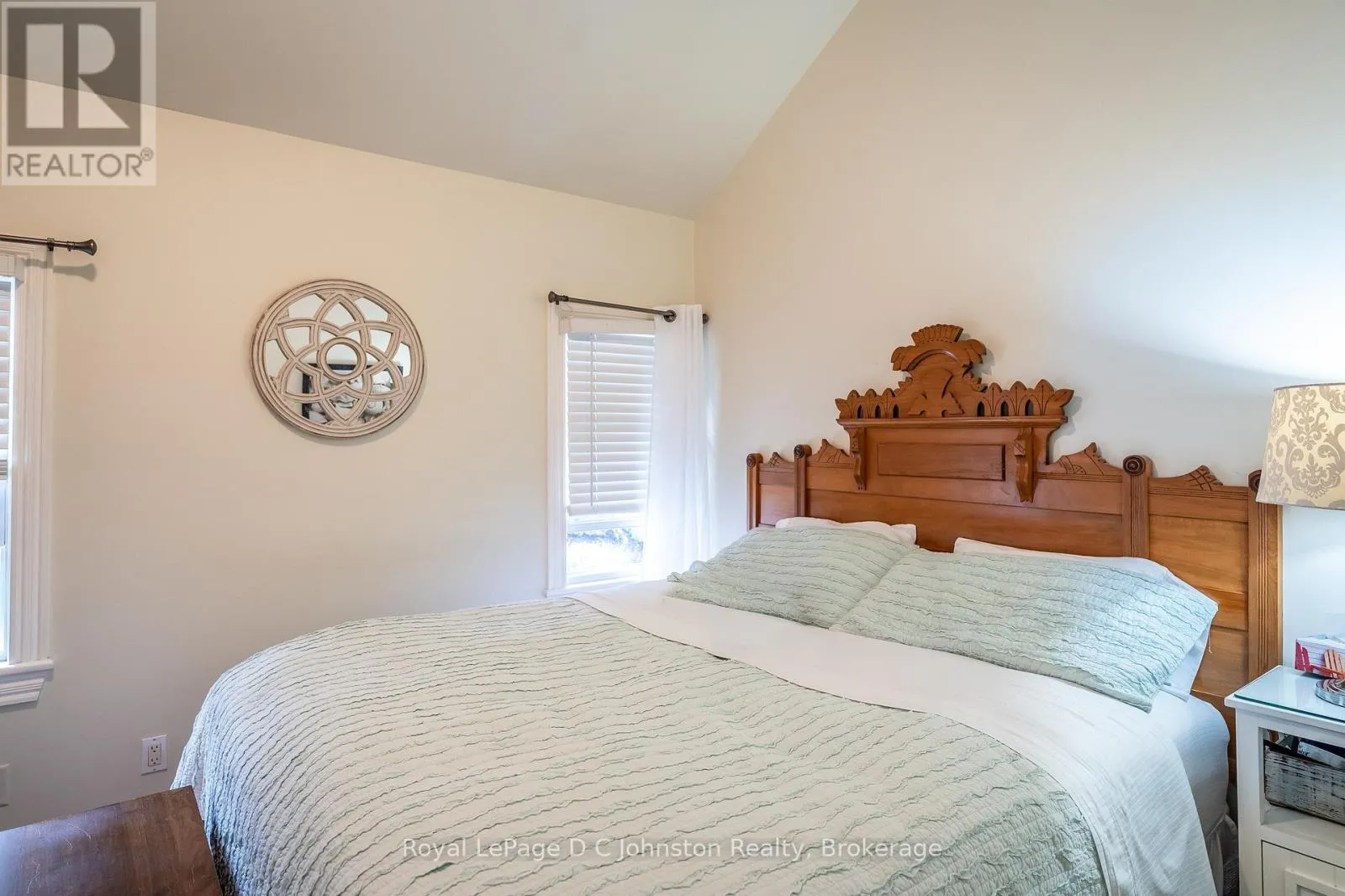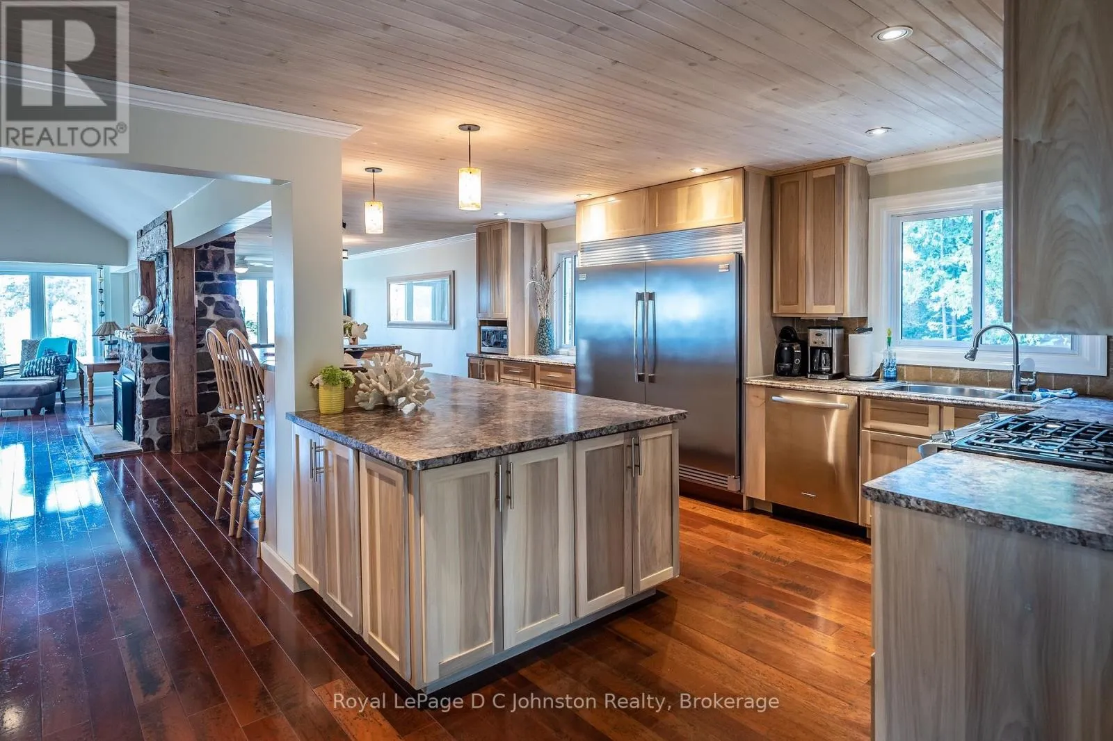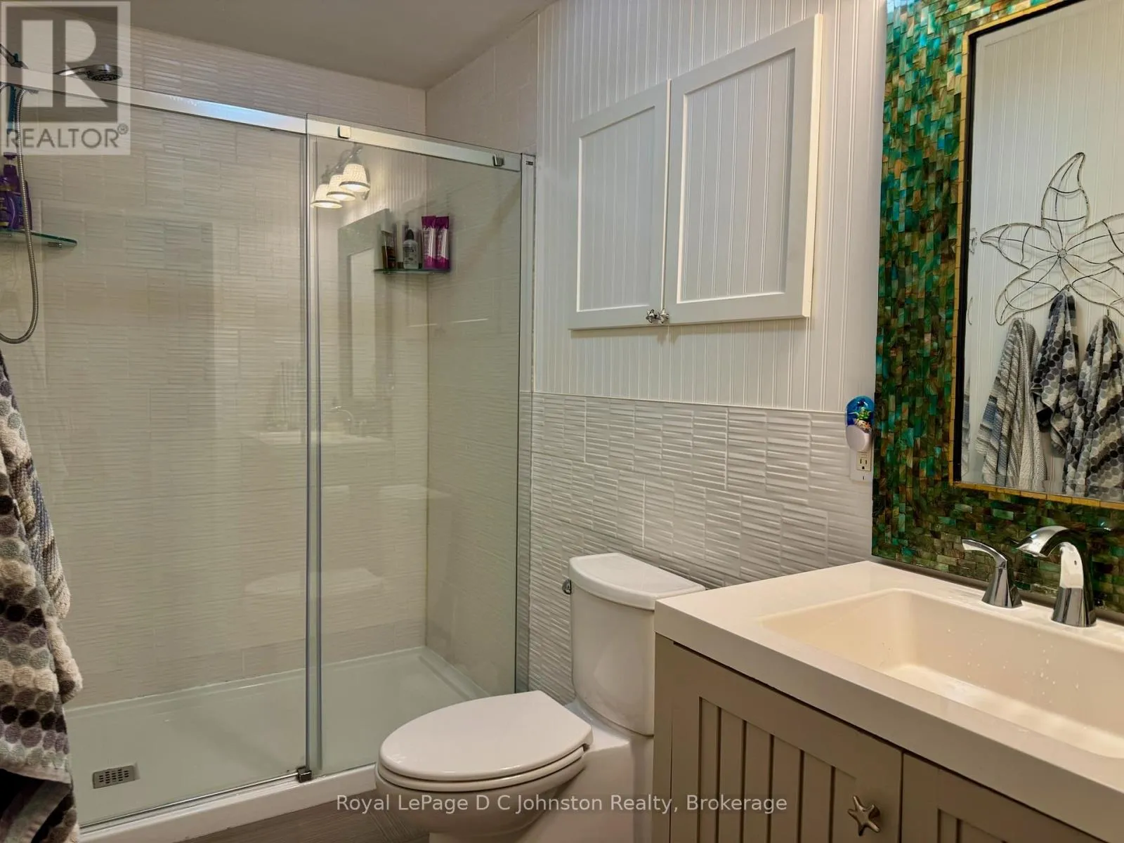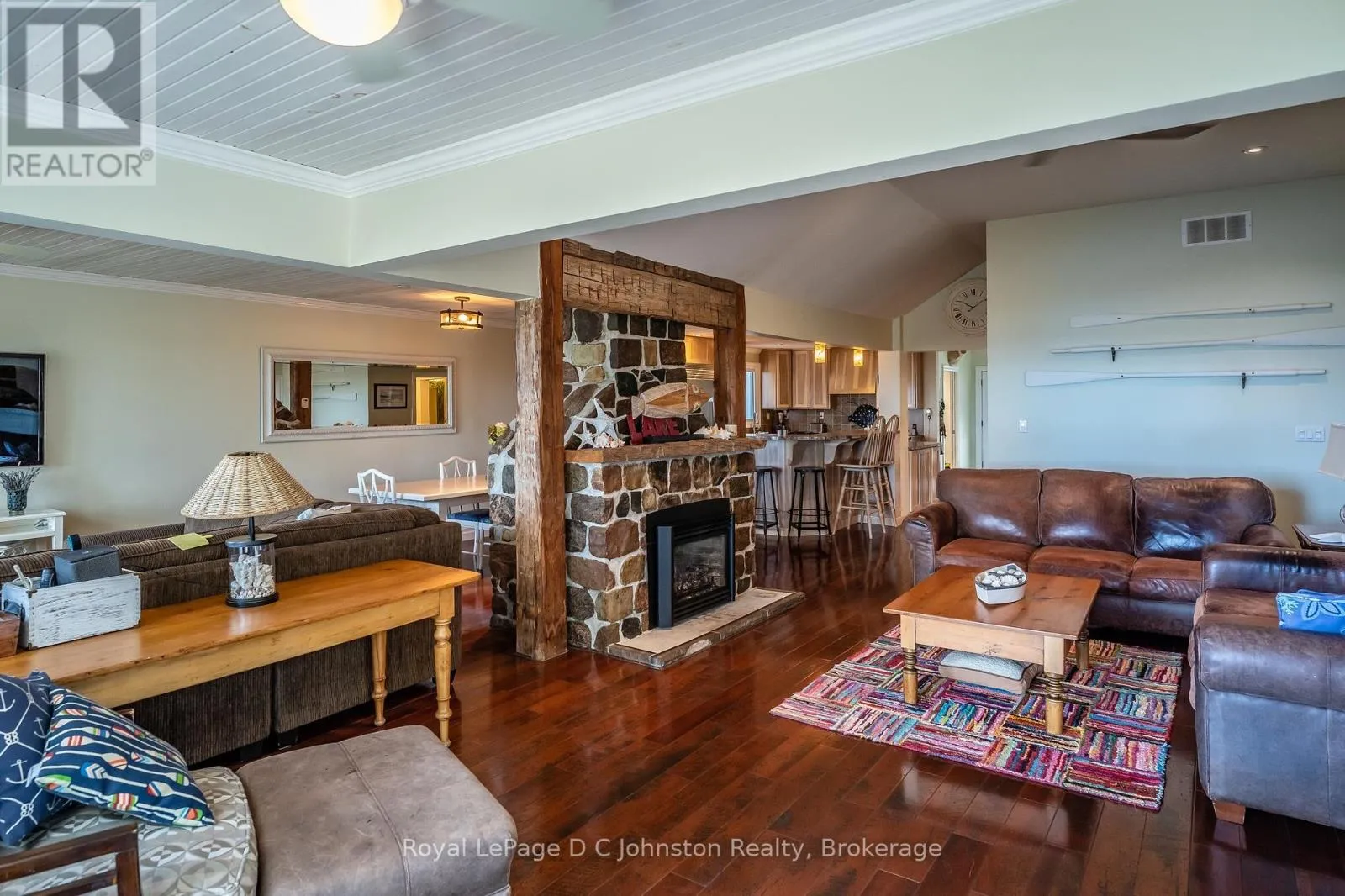 Cross Streets: CAW Road. ** Directions: From Highway 21 South of Port Elgin, West on CAW road, turn left at the water to Saugeen Beach Road turn left and follow the road to #103 on the right side. Dream Beachfront Retreat in Port Elgin. This is an unparalleled opportunity to own a piece of Saugeen Beach Road's coveted shoreline, nestled in the trees along the enclave known locally as Eidt's Grove. This property boasts a generous 111 foot frontage of sandy Lake Huron shoreline, offering spectacular panoramic views and sunsets. The large, private lot is a natural oasis, featuring a charming babbling stream that meanders through the property. The fully renovated 1,800 square foot year-round home or vacation hideaway (fully updated in 2010) is designed for comfort and style. Inside, the home is anchored by a rustic stone fireplace in the main living area, complemented by engineered hickory wood floors and a bright, functional kitchen featuring whitewashed poplar cabinetry, a large island, and stainless steel appliances. With three bedrooms, a large entrance foyer, and a main-floor laundry room, this home is as practical as it is beautiful. Step outside to exceptional outdoor living spaces, including stunning exposed aggregate concrete walkways and patios that lead directly to the white sand beach. The property is complete with an oversized, detached 24 x 30 foot insulated garage/workshop, a woodshed, a 7 x 11 foot bunkie, and a refreshing outdoor shower, making this a truly turn-key lakefront gem. (id:27476)