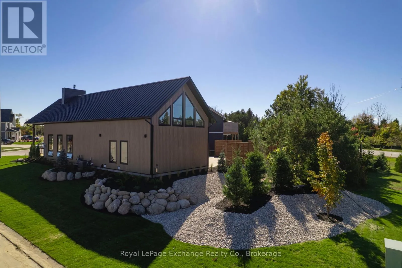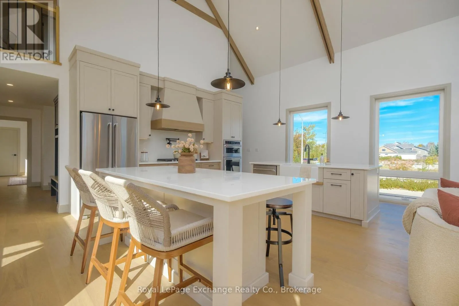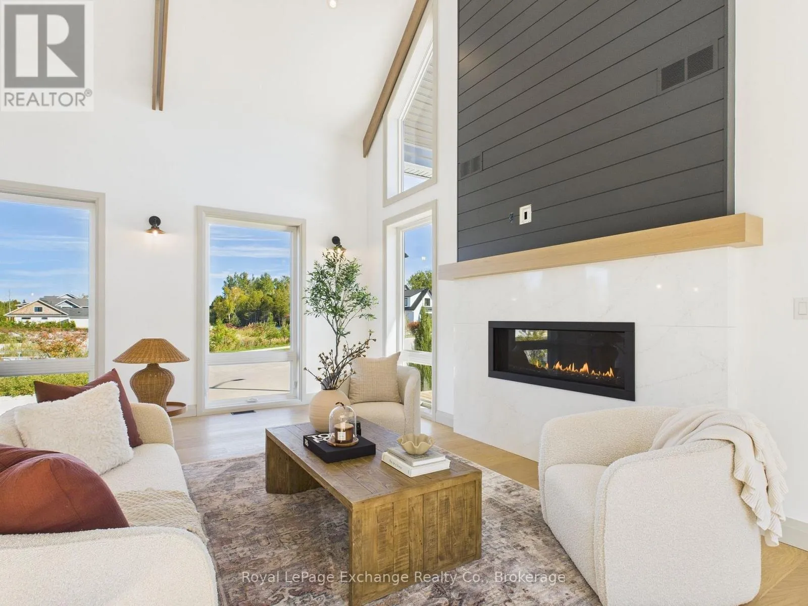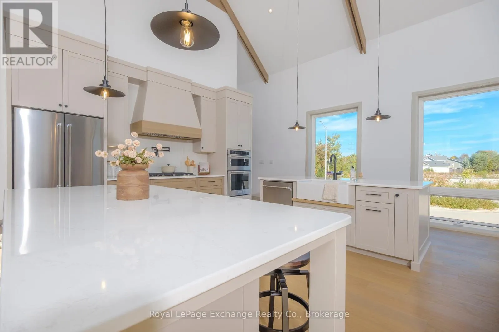 Cross Streets: McNabb St. ** Directions: 2 Marshall Pl, Southampton. A Modern Coastal Retreat at Southampton LandingThis striking, custom-built home blends coastal charm with contemporary design in one of Saugeen Shores' most desirable communities Southampton Landing. Step inside to soaring vaulted ceilings, oversized windows, and an open-concept main floor drenched in natural light. The designer kitchen is a showstopper! Featuring custom cabinetry, quartz countertops, pot filler, two large islands with seating, and seamless flow into the living area anchored by a sleek linear fireplace. The main floor offers two bedrooms that share a stylish full bath, a convenient powder room, main floor laundry, and a built-in mudroom with custom cabinetry leading to the garage and 4' crawl space for extra storage. The upper-level loft-style primary suite offers a true sanctuary with dramatic architectural windows, warm wood flooring, and a spa-inspired ensuite complete with a soaker tub, walk-in shower, and dual vanity. Every detail has been thoughtfully designed. Outdoors, the steel roof and steel siding provide long-term durability and low maintenance, allowing you to spend more time enjoying life near the lake. A detached garage with covered breezeway adds both style and function, while the manicured landscaping and concrete driveway complete the clean modern aesthetic. Located steps to trails, beaches, and everything Southampton has to offer. This home is a perfect mix of sophistication, comfort, and easy living. (id:27476)
