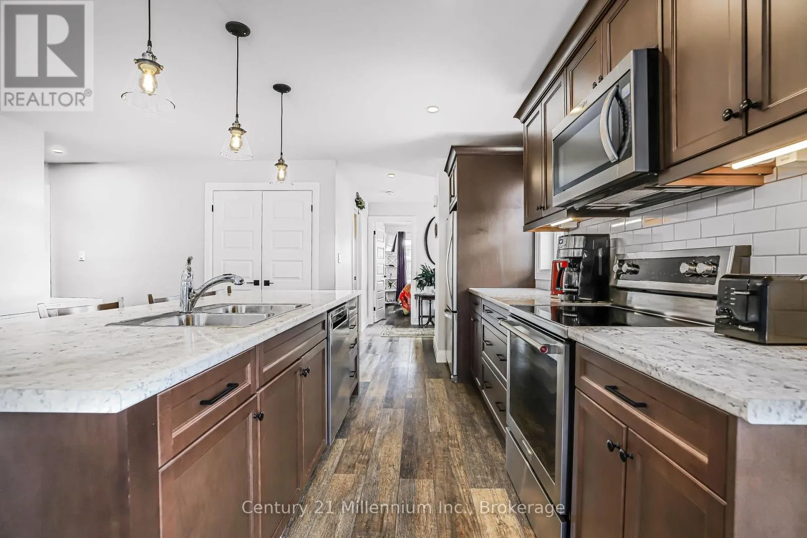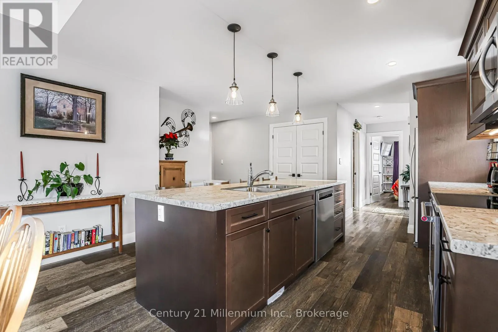 Cross Streets: Cty 17 and Westlinks Drive. ** Directions: Bruce Rd. 17 to Westlinks Drive to Fairway Ln to Eagle Court. Easy Living at Westlinks - Port Elgin. Discover the charm of Westlinks, a Front Porch Community just a 10-minute walk from downtown Port Elgin. This fully finished end-unit bungalow townhome offers an inviting open floor plan with a neutral palette, main floor primary suite, and convenient laundry. Step onto the wrap-around porch and into a generous foyer, perfect for welcoming family and guests. The open kitchen boasts stainless steel appliances and a central island, flowing seamlessly into the dining area and cozy living room with natural gas fireplace. Patio doors lead to a raised deck and concrete patio, complete with gas BBQ hookup and privacy fencing for year-round enjoyment. The spacious primary suite features a 4-piece ensuite with walk-in shower, double sinks, and walk-in closet. A second bedroom on the main floor is ideal for a home office, den, or gym. The mudroom offers side-by-side laundry, sink, and direct access to the 1.5-car garage. Downstairs, the finished lower level provides a large family room, ample storage, and a third bedroom with ensuite privileges to a 3-piece bath. Wired with a generator plug for peace of mind. Life at Westlinks includes more than just care free living; - the monthly condo fees cover a two-person membership at The Club at Westlinks, featuring a 12-hole golf course, driving range, pickleball courts, private gym, and clubhouse with year-round social and recreational activities. This property combines comfort, convenience, and community-truly a leisurely lifestyle both at home and at The Club at Westlinks! (id:27476)