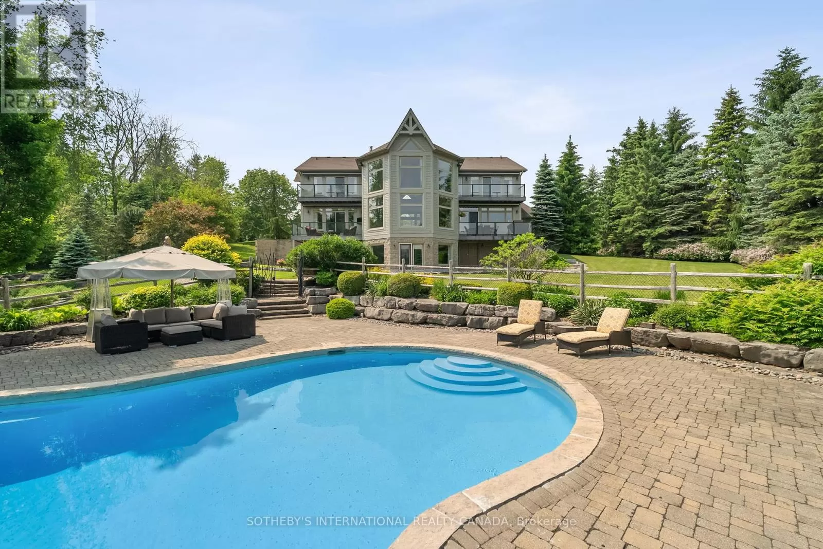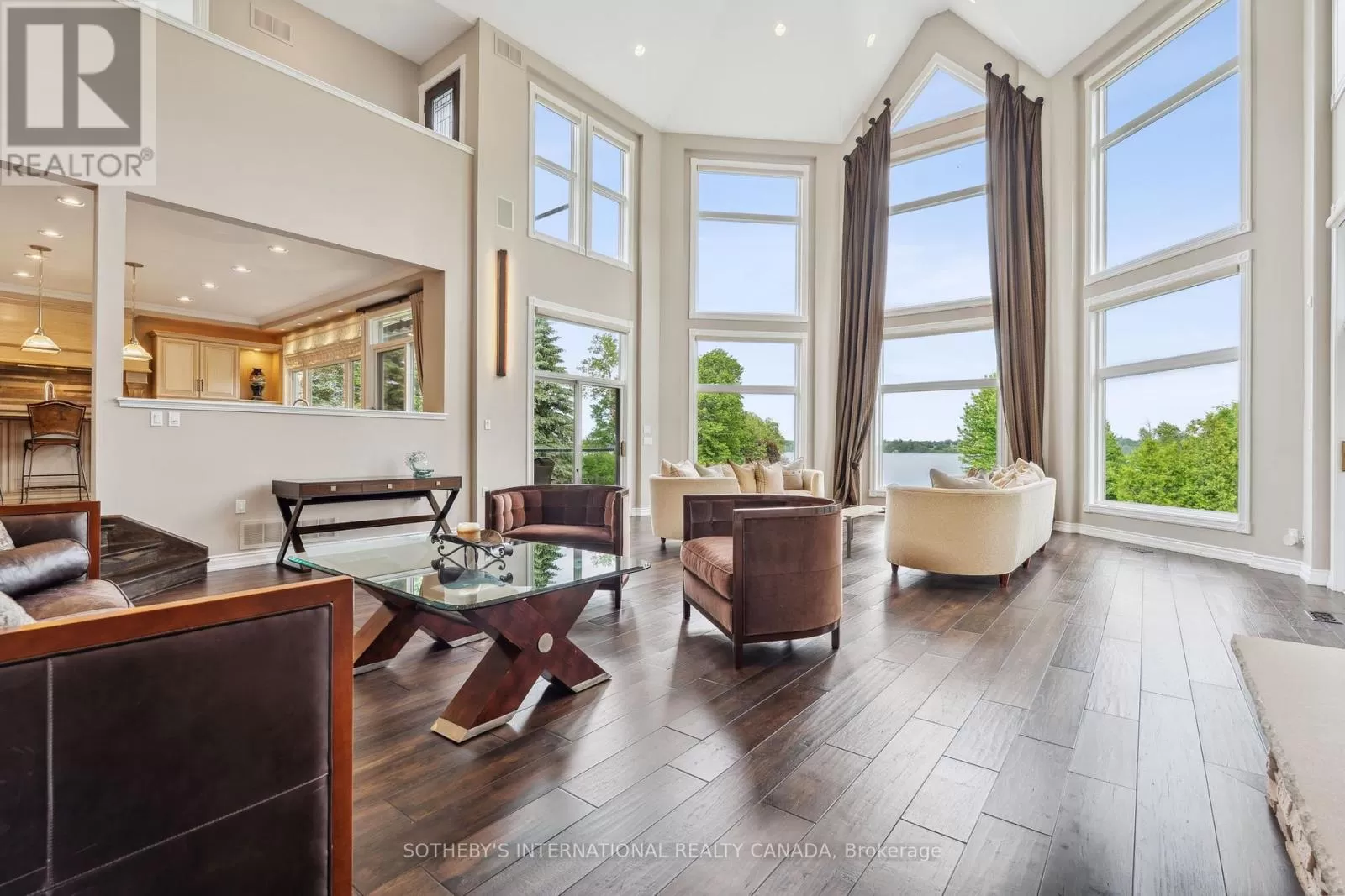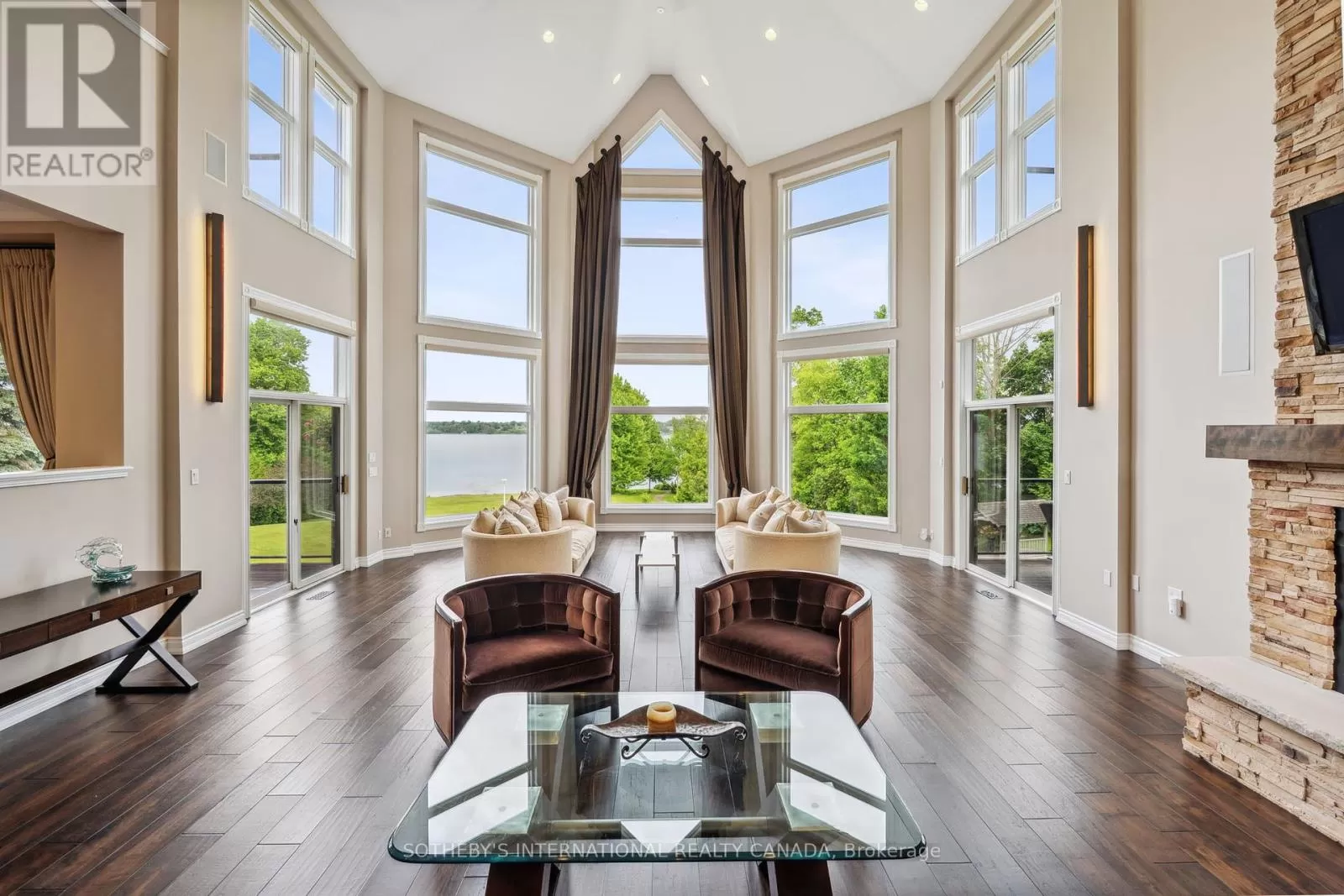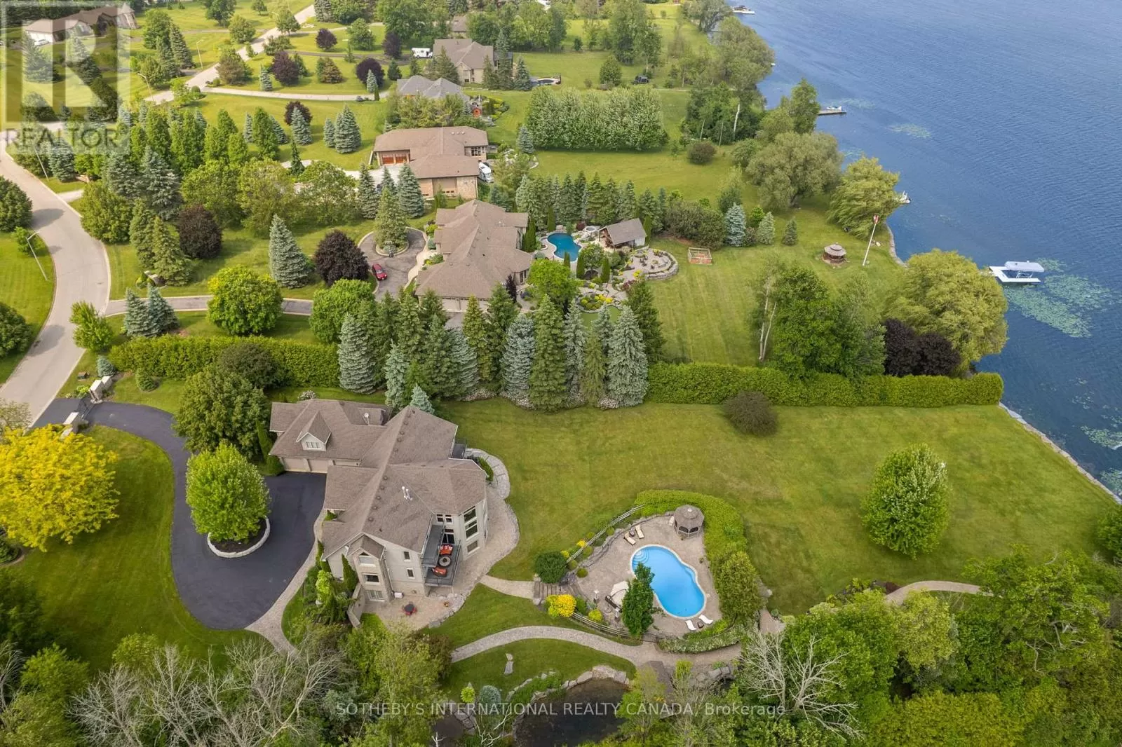 Cross Streets: Simcoe St. and Castle Harbour Dr. ** Directions: Head East on Castle Harbour Dr from Simcoe St. Follow Castle Harbour Drive- turn East on Cawkers Cove Rd. Turn South onto Island View Crt. Home is on your left. Welcome to Cascadia Waters Estate - an exceptional custom-built waterfront estate on the serene shores of Lake Scugog where timeless elegance, refined comfort and the spirit of summer living converge in perfect harmony. Privately gated and masterfully hardscaped, this residence offers an exquisite blend of luxury and lifestyle, nestled just minutes from historic Port Perry and connected Trent-Severn Waterway. Crafted for both grand entertaining and intimate everyday moments, the home showcases a sunken great room crowned by soaring two-storey windows that capture sweeping lake views & flood the space with natural light. The culinary-inspired kitchen, equipped with premium Wolf appliances, flows effortlessly onto an expansive composite deck that is perfect for al fresco dining and sunset gatherings overlooking the water. A formal dining room extends to a sundeck with a built-in fireside table, while a custom-fitted office offers privacy and function in equal measure. Step outside and experience a true summer sanctuary: a heated Gunite pool, pool house, gazebo, and a spring-fed stream that flows through the property, cascading over three waterfalls before settling into three tranquil ponds. Thoughtful touches abound, including a full irrigation system, drip lines for hanging baskets & a mature, professionally designed landscaping. Above the three-car garage, a generous raw loft space offers limitless potential that is ideal for possible future guest suites, fitness studio, kids play area, or additional recreation space.The lower level exudes refined comfort, featuring radiant in-floor heating, an expansive recreation room, a climate-controlled wine cellar with a lounge-style wet bar, and a pool bathroom with direct walk-out access towards the grounds. At this estate, you can boat, entertain, unwind, breath deep and grow roots all against a backdrop of natural beauty and lakeside luxury. This is more than a home. Its a legacy. Welcome to your forever chapter! (id:27476)