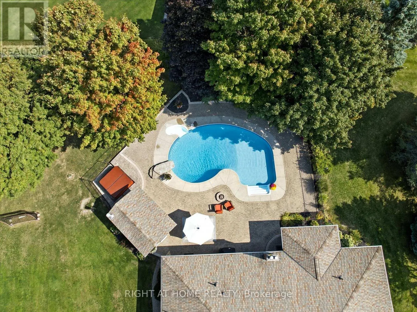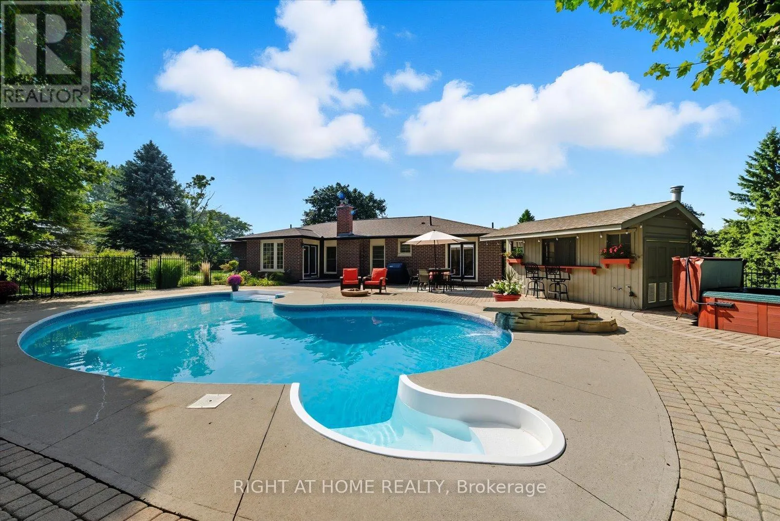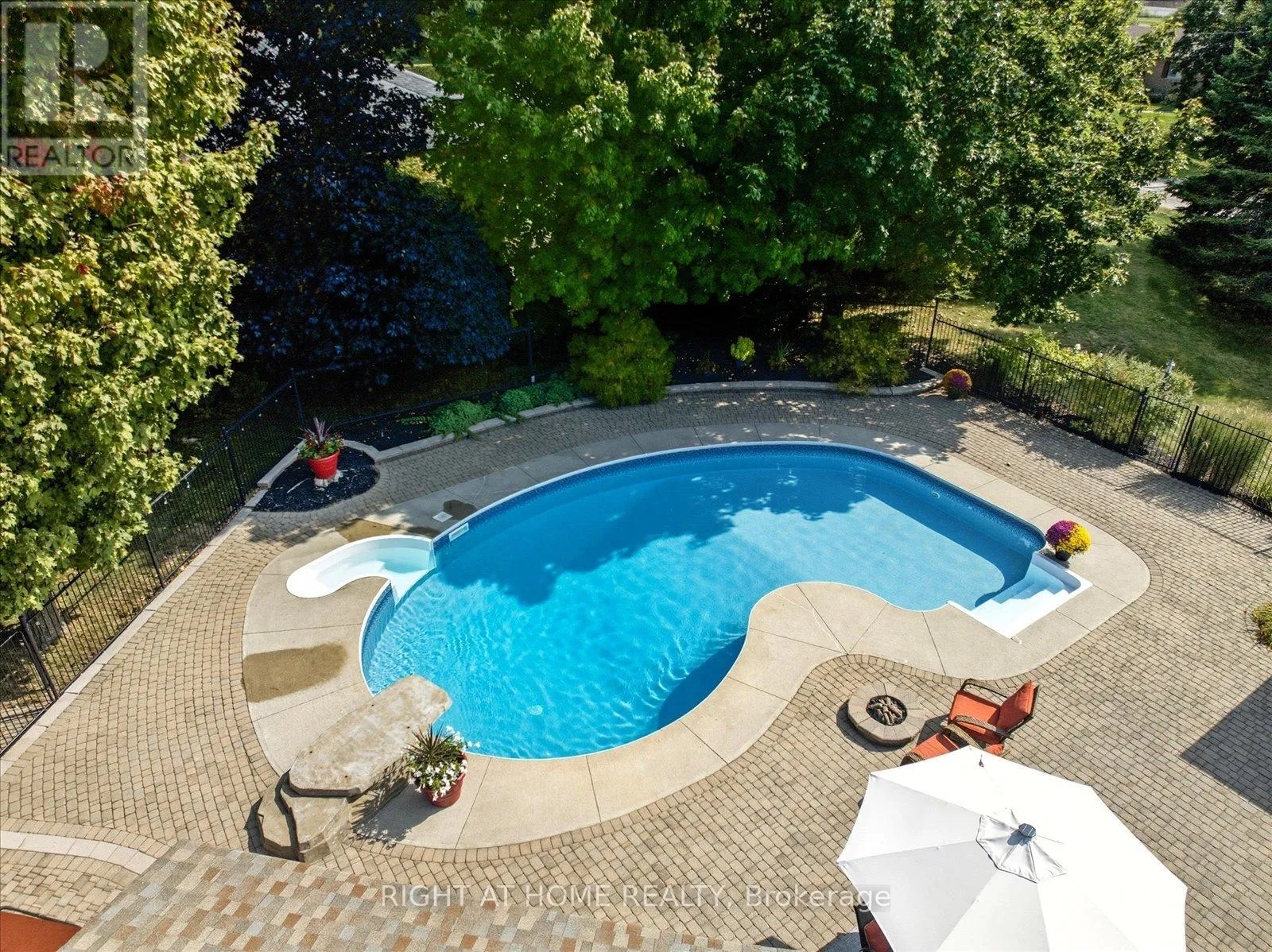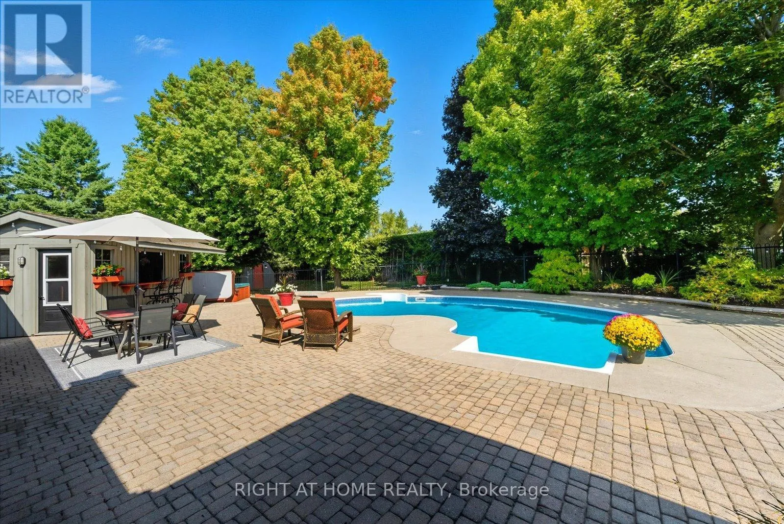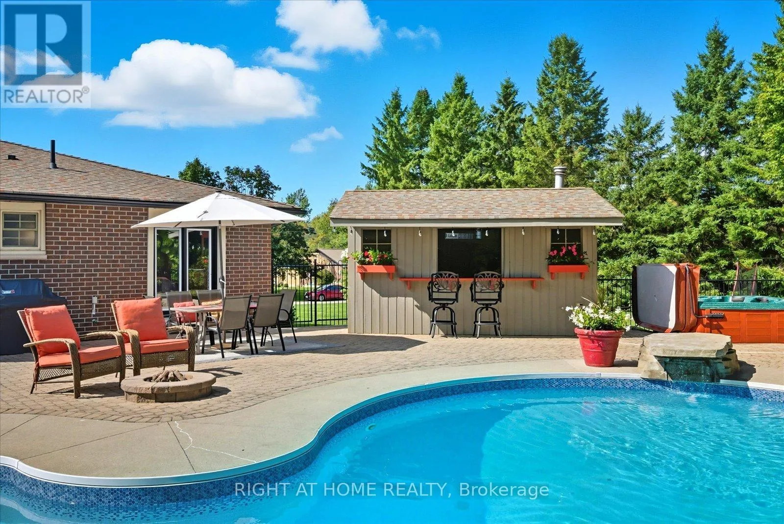Cross Streets: Old Simcoe and Scugog Street. ** Directions: Old Simcoe Rd to Victoria Street and Victoria to Alma Street. This beautiful all-brick bungalow offers over 3,000 sq. ft. of finished living space on a rare 0.63-acre treed lot, providing privacy and charm in one of Port Perry's most desirable mature neighbourhoods. Perfectly located on a quiet cul-de-sac, it's within walking distance to historic downtown, schools, shopping, parks, and the waterfront. A large, inviting front porch welcomes you inside to a bright open-concept layout featuring a custom kitchen with abundant cabinetry, built-in stainless steel appliances, gas cooktop, double and prep sinks, and a breakfast bar. The kitchen flows into a spacious dining area with a walkout to the pool and a sunken family room overlooking the backyard, complete with a cozy gas fireplace. A large front-facing living room offers extra space for gatherings or quiet relaxation. The main level includes three bedrooms and two full baths, including a beautifully renovated main bath. The primary suite features a private ensuite, walk-in closet, and walkout to the pool area-perfect for morning coffee or an evening swim. A convenient main-floor laundry completes this level. The fully finished basement expands the living space with a large rec room featuring a pool table, gas fireplace, wet bar, gym area, an additional bedroom, 3-piece bath, new walk-in closet for extra wardrobe or storage space, and a second storage room. A side entrance through the garage provides direct access to the basement. The backyard oasis includes a 36-ft heated humpback pool with rock-style diving board and waterfall, brand-new liner (2024), hot tub, and an 8x16 Western Red Cedar cabana with 2-piece bath, sink, and gas hookups. Wrought iron fencing secures the pool area, and a garden shed with hydro provides extra storage. Large lot with no sidewalks. (id:27476)