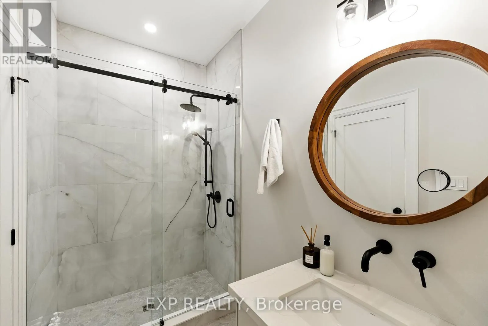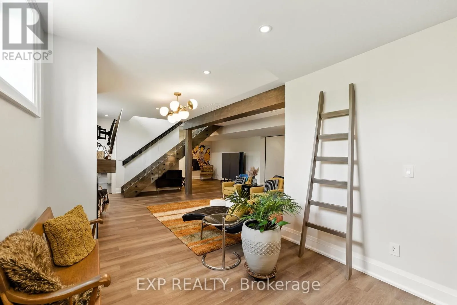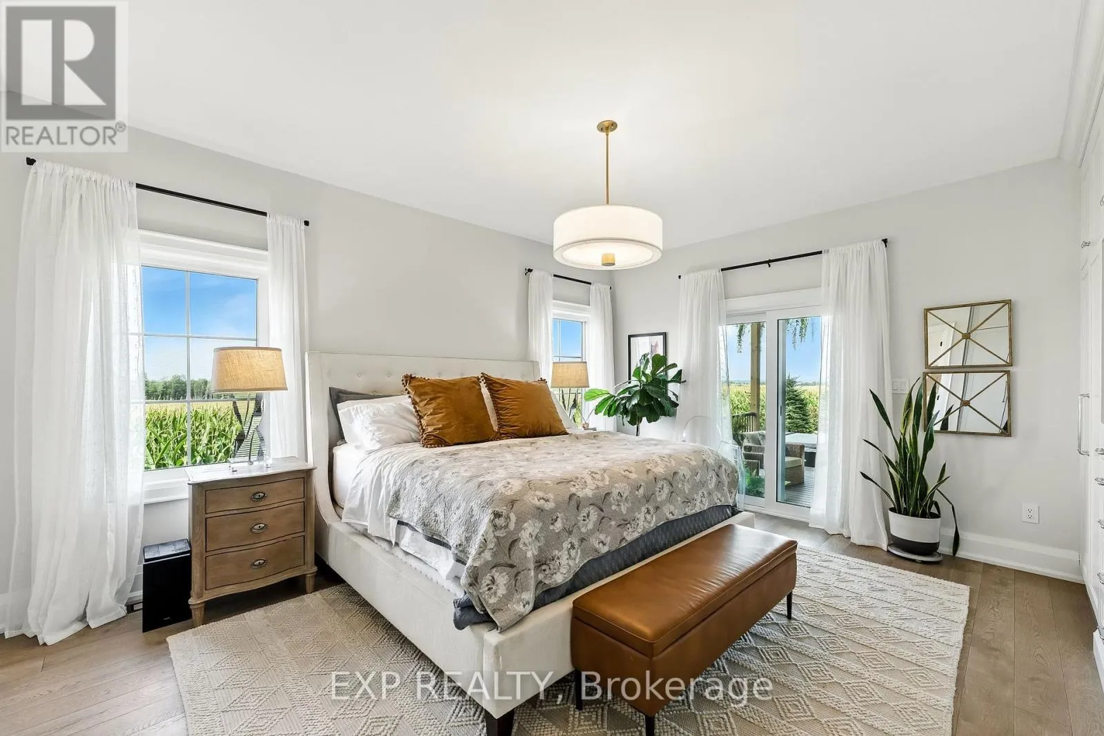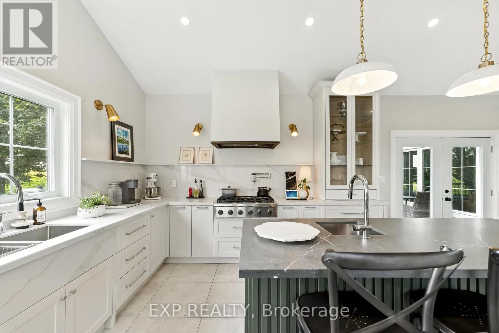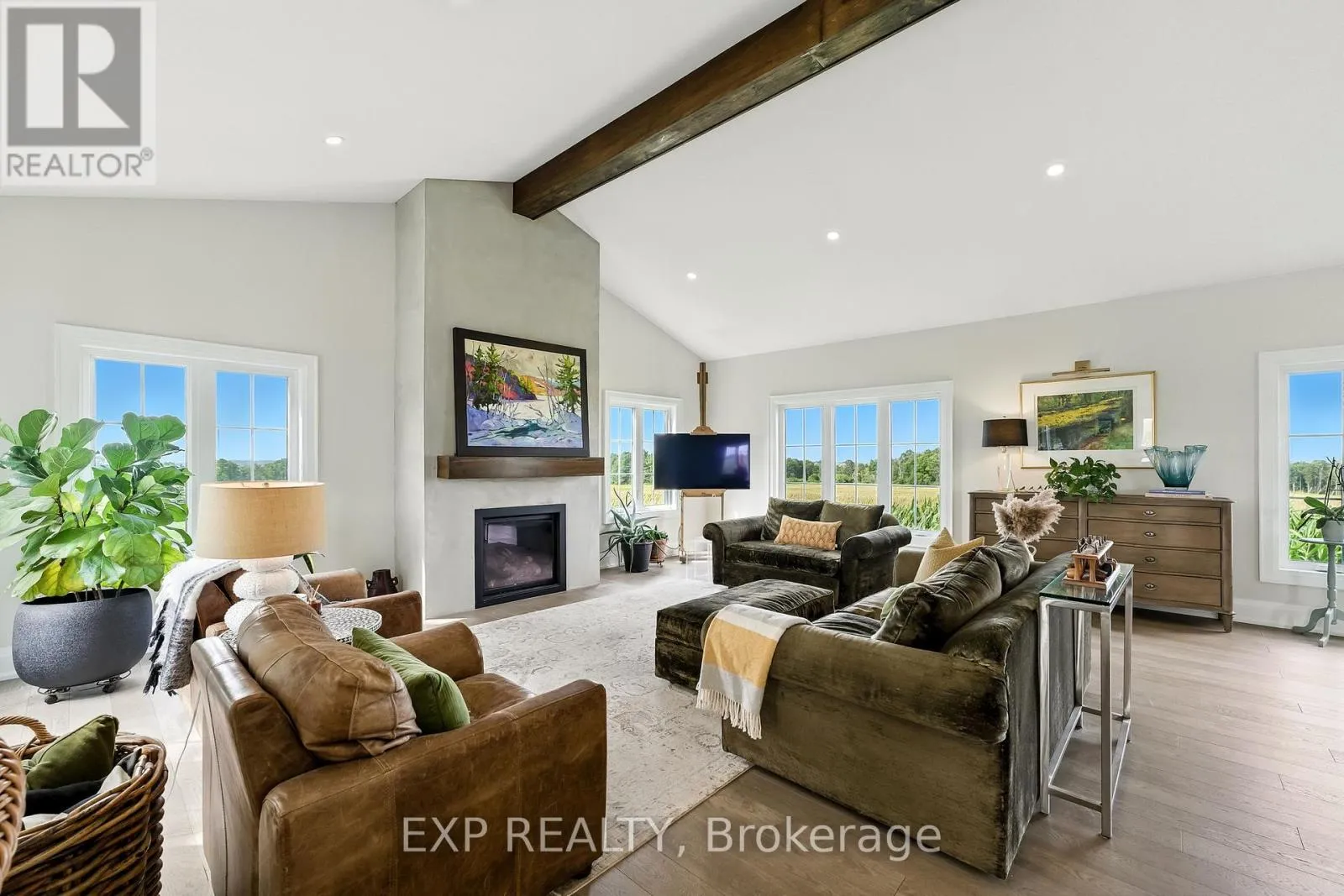 Cross Streets: Hwy 7A and Wilson Avenue. ** Directions: Head South on Wilson Ave, property is on the east side of the road. Welcome to this custom-built luxury bungalow on 1.54 acres of private countryside, offering modern comfort with timeless rural charm. A tree-lined driveway leads to beautifully landscaped grounds, a welcoming front porch, & multiple outdoor living spaces, including a raised deck & spacious patio for entertaining. The main level of this home is thoughtfully designed to combine everyday functionality with elegant style. A welcoming foyer with a double closet leads into the open-concept living spaces, where soaring ceilings with wood beams, expansive windows, & a striking fireplace create a bright & inviting atmosphere. The chefs kitchen is a true highlight, featuring high-end appliances, custom cabinetry, a large centre island, & a walkout to the deck. Seamlessly connected, the dining area & living room provide an ideal setting for gatherings, with natural light flooding the space from every angle. The primary retreat offers built-in cabinetry, a luxurious 5-piece ensuite with soaker tub & glass shower, & private access to the deck. A second bedroom, currently staged as a home office, adds convenience for guests. Completing the main floor is a well-equipped laundry & mudroom with direct access to the attached garage. The fully finished lower level extends the living space beautifully. A wide staircase with glass railing opens to the rec room, complete with a sleek wet bar, custom built-in shelving, & a cozy fireplace. A glass-enclosed gym provides a dedicated space for fitness while maintaining an open, modern feel. Two generously sized bedrooms, each with large above-grade windows, are complemented by a stylish 4-piece bathroom. The lower level offers the ideal blend of relaxation, recreation, & practicality, while also housing a utility room for added convenience. With an attached garage plus a detached workshop, this property is ideal for both relaxation & practicality, all while surrounded by sweeping farmland views & just minutes from nearby amenities. (id:27476)