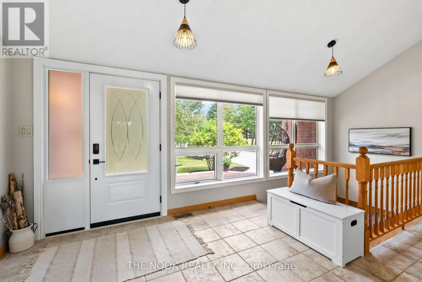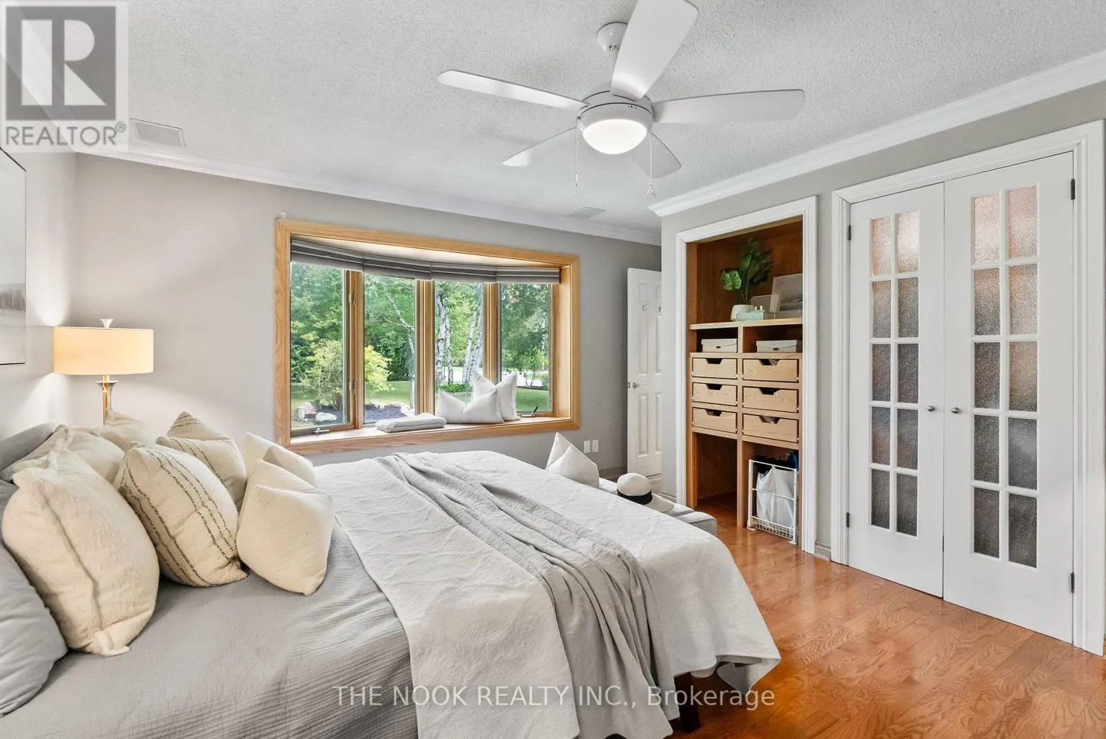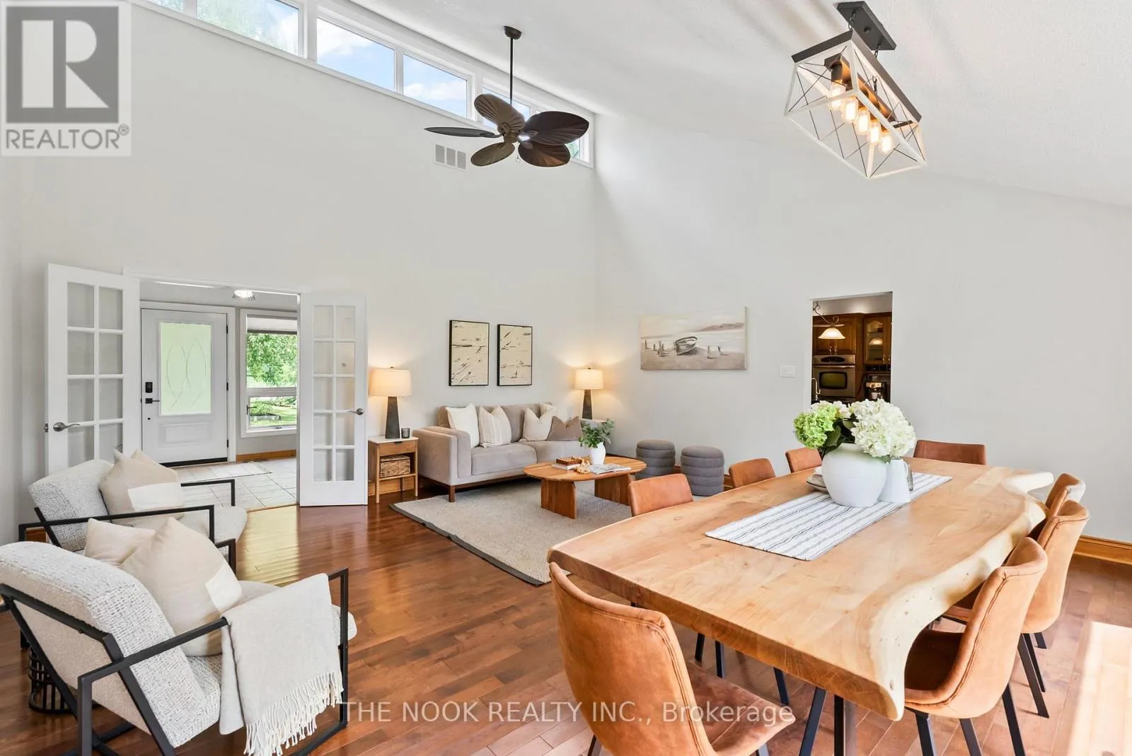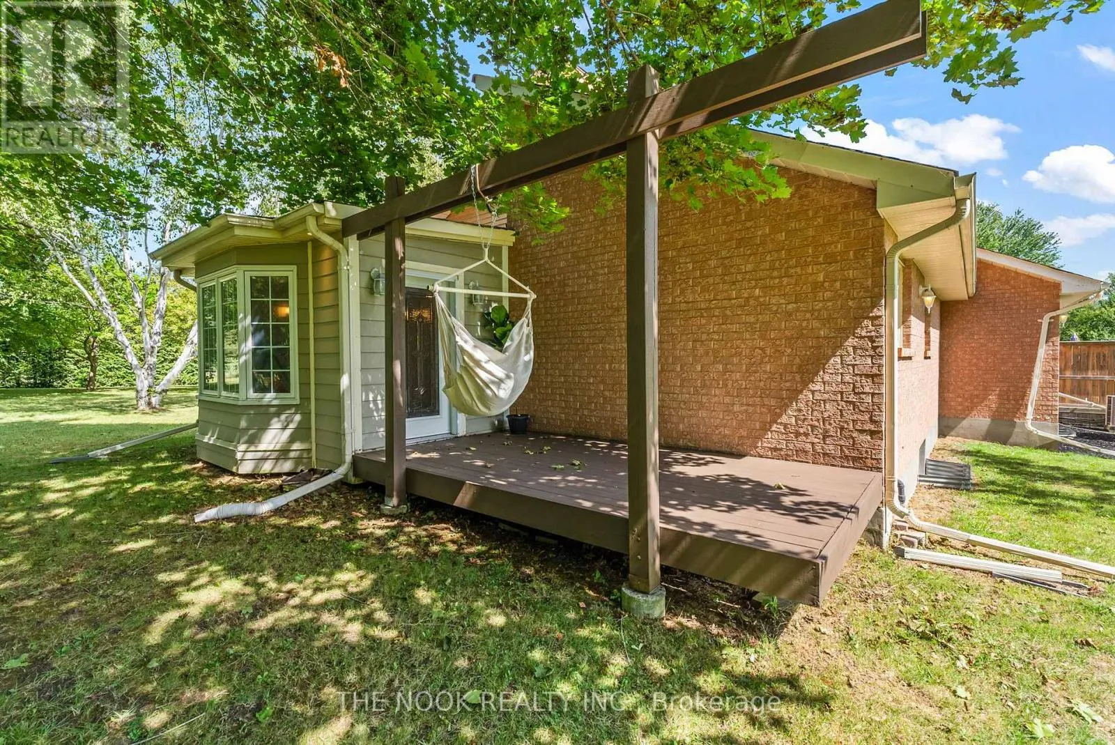 Cross Streets: Simcoe and Stone Sound. ** Directions: North on Simcoe East on Stone Sound. Tucked away on a beautifully landscaped 1.5-acre lot in the prestigious lakeside community of Cawkers Cove, this custom 3-bedroom Viceroy bungalow combines timeless elegance with modern comfort.Step into a bright, welcoming foyer with double closets that opens to a stunning open-concept living and dining area. Soaring vaulted ceilings, gleaming hardwood floors, crown moulding, pot lights, and expansive picture windows with distinctive north-facing transoms fill the space with natural light and charm.The inviting family room centers around a classic brick wood-burning fireplace and offers a walkout to an oversized deck-perfect for entertaining or relaxing outdoors. The chef's kitchen impresses with granite countertops, a striking stone backsplash, built-in stainless steel appliances, a dedicated desk area, and an oversized island with breakfast bar. The sunlit breakfast nook overlooks the private, tree-lined grounds, creating the perfect morning retreat.A stylish powder room, French-door office or guest room, convenient laundry with side entrance, and direct access to a 3-car garage with EV outlets complete the main level.The luxurious primary suite offers custom built-ins and a spa-inspired ensuite featuring heated floors, a deep soaker tub, and a stone jet steam shower. French doors open to a private hot tub room with its own entrance and deck-an ideal space for a home gym or studio. Two additional spacious bedrooms complete the main floor.The lower level includes a finished games room and over 2,200 sq. ft. of drywalled space ready for your personal touch.Outside, the property shines with a triple-wide driveway framed by a mature privacy hedge, expansive deck, cozy fire pit, and a tranquil spring-fed pond with water feature and sandy beach.A truly unique home offering elegance, privacy, and the relaxed luxury of country living-just minutes from town. Be sure to explore the virtual tour to experience this remarkable property firsthand. (id:27476)