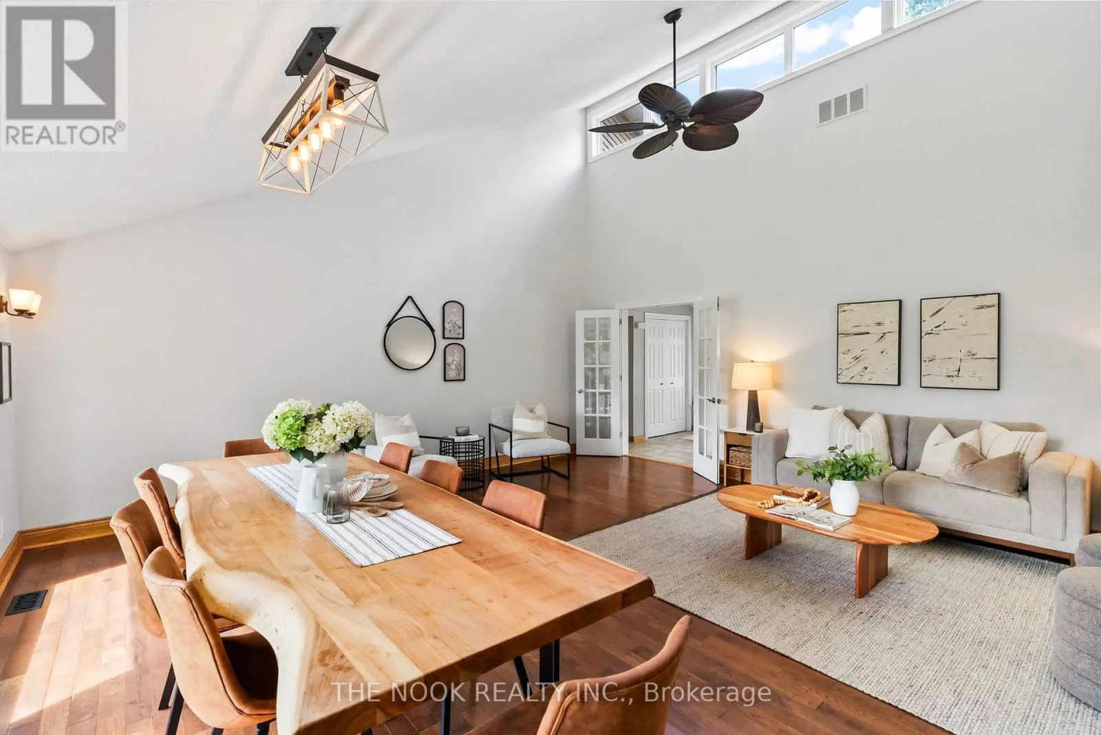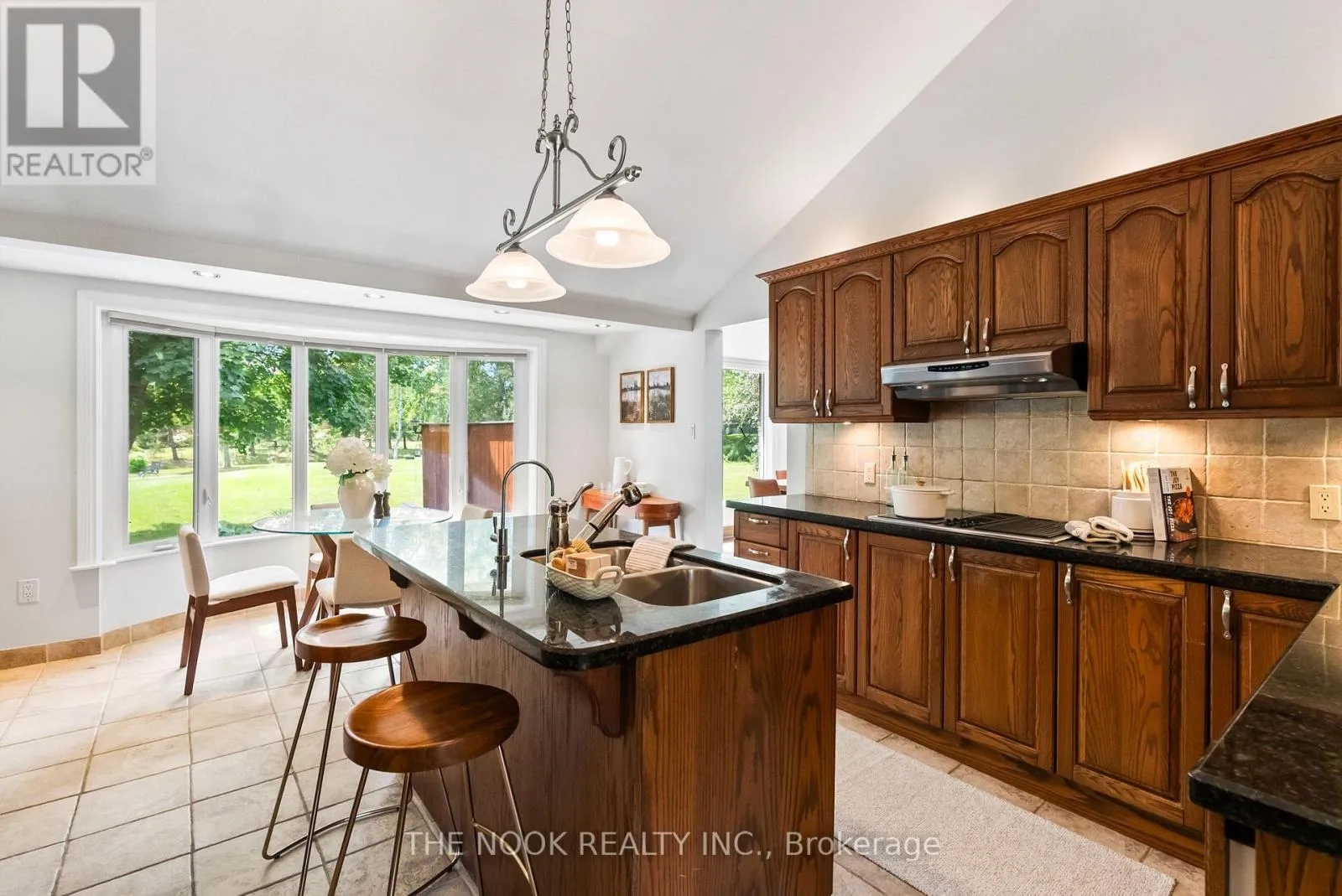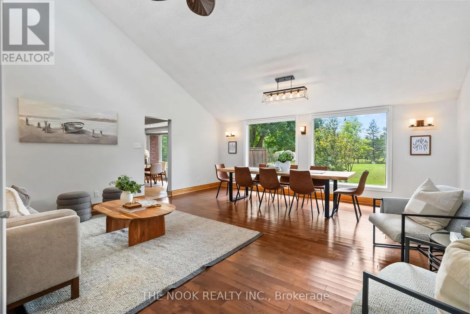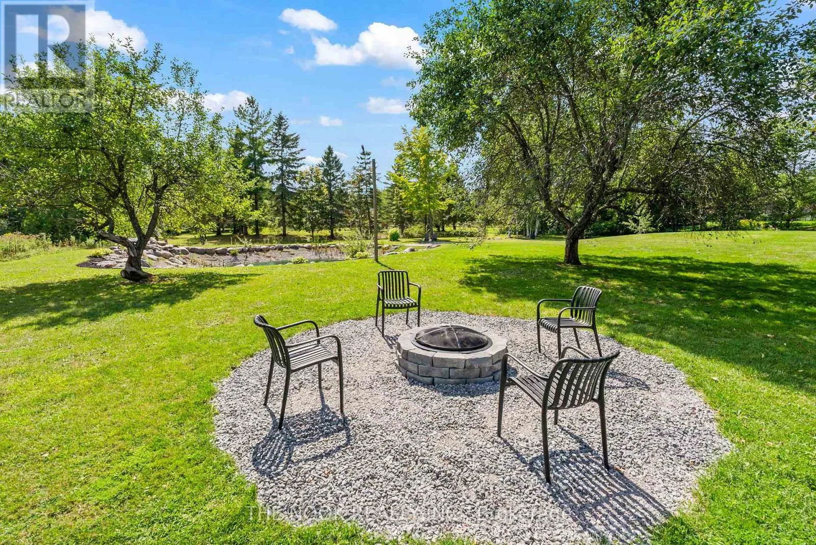 Cross Streets: Simcoe and Stone Sound. ** Directions: North on Simcoe East on Stone Sound. Tucked away on a beautifully landscaped 1.5-acre lot in the prestigious lakeside community of Cawkers Cove, this custom 3-bedroom Viceroy bungalow combines timeless elegance with modern comfort.Step into a bright, welcoming foyer with double closets that opens to a stunning open-concept living and dining area. Soaring vaulted ceilings, gleaming hardwood floors, crown moulding, pot lights, and expansive picture windows with distinctive north-facing transoms fill the space with natural light and charm.The inviting family room centers around a classic brick wood-burning fireplace and offers a walkout to an oversized deck-perfect for entertaining or relaxing outdoors. The chef's kitchen impresses with granite countertops, a striking stone backsplash, built-in stainless steel appliances, a dedicated desk area, and an oversized island with breakfast bar. The sunlit breakfast nook overlooks the private, tree-lined grounds, creating the perfect morning retreat.A stylish powder room, French-door office or guest room, convenient laundry with side entrance, and direct access to a 3-car garage with EV outlets complete the main level.The luxurious primary suite offers custom built-ins and a spa-inspired ensuite featuring heated floors, a deep soaker tub, and a stone jet steam shower. French doors open to a private hot tub room with its own entrance and deck-an ideal space for a home gym or studio. Two additional spacious bedrooms complete the main floor.The lower level includes a finished games room and over 2,200 sq. ft. of drywalled space ready for your personal touch.Outside, the property shines with a triple-wide driveway framed by a mature privacy hedge, expansive deck, cozy fire pit, and a tranquil spring-fed pond with water feature and sandy beach.A truly unique home offering elegance, privacy, and the relaxed luxury of country living-just minutes from town. Be sure to explore the virtual tour to experience this remarkable property firsthand. (id:27476)