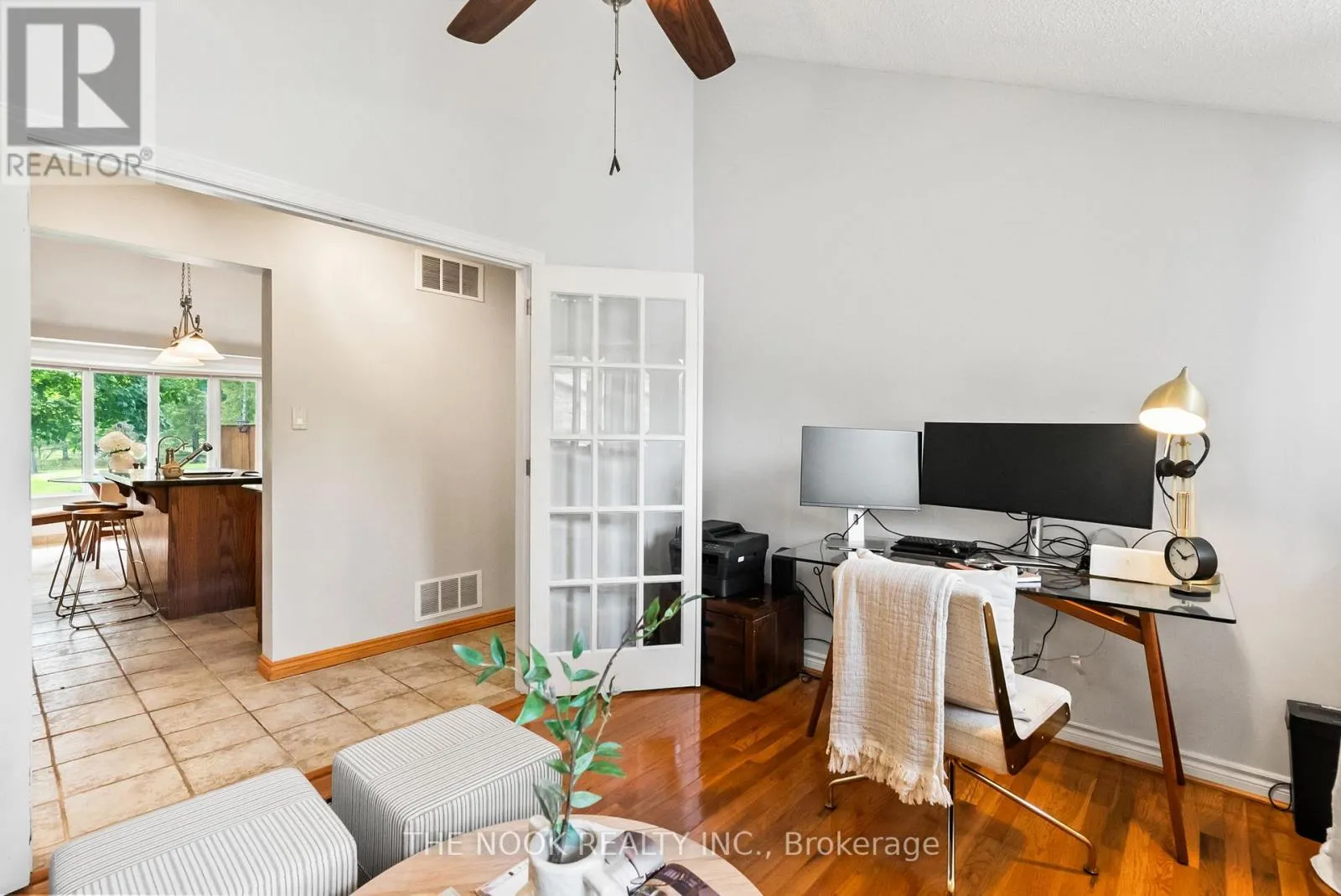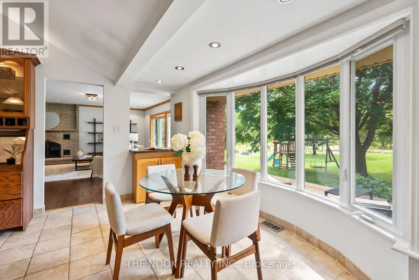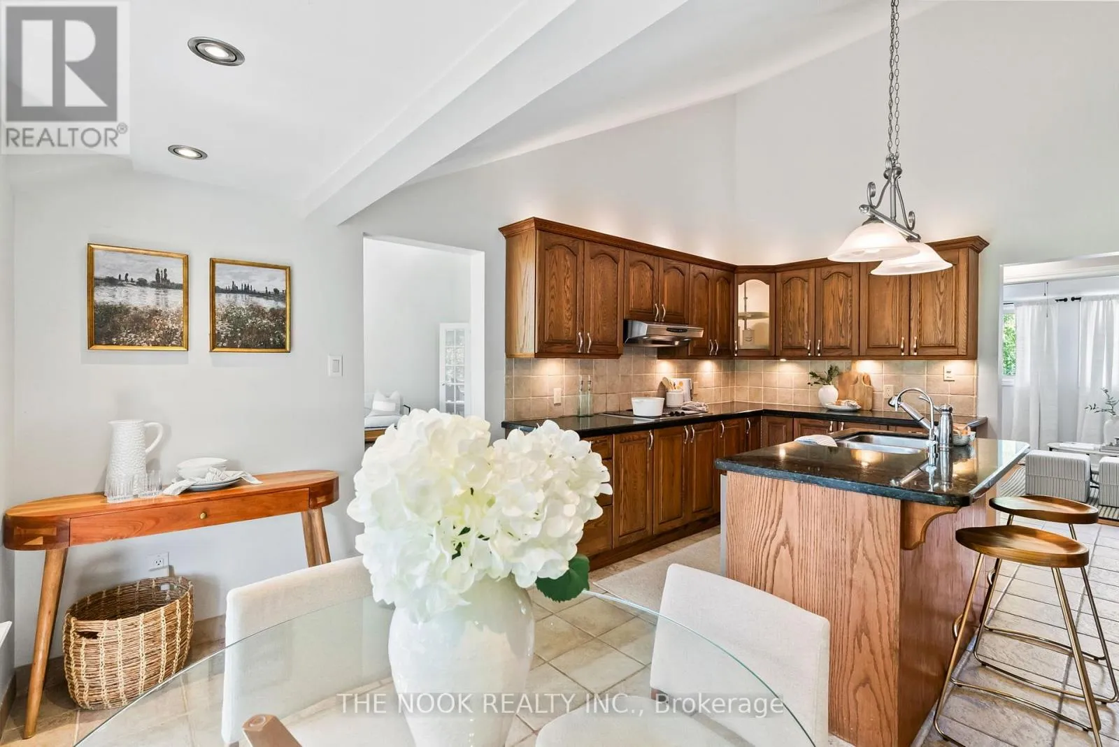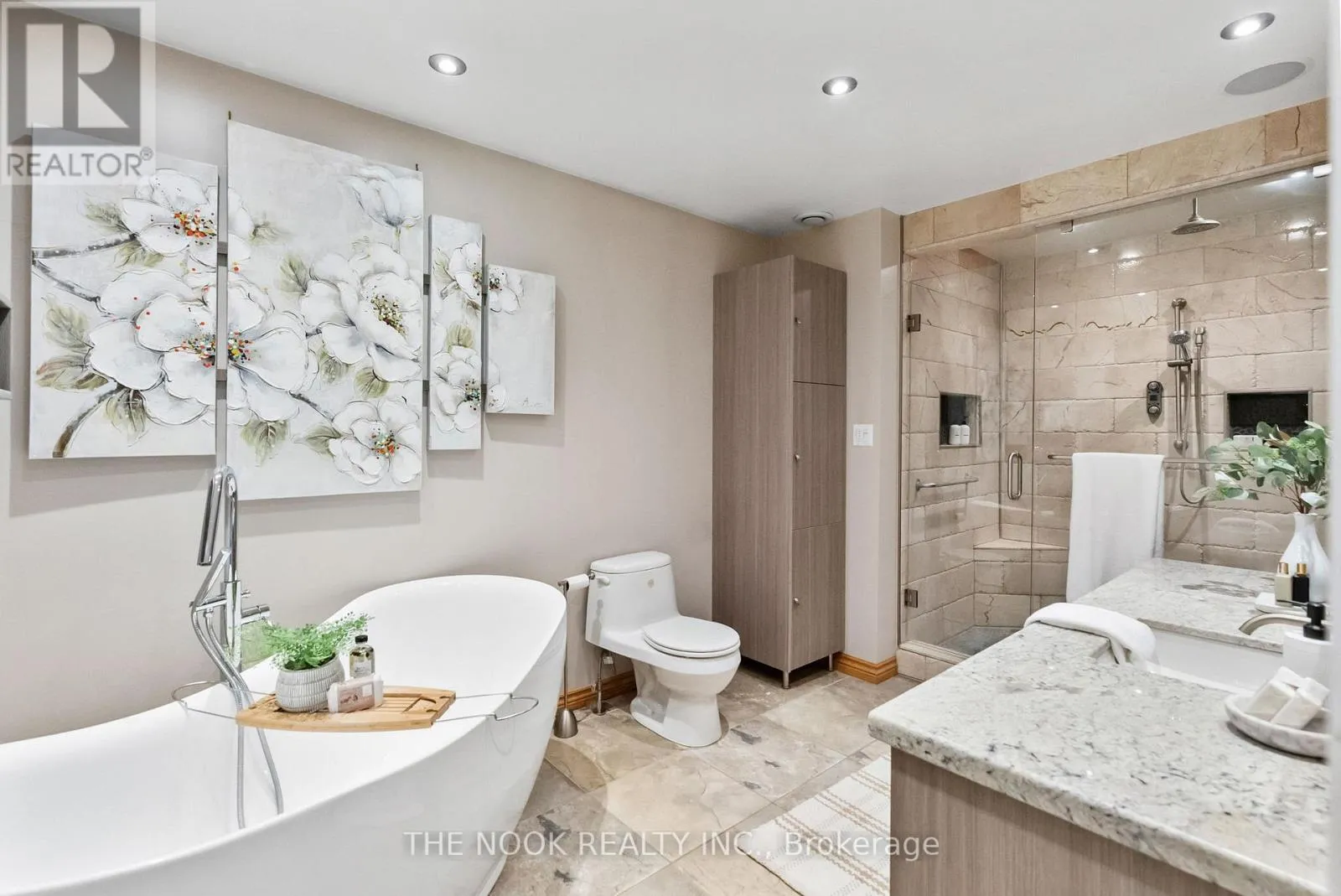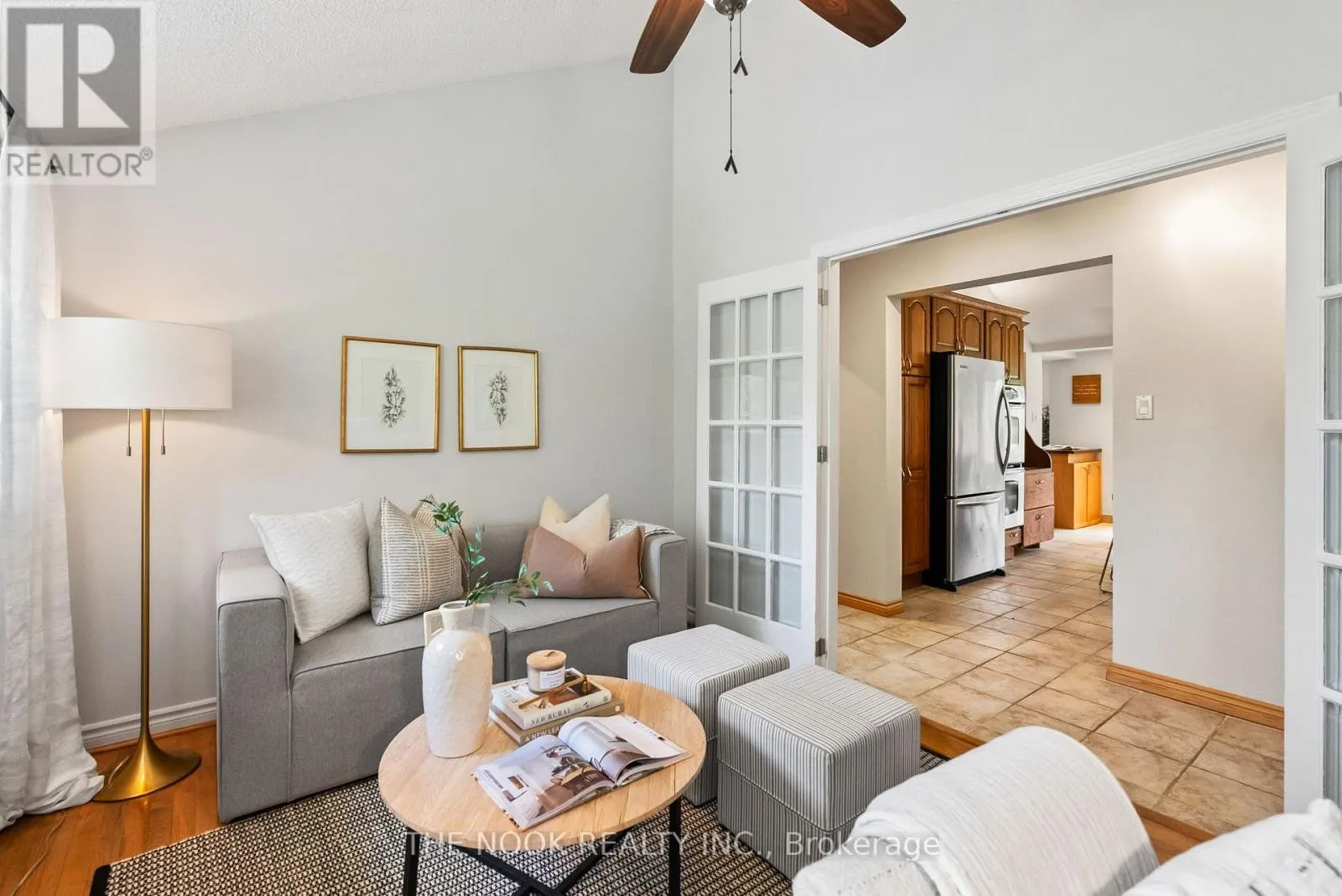 Cross Streets: Simcoe and Stone Sound. ** Directions: North on Simcoe East on Stone Sound. Tucked away on a beautifully landscaped 1.5-acre lot in the prestigious lakeside community of Cawkers Cove, this custom 3-bedroom Viceroy bungalow combines timeless elegance with modern comfort.Step into a bright, welcoming foyer with double closets that opens to a stunning open-concept living and dining area. Soaring vaulted ceilings, gleaming hardwood floors, crown moulding, pot lights, and expansive picture windows with distinctive north-facing transoms fill the space with natural light and charm.The inviting family room centers around a classic brick wood-burning fireplace and offers a walkout to an oversized deck-perfect for entertaining or relaxing outdoors. The chef's kitchen impresses with granite countertops, a striking stone backsplash, built-in stainless steel appliances, a dedicated desk area, and an oversized island with breakfast bar. The sunlit breakfast nook overlooks the private, tree-lined grounds, creating the perfect morning retreat.A stylish powder room, French-door office or guest room, convenient laundry with side entrance, and direct access to a 3-car garage with EV outlets complete the main level.The luxurious primary suite offers custom built-ins and a spa-inspired ensuite featuring heated floors, a deep soaker tub, and a stone jet steam shower. French doors open to a private hot tub room with its own entrance and deck-an ideal space for a home gym or studio. Two additional spacious bedrooms complete the main floor.The lower level includes a finished games room and over 2,200 sq. ft. of drywalled space ready for your personal touch.Outside, the property shines with a triple-wide driveway framed by a mature privacy hedge, expansive deck, cozy fire pit, and a tranquil spring-fed pond with water feature and sandy beach.A truly unique home offering elegance, privacy, and the relaxed luxury of country living-just minutes from town. Be sure to explore the virtual tour to experience this remarkable property firsthand. (id:27476)