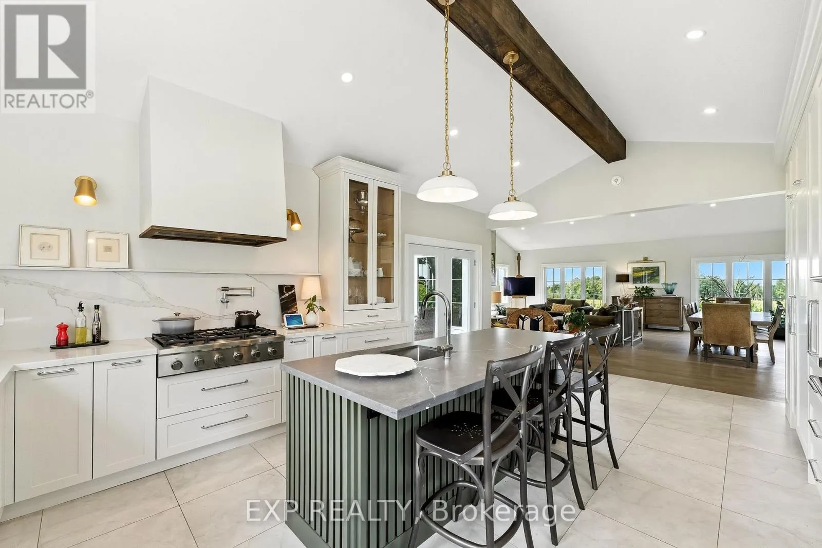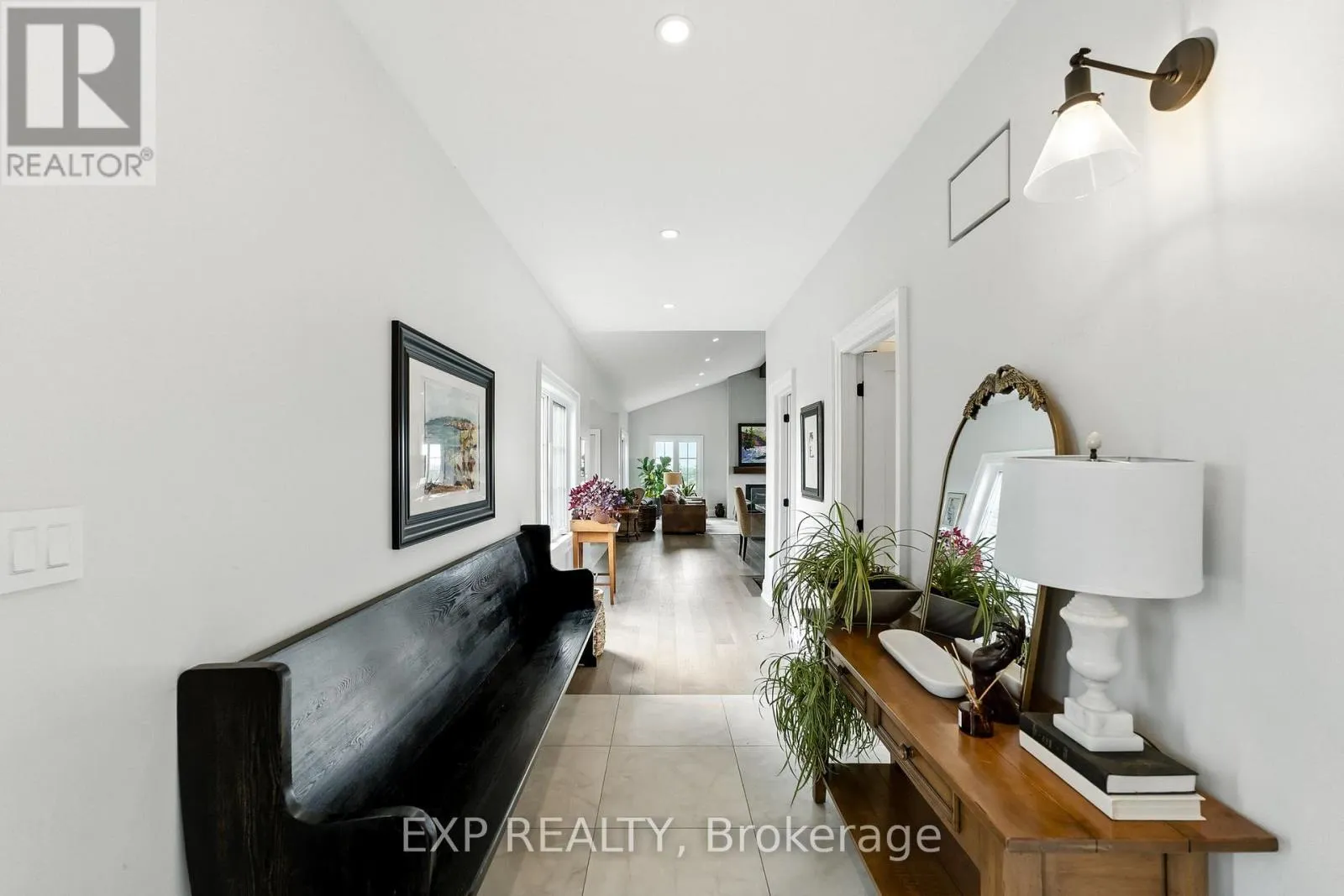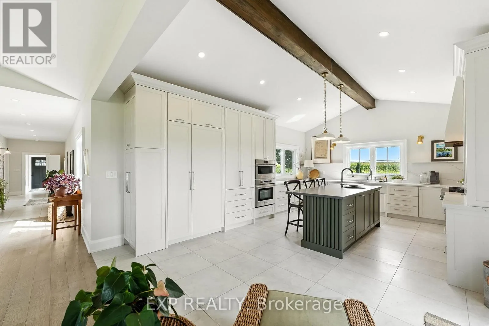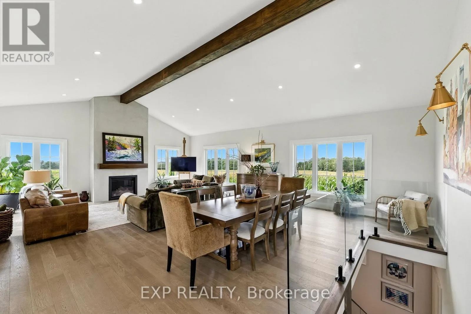 Cross Streets: Hwy 7A and Wilson Avenue. ** Directions: Head South on Wilson Ave, property is on the east side of the road. Welcome to this custom-built luxury bungalow on 1.54 acres of private countryside, offering modern comfort with timeless rural charm. A tree-lined driveway leads to beautifully landscaped grounds, a welcoming front porch, & multiple outdoor living spaces, including a raised deck & spacious patio for entertaining. The main level of this home is thoughtfully designed to combine everyday functionality with elegant style. A welcoming foyer with a double closet leads into the open-concept living spaces, where soaring ceilings with wood beams, expansive windows, & a striking fireplace create a bright & inviting atmosphere. The chefs kitchen is a true highlight, featuring high-end appliances, custom cabinetry, a large centre island, & a walkout to the deck. Seamlessly connected, the dining area & living room provide an ideal setting for gatherings, with natural light flooding the space from every angle. The primary retreat offers built-in cabinetry, a luxurious 5-piece ensuite with soaker tub & glass shower, & private access to the deck. A second bedroom, currently staged as a home office, adds convenience for guests. Completing the main floor is a well-equipped laundry & mudroom with direct access to the attached garage. The fully finished lower level extends the living space beautifully. A wide staircase with glass railing opens to the rec room, complete with a sleek wet bar, custom built-in shelving, & a cozy fireplace. A glass-enclosed gym provides a dedicated space for fitness while maintaining an open, modern feel. Two generously sized bedrooms, each with large above-grade windows, are complemented by a stylish 4-piece bathroom. The lower level offers the ideal blend of relaxation, recreation, & practicality, while also housing a utility room for added convenience. With an attached garage plus a detached workshop, this property is ideal for both relaxation & practicality, all while surrounded by sweeping farmland views & just minutes from nearby amenities. (id:27476)