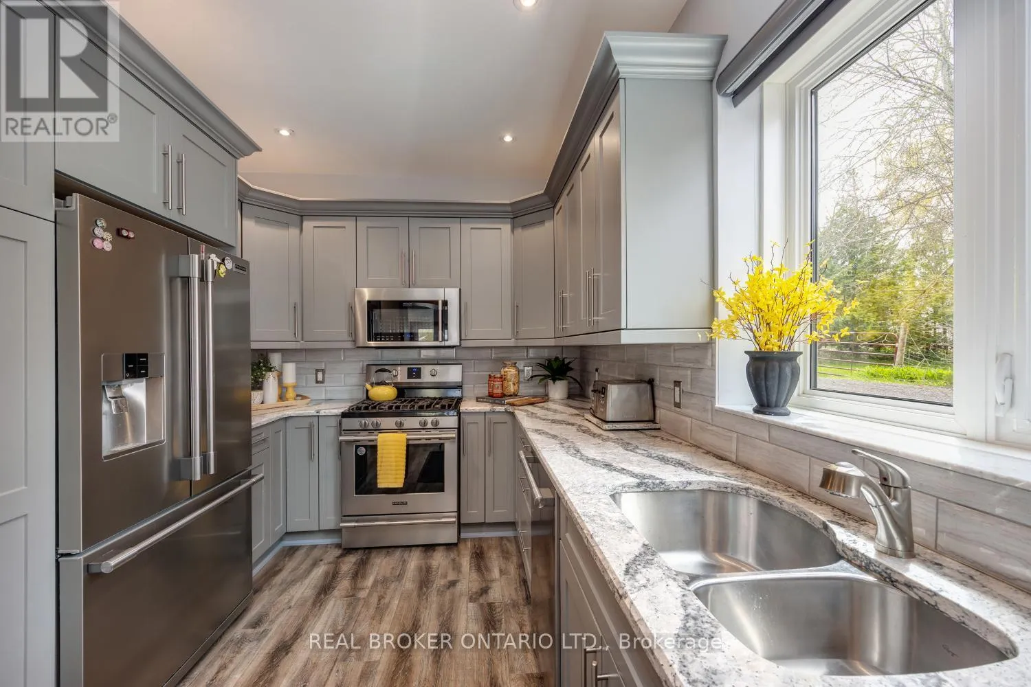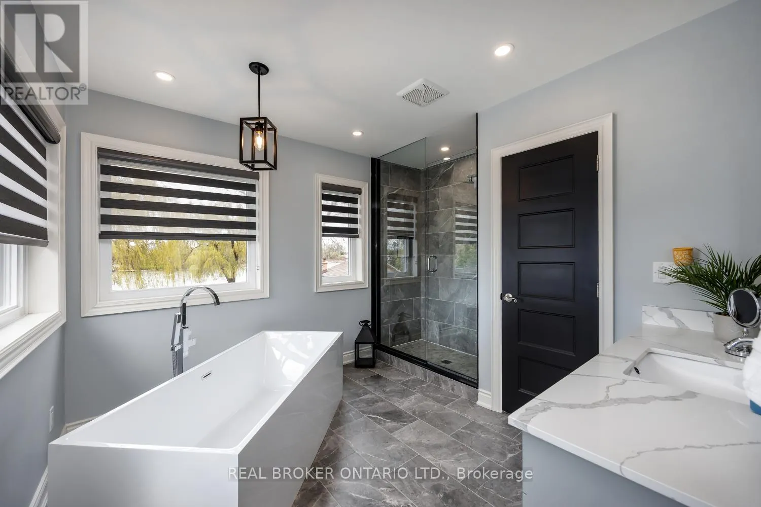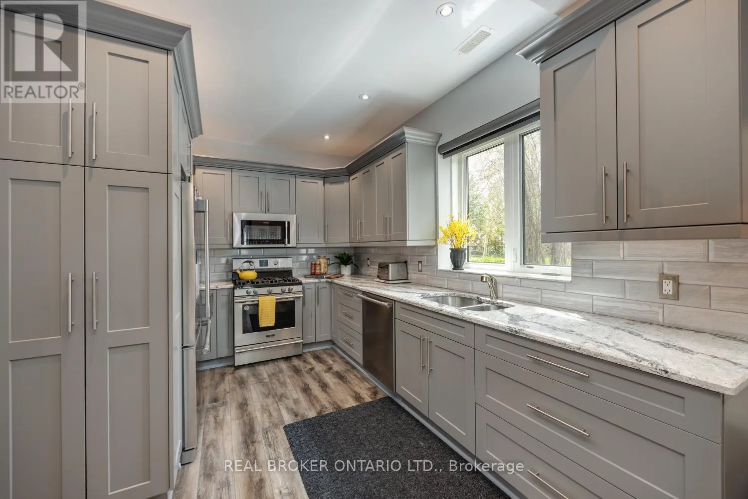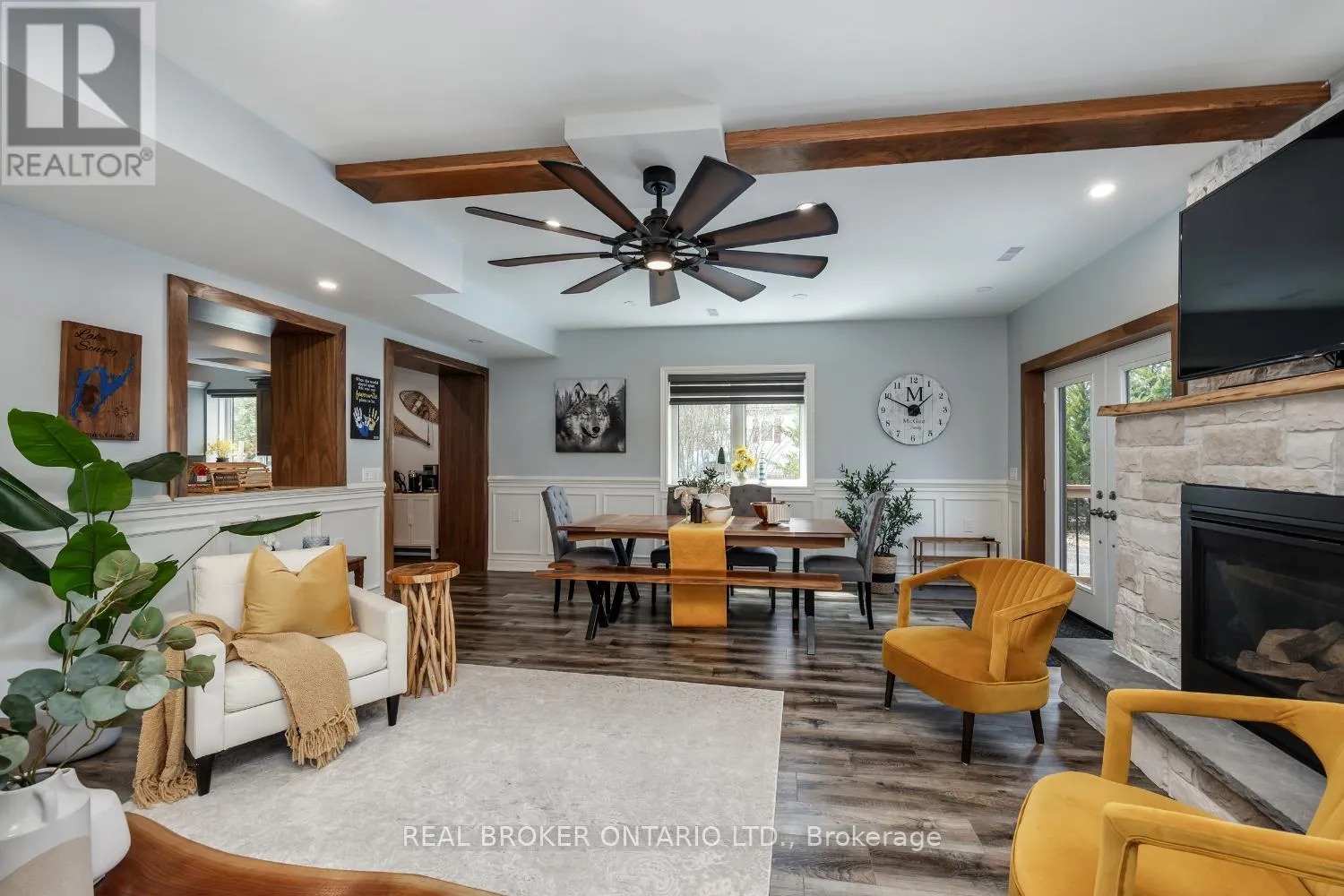 Cross Streets: Golf Course Rd/View Lake Rd. ** Directions: Hwy 35 to west on RR57 (Golf Course Rd). Turn west onto view lake Rd. House is 526. Welcome to your own lakeside escape, where comfort, relaxation, and natural beauty come together. Set on an oversized, beautifully landscaped waterfront lot, this inviting 5-bedroom home is the perfect place to gather with family and friends while enjoying peaceful views of the lake. Two driveways provide plenty of parking for guests, while the heated and insulated 2-car garage with epoxy flooring and a convenient 3-piece bath adds practicality for year-round use. Inside, the bright and spacious main floor is finished with stylish luxury vinyl plank flooring. The eat-in kitchen features quartz countertops, stainless steel appliances, pot lighting, and plenty of storage, perfect for preparing meals after a day on the water. A charming dining room with classic wainscoting offers walk-out access to the expansive deck, making summer dinners and sunset gatherings effortless. The cozy living room with gas fireplace invites you to unwind, while a den provides extra space. Upstairs, five generously sized bedrooms make hosting family and guests easy. The primary suite is a peaceful retreat with a walk-in closet and a beautiful ensuite featuring a deep soaker tub and tiled walk-in shower. A separate sitting room opens to a balcony overlooking the lake, the perfect place to enjoy morning coffee or watch the sky change over the water. Outside, your private waterfront oasis awaits. The large deck with outdoor kitchen and gazebo is ideal for entertaining, while the private dock and sandy beach area offer endless opportunities for swimming, boating, and soaking up the sun. With two garden sheds for storage and stunning surroundings, this property is ready for you to move in and start making unforgettable lakefront memories. (id:27476)