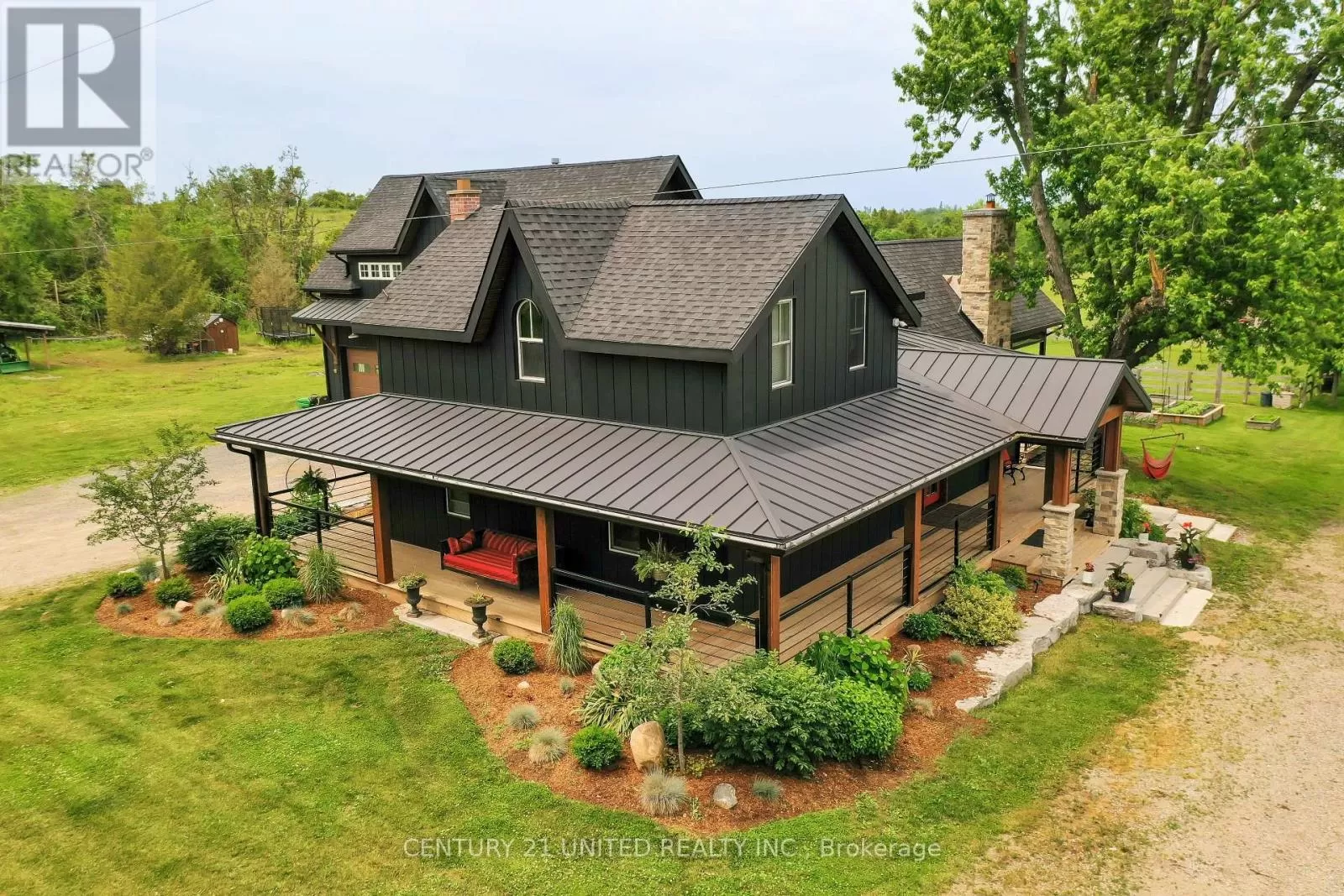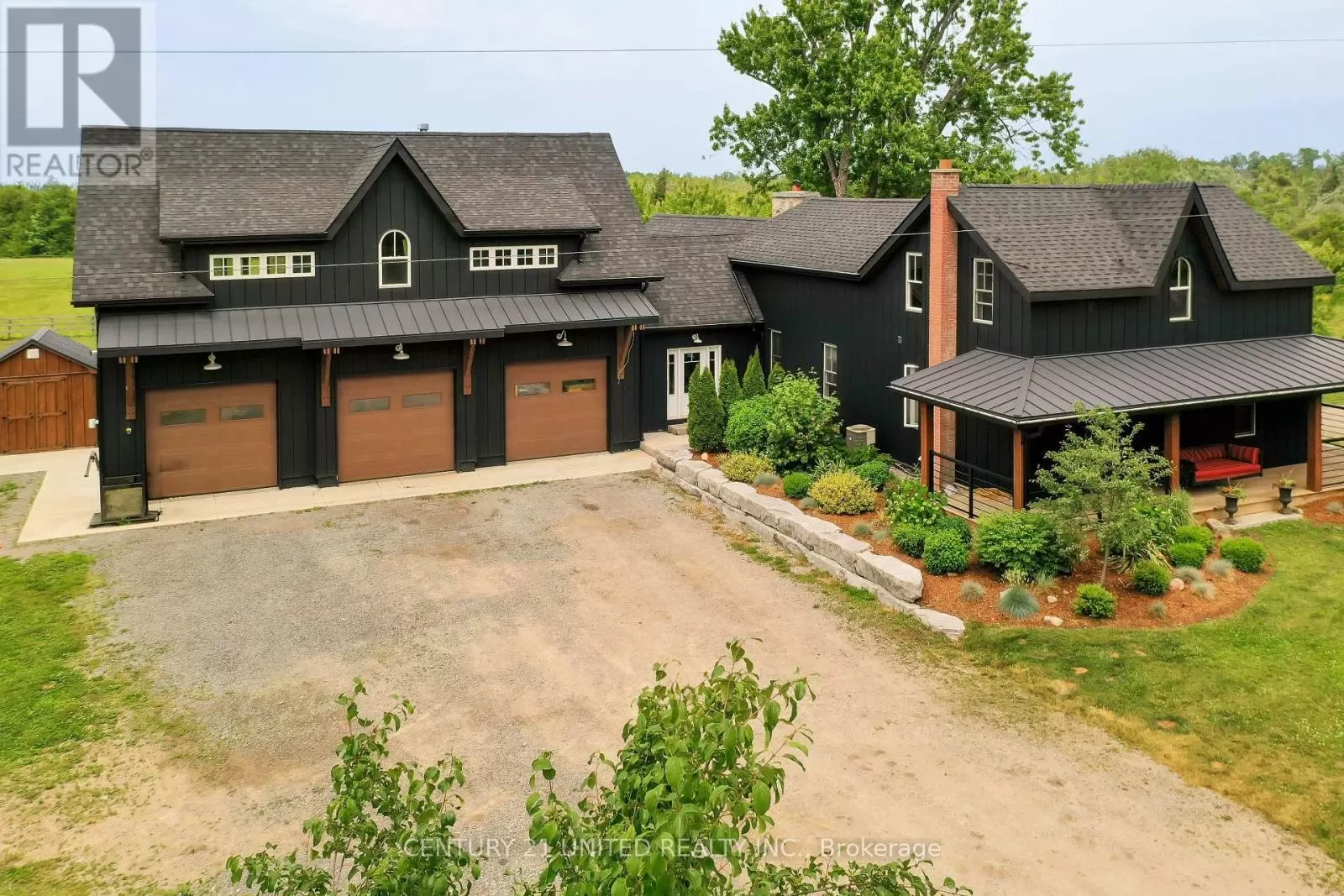 Selwyn Road Luxury hobby farm on 75 acres! Where contemporary design meets rural charm. No detail was overlooked in the renovation of the original farmhouse and addition (2020), exterior finished with striking matte black steel-clad, creating a one-of-a-kind country retreat. Inside, the great room boasts vaulted ceilings, a wood-burning fireplace, and expansive sliding glass doors with breathtaking views. The main floor primary suite includes a spa-like ensuite, while upstairs offers additional bedrooms, an office, and a home gym. A private in-law suite above the three-car garage includes its own family room with propane fireplace, wet bar and balcony overlooking the property ideal for guests or multigenerational living. The garage and workshop provide ample space for hobbies and storage. Outdoors, enjoy multiple horse paddocks, a chicken coop, vegetable gardens, and a spring-fed pond with beach! The back deck features automatic screens to fully enclose the space, and the outdoor dining area is equipped with automatic all-season shades. Perfect for equestrians, nature lovers, or those seeking privacy, this property offers the ultimate blend of luxury and country living. (id:27476)