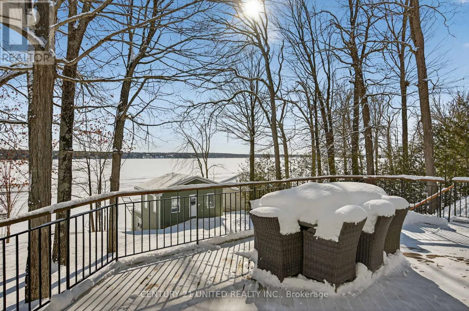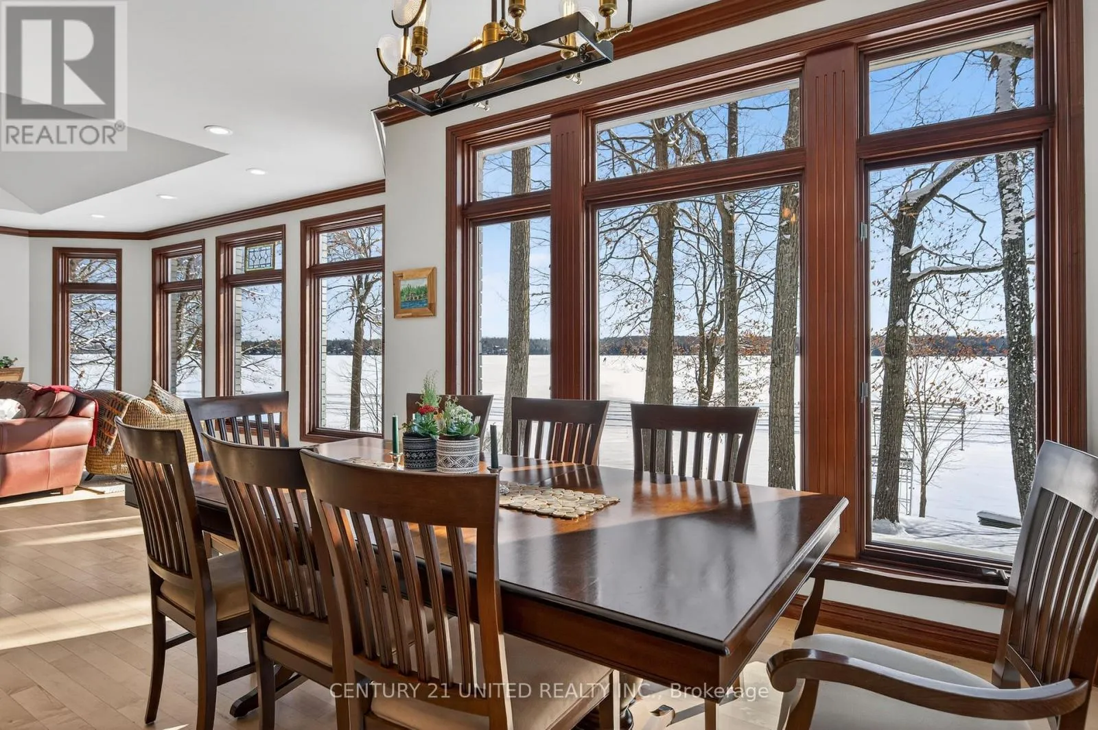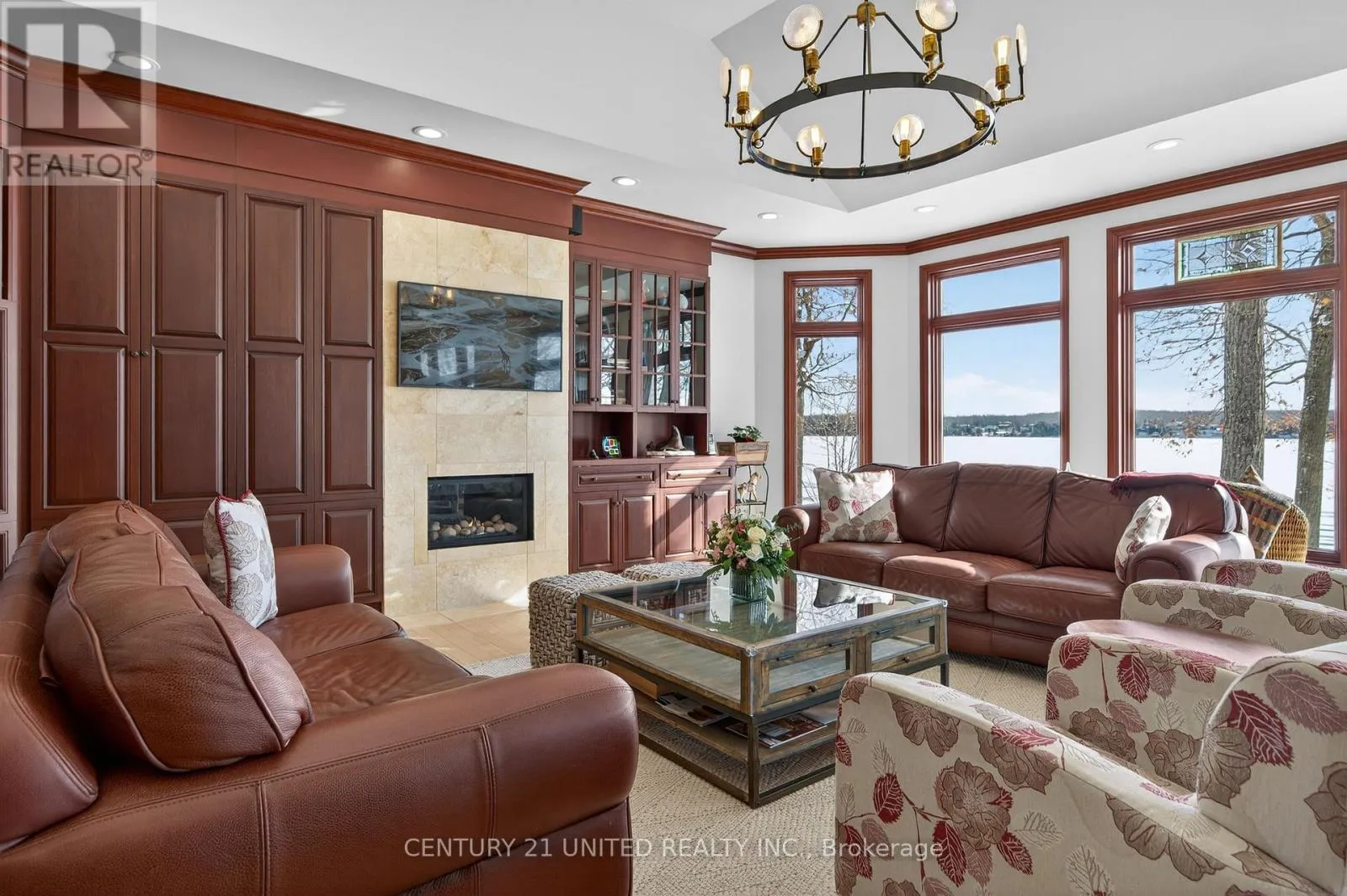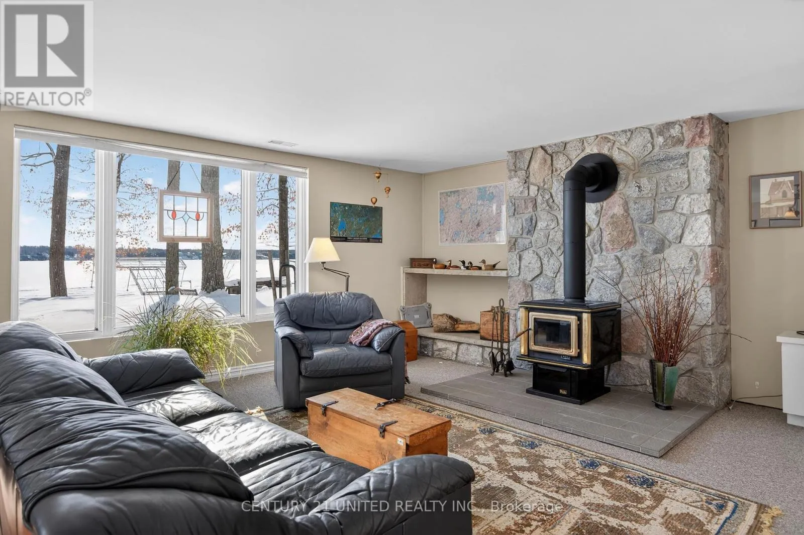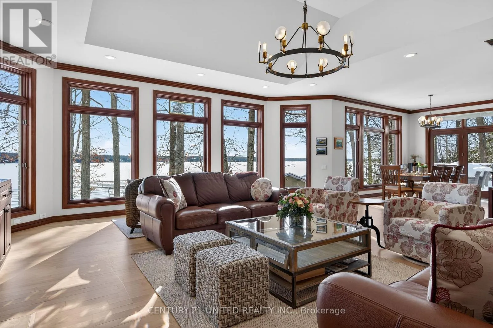 Cross Streets: Highway 28 and Sandy Point Road. ** Directions: Highway 28 to Sandy Point Rd to Fire Route 50. Set on the pristine shores of Clear Lake, this executive 6 bedroom, 5 bathroom waterfront home offers a rare blend of luxury, privacy and iconic Kawartha living. This exceptional brick and pine bungalow has approximately 5,400 sq ft of finished living space, combining quality craftsmanship and thoughtful design-set on a private lot with easy access off the main road. A spacious front entryway leads into an impressive open-concept living, dining, and kitchen area, highlighted by vaulted ceilings and wall-to-ceiling windows showcasing spectacular lakeviews. Maple flooring, recessed pot lighting, and a propane fireplace create a warm yet refined atmosphere. The living and kitchen areas feature custom cherry cabinetry, while the kitchen is beautifully appointed with high-end appliances, an extra-large refrigerator, and granite countertops and backsplash-perfect for entertaining. A large deck off the kitchen provides seamless access to the garden and waterfront. The main level also includes a large front office, main-floor laundry, and a primary suite with walk-in closet and spa-like ensuite. The walk-out lower level features a generous recreation room with wood-burning fireplace, floor-to-ceiling windows, and space for family gatherings. Also with its own private entrance is a self-contained 2-bedroom, 1-bath in-law suite, ideal for guests or extended family. Outside, enjoy 107 ft of flat, private waterfront, canilevered aluminum T-docks, and a double dry boathouse with recreational space above, offering excellent storage for boats and watertoys. Two additional back lots provide extra storage and future potential. Additional features include an attached double garage, 24' x 25' workshop, paved driveway, underground watering system, armoured retaining wall, and quality construction throughout. An outstanding Clear Lake executive waterfront offering, gorgeous from entrance to exit. (id:27476)