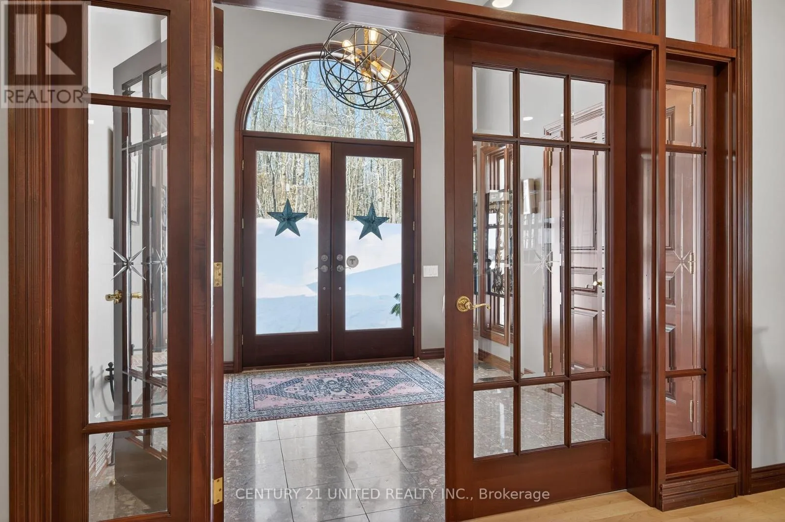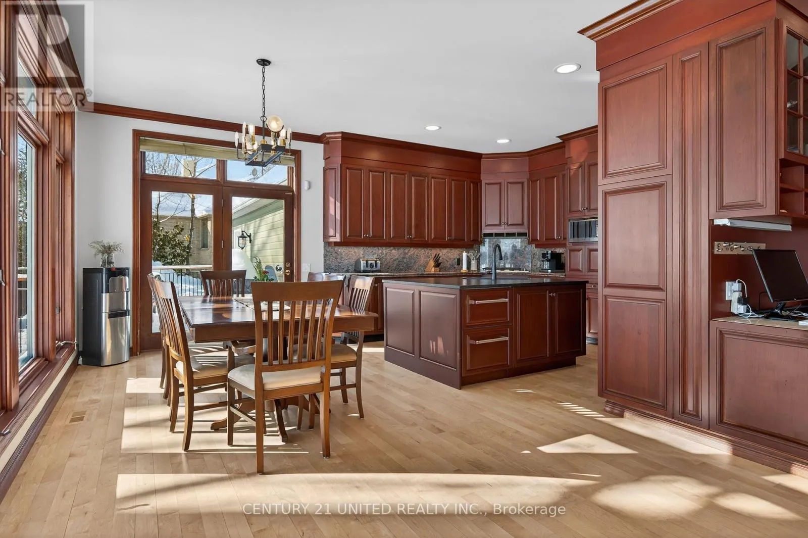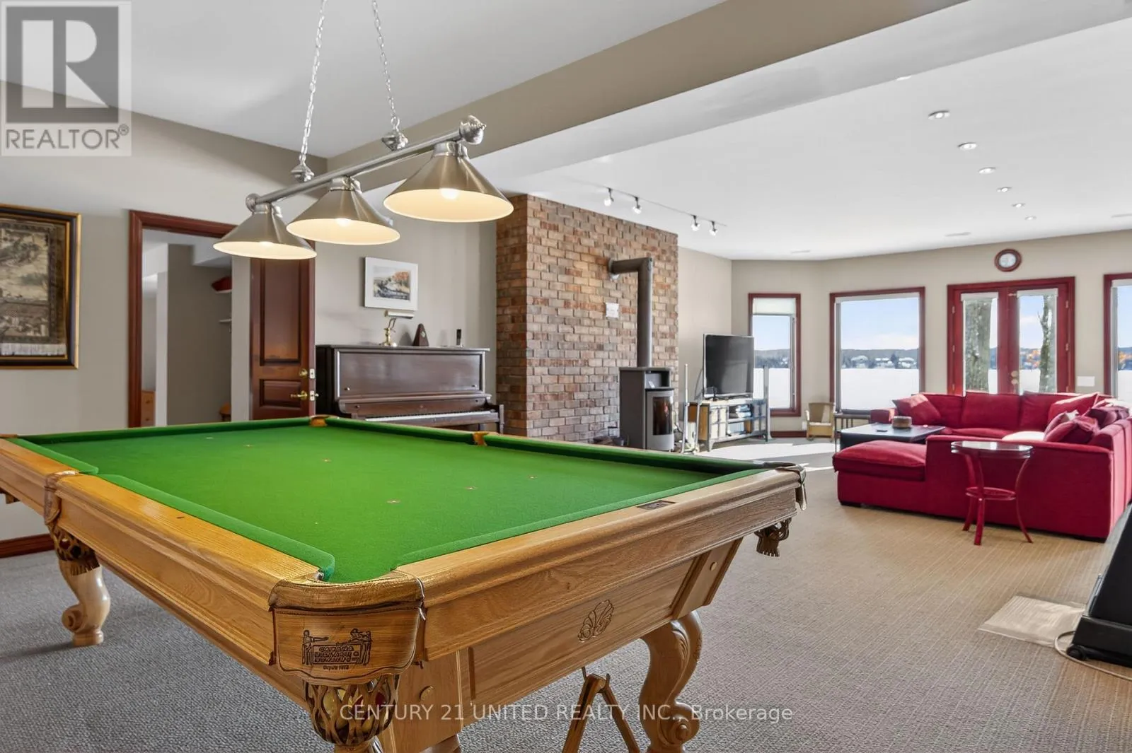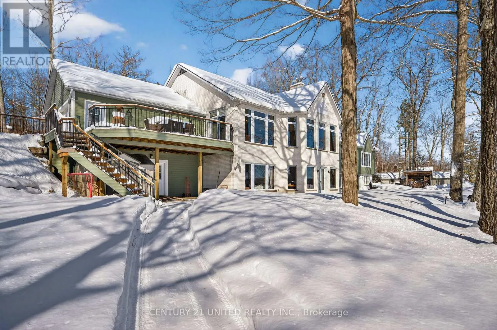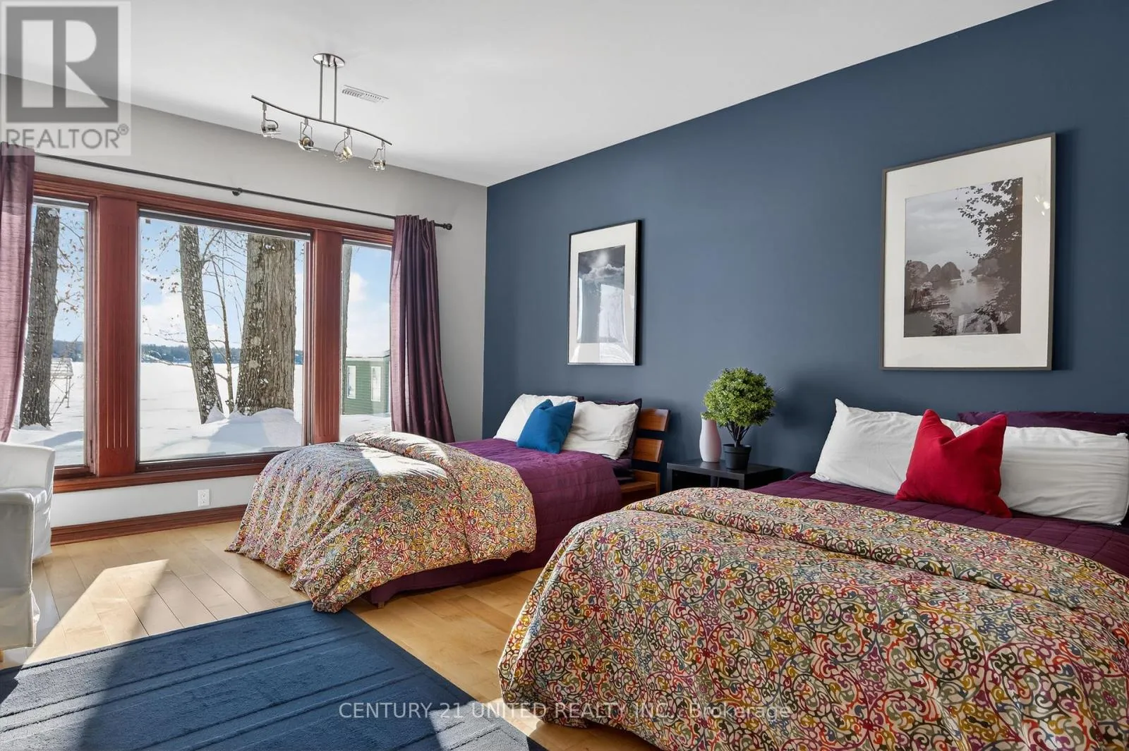 Cross Streets: Highway 28 and Sandy Point Road. ** Directions: Highway 28 to Sandy Point Rd to Fire Route 50. Set on the pristine shores of Clear Lake, this executive 6 bedroom, 5 bathroom waterfront home offers a rare blend of luxury, privacy and iconic Kawartha living. This exceptional brick and pine bungalow has approximately 5,400 sq ft of finished living space, combining quality craftsmanship and thoughtful design-set on a private lot with easy access off the main road. A spacious front entryway leads into an impressive open-concept living, dining, and kitchen area, highlighted by vaulted ceilings and wall-to-ceiling windows showcasing spectacular lakeviews. Maple flooring, recessed pot lighting, and a propane fireplace create a warm yet refined atmosphere. The living and kitchen areas feature custom cherry cabinetry, while the kitchen is beautifully appointed with high-end appliances, an extra-large refrigerator, and granite countertops and backsplash-perfect for entertaining. A large deck off the kitchen provides seamless access to the garden and waterfront. The main level also includes a large front office, main-floor laundry, and a primary suite with walk-in closet and spa-like ensuite. The walk-out lower level features a generous recreation room with wood-burning fireplace, floor-to-ceiling windows, and space for family gatherings. Also with its own private entrance is a self-contained 2-bedroom, 1-bath in-law suite, ideal for guests or extended family. Outside, enjoy 107 ft of flat, private waterfront, canilevered aluminum T-docks, and a double dry boathouse with recreational space above, offering excellent storage for boats and watertoys. Two additional back lots provide extra storage and future potential. Additional features include an attached double garage, 24' x 25' workshop, paved driveway, underground watering system, armoured retaining wall, and quality construction throughout. An outstanding Clear Lake executive waterfront offering, gorgeous from entrance to exit. (id:27476)