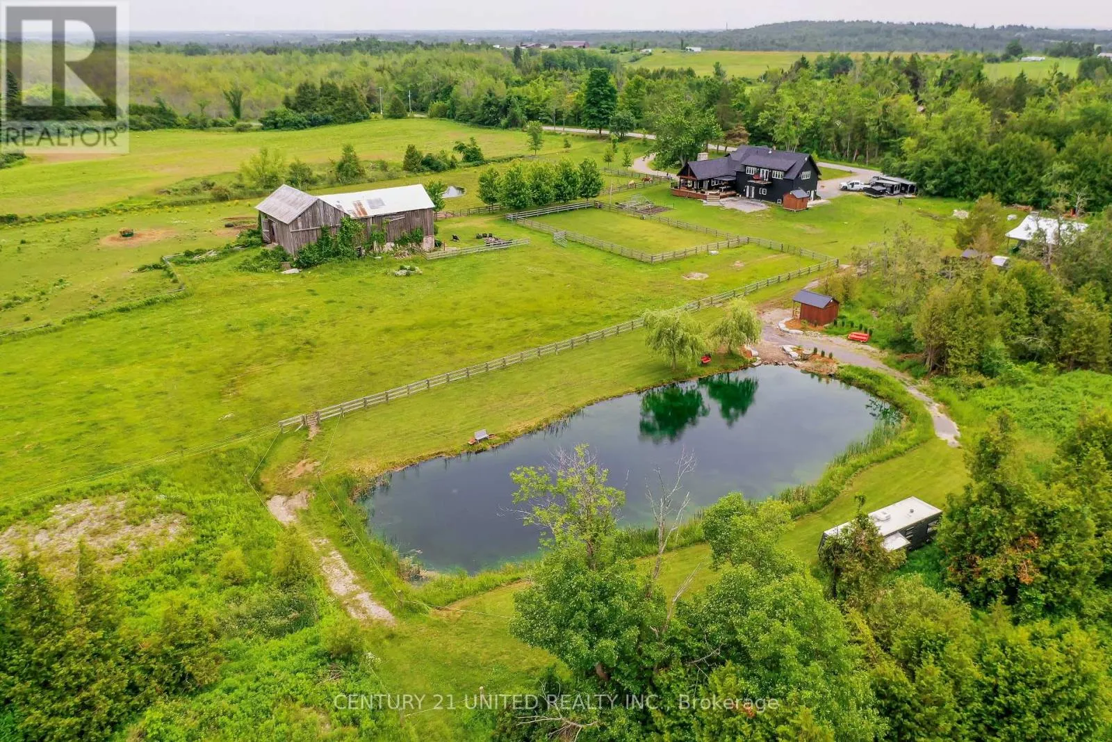 Selwyn Road Luxury hobby farm on 75 acres! Where contemporary design meets rural charm. No detail was overlooked in the renovation of the original farmhouse and addition (2020), exterior finished with striking matte black steel-clad, creating a one-of-a-kind country retreat. Inside, the great room boasts vaulted ceilings, a wood-burning fireplace, and expansive sliding glass doors with breathtaking views. The main floor primary suite includes a spa-like ensuite, while upstairs offers additional bedrooms, an office, and a home gym. A private in-law suite above the three-car garage includes its own family room with propane fireplace, wet bar and balcony overlooking the property ideal for guests or multigenerational living. The garage and workshop provide ample space for hobbies and storage. Outdoors, enjoy multiple horse paddocks, a chicken coop, vegetable gardens, and a spring-fed pond with beach! The back deck features automatic screens to fully enclose the space, and the outdoor dining area is equipped with automatic all-season shades. Perfect for equestrians, nature lovers, or those seeking privacy, this property offers the ultimate blend of luxury and country living. (id:27476)