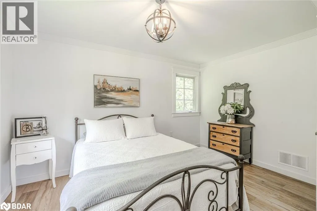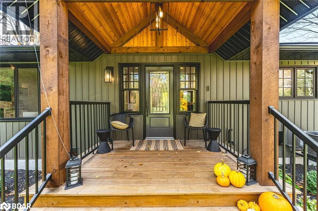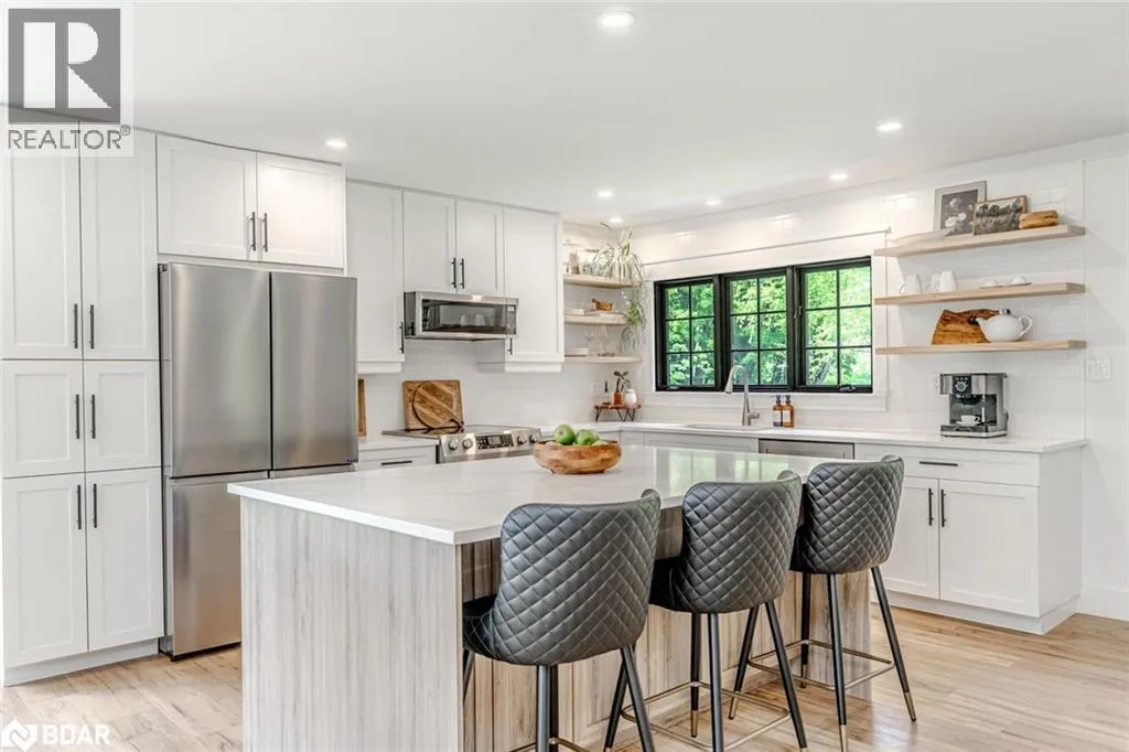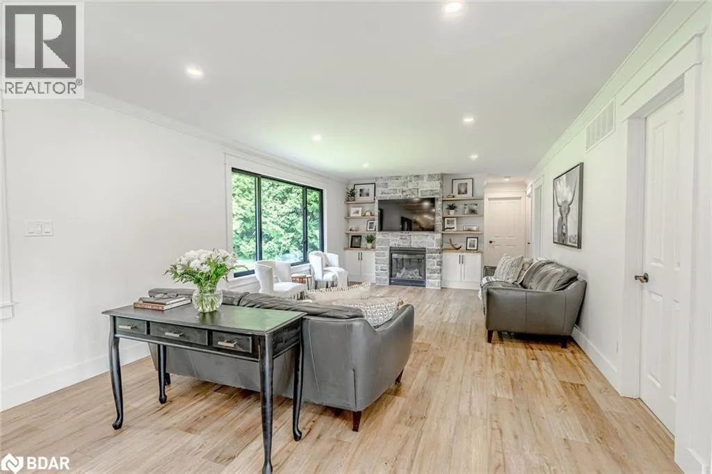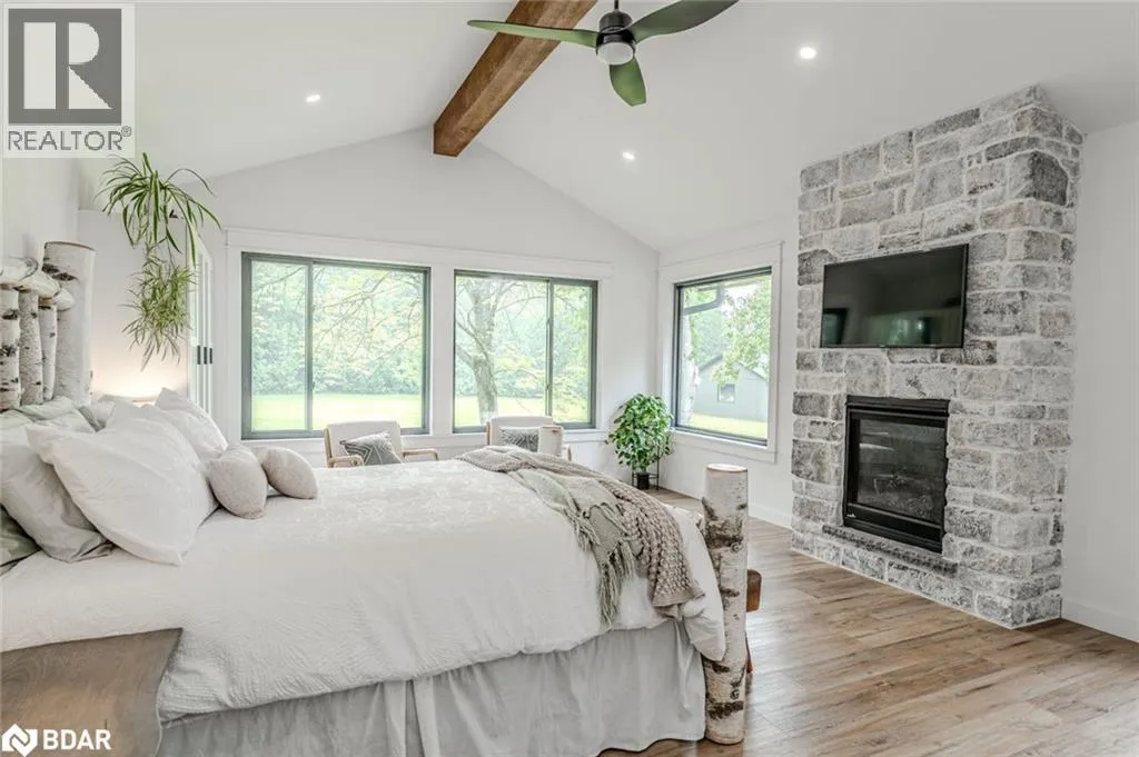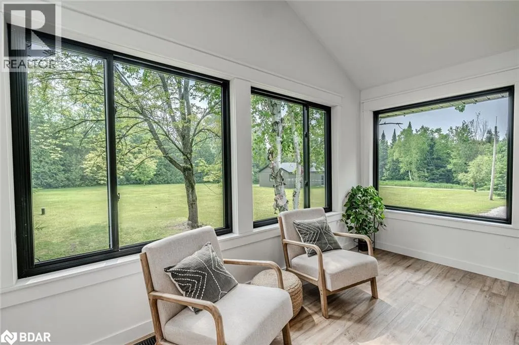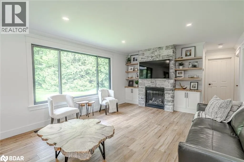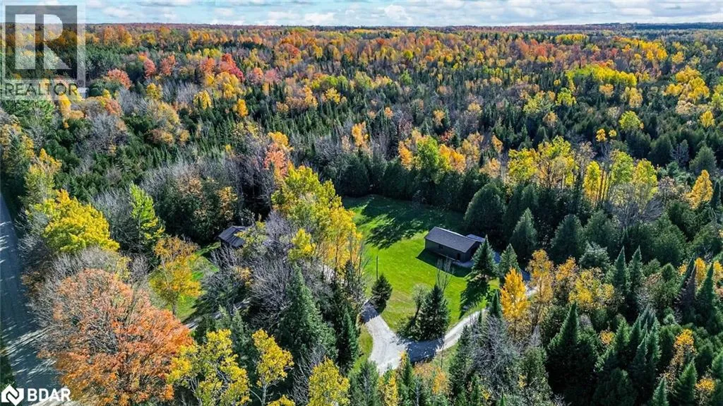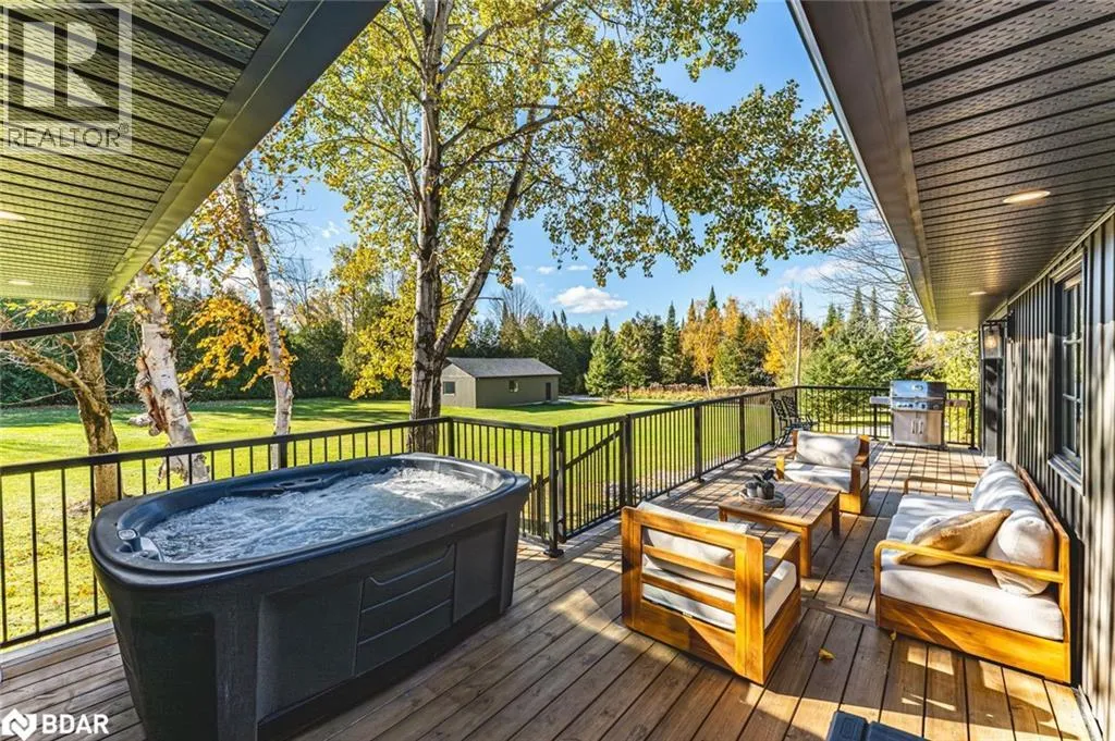 HWY 11/ Left on West Street N/Burnside Line/Thorburn Rd/Fairgrounds Rd TURNKEY BUNGALOW ON 2+ ACRES WITH HOT TUB, WALKOUT BASEMENT, DECK & DESIGNER FINISHES! Itâs easy to describe what the dream home looks like: private acreage, a backyard escape with a massive deck and hot tub, bold curb appeal that turns heads, and a fully finished bungalow with a walkout basement loaded with upscale finishes. This place delivers every single one of those boxes checked! This absolute knockout sits on over two landscaped acres just 15 minutes from Orillia, surrounded by mature trees, apple trees, lush greenery, and trilliums. Expect daily deer sightings, the occasional owl call, and jaw-dropping sunsets. The exterior makes a statement with rich wood beams, black-trimmed windows, board-and-batten-style vinyl siding, and a covered front porch. A detached 4-car garage/shop adds function with a large overhead and separate man door. Over 2,800 square feet of renovated living space showcases crown moulding, pot lights, luxury vinyl flooring, neutral tones, and elevated finishes throughout. The kitchen stuns with white cabinetry, quartz counters, open wood shelving, stainless steel appliances, and a wood-toned island with breakfast bar seating. The dining area is wrapped in black-framed windows and four-panel garden doors, two of which open wide to the deck for serious indoor-outdoor flow. The living room offers everyday comfort with a floor-to-ceiling stone propane fireplace, built-ins, and an inviting layout. The vaulted primary suite pulls out all the stops with wood beam accents, a second fireplace, a walkout, a luxurious 5-piece ensuite, and dual wardrobe systems, plus a closet. Downstairs, the walkout basement adds a bright rec room, full bath, two additional bedrooms, and a gorgeous laundry room with live-edge style counters and subway tile. The backyard is the final exclamation point with an elevated deck, hot tub, wide staircase to the lawn, mature trees, and a storage shed. Nothing overlooked. Nothing left to do. Just move in and start living! (id:27476)