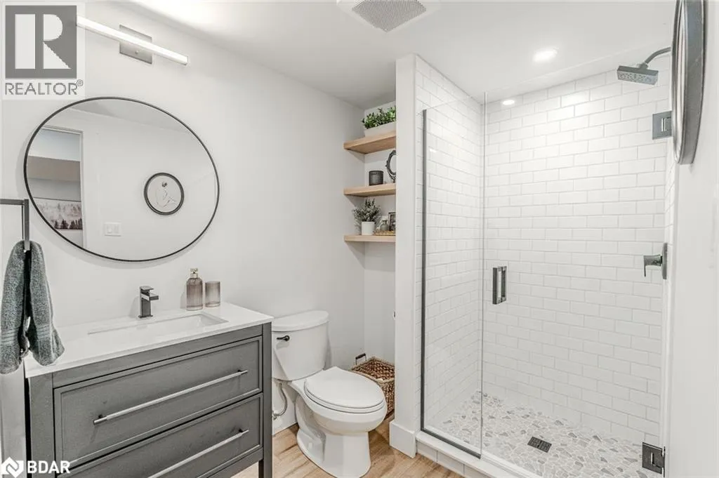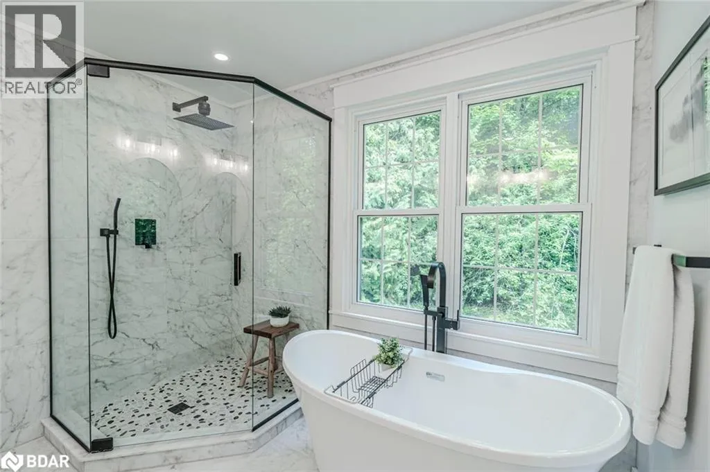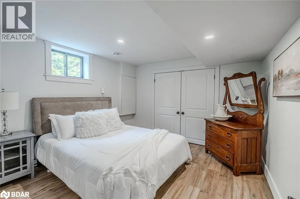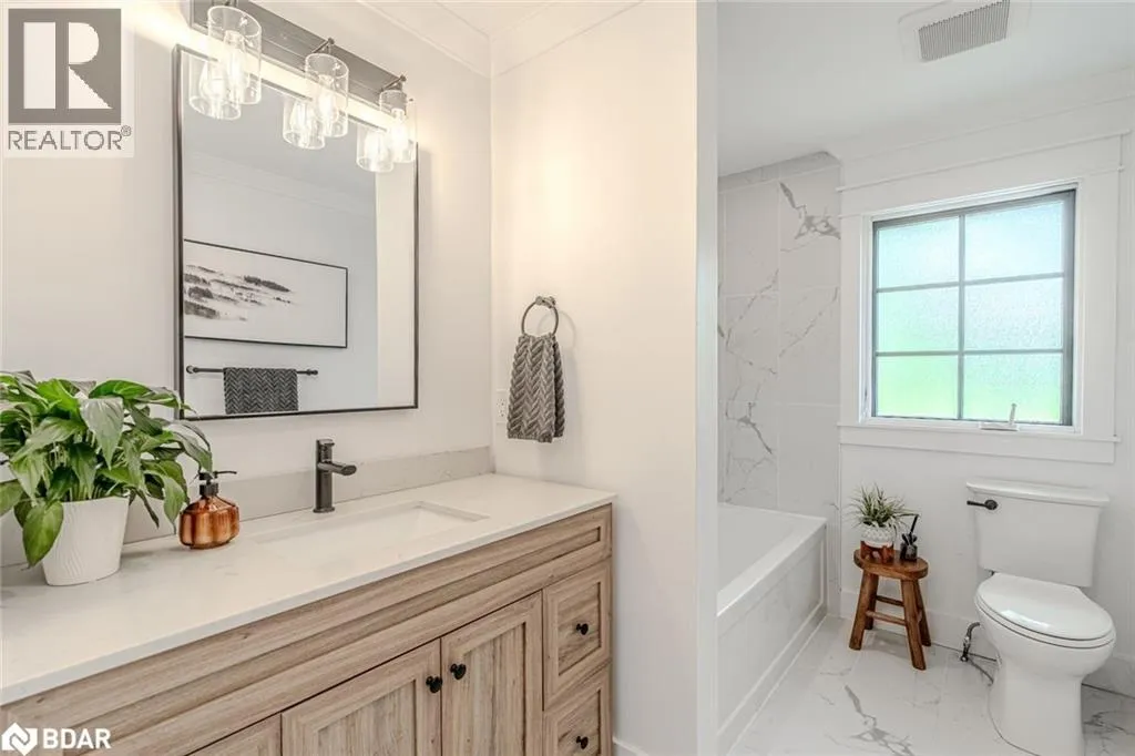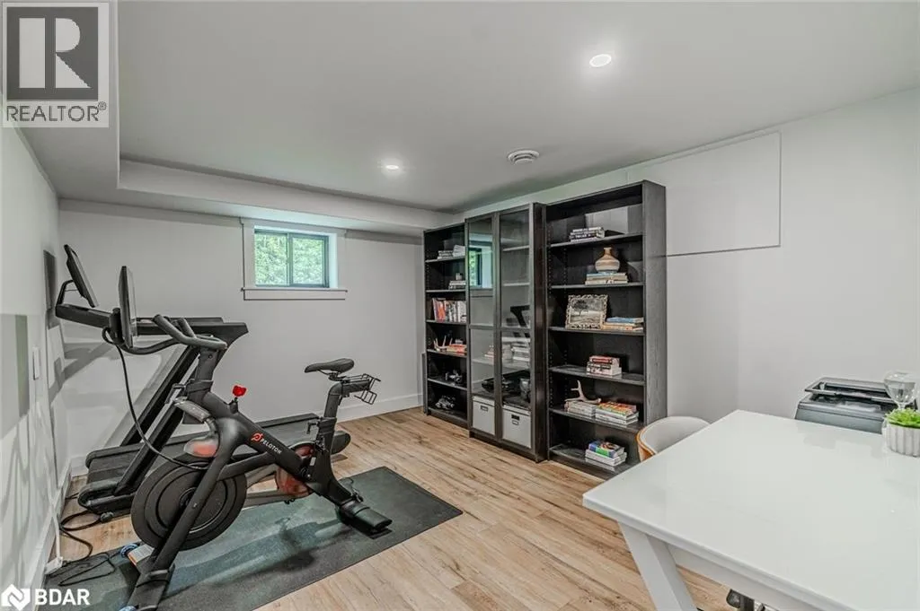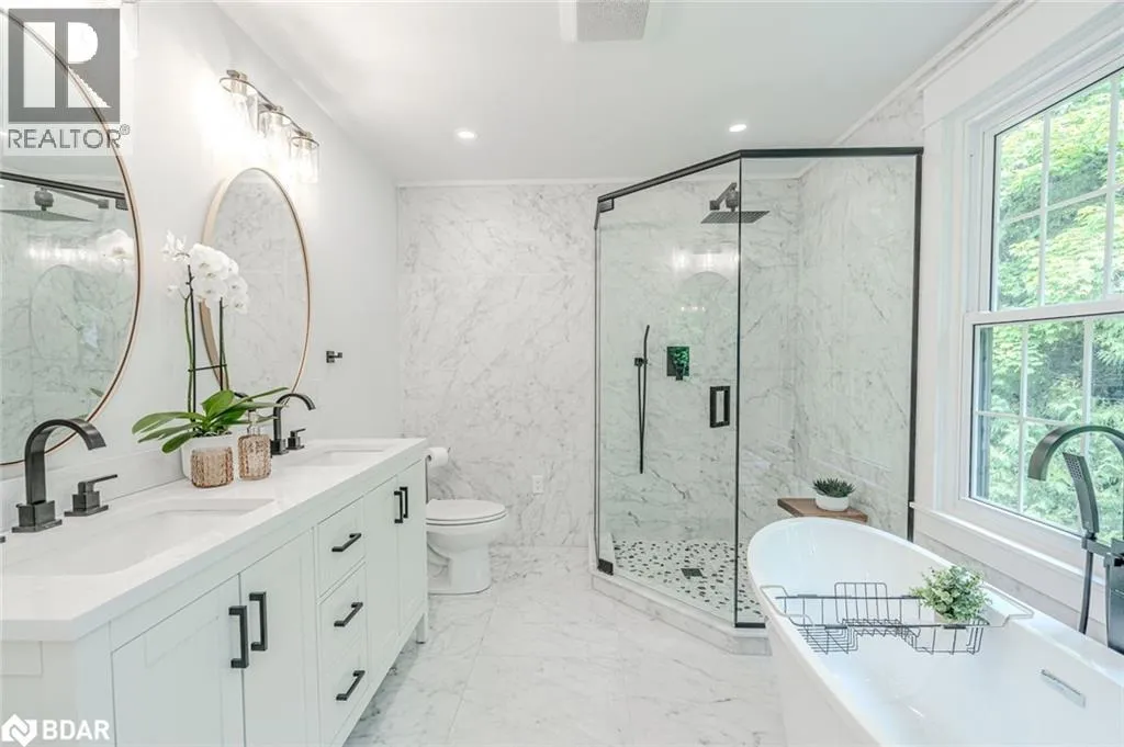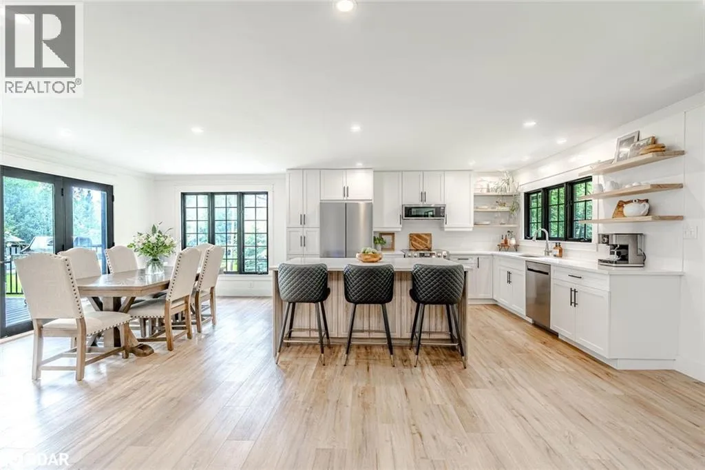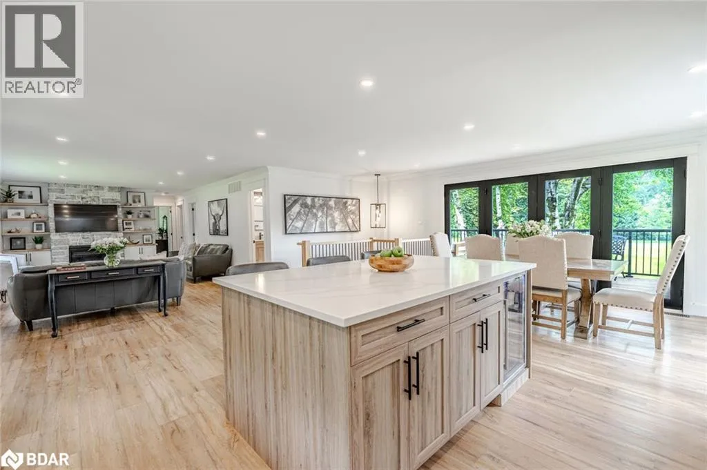 HWY 11/ Left on West Street N/Burnside Line/Thorburn Rd/Fairgrounds Rd TURNKEY BUNGALOW ON 2+ ACRES WITH HOT TUB, WALKOUT BASEMENT, DECK & DESIGNER FINISHES! Itâs easy to describe what the dream home looks like: private acreage, a backyard escape with a massive deck and hot tub, bold curb appeal that turns heads, and a fully finished bungalow with a walkout basement loaded with upscale finishes. This place delivers every single one of those boxes checked! This absolute knockout sits on over two landscaped acres just 15 minutes from Orillia, surrounded by mature trees, apple trees, lush greenery, and trilliums. Expect daily deer sightings, the occasional owl call, and jaw-dropping sunsets. The exterior makes a statement with rich wood beams, black-trimmed windows, board-and-batten-style vinyl siding, and a covered front porch. A detached 4-car garage/shop adds function with a large overhead and separate man door. Over 2,800 square feet of renovated living space showcases crown moulding, pot lights, luxury vinyl flooring, neutral tones, and elevated finishes throughout. The kitchen stuns with white cabinetry, quartz counters, open wood shelving, stainless steel appliances, and a wood-toned island with breakfast bar seating. The dining area is wrapped in black-framed windows and four-panel garden doors, two of which open wide to the deck for serious indoor-outdoor flow. The living room offers everyday comfort with a floor-to-ceiling stone propane fireplace, built-ins, and an inviting layout. The vaulted primary suite pulls out all the stops with wood beam accents, a second fireplace, a walkout, a luxurious 5-piece ensuite, and dual wardrobe systems, plus a closet. Downstairs, the walkout basement adds a bright rec room, full bath, two additional bedrooms, and a gorgeous laundry room with live-edge style counters and subway tile. The backyard is the final exclamation point with an elevated deck, hot tub, wide staircase to the lawn, mature trees, and a storage shed. Nothing overlooked. Nothing left to do. Just move in and start living! (id:27476)