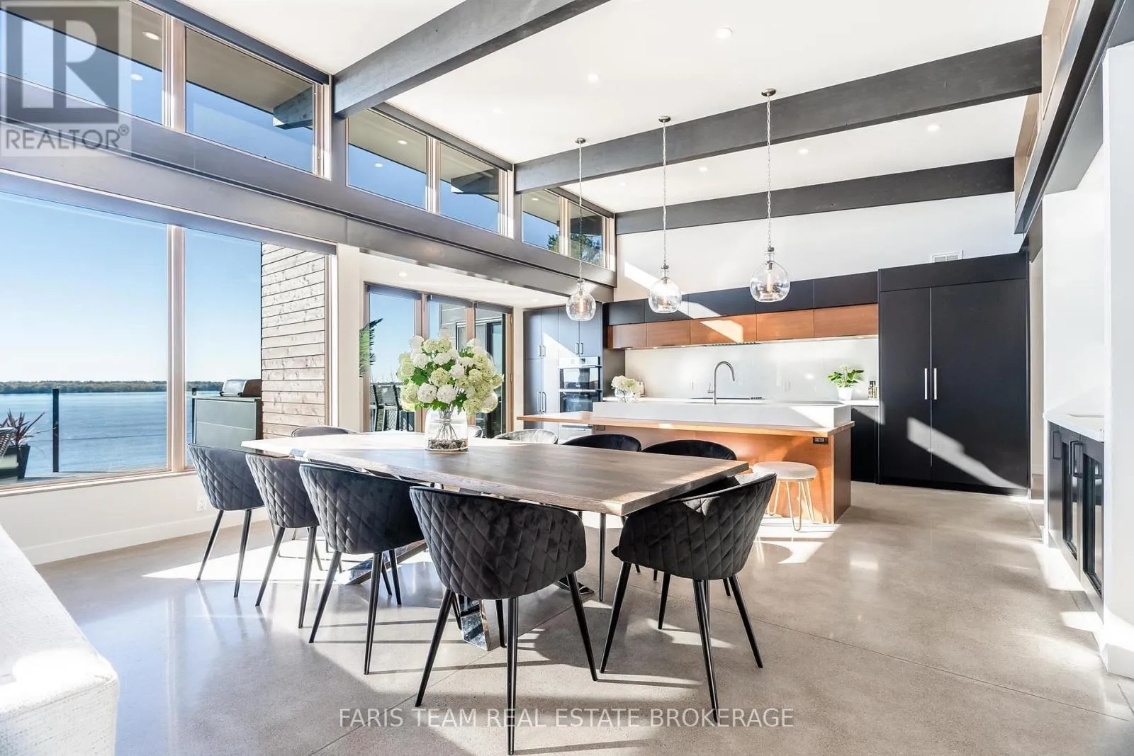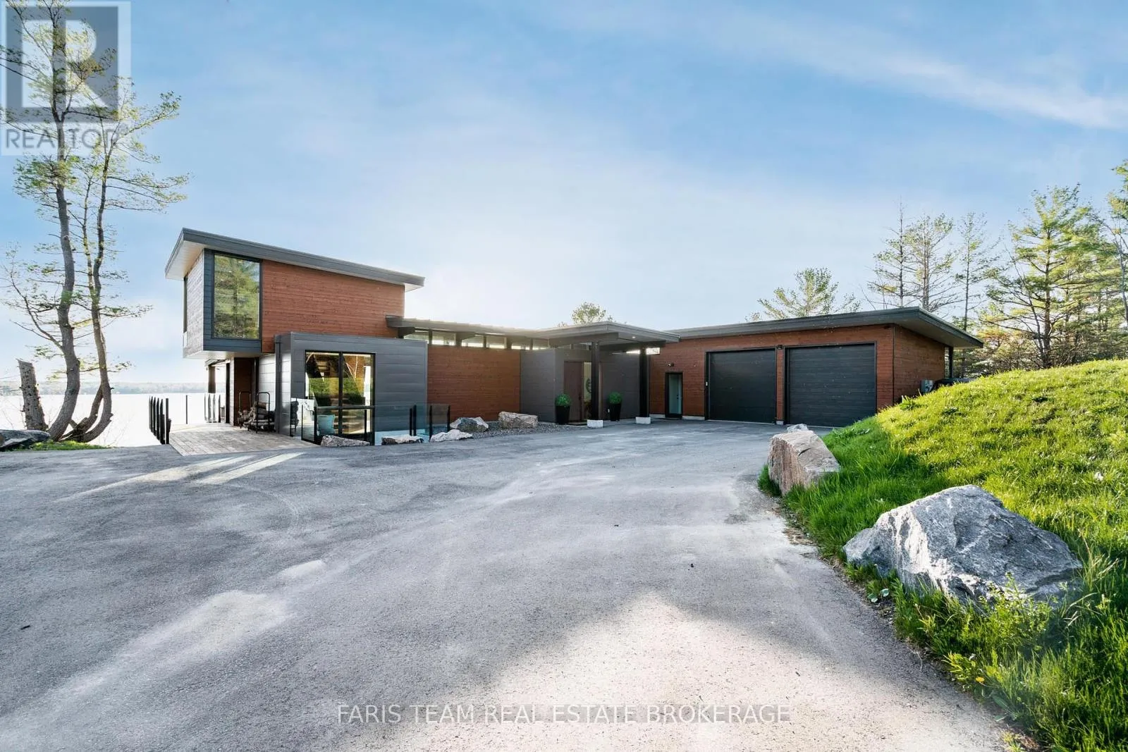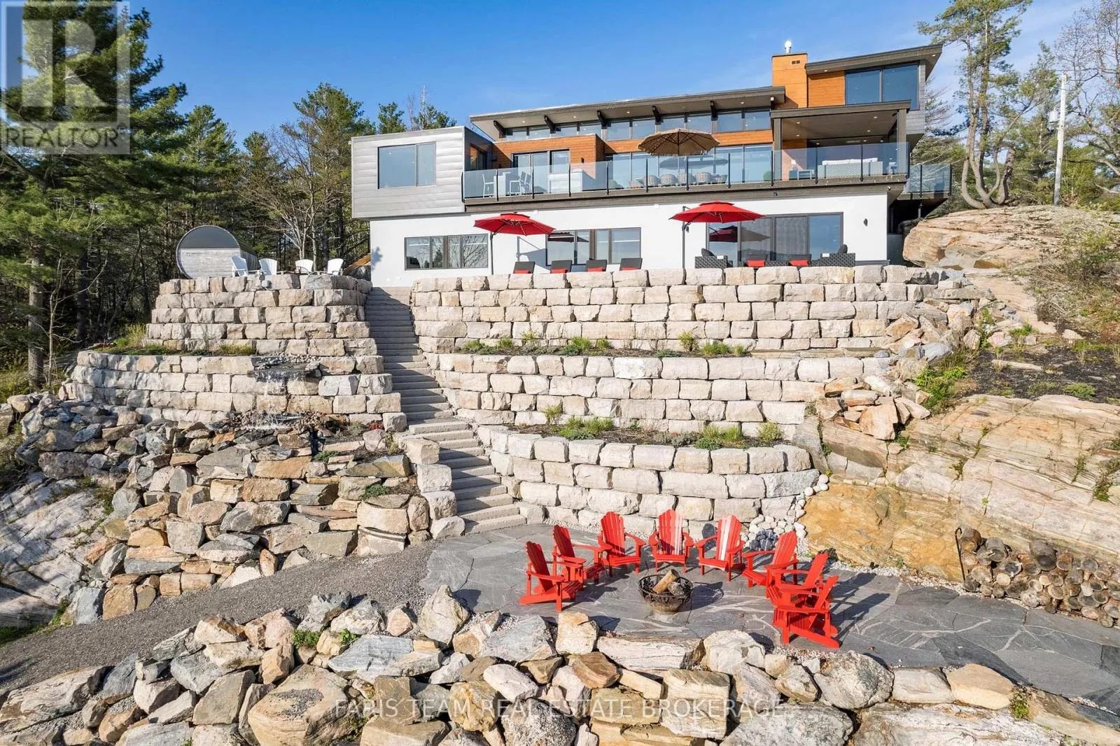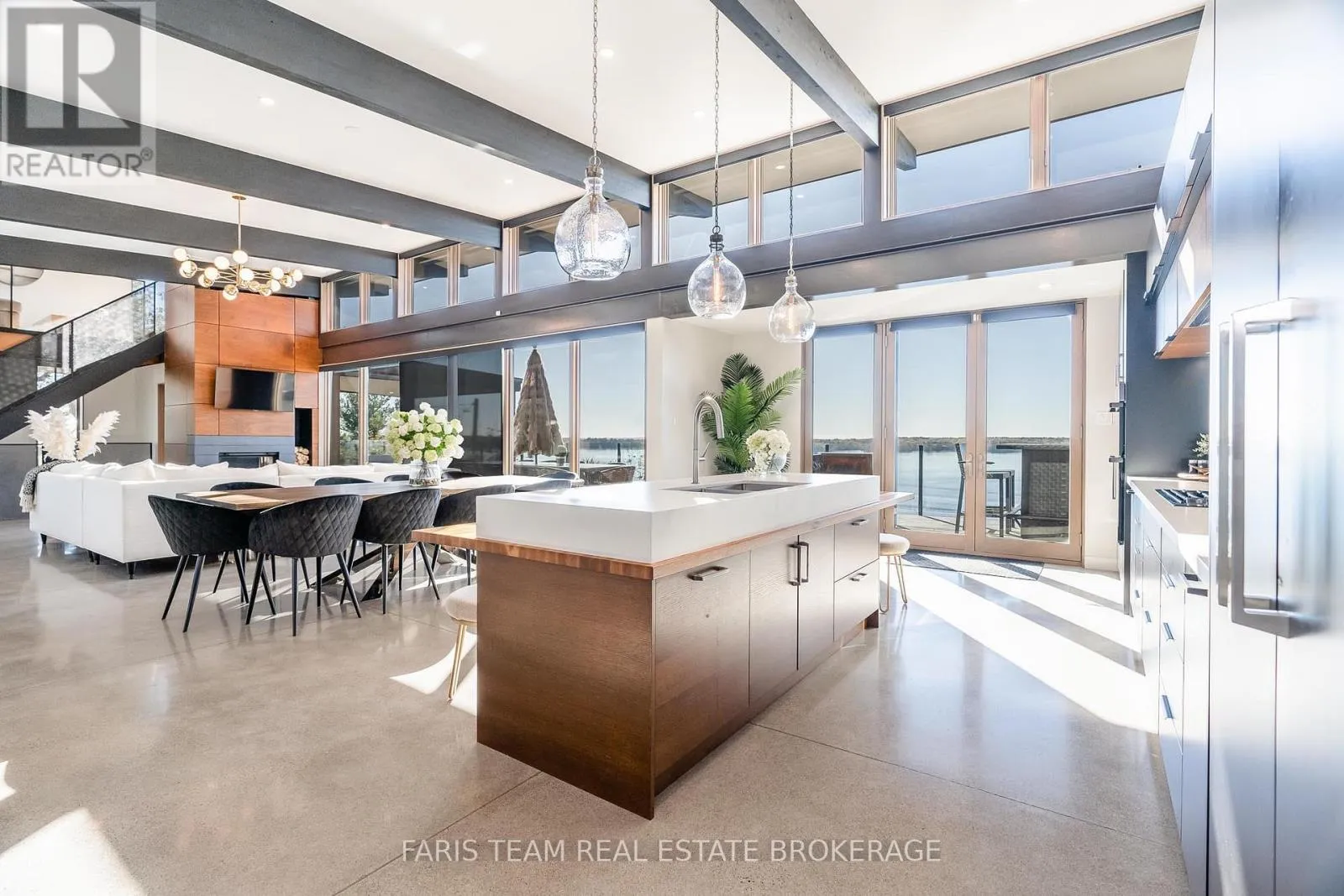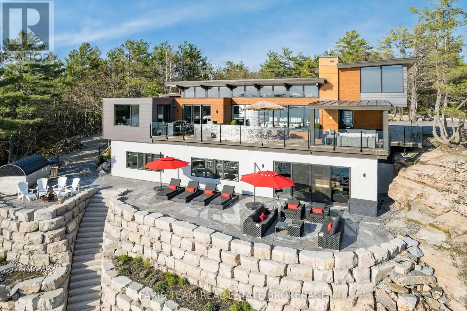 Tower Line Rd/E Shore Rd Top 5 Reasons You Will Love This Home: 1) From the striking polished concrete floors with radiant in-floor heating to the gourmet chefs kitchen and sleek high-end finishes, every inch of this home has been thoughtfully designed with contemporary comfort in mind, soak in the sweeping, unobstructed views that create the perfect backdrop for everyday living 2) With a main level primary suite for ultimate convenience, plus four additional guest bedrooms, a cozy loft, and a walkout recreation room that leads right to the waters edge, there's no shortage of room for family, friends, and creating unforgettable memories 3) Professionally landscaped to perfection, this property boasts a stunning granite patio, built-in water feature, serene sauna, and a charming screened-in Muskoka porch, with thoughtfully hardscaped stone paths guiding you through lush greenery and peaceful gathering spots 4) Set on a highly sought-after lot with an impressive 180' of pristine Gloucester Pool frontage, enjoy a sandy beach area, a private dock, and a two-slip boathouse, ideal for boating enthusiasts, while the heated, insulated, and waterproofed garage is a standout, professionally finished by Garage Living with custom shelving and durable PVC paneling 5) With true LTE high-speed internet and access via a private, four-season road, this home spans 4,037 finished square feet and presents the ultimate four-season escape or full-time luxury residence. 4,037 above grade sq.ft. (id:27476)