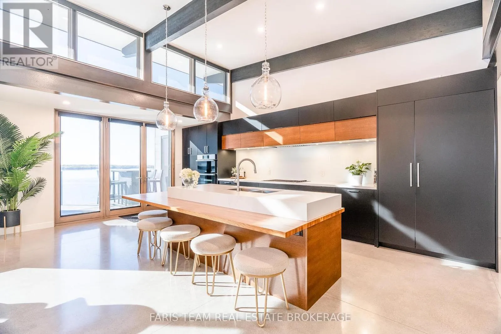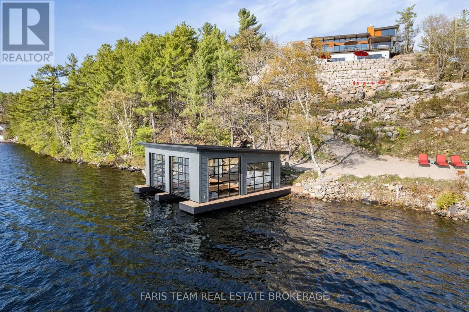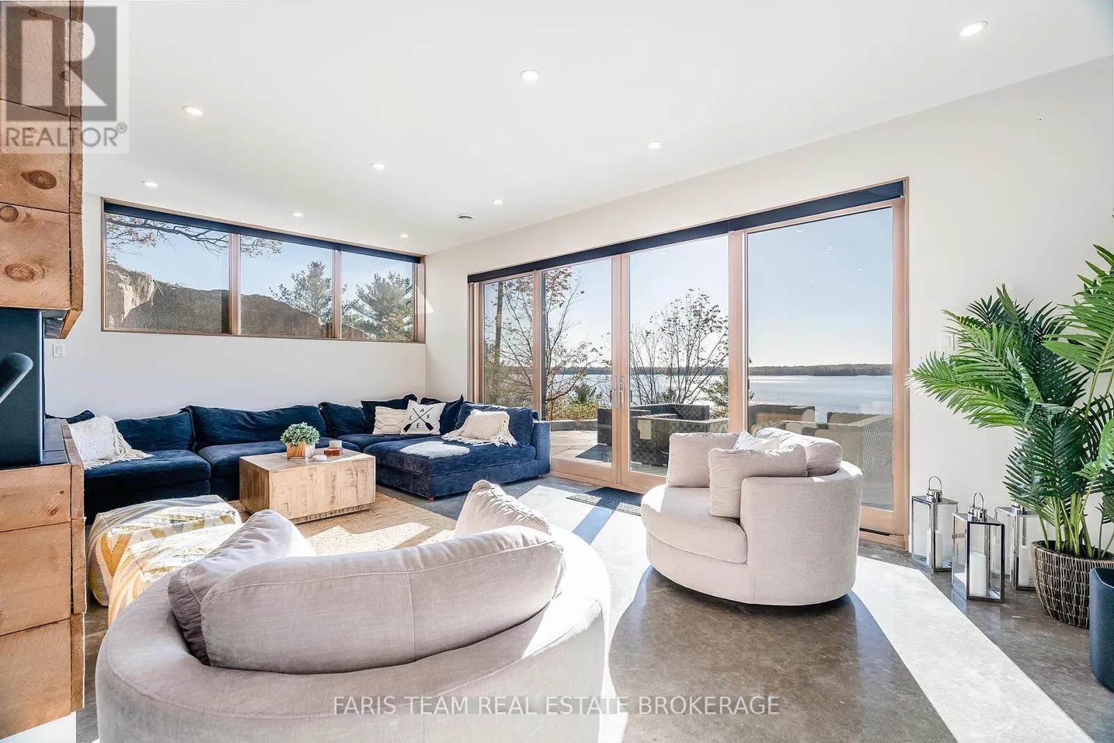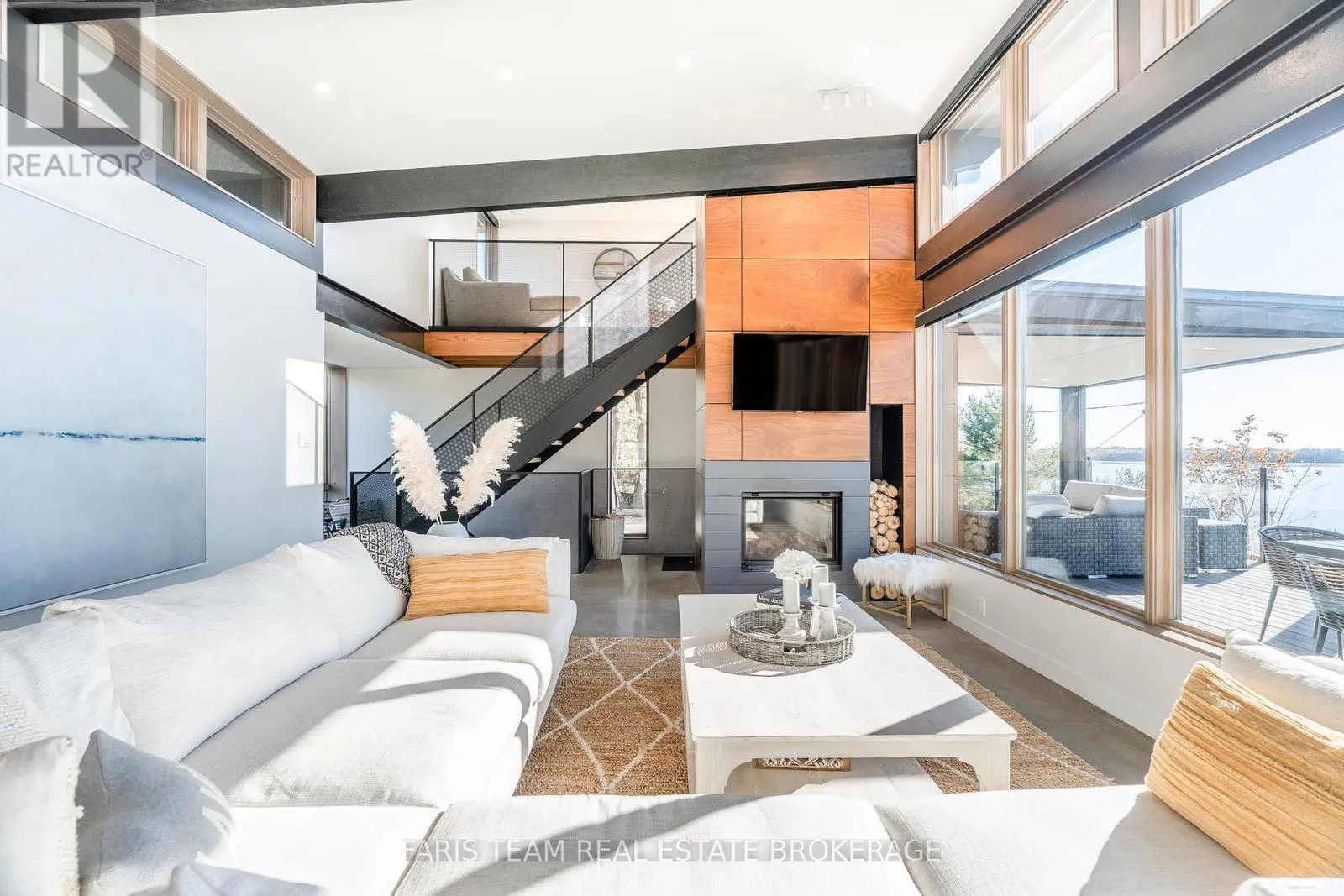 Tower Line Rd/E Shore Rd Top 5 Reasons You Will Love This Home: 1) From the striking polished concrete floors with radiant in-floor heating to the gourmet chefs kitchen and sleek high-end finishes, every inch of this home has been thoughtfully designed with contemporary comfort in mind, soak in the sweeping, unobstructed views that create the perfect backdrop for everyday living 2) With a main level primary suite for ultimate convenience, plus four additional guest bedrooms, a cozy loft, and a walkout recreation room that leads right to the waters edge, there's no shortage of room for family, friends, and creating unforgettable memories 3) Professionally landscaped to perfection, this property boasts a stunning granite patio, built-in water feature, serene sauna, and a charming screened-in Muskoka porch, with thoughtfully hardscaped stone paths guiding you through lush greenery and peaceful gathering spots 4) Set on a highly sought-after lot with an impressive 180' of pristine Gloucester Pool frontage, enjoy a sandy beach area, a private dock, and a two-slip boathouse, ideal for boating enthusiasts, while the heated, insulated, and waterproofed garage is a standout, professionally finished by Garage Living with custom shelving and durable PVC paneling 5) With true LTE high-speed internet and access via a private, four-season road, this home spans 4,037 finished square feet and presents the ultimate four-season escape or full-time luxury residence. 4,037 above grade sq.ft. (id:27476)