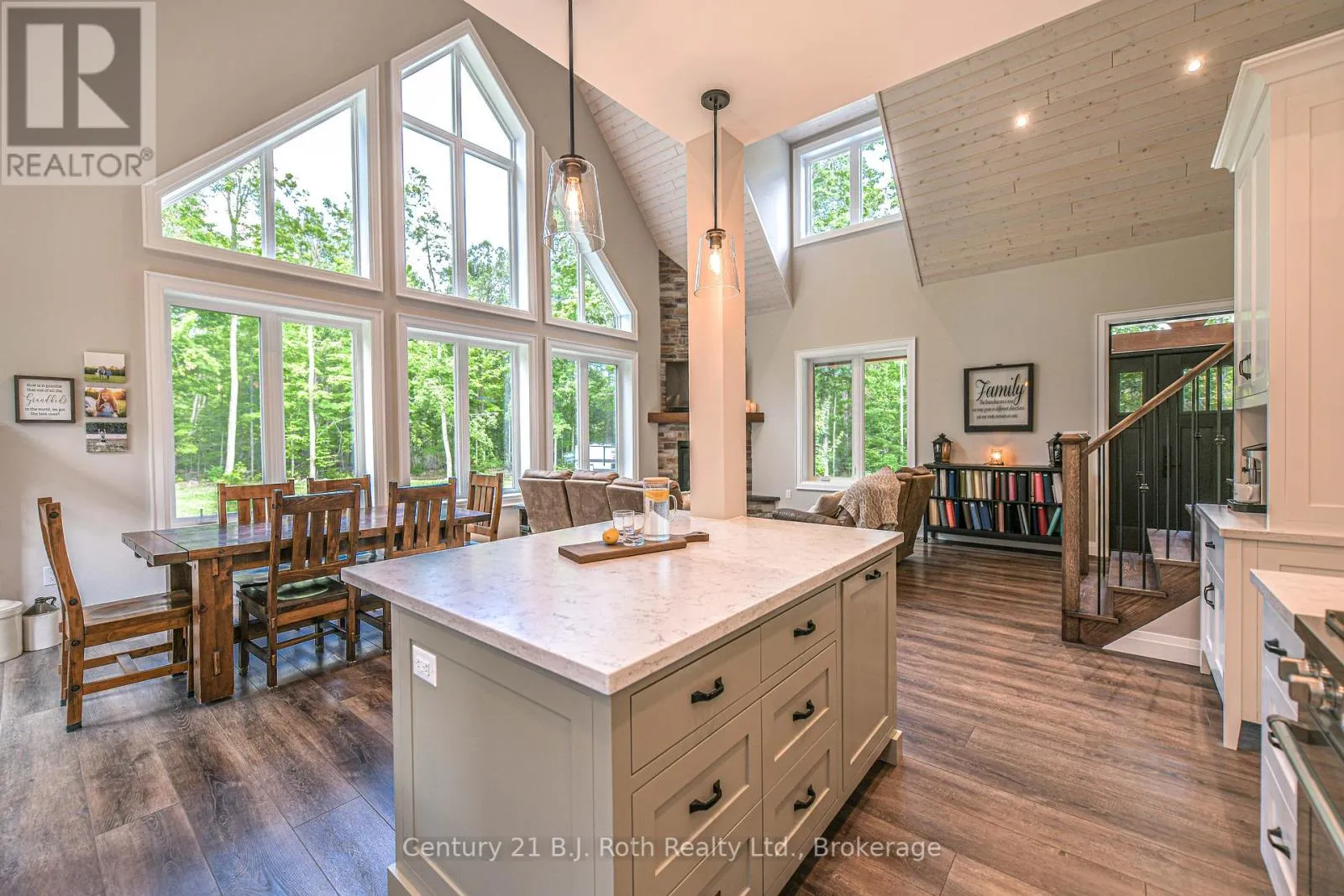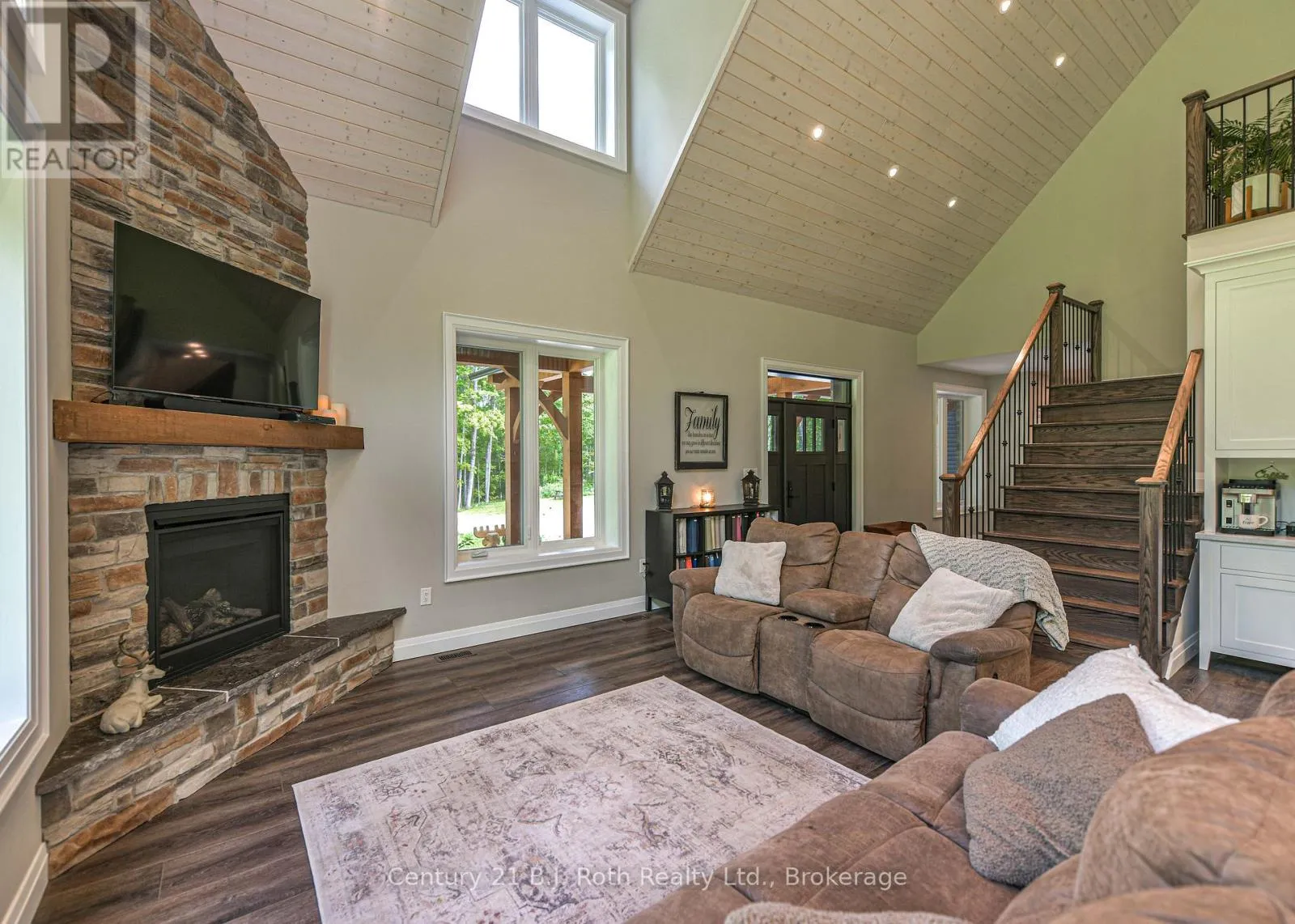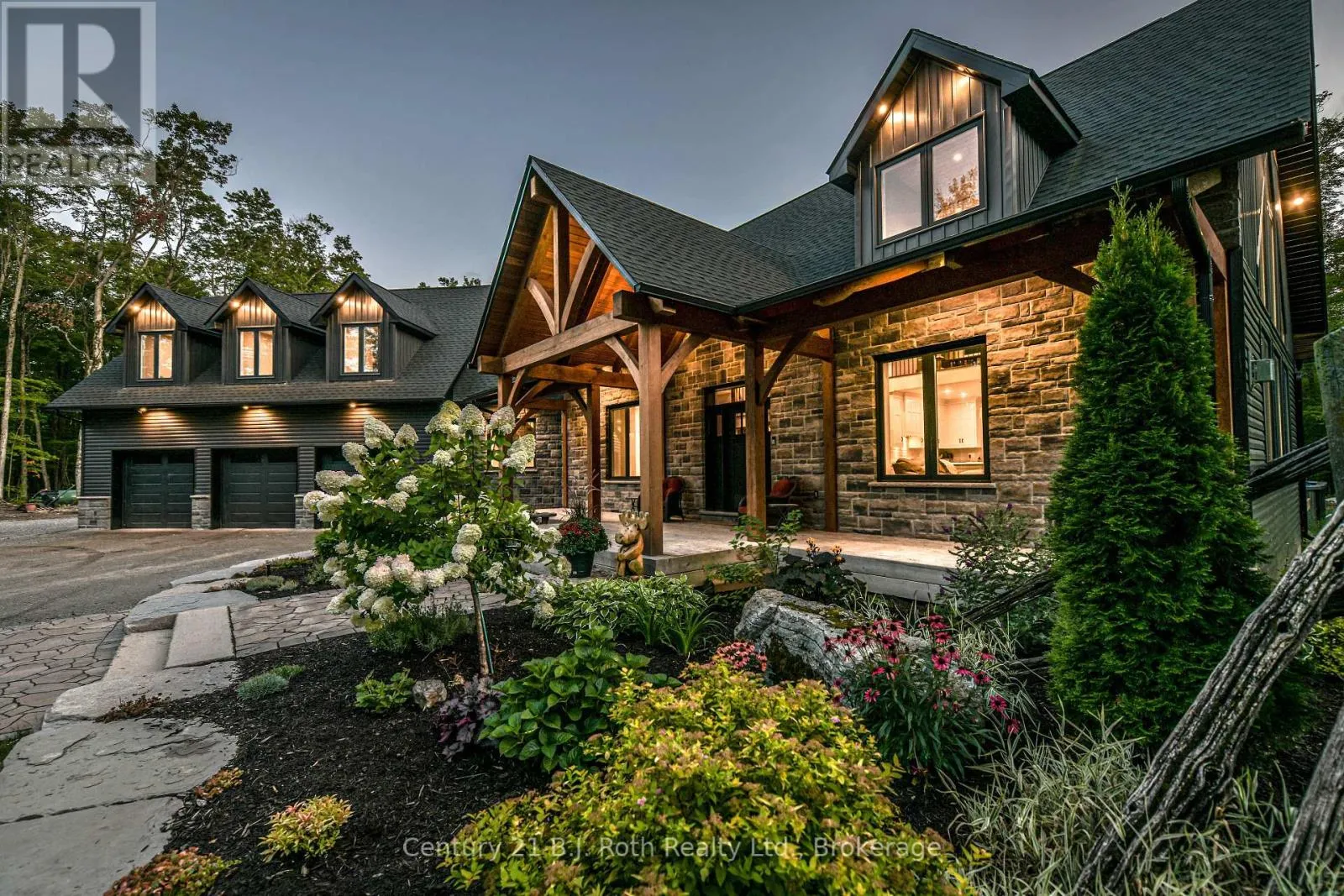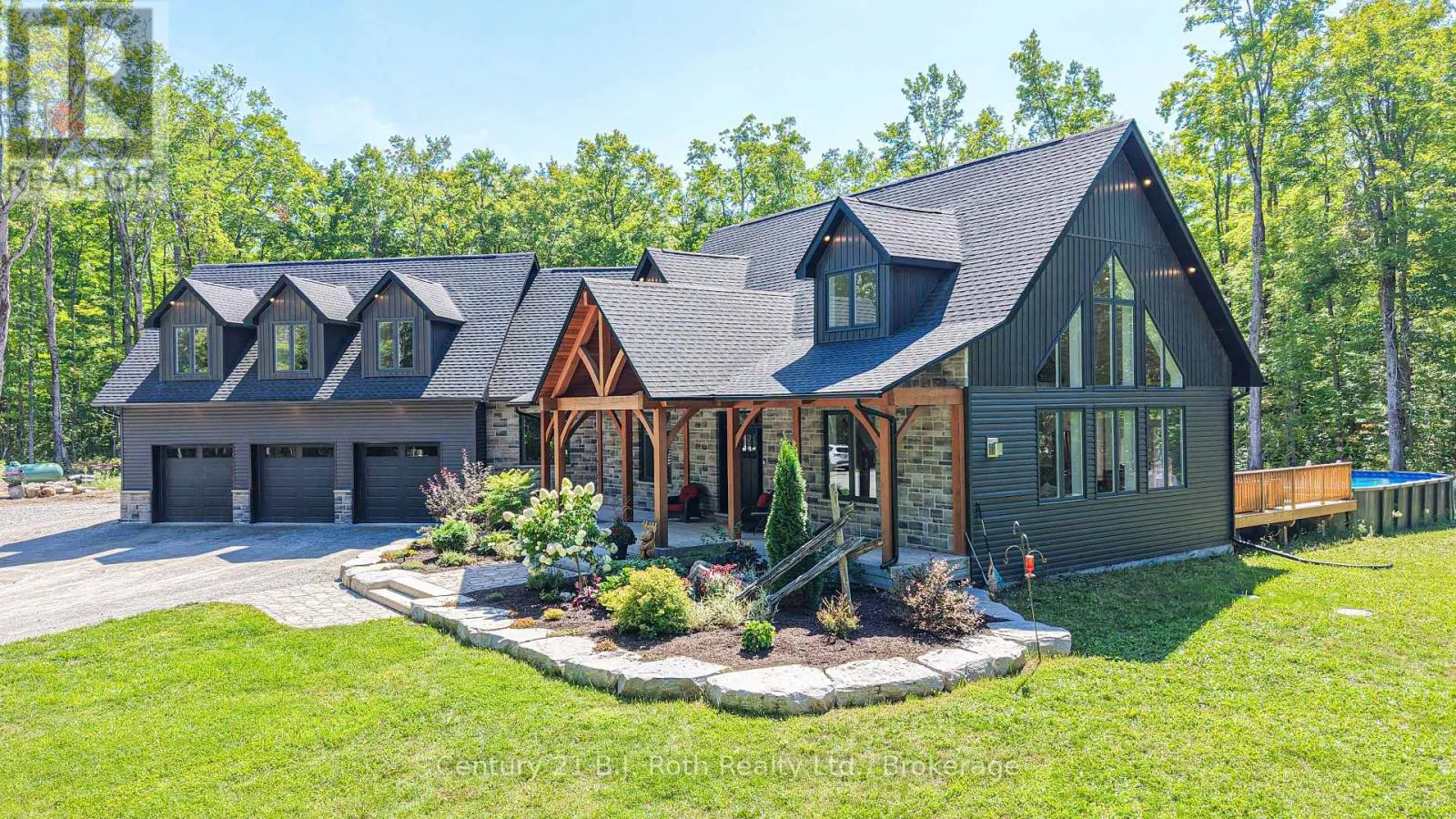 Cross Streets: Fairgrounds Road/Warminster Sideroad. ** Directions: FAIRGROUNDS ROAD BETWEEN WARMINSTER SR & THORBURN. One-of-a-kind modern Craftsman, nestled among the trees, offering ultimate privacy on a 50-acre property. Welcoming covered entry w/rich stonework & Douglas Fir Timber frame accents sets the tone for the exceptional living space within. Step inside to the Great rm. w/natural light, soaring ceilings & open-concept layout, perfect for both family life & entertaining. Custom solid maple Kitchen cabinetry w/Quartz countertops & centre island. The kitchen flows seamlessly into the dining area & great room, complete w/a cozy fireplace & expansive windows overlooking the surrounding forest. Walkout to deck & above-ground pool with 54" walls. Main floor Primary suite w/walkout, Ensuite w/heated floors, soaker tub, sep. tile shower, & quartz-topped vanity plus Walk-in closet. Main flr. 2pc powder rm, laundry, & a spacious mudroom w/walkout to a covered Douglas Fir and Cedar deck, plus direct access to the garage. Upstairs in the main part of the home, you'll find 2 additional Bdrms., a 4 pc. bath, dormer-lit living spaces, & a versatile loft area, ideal for a home office or studio. Above the garage, a second upper living space provides a large family room, perfect for gatherings. ICF-constructed 3-car garage offers ample parking & storage w/9 x 8 doors, side-mount openers w/deadbolt locks. While roughed in for in-floor heating, the incoming heat line from the outdoor wood furnace keeps the garage warm during the winter months. The garage also includes a man door to the side yard & direct access to both the main floor & basement of the home. Whether relaxing on the front porch or covered back deck, hosting gatherings, exploring the trails, or simply enjoying the quiet surroundings, this property delivers the perfect balance of elegance, comfort, and rustic charm in a serene country retreat. 200-amp service, LED pot lights, 22KW Generac whole-home generator. Upgraded BIBS insulation. Outdoor wood furnace, plus propane forced-air heating & central air. (id:27476)