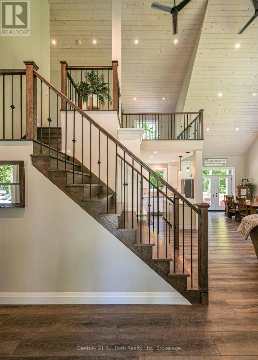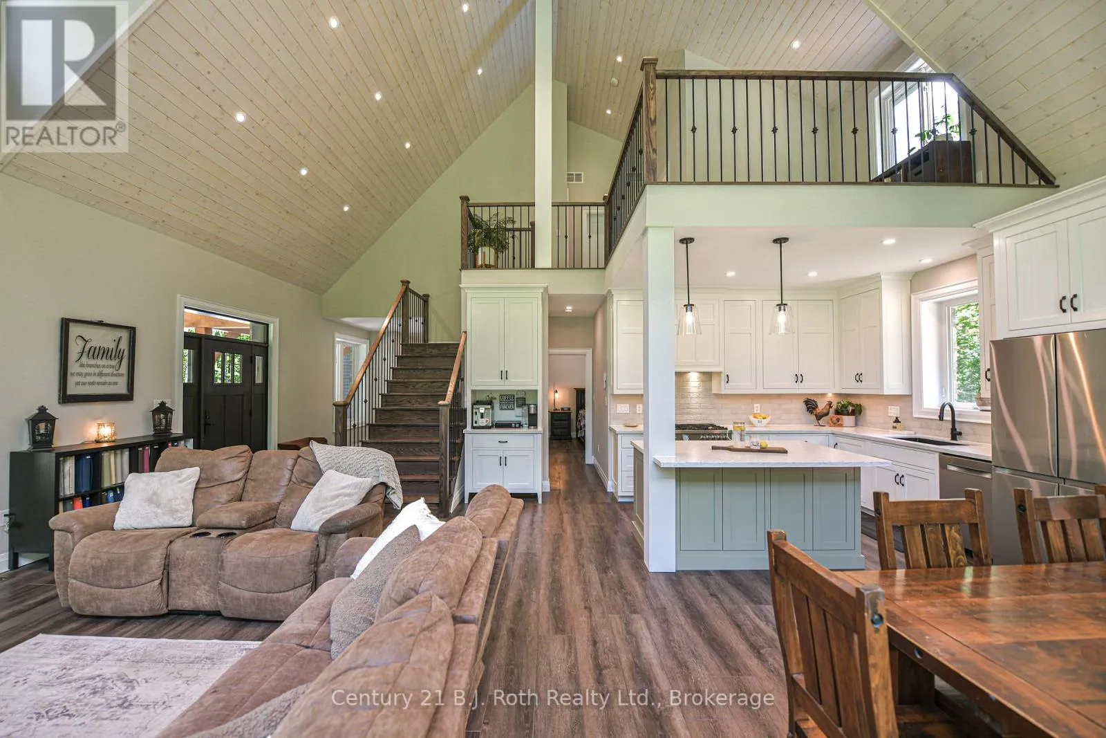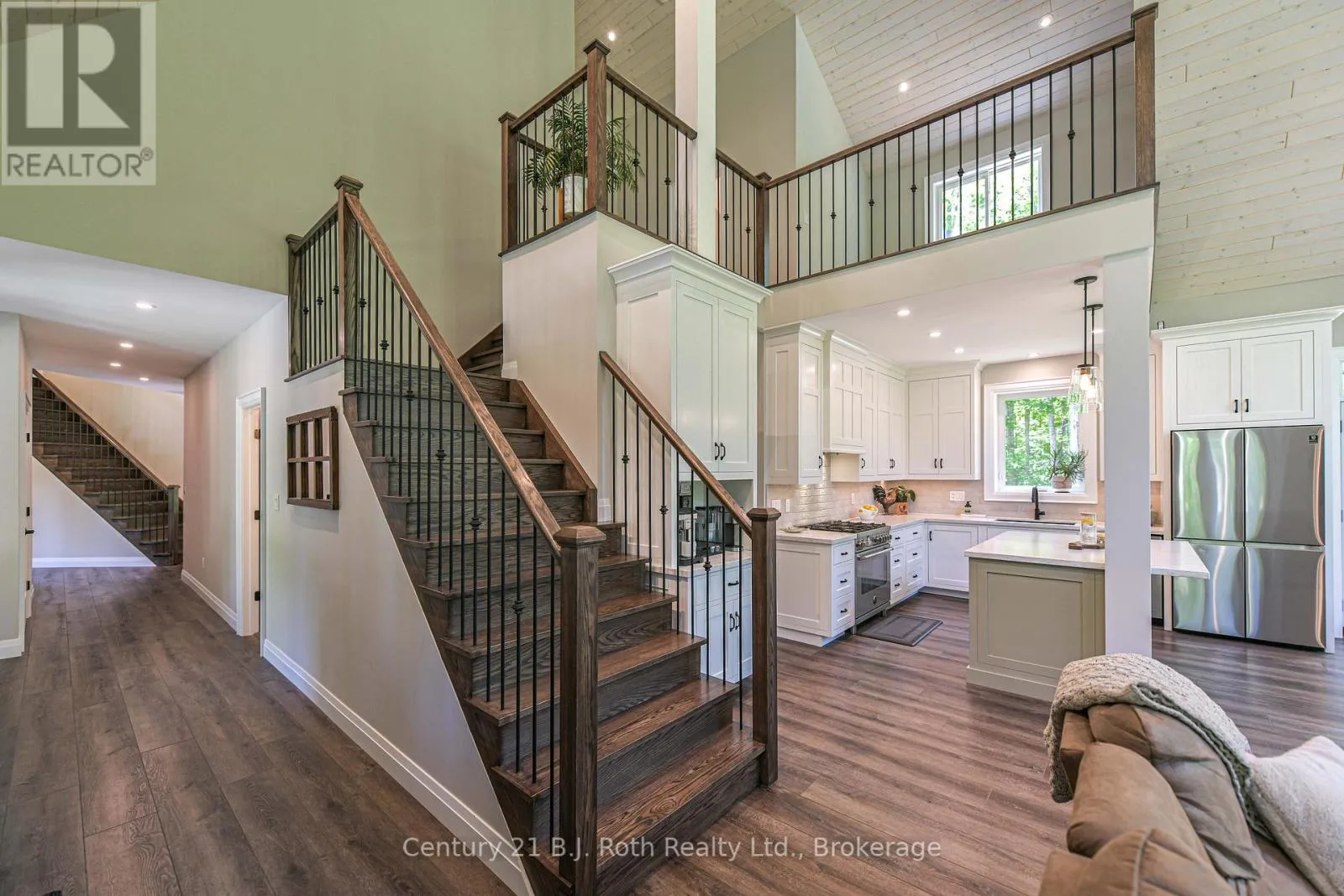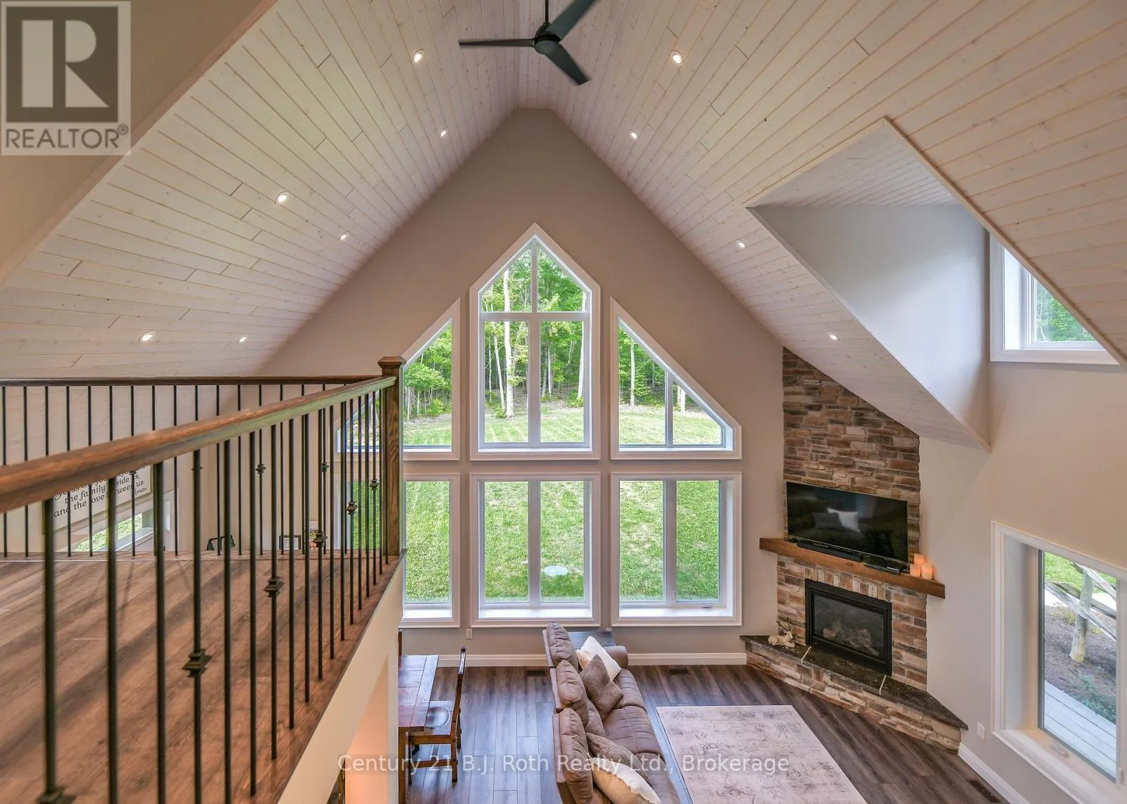 Cross Streets: Fairgrounds Road/Warminster Sideroad. ** Directions: FAIRGROUNDS ROAD BETWEEN WARMINSTER SR & THORBURN. One-of-a-kind modern Craftsman, nestled among the trees, offering ultimate privacy on a 50-acre property. Welcoming covered entry w/rich stonework & Douglas Fir Timber frame accents sets the tone for the exceptional living space within. Step inside to the Great rm. w/natural light, soaring ceilings & open-concept layout, perfect for both family life & entertaining. Custom solid maple Kitchen cabinetry w/Quartz countertops & centre island. The kitchen flows seamlessly into the dining area & great room, complete w/a cozy fireplace & expansive windows overlooking the surrounding forest. Walkout to deck & above-ground pool with 54" walls. Main floor Primary suite w/walkout, Ensuite w/heated floors, soaker tub, sep. tile shower, & quartz-topped vanity plus Walk-in closet. Main flr. 2pc powder rm, laundry, & a spacious mudroom w/walkout to a covered Douglas Fir and Cedar deck, plus direct access to the garage. Upstairs in the main part of the home, you'll find 2 additional Bdrms., a 4 pc. bath, dormer-lit living spaces, & a versatile loft area, ideal for a home office or studio. Above the garage, a second upper living space provides a large family room, perfect for gatherings. ICF-constructed 3-car garage offers ample parking & storage w/9 x 8 doors, side-mount openers w/deadbolt locks. While roughed in for in-floor heating, the incoming heat line from the outdoor wood furnace keeps the garage warm during the winter months. The garage also includes a man door to the side yard & direct access to both the main floor & basement of the home. Whether relaxing on the front porch or covered back deck, hosting gatherings, exploring the trails, or simply enjoying the quiet surroundings, this property delivers the perfect balance of elegance, comfort, and rustic charm in a serene country retreat. 200-amp service, LED pot lights, 22KW Generac whole-home generator. Upgraded BIBS insulation. Outdoor wood furnace, plus propane forced-air heating & central air. (id:27476)