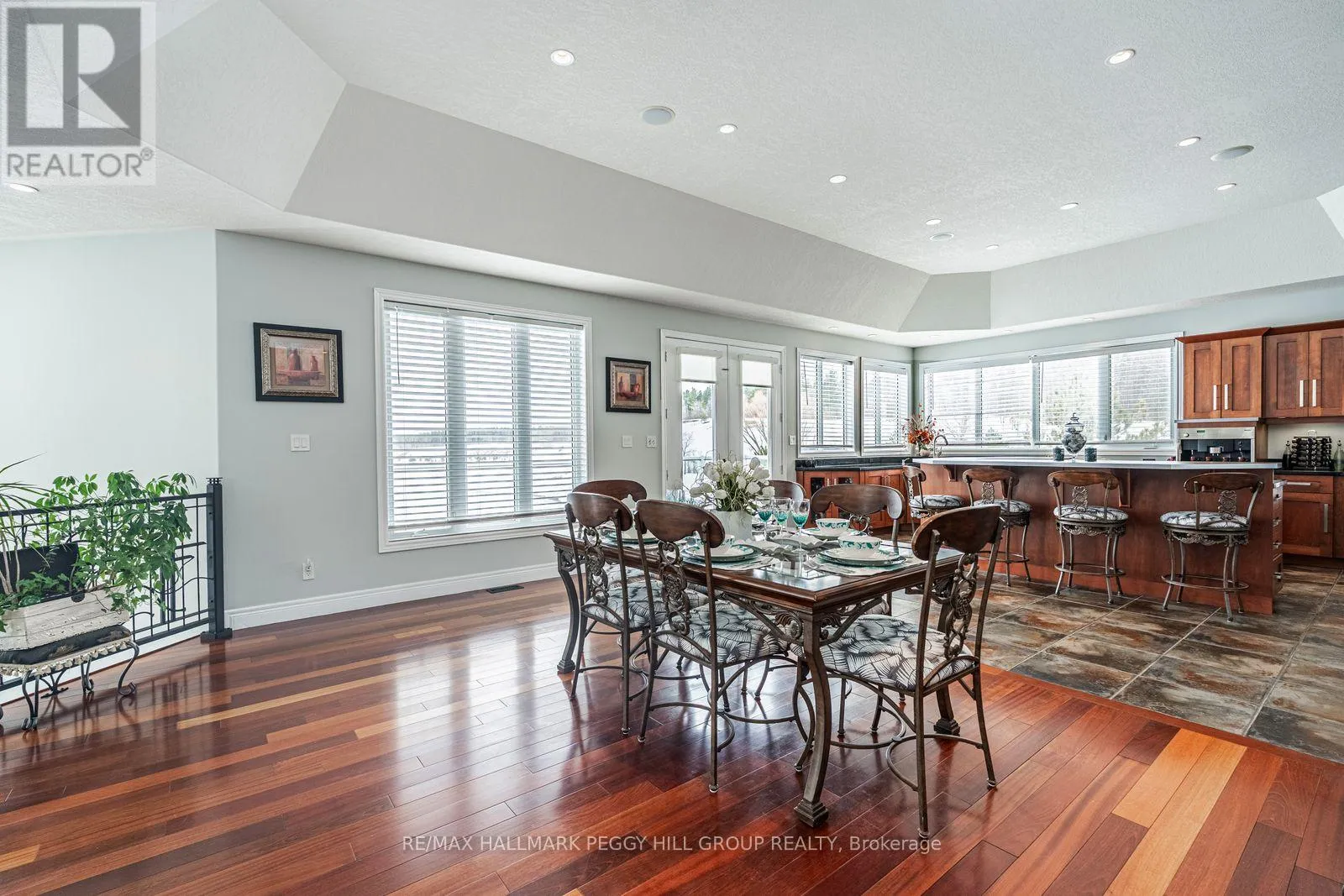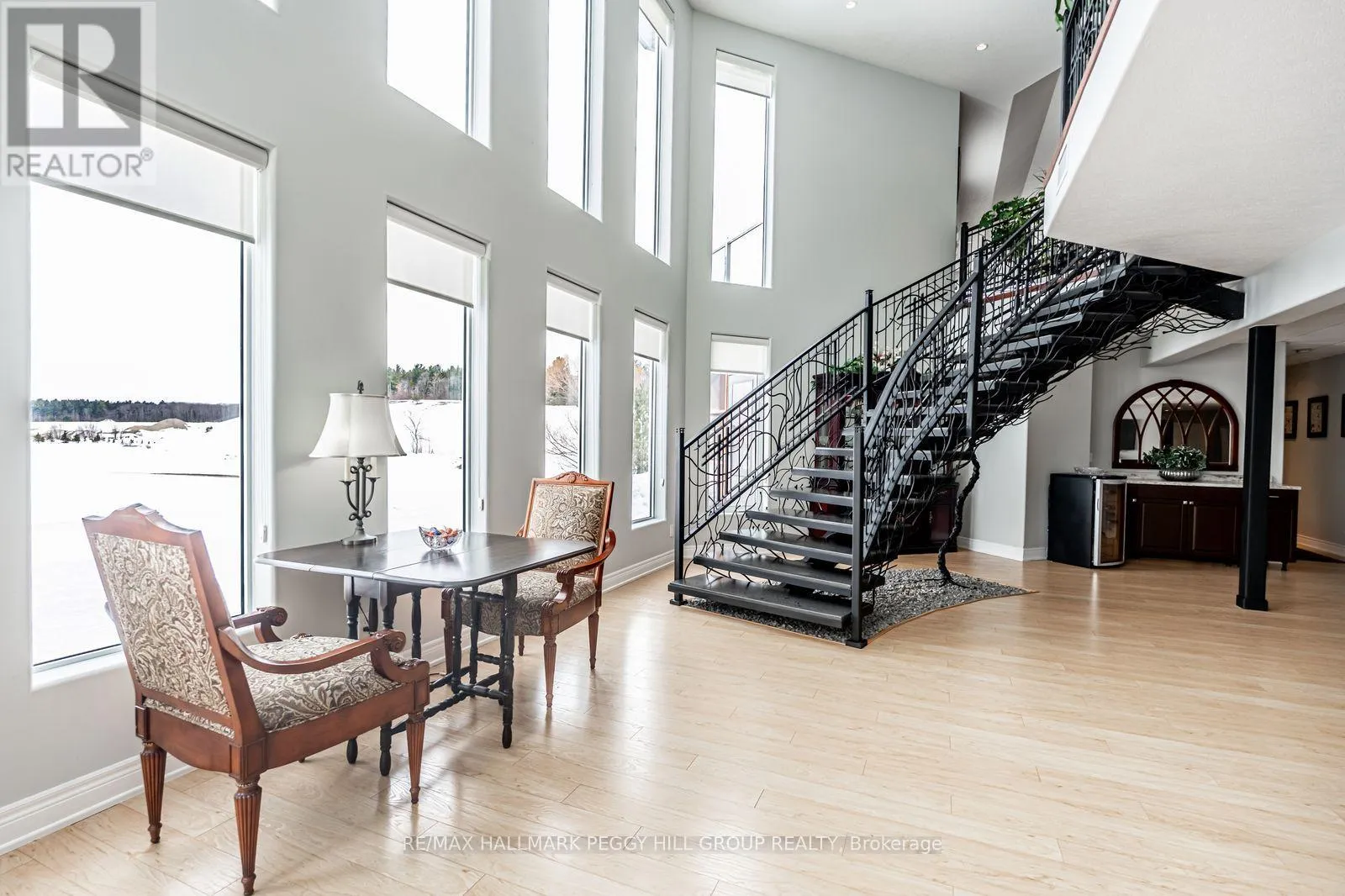 Cross Streets: Carlyon Line/Division Rd E. ** Directions: ON-11/Burnside Line/Division Rd E. INDULGE IN LUXURY ON 2.1 ACRES WITH BREATHTAKING VIEWS, SHARED OWNERSHIP OF AN ADDITIONAL 32 ACRES, & A MAN-MADE LAKE!! Enter a realm of unrivalled elegance and awe-inspiring beauty! This jaw-dropping executive bungalow, set on 2.1 private acres, offers an extraordinary lifestyle with shared ownership of a human-made lake and 32 surrounding acres. The lake is perfect for swimming, stand-up paddleboarding, kayaking, winter hockey, or skating while stocked with smallmouth bass. Just moments from Simcoe County Forest trails, snowmobile trails, skiing, and outdoor adventures are at your doorstep. The curb appeal is simply unmatched, from the striking stone and board-and-batten exterior to the lofty peaked rooflines. Inside, nearly 4,600 finished square feet of open-concept living space showcases expansive lake views through large windows, highlighted by exquisite Brazilian cherry flooring and elegant tray ceilings with pot lights. The heart of this home is the high-end chef's kitchen, with granite countertops, top-tier appliances, an abundance of cabinetry, and a large island with seating. The spacious primary bedroom features a private deck, a walk-in closet, and a luxurious 5-piece ensuite. The custom, one-of-a-kind wrought-iron staircase gracefully leads to the walkout basement, where you'll find radiant heated floors, a spacious rec room with a bar area, three bedrooms, an indoor spa/hot tub room, and a full bathroom. Step into the 3-season Muskoka room for the ultimate in relaxation and entertaining. A triple car insulated and heated garage with high ceilings, a circular driveway with ample parking, and significant updates like newer shingles, A/C, and a boiler hot water tank for radiant heat make this a truly exceptional property. Live the life you've always dreamed of in a home that has it all! (id:27476)
