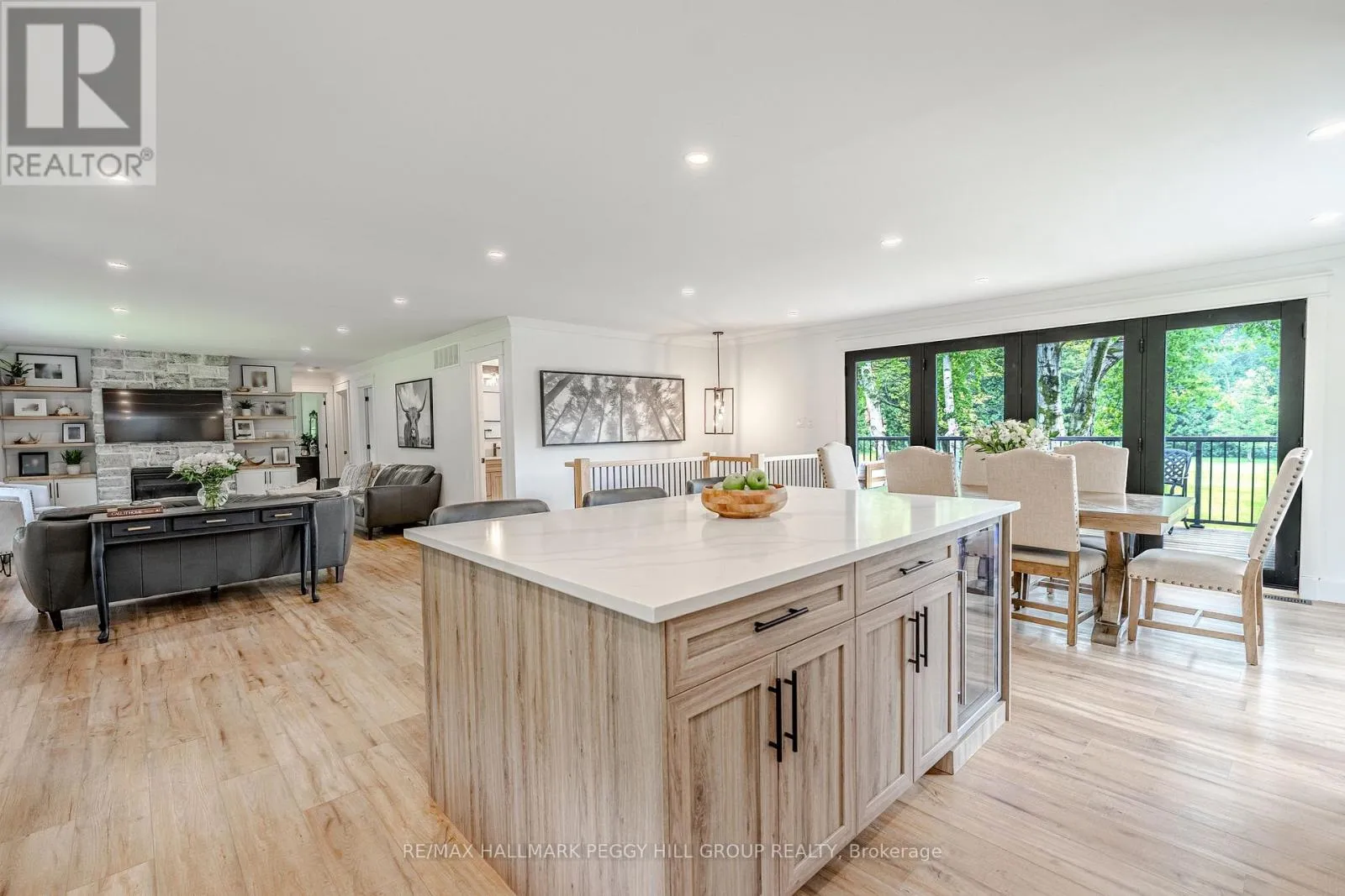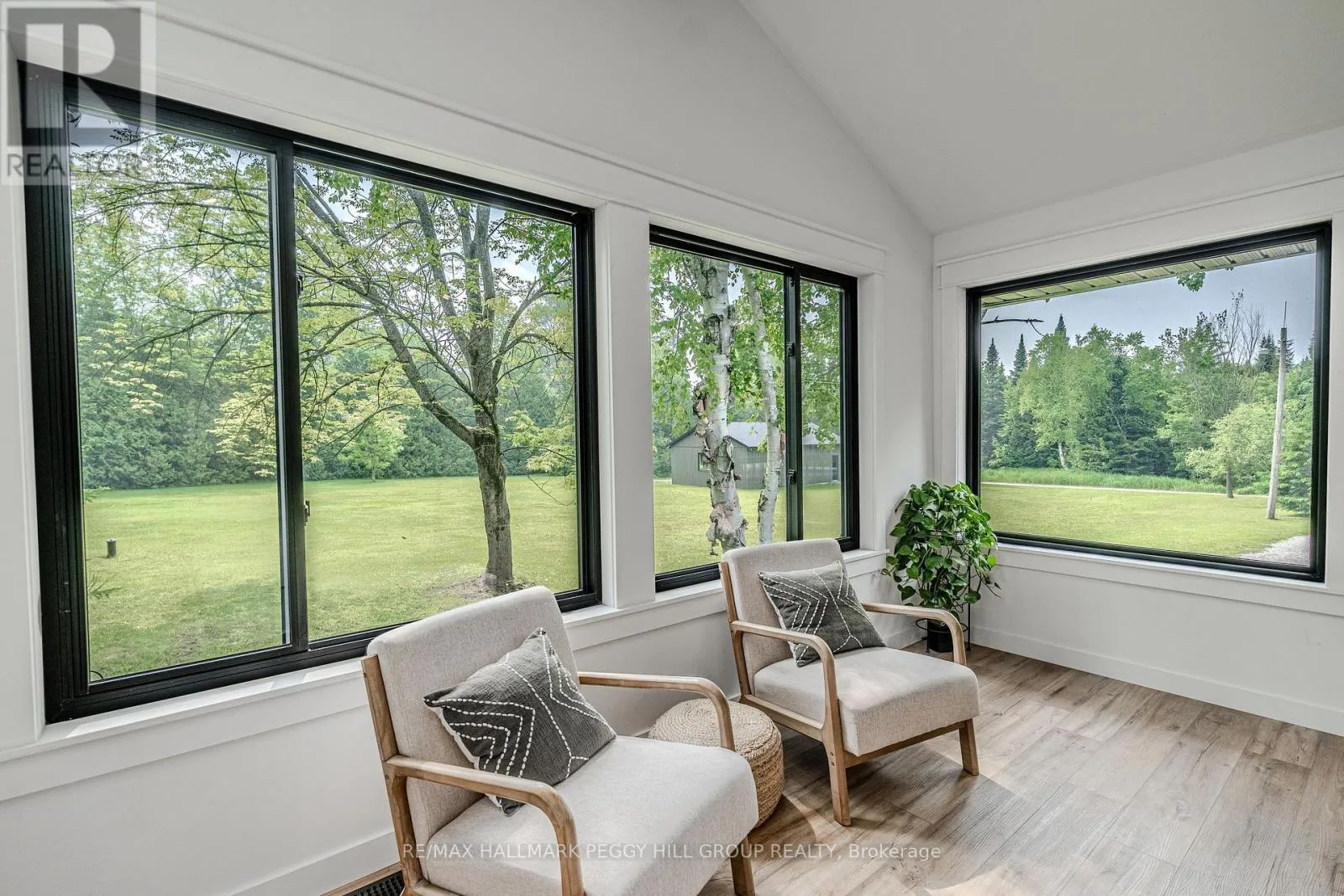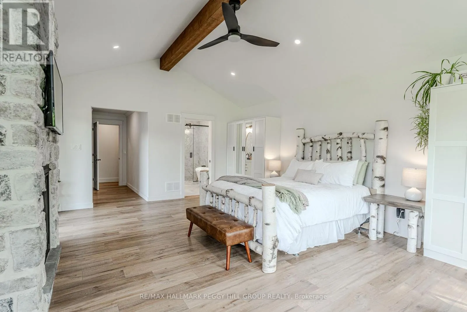 Cross Streets: Thorburn Rd/Fairgrounds Rd. ** Directions: HWY 11/ Left on West Street N/Burnside Line/Thorburn Rd/Fairgrounds Rd. SECLUDED COUNTRY BUNGALOW ON OVER 2 ACRES WITH UPSCALE FINISHES, HOT TUB, 4-CAR GARAGE & MOVE-IN-READY LUXURY! Think of the country home you keep saving in your Pinterest inspiration folder, a bungalow on over 2 acres of private countryside with a turnkey interior of designer finishes and a backyard made for entertaining and unwinding with tree-lined views. Arrive along a long private drive to striking curb appeal, where rich wood beams and black-trimmed windows frame a covered front porch set against board-and-batten style vinyl siding, with a detached 4-car garage or shop echoing the same modern look for vehicles or hobby space. Extensively renovated, the open concept layout offers over 2,800 finished sq ft with luxury vinyl flooring, pot lights, crown moulding, and soft neutral paint tones. The kitchen offers white cabinetry, quartz countertops, open wood shelving, stainless steel appliances, and a wood-toned island with breakfast bar seating that flows into a bright dining area framed by four-panel garden doors opening to the elevated back deck. The living room centres around a propane fireplace in a floor-to-ceiling stone surround with built-in cabinetry and open shelving. The vaulted primary bedroom stands out with a wood beam accented by pot lights, its own fireplace in a stone surround, generous windows, a luxurious ensuite, and excellent storage, including two built-in wardrobe systems, plus a private walkout that places the hot tub only steps away. The finished walkout basement extends the living space with a recreation room, full bathroom, two additional bedrooms, and a laundry room finished with live-edge style counters and a subway tile backsplash. Packed with high-end upgrades, a stylish turnkey interior, an oversized garage, and real acreage privacy, this is the kind of country #HomeToStay that leaves you wondering what more you could want. (id:27476)