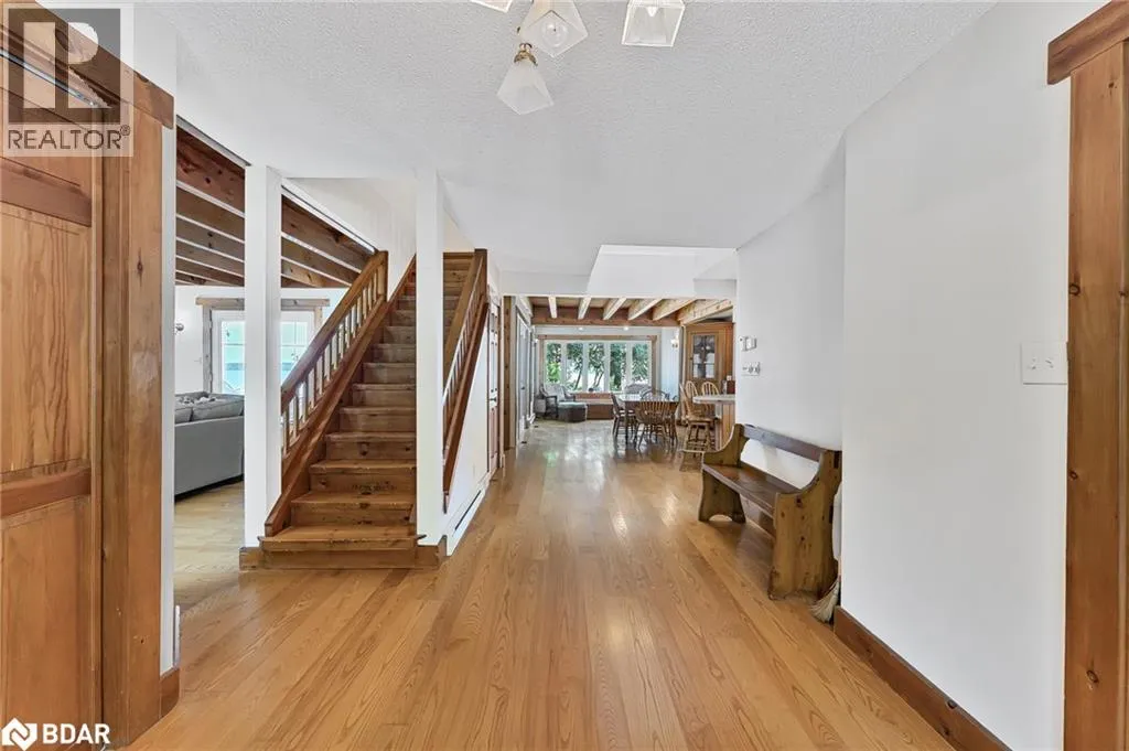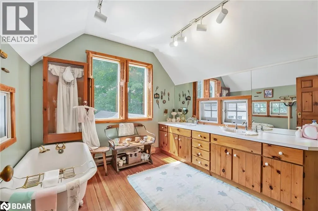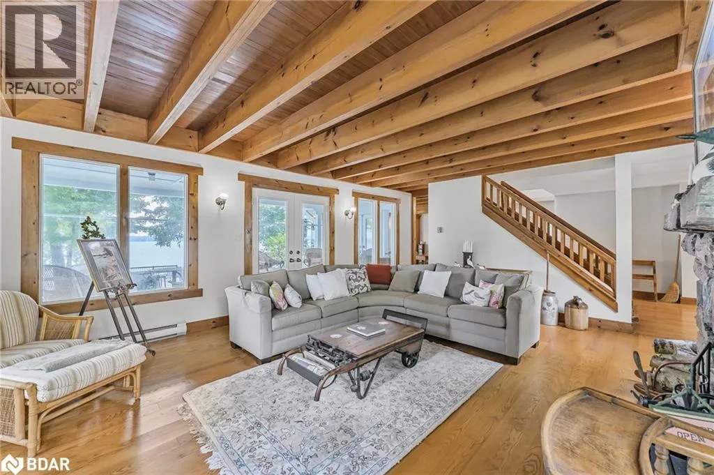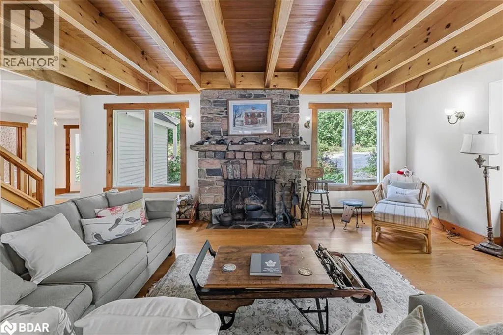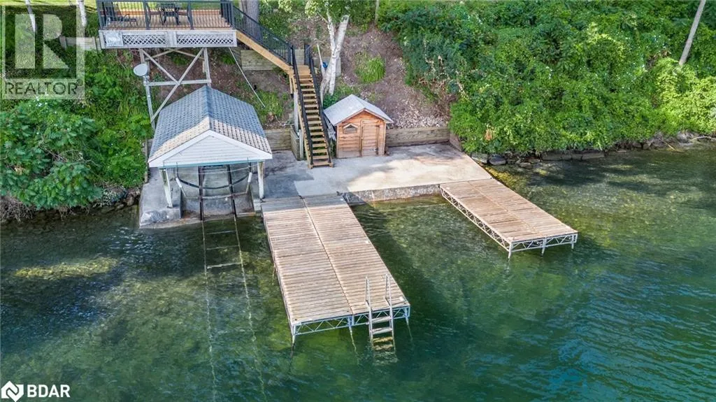 Highway 11 North or Ridge Road to Right on Line 2 South to Bay Street A rare opportunity to own a true waterfront retreat in the heart of Shanty Bay. Set on a quiet, dead-end street, this exceptional lakefront property offers almost 200 feet of south-facing shoreline with crystal-clear, deep waterâperfect for swimming, boating, and soaking in panoramic views across Kempenfelt Bay. Set on a beautifully treed, private lot, this estate includes a main cottage, guest house, and a bunkie above the garageâtotalling 12 bedrooms, 8 bathrooms, and 3 kitchens. Whether you're hosting extended family, entertaining guests, or exploring rental income, thereâs space for everyone. Enjoy unobstructed lake views from most principal rooms, and step outside to a host of outdoor features including: a Private concrete waterfront patio, a Marine railway with covered boat slip and an Expansive rooftop deck above the boat slipâperfect for sunset entertaining. The main cottage exudes warmth and character, featuring wood floors, a charming stone fireplace, a Muskoka room with stunning views, and a cozy third-level loft. Additional highlights include: a Heated garage with bunkie above, Parking for 10+ vehicles, Secluded and a park-like setting with mature trees for total privacy. All this just 10 minutes to Barrie, Royal Victoria Hospital, shops, and servicesâplus an easy 1-hour drive to Toronto. Enjoy quick boat access to Friday Harbourâs dining and amenities, and explore nearby Simcoe Loop Trail for walking and cycling. Whether you enjoy this special property as-is or explore its future severance or redevelopment potential, this is a once-in-a-lifetime opportunity to own a legacy lakefront estate in one of Lake Simcoeâs most desirable communities. (id:27476)