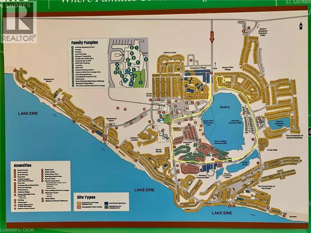 Beach Rd/Empire Rd to Turtle Pond Rd to Quarry View Village Beautifully updated 2015 General Coach Ironwood seasonal trailer located in the highly sought-after Sherkston Shores. This open-concept trailer offers a bright and welcoming layout, featuring a spacious sunroom, covered porch, and a private firepit areaâperfect for entertaining or relaxing after a day at the beach. The property also includes a separate shed equipped with a TV, fridge, dartboard, bike storage, and built-in shelving, adding bonus space and functionality. Turn every summer into a vacation with access to Sherkstonâs unbeatable resort lifestyle, including three private beaches, pools, bars, live entertainment, weekend fireworks, 24-hour security, waterpark and convenient on-site amenities such as grocery stores and an LCBO. Owners also enjoy exclusive access to a private ownersâ lounge and restaurant, fitness centre, tennis courts, pickleball, basketball courts, skate park, zip lining, and a pavilion available for private events and parties. (id:27476)