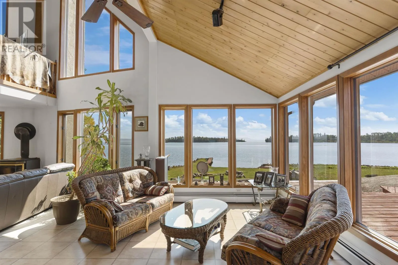 CORAL BEACH ROAD THEN TURN RIGHT AT T IN THE ROAD Spectacular property on highly sought-after Coral Bay Drive, just 15 minutes from town. Situated on just under 2 acres, this beautiful home features vaulted ceilings and stunning south-facing views from every room of Lake Superior, including the Sleeping Giant. One of the best lots on the lake with a year-round dock and sand bottom shoreline, ideal for swimming and water activities. Additional improvements include a 40' x 38' workshop with 18' ceilings and in-floor heating. This property offers an excellent combination of privacy, recreational opportunities, and proximity to town. (id:27476)
