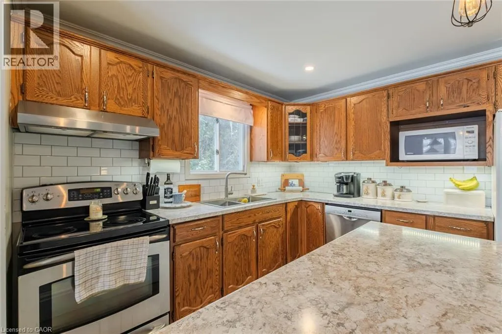 Adorable 3+1 bedroom raised bungalow in one of Norfolk's best rural neighbourhoods. Pull in to the double-wide, private driveway for ample parking space. Step up to the front entrance and head inside to a cozy and welcoming foyer with coat closet and doors to both the garage and back deck. On the mainfloor a modern, open-concept space includes the living room, dining room and kitchen. Plenty of space to gather together as a family and entertain friends. The kitchen is bright with natural light, has plenty of cupboard space and features an island with bar seating. Down the hall are the first three bedrooms, including the primary bedroom and the four piece bathroom. Downstairs is a spacious recreation room with fireplace, the fourth bedroom, the second bathroom and laundry/utility room. From the laundry room enjoy a walkout to the backyard. Tons of space back here for kids to play and pets to roam! Keep your car dry in the attached garage and enjoy the extra storage space of the workshop and garden shed out back. This sweet home is ready for you to move in! Located within a short drive to Simcoe, Delhi and Turkey Point, enjoy a little bit of the country life while still being close to the amenities of town. (id:27476)