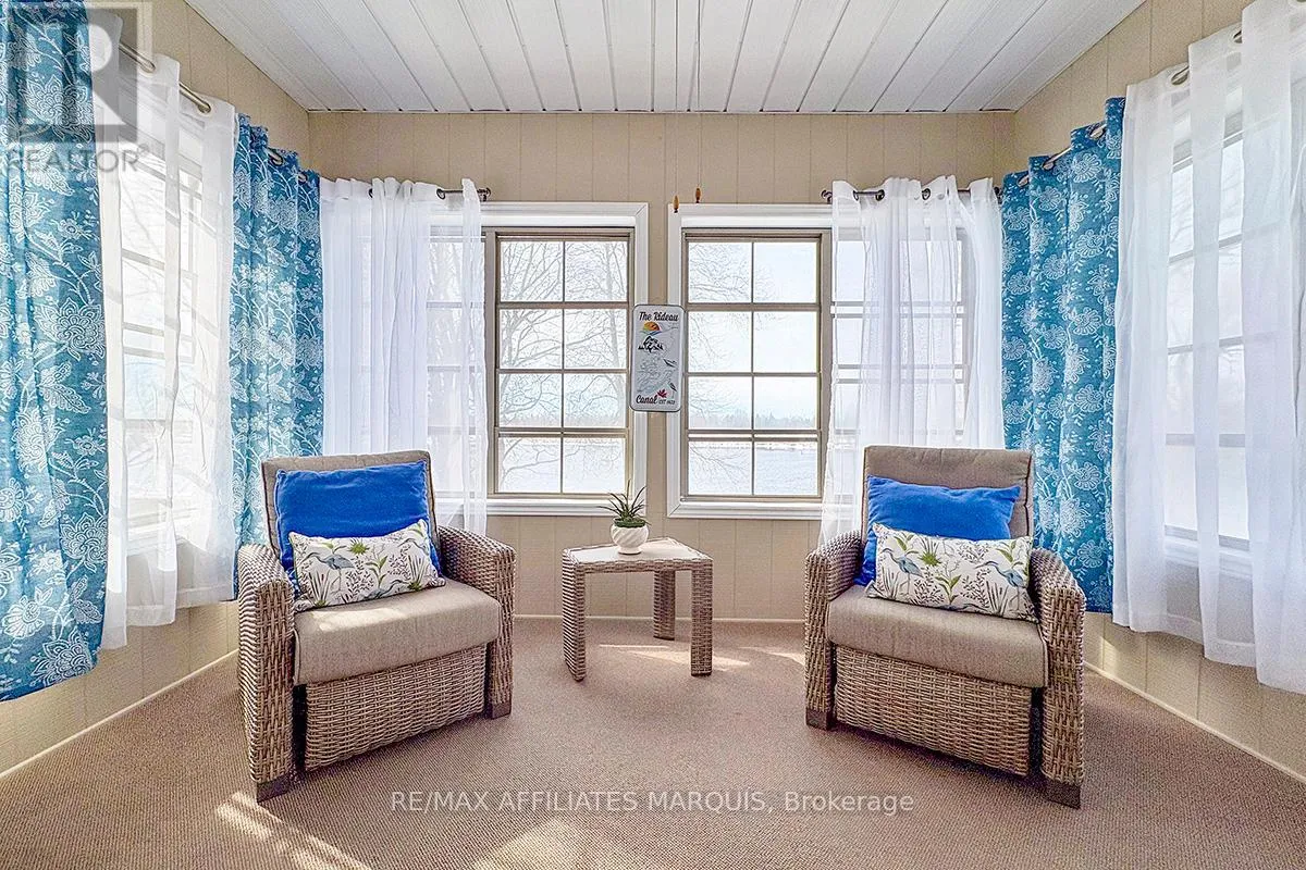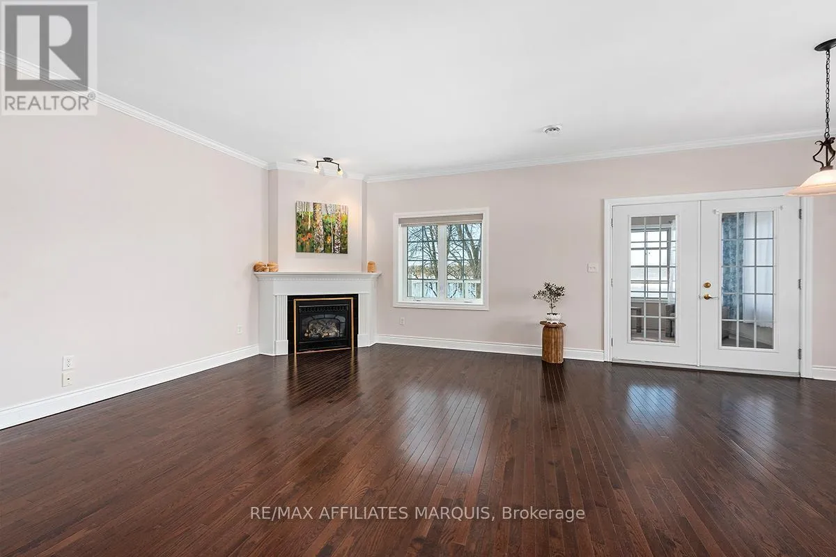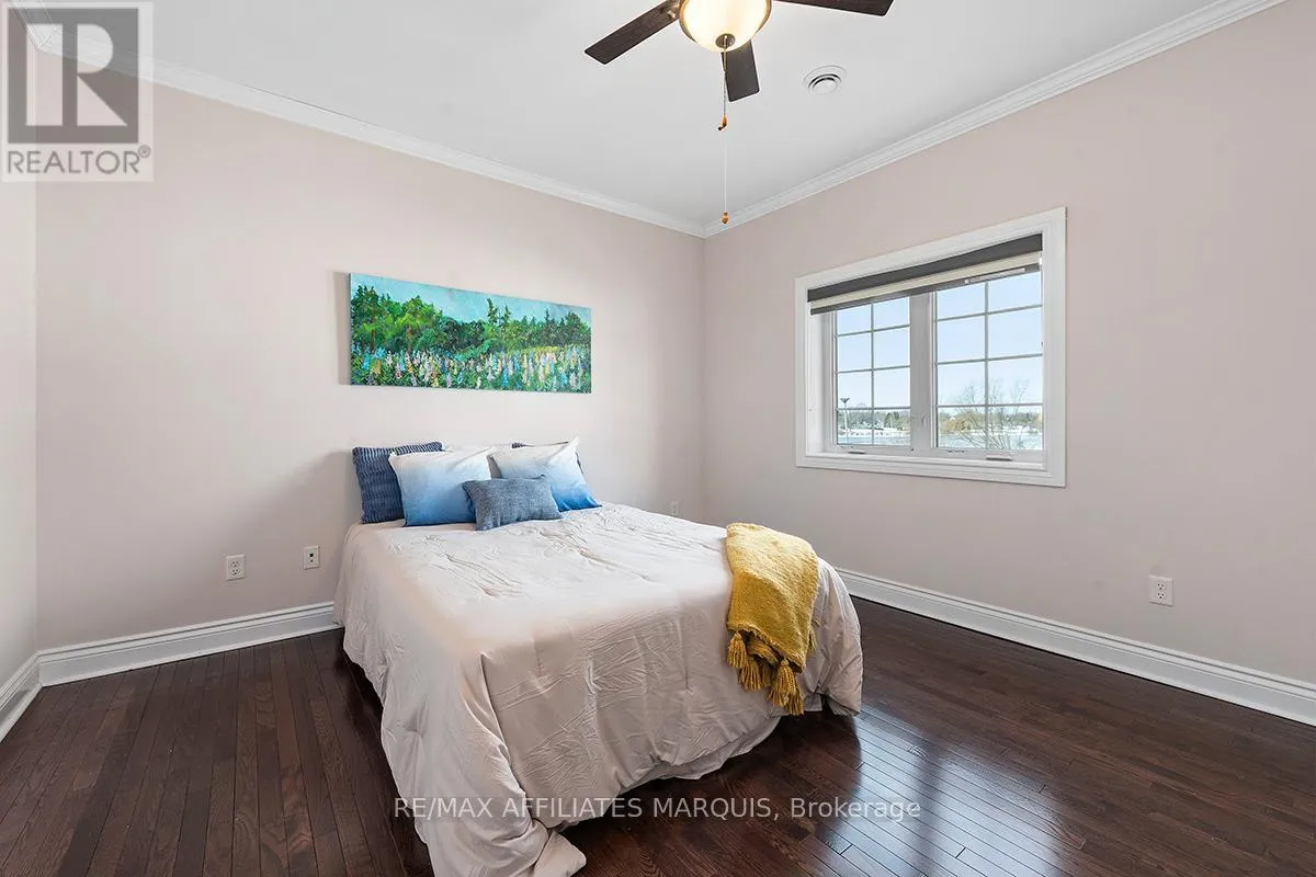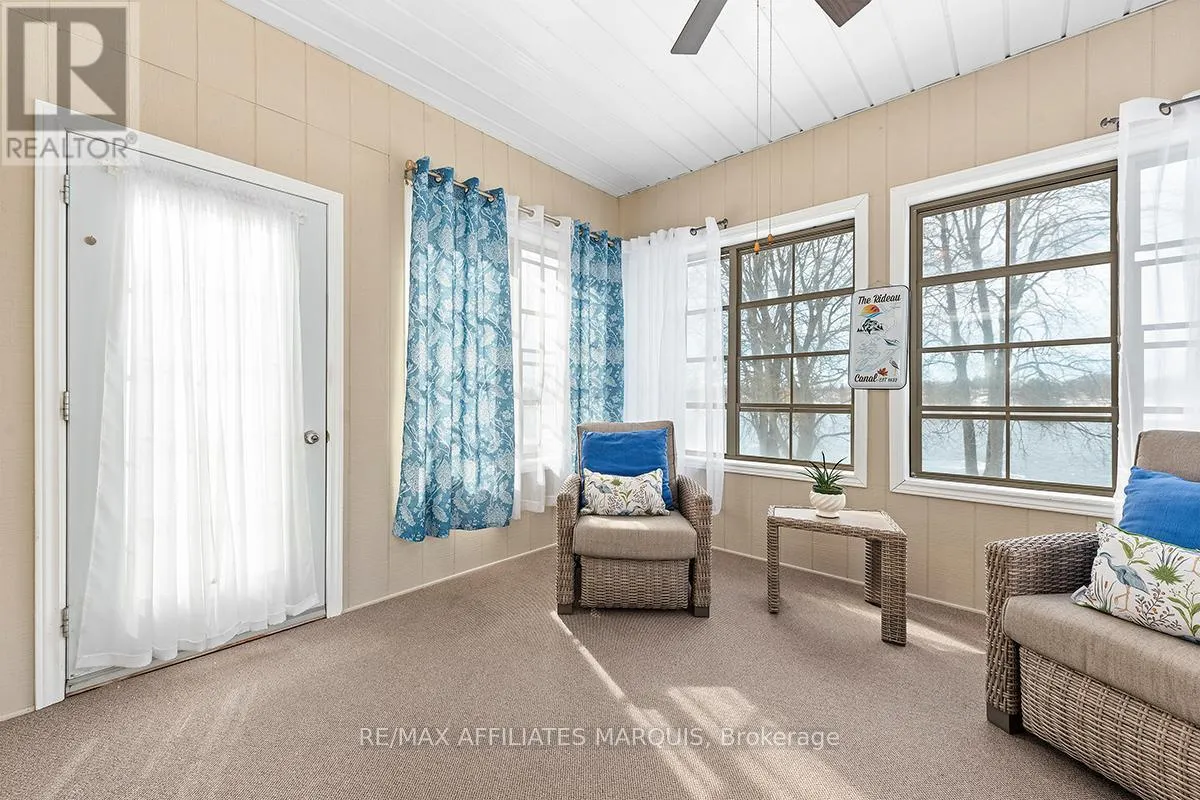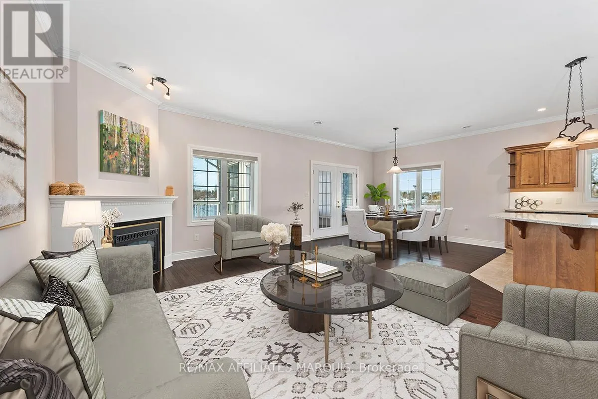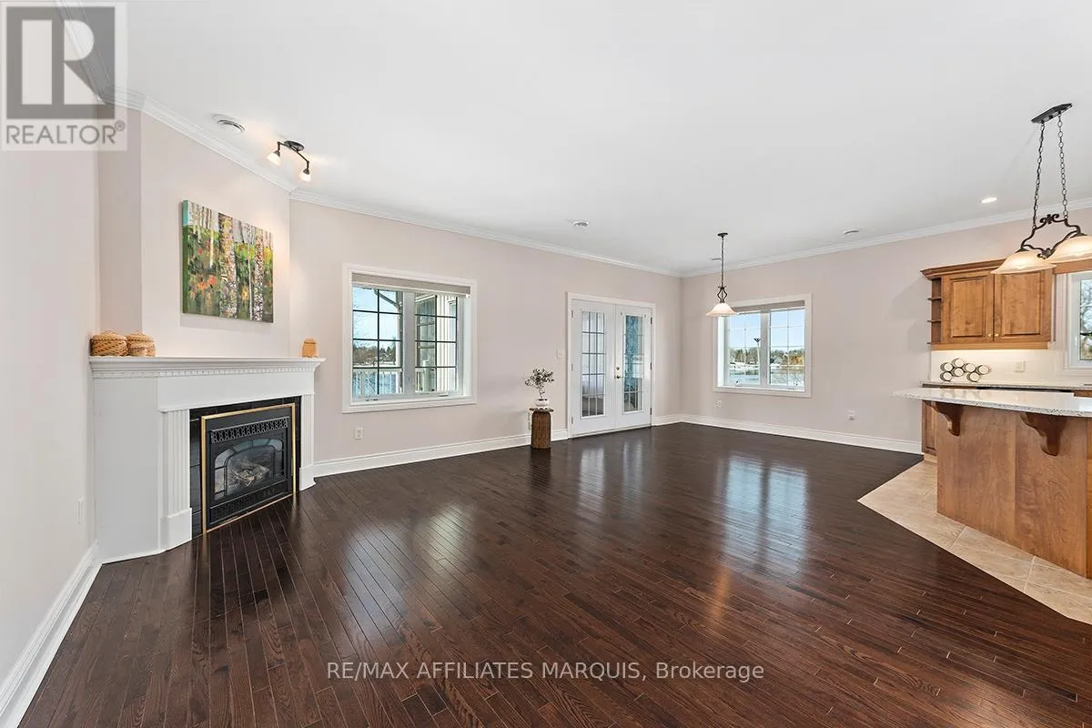 Cross Streets: Albert and Old Slys. ** Directions: From Merrickville take Hwy 43 into Smiths Falls which turns into Queen street. Enjoy refined riverside living overlooking the beautiful Rideau River in the exclusive "Between the Locks" community. Set along the historic Rideau Canal (a UNESCO World Heritage waterway), this oversized executive apartment offers a rare combination of space, quality construction, and direct waterfront lifestyle. The bright, open-concept layout features high ceilings and large windows oriented toward stunning river views. A custom solid wood kitchen with generous cabinetry, pantry cupboard, quartz countertops, and a large island connects seamlessly to the living and dining areas. The living room includes a gas fireplace, while the impressive primary suite offers a walk-in closet and private ensuite. Carpet-free finishes include engineered hardwood and ceramic flooring, with in-floor heating in tiled areas. Additional features include ensuite laundry, on-demand hot water, appliances included, and a spacious 147 sq ft three-season room overlooking the river, perfect for morning coffee or evening sunsets. Built with Nudura insulated concrete form construction, the building provides excellent soundproofing, durability, and economical heating. Residents enjoy landscaped waterfront grounds with outdoor lifestyle amenities including picnic area, kayaks, garden space, and a new dock arriving Summer 2026. Directly across the river is Lower Reach Park, offering tennis courts, walking paths, and one of the best spots in town for fireworks. Parking for one vehicle included. Professional property management, foyer security lighting, and snow removal provided. Steps to parks, shops, restaurants, and the walkable downtown of Smiths Falls, with convenient access to Ottawa. Waterfront living without the high-rise apartment feel. Water included, heat and hydro are the in addition to. (id:27476)